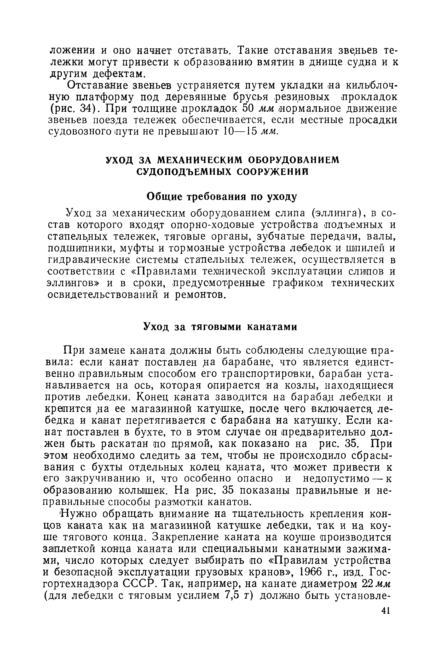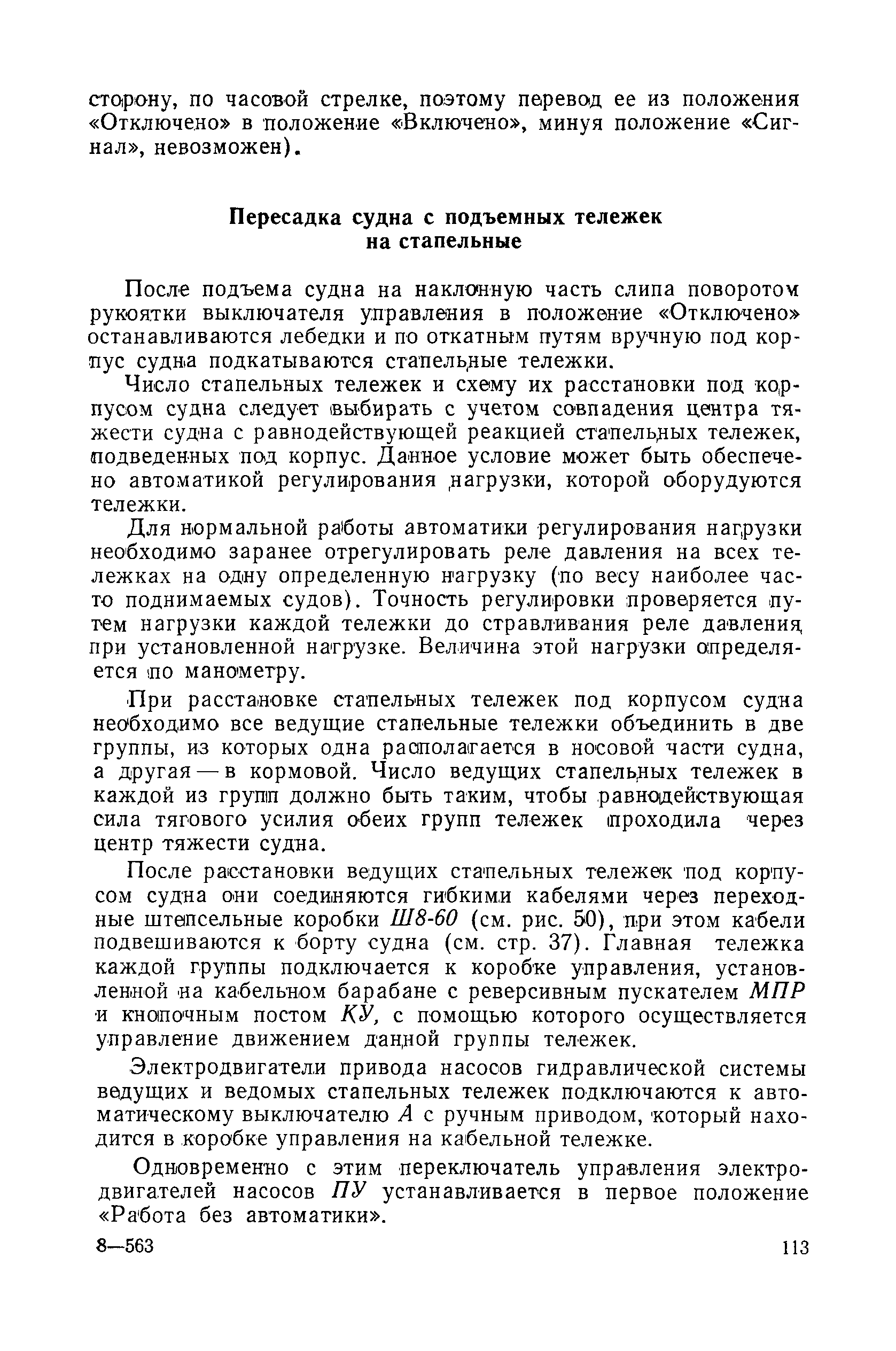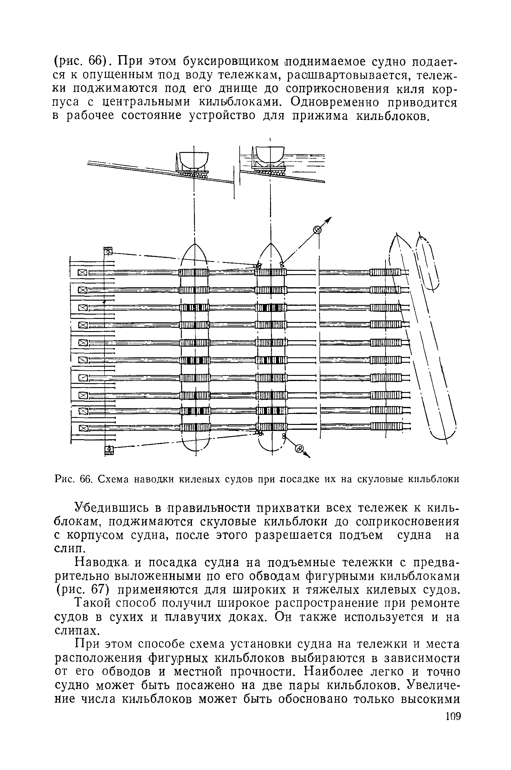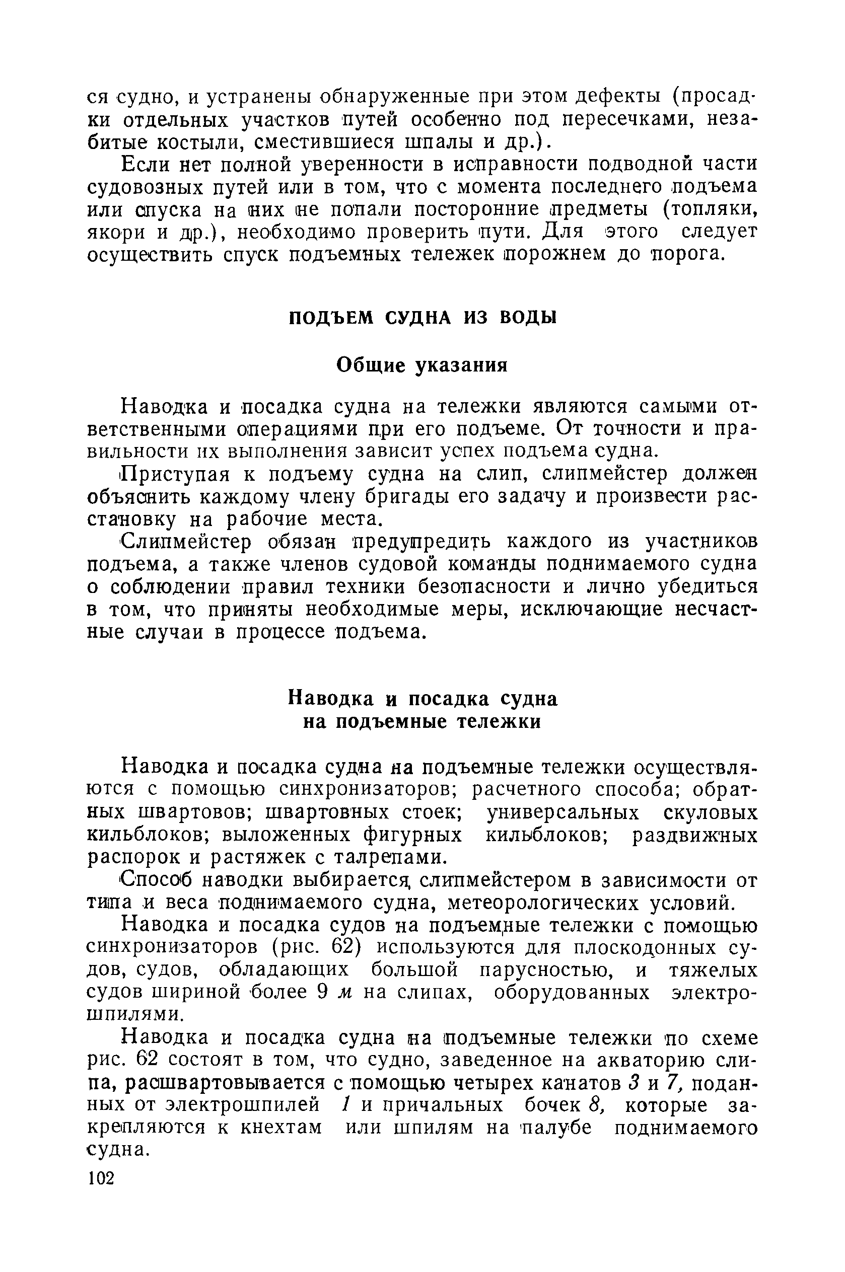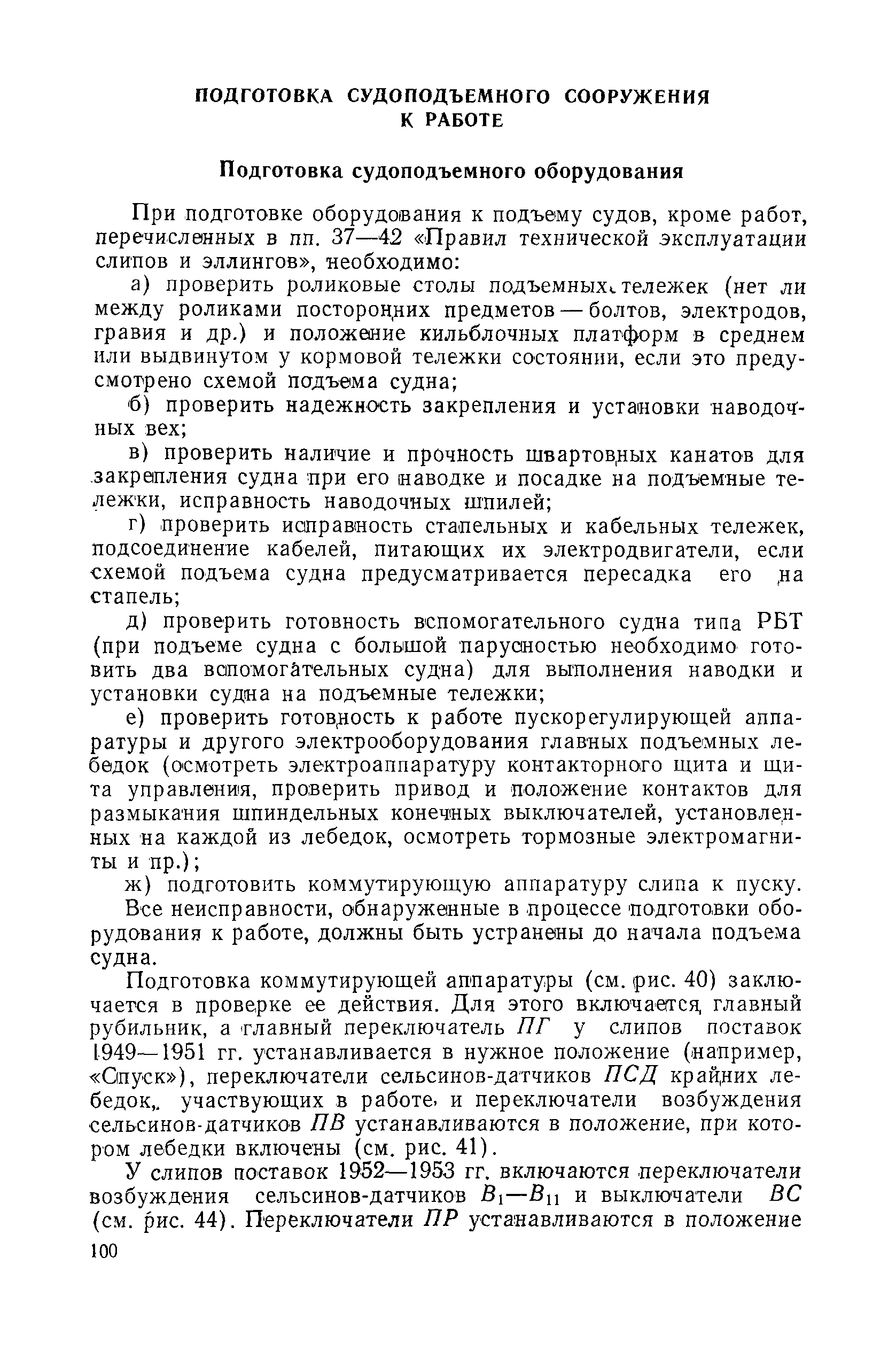 | Оглавление: | Введение 1. Особенности устройства и обслуживания слипов и эллингов Принципы устройства и работы типовых слипов и эллингов Гребенчатый слип и эллинг Кормоподъемные устройства для гребенчатых слипов и эллингов Продольный двухопорный слип, эллинг и кормоподъемник Подъемные тележки Типы подъемных тележек и их основные характеристики Подъемные тележки гребенчатых слипов Подъемные тележки эллинга типа "Убигау" Подъемные тележки продольных двухопорных слипов (эллингов) и судонатасок Подъемные лебедки Типы подъемных лебедок и их основные характеристики Устройство для автоматического выключения лебедки при остановке подъемной тележки на спуске Защита лебедок от перегрузок Устройство для контроля величины перекоса поезда подъемных тележек с судном Стапельные тележки Типы стапельных тележек и их основные характеристики Особенности работы гидравлической системы стапельных тележек Подвеска питающих кабелей Устройство для переключения шестерен привода стапельной тележки Способы ликвидации отставаний стапельных тележек при разгрузке Уход за механическим оборудованием судоподъемных сооружений Общие требования по уходу Уход за тяговыми канатами Уход за зубчатыми передачами и редукторами при их эксплуатации и монтаже Уход за рамами механизмов Уход за соединительными и фрикционными муфтами Уход за канатными блоками Уход за тормозами Уход за валами, осями и подшипниками Электрооборудование Назначение электропривода подъемных лебедок гребенчатых слипов Порядок включения электропривода подъемных лебедок поставки 1949-1951 гг. Схема контроля перекосов и пути, пройденного подъемными тележками поставки 1949-1951 гг. Особенности схемы электропривода подъемных лебедок поставки 1952 г Особенности схемы контроля перекосов и пути, пройденного подъемными тележками поставки 1952 г Особенности схемы электропривода подъемных тележек поставки 1953 г Особенности схемы контроля перекосов подъемных тележек поставки 1953 г Замена импортного электрооборудования слипов отечественным Особенности схемы электрооборудования гребенчатых слипов Г-150 и Г-300 (по типовому проекту 1963 г.) Электропривод одномоторных слипов и эллингов Электропривод продольного слипа П-600 Электропривод судонатаски грузоподъемностью 60 т Электропривод наводочного шпиля (тяговое усилие 3 т) Электрооборудование стапельных тележек Судовозные пути Общие требования Уход за подводными путями Уход за надводными путями Уход за пересечками стапельных путей Уход за твердыми покрытиями на стапелях слипов Обслуживание слипов и эллингов при работе в условиях отрицательных температур воздуха Организация планово-предупредительных осмотров и ремонтов Общие положения Осмотры и обследования сооружения Планирование и организация ремонта Прием сооружения после ремонта II. Производство подъемно-спусковых работ Подготовка судна к подъему Разработка схемы подъема судна и расчет нагрузок Расчет нагрузок от кормового (баксового) давления Пример расчетов установки судна на подъемные тележки слипа Проверка местной прочности корпусов судна Осмотр судна перед подъемом на слип Подготовка судоподъемного сооружения к работе Подготовка судоподъемного оборудования Подготовка судовозных путей Подъем судна из воды Общие указания Наводка и посадка судна на подъемные 