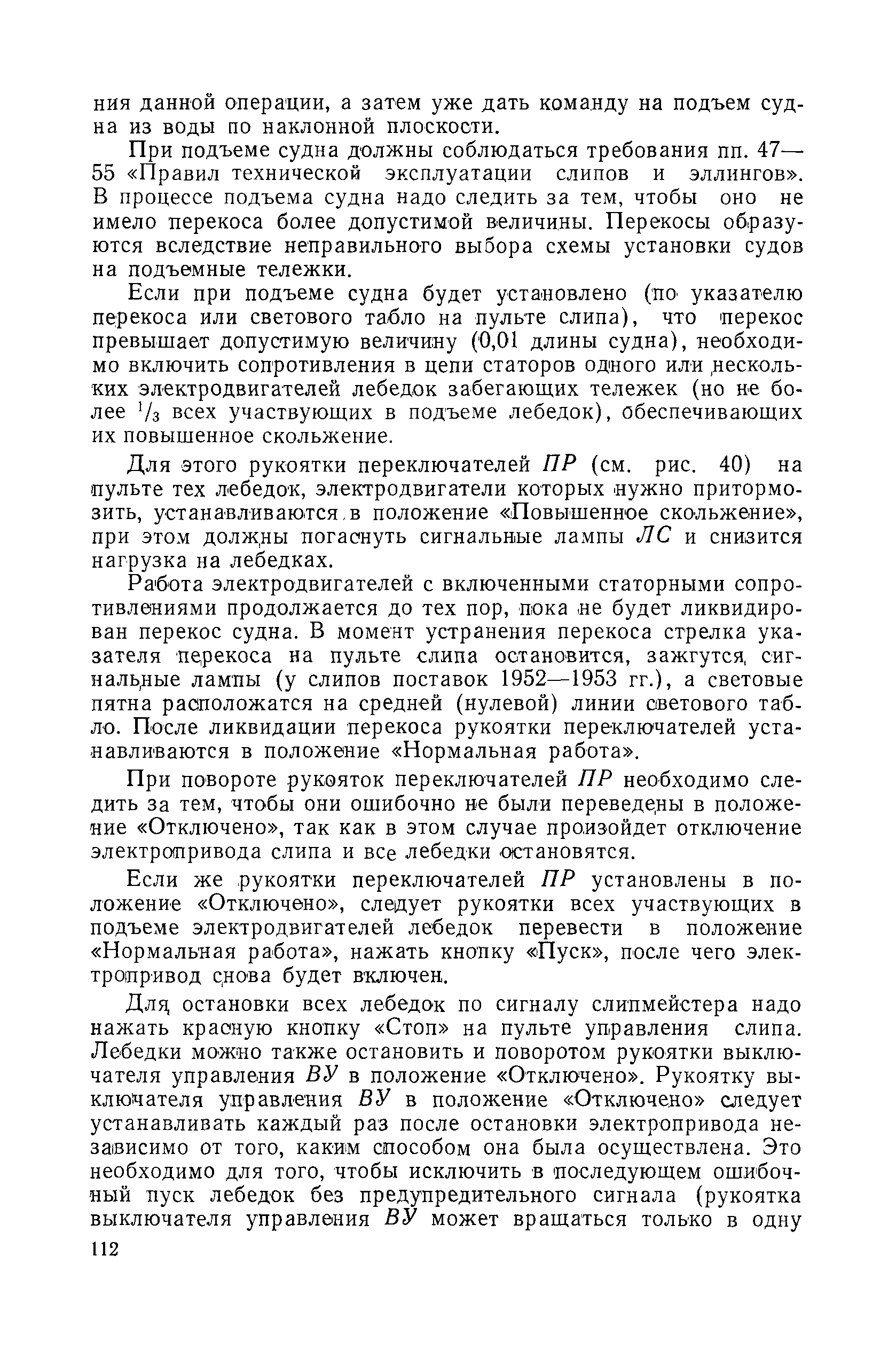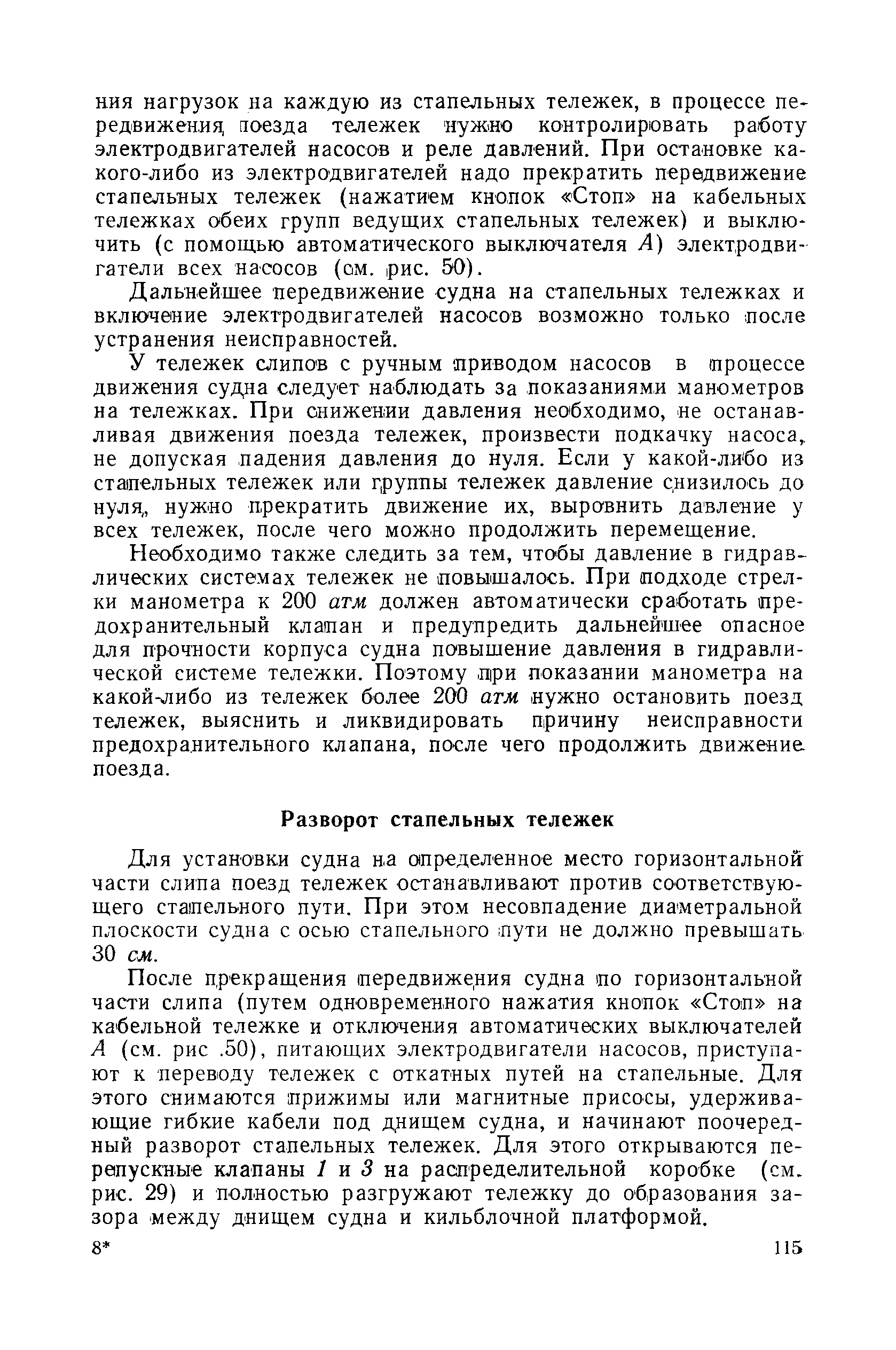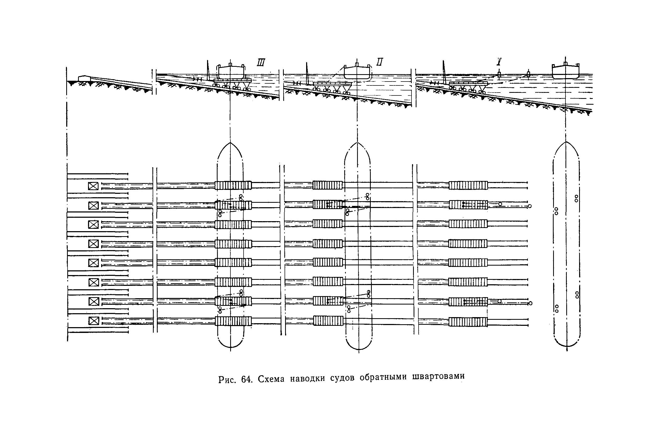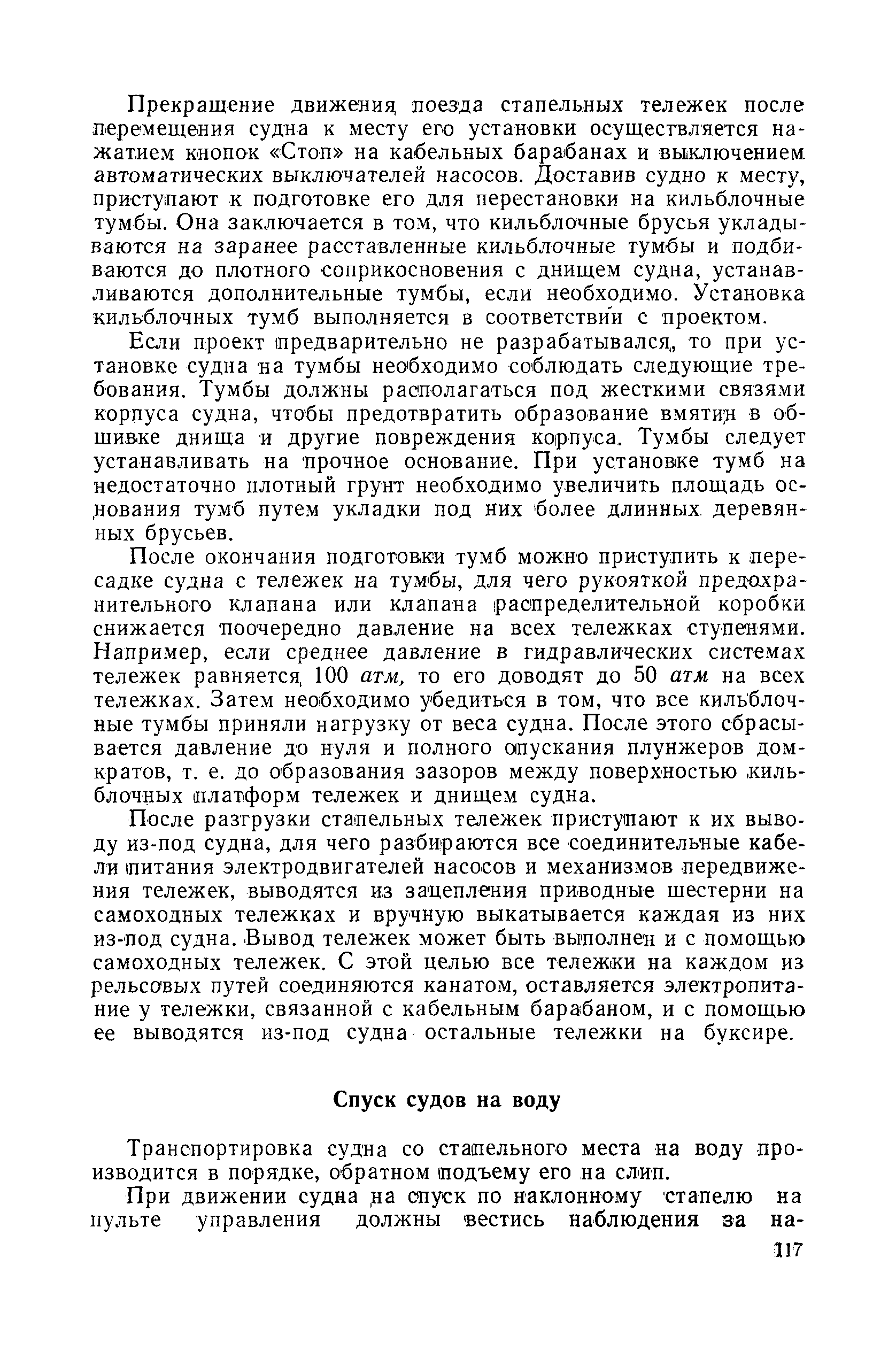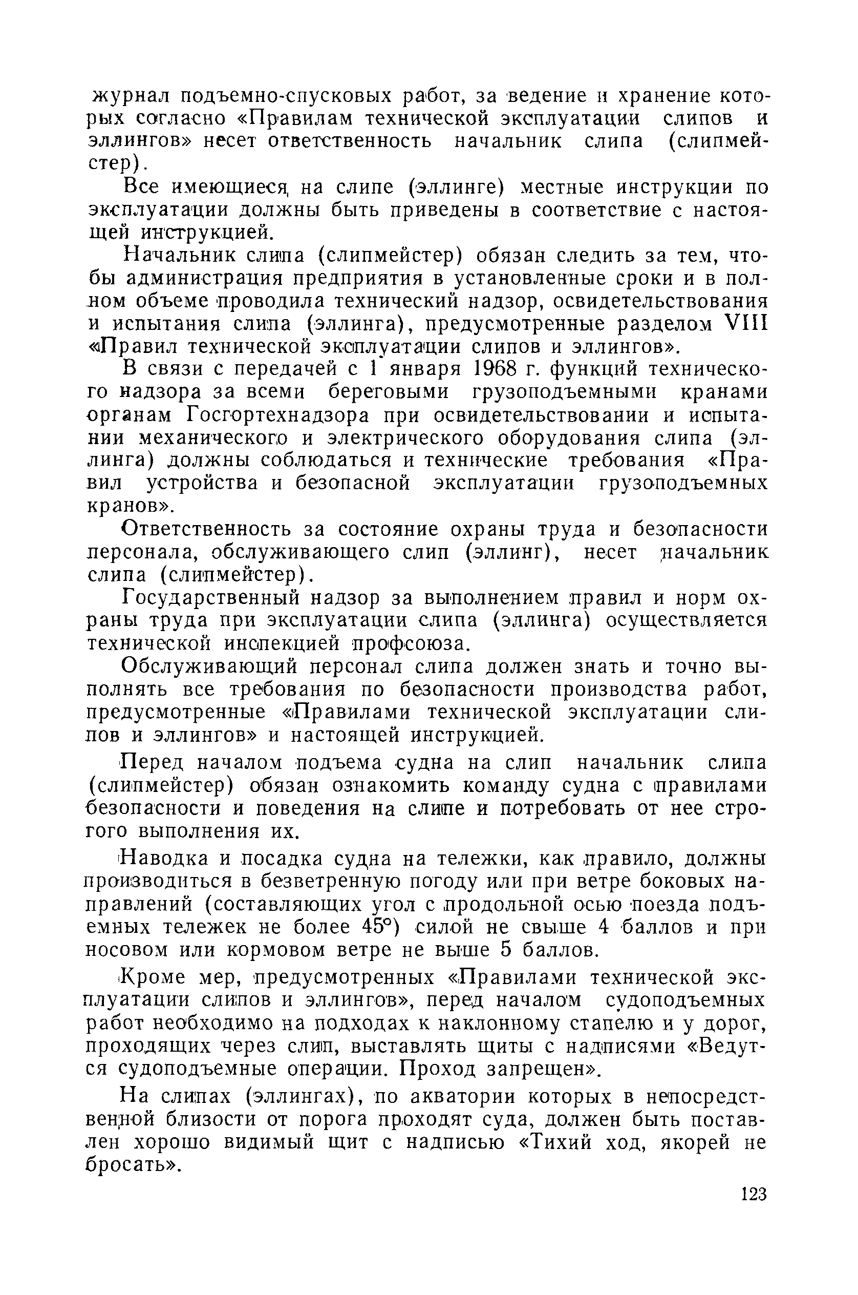 | Оглавление: | Введение 1. Особенности устройства и обслуживания слипов и эллингов Принципы устройства и работы типовых слипов и эллингов Гребенчатый слип и эллинг Кормоподъемные устройства для гребенчатых слипов и эллингов Продольный двухопорный слип, эллинг и кормоподъемник Подъемные тележки Типы подъемных тележек и их основные характеристики Подъемные тележки гребенчатых слипов Подъемные тележки эллинга типа "Убигау" Подъемные тележки продольных двухопорных слипов (эллингов) и судонатасок Подъемные лебедки Типы подъемных лебедок и их основные характеристики Устройство для автоматического выключения лебедки при остановке подъемной тележки на спуске Защита лебедок от перегрузок Устройство для контроля величины перекоса поезда подъемных тележек с судном Стапельные тележки Типы стапельных тележек и их основные характеристики Особенности работы гидравлической системы стапельных тележек Подвеска питающих кабелей Устройство для переключения шестерен привода стапельной тележки Способы ликвидации отставаний стапельных тележек при разгрузке Уход за механическим оборудованием судоподъемных сооружений Общие требования по уходу Уход за тяговыми канатами Уход за зубчатыми передачами и редукторами при их эксплуатации и монтаже Уход за рамами механизмов Уход за соединительными и фрикционными муфтами Уход за канатными блоками Уход за тормозами Уход за валами, осями и подшипниками Электрооборудование Назначение электропривода подъемных лебедок гребенчатых слипов Порядок включения электропривода подъемных лебедок поставки 1949-1951 гг. Схема контроля перекосов и пути, пройденного подъемными тележками поставки 1949-1951 гг. Особенности схемы электропривода подъемных лебедок поставки 1952 г Особенности схемы контроля перекосов и пути, пройденного подъемными тележками поставки 1952 г Особенности схемы электропривода подъемных тележек поставки 1953 г Особенности схемы контроля перекосов подъемных тележек поставки 1953 г Замена импортного электрооборудования слипов отечественным Особенности схемы электрооборудования гребенчатых слипов Г-150 и Г-300 (по типовому проекту 1963 г.) Электропривод одномоторных слипов и эллингов Электропривод продольного слипа П-600 Электропривод судонатаски грузоподъемностью 60 т Электропривод наводочного шпиля (тяговое усилие 3 т) Электрооборудование стапельных тележек Судовозные пути Общие требования Уход за подводными путями Уход за надводными путями Уход за пересечками стапельных путей Уход за твердыми покрытиями на стапелях слипов Обслуживание слипов и эллингов при работе в условиях отрицательных температур воздуха Организация планово-предупредительных осмотров и ремонтов Общие положения Осмотры и обследования сооружения Планирование и организация ремонта Прием сооружения после ремонта II. Производство подъемно-спусковых работ Подготовка судна к подъему Разработка схемы подъема судна и расчет нагрузок Расчет нагрузок от кормового (баксового) давления Пример расчетов установки судна на подъемные тележки слипа Проверка местной прочности корпусов судна Осмотр судна перед подъемом на слип Подготовка судоподъемного сооружения к работе Подготовка судоподъемного оборудования Подготовка судовозных путей Подъем судна из воды Общие указания Наводка и посадка судна на подъемные 