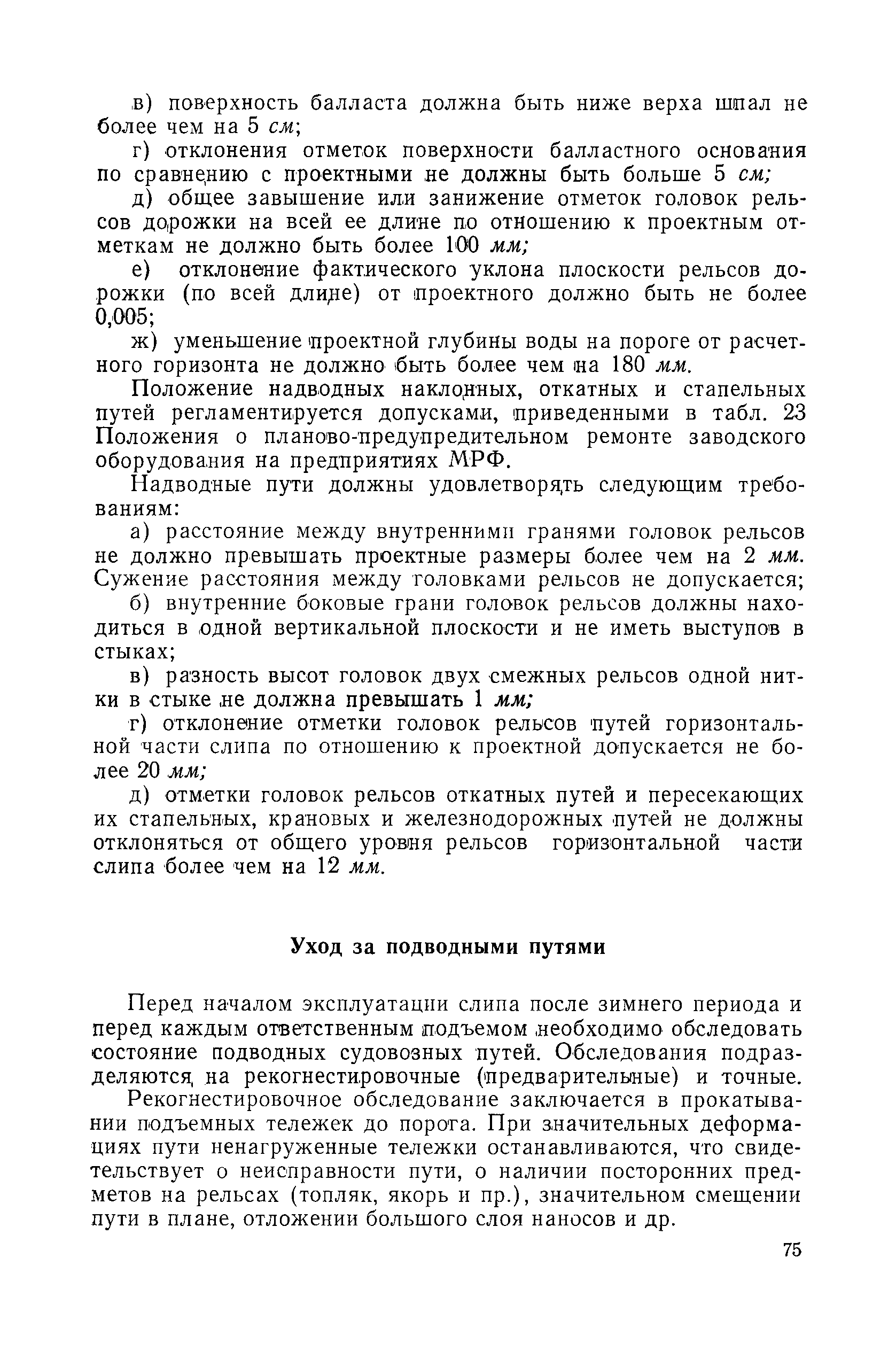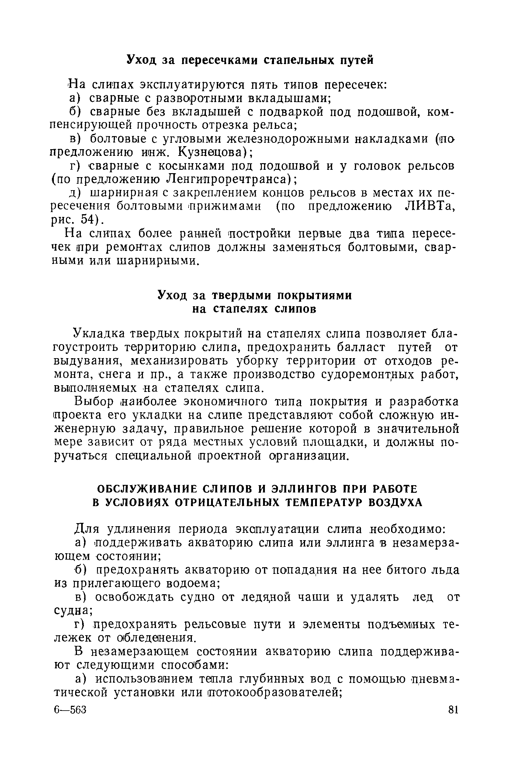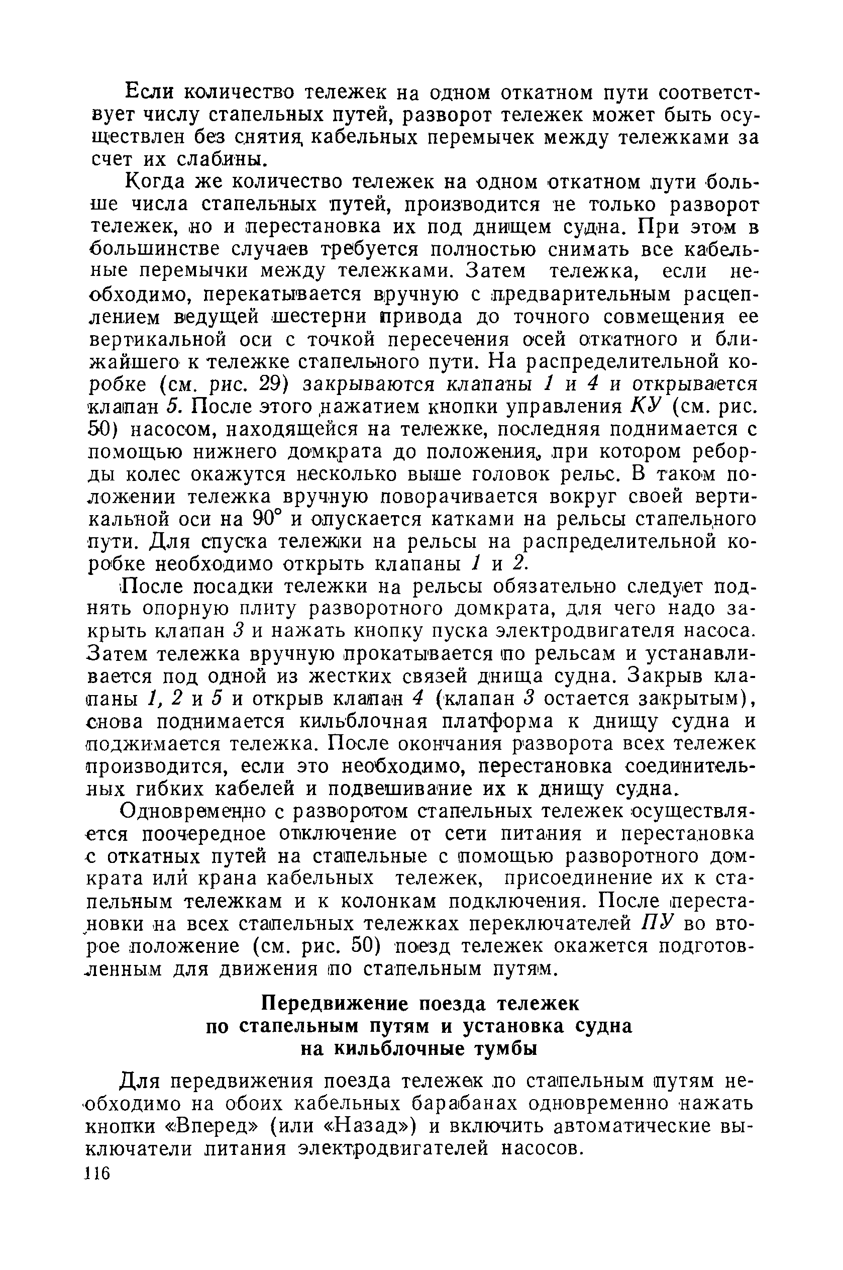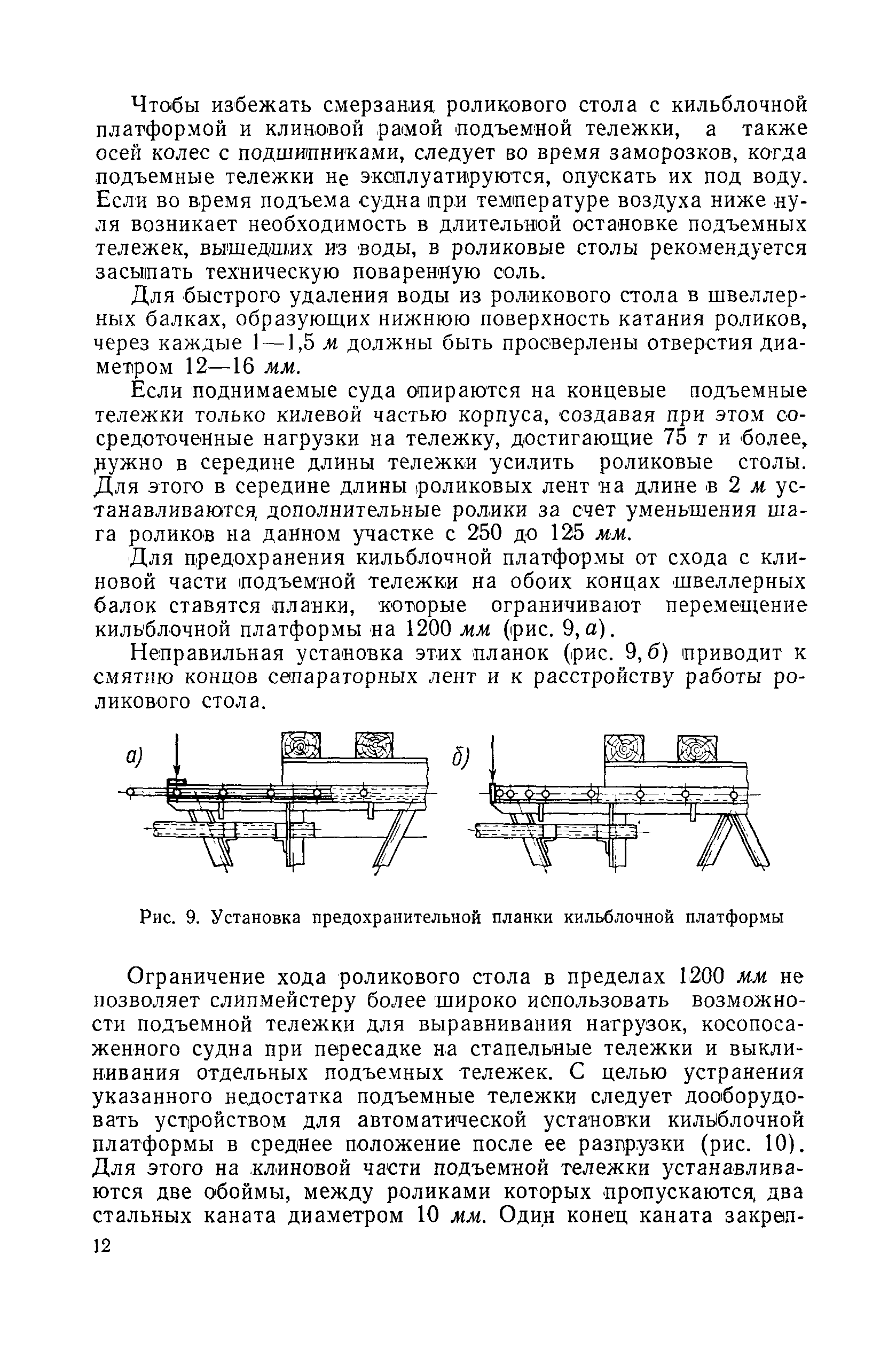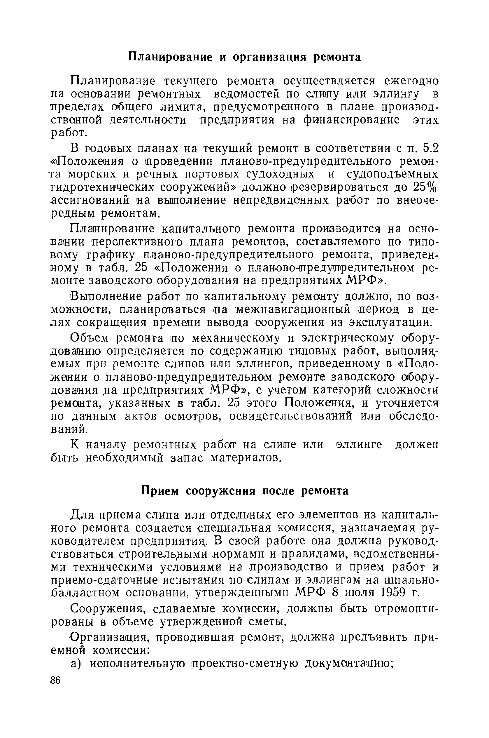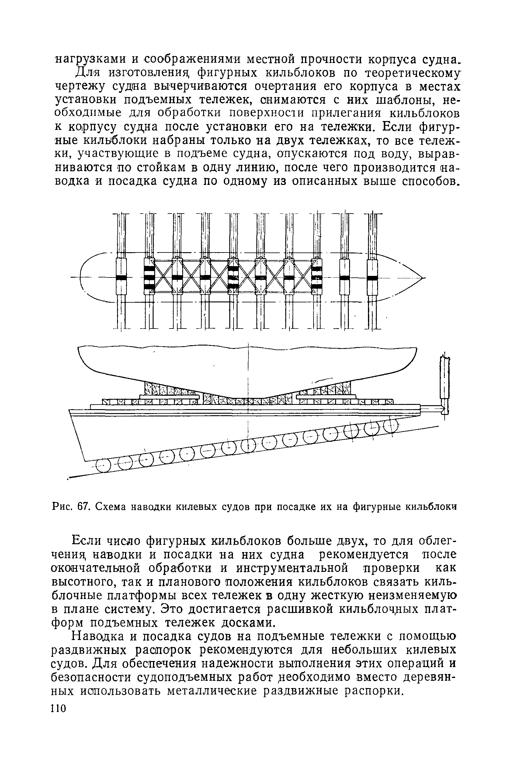 | Оглавление: | Введение 1. Особенности устройства и обслуживания слипов и эллингов Принципы устройства и работы типовых слипов и эллингов Гребенчатый слип и эллинг Кормоподъемные устройства для гребенчатых слипов и эллингов Продольный двухопорный слип, эллинг и кормоподъемник Подъемные тележки Типы подъемных тележек и их основные характеристики Подъемные тележки гребенчатых слипов Подъемные тележки эллинга типа "Убигау" Подъемные тележки продольных двухопорных слипов (эллингов) и судонатасок Подъемные лебедки Типы подъемных лебедок и их основные характеристики Устройство для автоматического выключения лебедки при остановке подъемной тележки на спуске Защита лебедок от перегрузок Устройство для контроля величины перекоса поезда подъемных тележек с судном Стапельные тележки Типы стапельных тележек и их основные характеристики Особенности работы гидравлической системы стапельных тележек Подвеска питающих кабелей Устройство для переключения шестерен привода стапельной тележки Способы ликвидации отставаний стапельных тележек при разгрузке Уход за механическим оборудованием судоподъемных сооружений Общие требования по уходу Уход за тяговыми канатами Уход за зубчатыми передачами и редукторами при их эксплуатации и монтаже Уход за рамами механизмов Уход за соединительными и фрикционными муфтами Уход за канатными блоками Уход за тормозами Уход за валами, осями и подшипниками Электрооборудование Назначение электропривода подъемных лебедок гребенчатых слипов Порядок включения электропривода подъемных лебедок поставки 1949-1951 гг. Схема контроля перекосов и пути, пройденного подъемными тележками поставки 1949-1951 гг. Особенности схемы электропривода подъемных лебедок поставки 1952 г Особенности схемы контроля перекосов и пути, пройденного подъемными тележками поставки 1952 г Особенности схемы электропривода подъемных тележек поставки 1953 г Особенности схемы контроля перекосов подъемных тележек поставки 1953 г Замена импортного электрооборудования слипов отечественным Особенности схемы электрооборудования гребенчатых слипов Г-150 и Г-300 (по типовому проекту 1963 г.) Электропривод одномоторных слипов и эллингов Электропривод продольного слипа П-600 Электропривод судонатаски грузоподъемностью 60 т Электропривод наводочного шпиля (тяговое усилие 3 т) Электрооборудование стапельных тележек Судовозные пути Общие требования Уход за подводными путями Уход за надводными путями Уход за пересечками стапельных путей Уход за твердыми покрытиями на стапелях слипов Обслуживание слипов и эллингов при работе в условиях отрицательных температур воздуха Организация планово-предупредительных осмотров и ремонтов Общие положения Осмотры и обследования сооружения Планирование и организация ремонта Прием сооружения после ремонта II. Производство подъемно-спусковых работ Подготовка судна к подъему Разработка схемы подъема судна и расчет нагрузок Расчет нагрузок от кормового (баксового) давления Пример расчетов установки судна на подъемные тележки слипа Проверка местной прочности корпусов судна Осмотр судна перед подъемом на слип Подготовка судоподъемного сооружения к работе Подготовка судоподъемного оборудования Подготовка судовозных путей Подъем судна из воды Общие указания Наводка и посадка судна на подъемные 