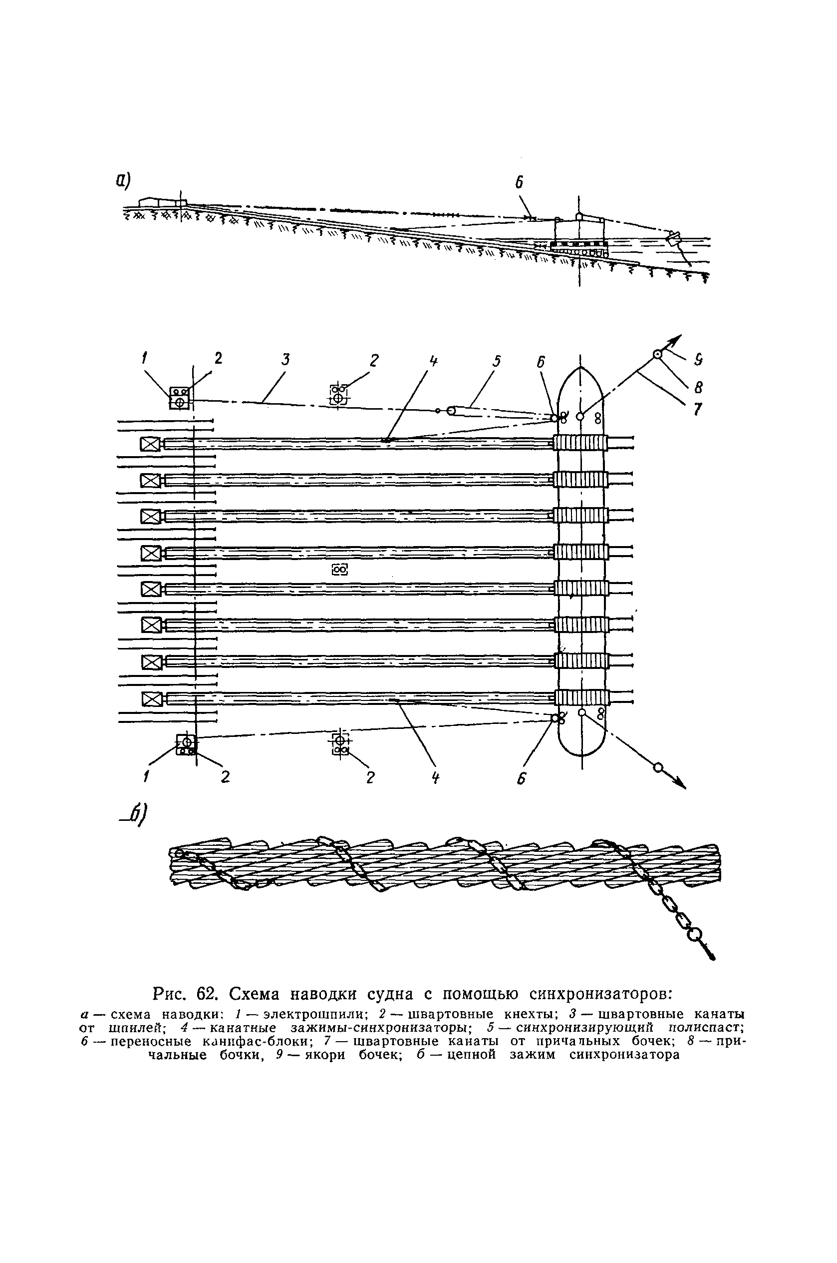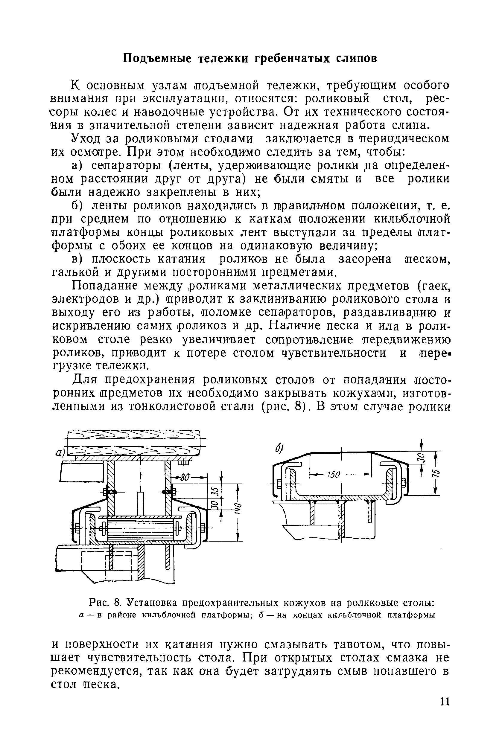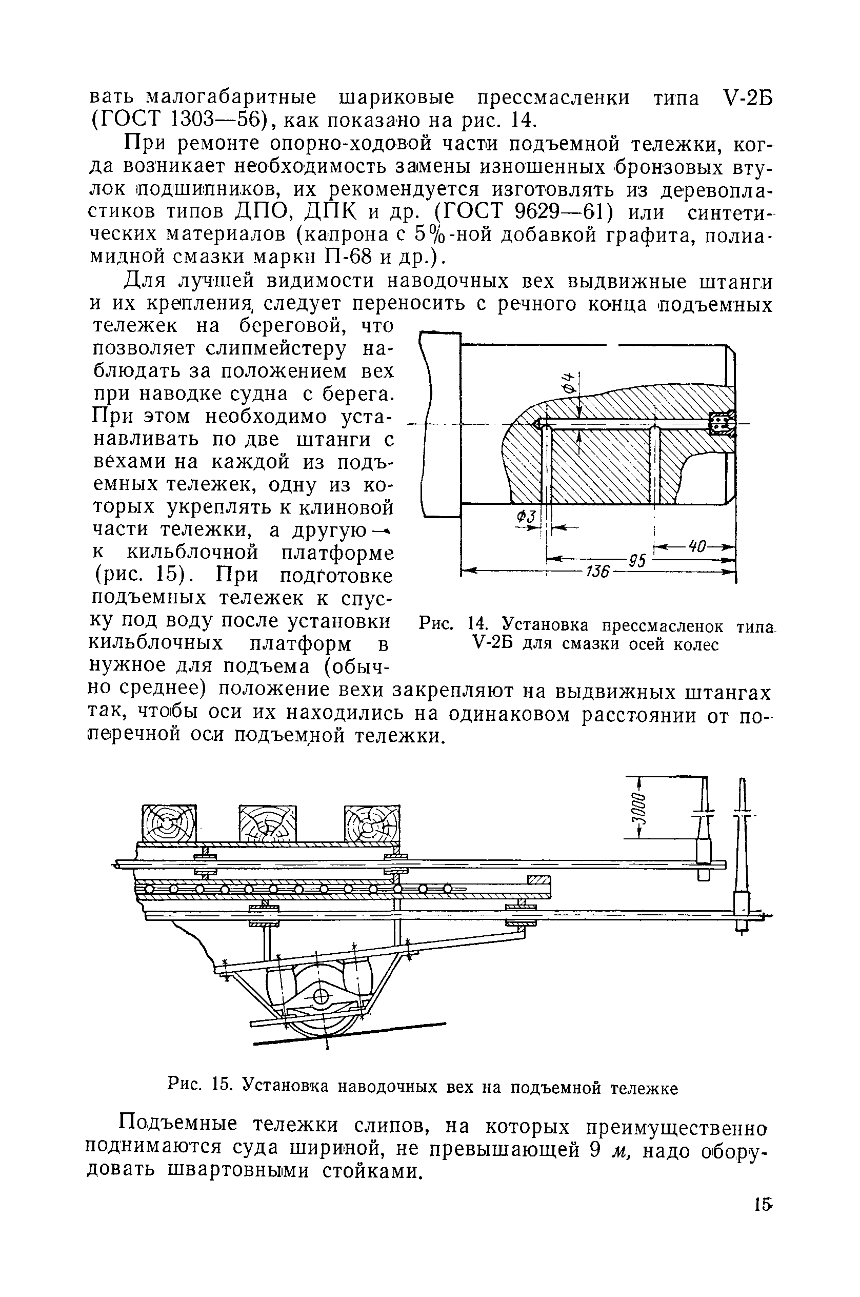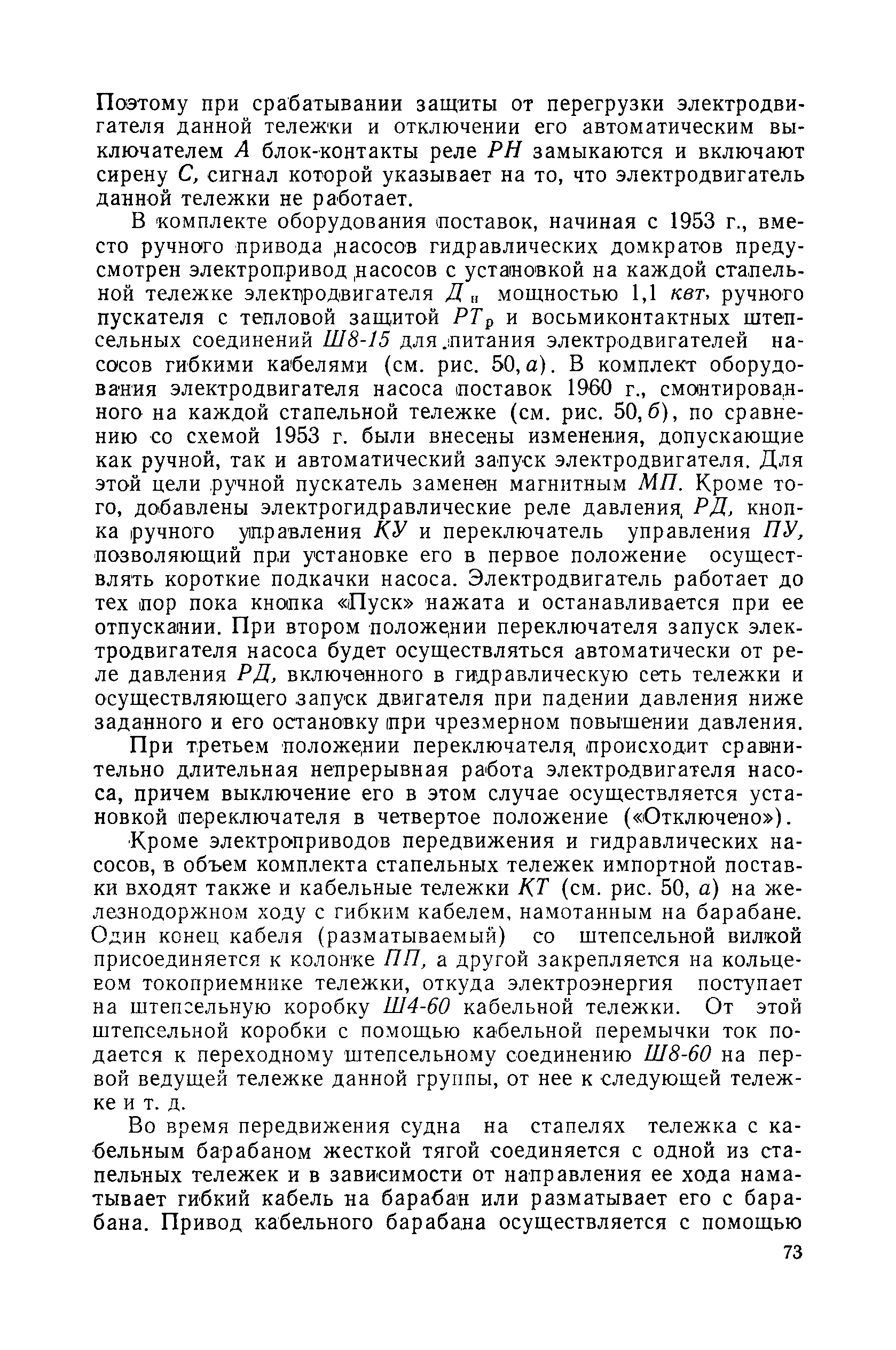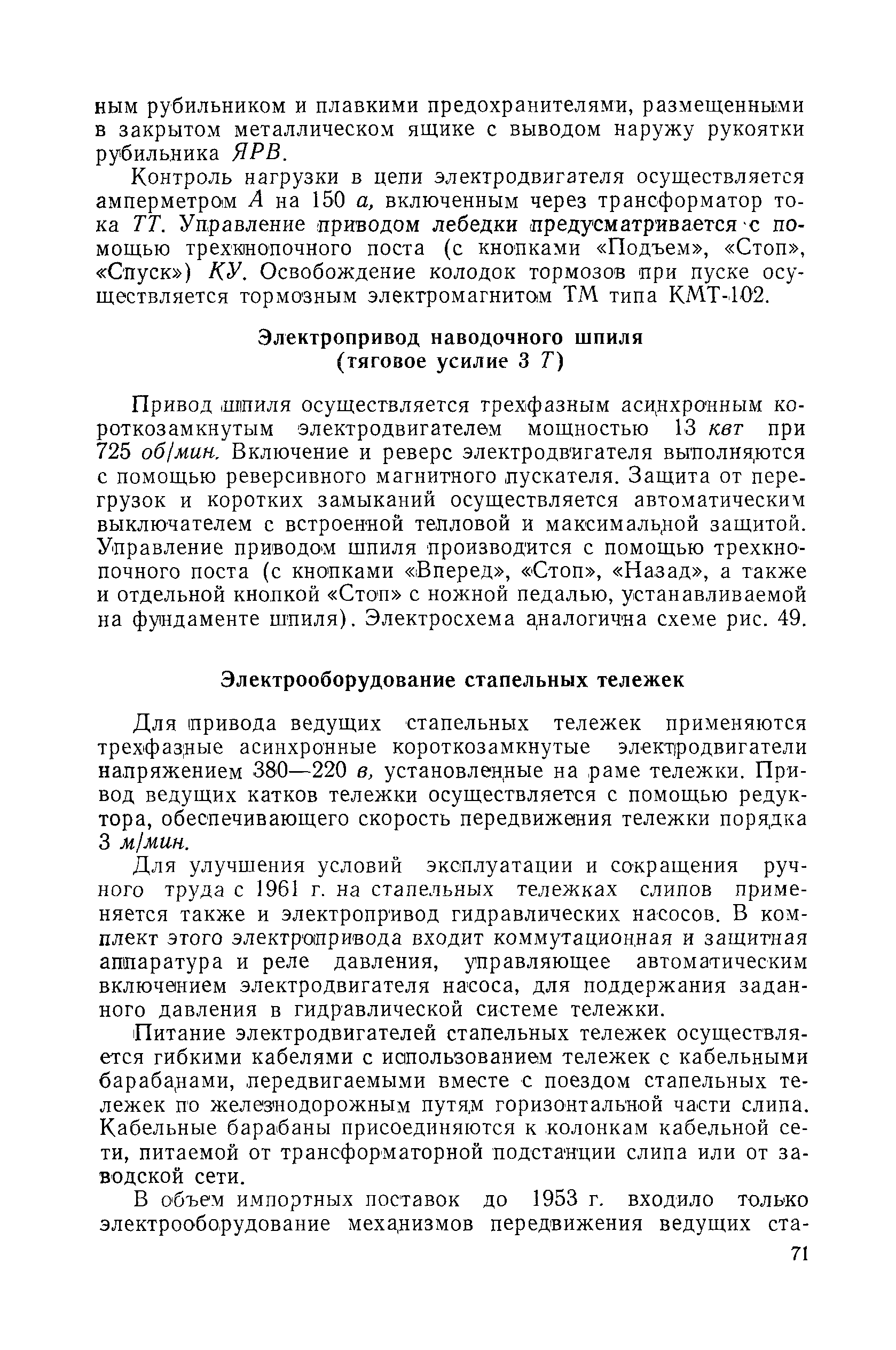| Оглавление: | Введение 1. Особенности устройства и обслуживания слипов и эллингов Принципы устройства и работы типовых слипов и эллингов Гребенчатый слип и эллинг Кормоподъемные устройства для гребенчатых слипов и эллингов Продольный двухопорный слип, эллинг и кормоподъемник Подъемные тележки Типы подъемных тележек и их основные характеристики Подъемные тележки гребенчатых слипов Подъемные тележки эллинга типа "Убигау" Подъемные тележки продольных двухопорных слипов (эллингов) и судонатасок Подъемные лебедки Типы подъемных лебедок и их основные характеристики Устройство для автоматического выключения лебедки при остановке подъемной тележки на спуске Защита лебедок от перегрузок Устройство для контроля величины перекоса поезда подъемных тележек с судном Стапельные тележки Типы стапельных тележек и их основные характеристики Особенности работы гидравлической системы стапельных тележек Подвеска питающих кабелей Устройство для переключения шестерен привода стапельной тележки Способы ликвидации отставаний стапельных тележек при разгрузке Уход за механическим оборудованием судоподъемных сооружений Общие требования по уходу Уход за тяговыми канатами Уход за зубчатыми передачами и редукторами при их эксплуатации и монтаже Уход за рамами механизмов Уход за соединительными и фрикционными муфтами Уход за канатными блоками Уход за тормозами Уход за валами, осями и подшипниками Электрооборудование Назначение электропривода подъемных лебедок гребенчатых слипов Порядок включения электропривода подъемных лебедок поставки 1949-1951 гг. Схема контроля перекосов и пути, пройденного подъемными тележками поставки 1949-1951 гг. Особенности схемы электропривода подъемных лебедок поставки 1952 г Особенности схемы контроля перекосов и пути, пройденного подъемными тележками поставки 1952 г Особенности схемы электропривода подъемных тележек поставки 1953 г Особенности схемы контроля перекосов подъемных тележек поставки 1953 г Замена импортного электрооборудования слипов отечественным Особенности схемы электрооборудования гребенчатых слипов Г-150 и Г-300 (по типовому проекту 1963 г.) Электропривод одномоторных слипов и эллингов Электропривод продольного слипа П-600 Электропривод судонатаски грузоподъемностью 60 т Электропривод наводочного шпиля (тяговое усилие 3 т) Электрооборудование стапельных тележек Судовозные пути Общие требования Уход за подводными путями Уход за надводными путями Уход за пересечками стапельных путей Уход за твердыми покрытиями на стапелях слипов Обслуживание слипов и эллингов при работе в условиях отрицательных температур воздуха Организация планово-предупредительных осмотров и ремонтов Общие положения Осмотры и обследования сооружения Планирование и организация ремонта Прием сооружения после ремонта II. Производство подъемно-спусковых работ Подготовка судна к подъему Разработка схемы подъема судна и расчет нагрузок Расчет нагрузок от кормового (баксового) давления Пример расчетов установки судна на подъемные тележки слипа Проверка местной прочности корпусов судна Осмотр судна перед подъемом на слип Подготовка судоподъемного сооружения к работе Подготовка судоподъемного оборудования Подготовка судовозных путей Подъем судна из воды Общие указания Наводка и посадка судна на подъемные 