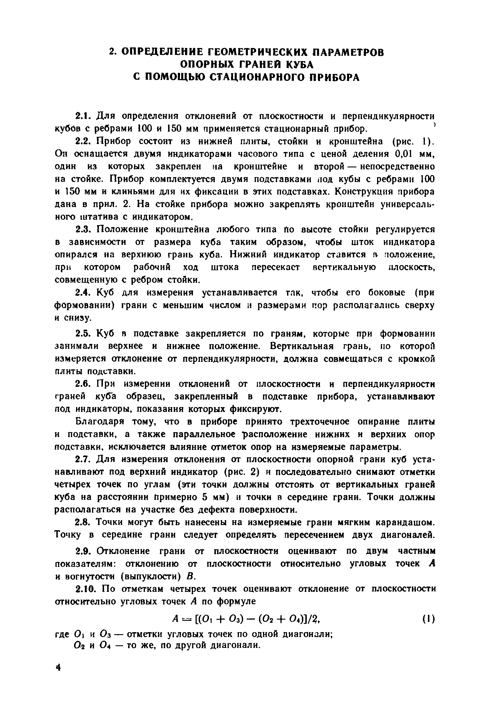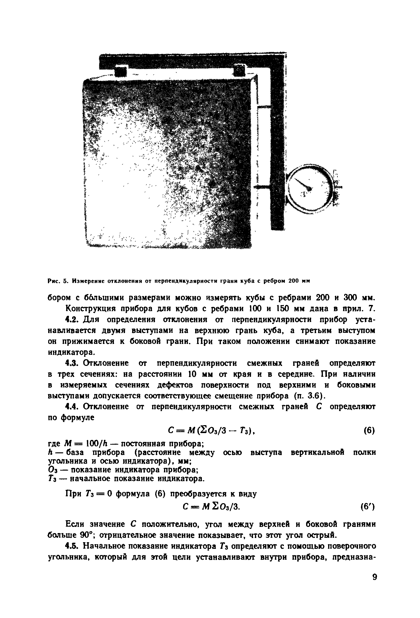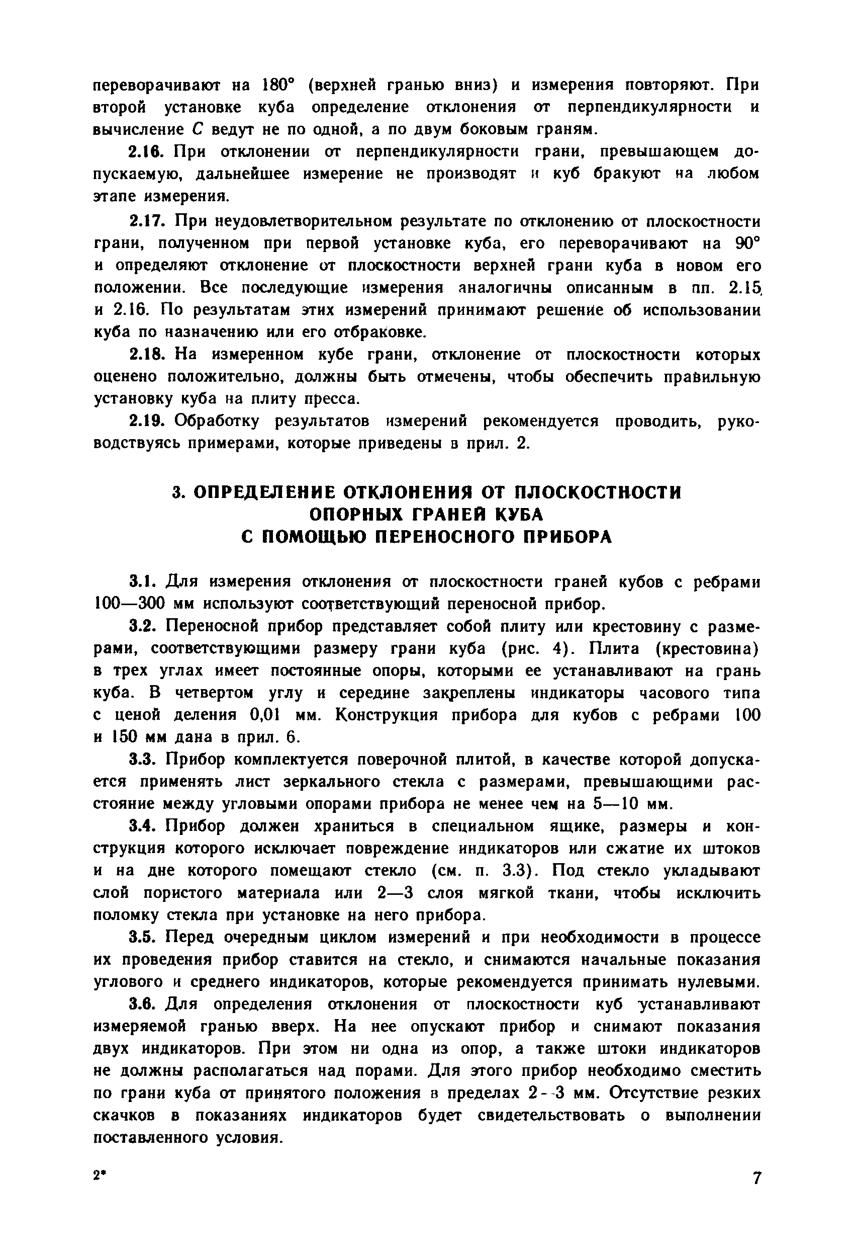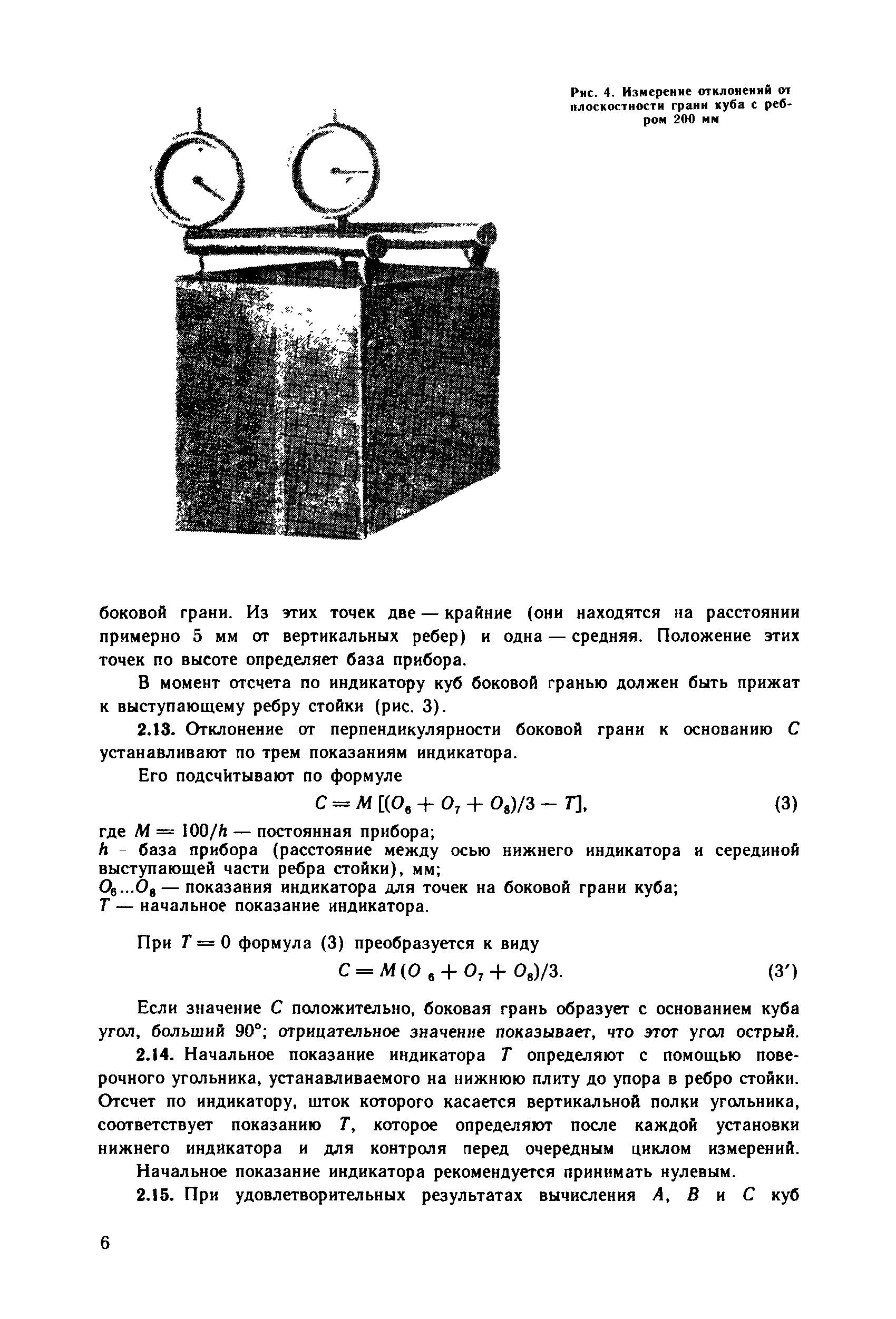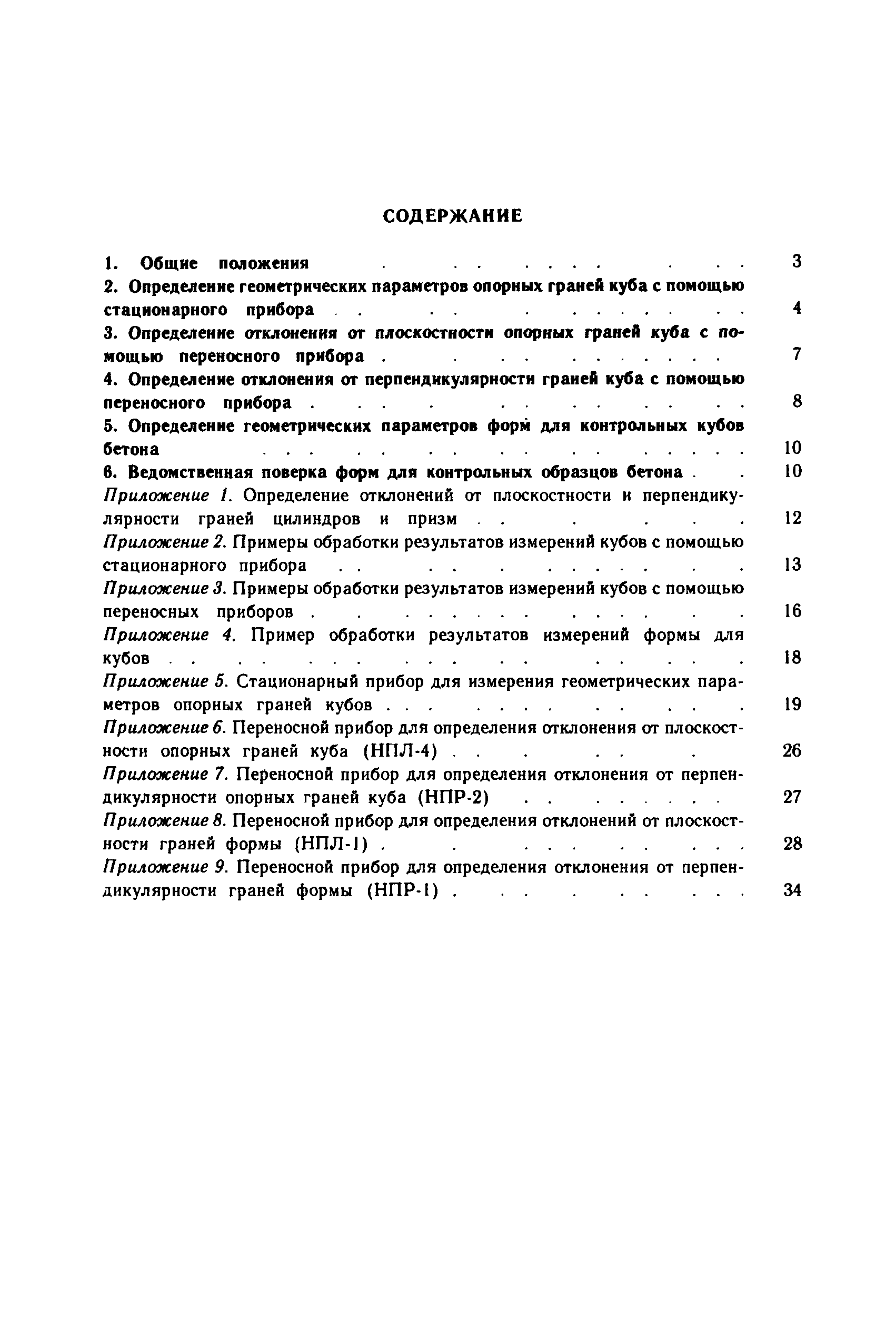 | Оглавление: | 1. Общие положения 2. Определение геометрических параметров опорных граней куба с помощью стационарного прибора 3. Определение отклонения от плоскостности опорных граней куба с помощью переносного прибора 4. Определение отклонения от перпендикулярности граней куба с помощью переносного прибора 5. Определение геометрических параметров форм для контрольных кубов бетона 6. Ведомственная поверка форм для контрольных образцов бетона Приложение 1. Определение отклонений от плоскостности и перпендикулярности граней цилиндров и призм Приложение 2. Примеры обработки результатов измерений кубов с помощью стационарного прибора Приложение 3. Примеры обработки результатов измерений кубов с помощью переносных приборов Приложение 4. Пример обработки результатов измерений формы для кубов Приложение 5. Стационарный прибор для измерения геометрических параметров опорных граней кубов Приложение 6. Переносный прибор для определения отклонения от плоскостности опорных граней куба (НПЛ-4) Приложение 7. Переносный прибор для определения отклонения от перпендикулярности опорных граней куба (НПЛ-2) Приложение 8. Переносный прибор для определения отклонений от плоскостности граней формы (НПЛ-1) Приложение 9. Переносный прибор для определения отклонения от перпендикулярности граней формы (НПР-1) |