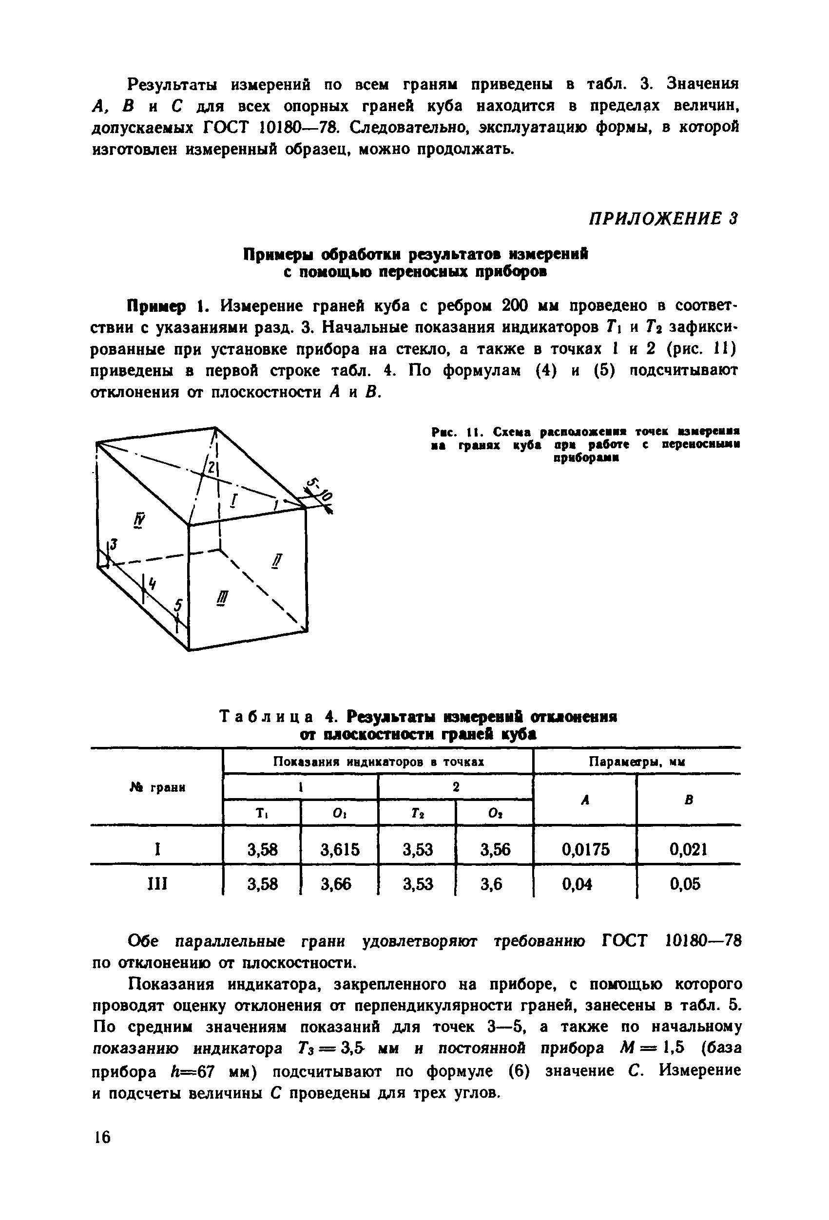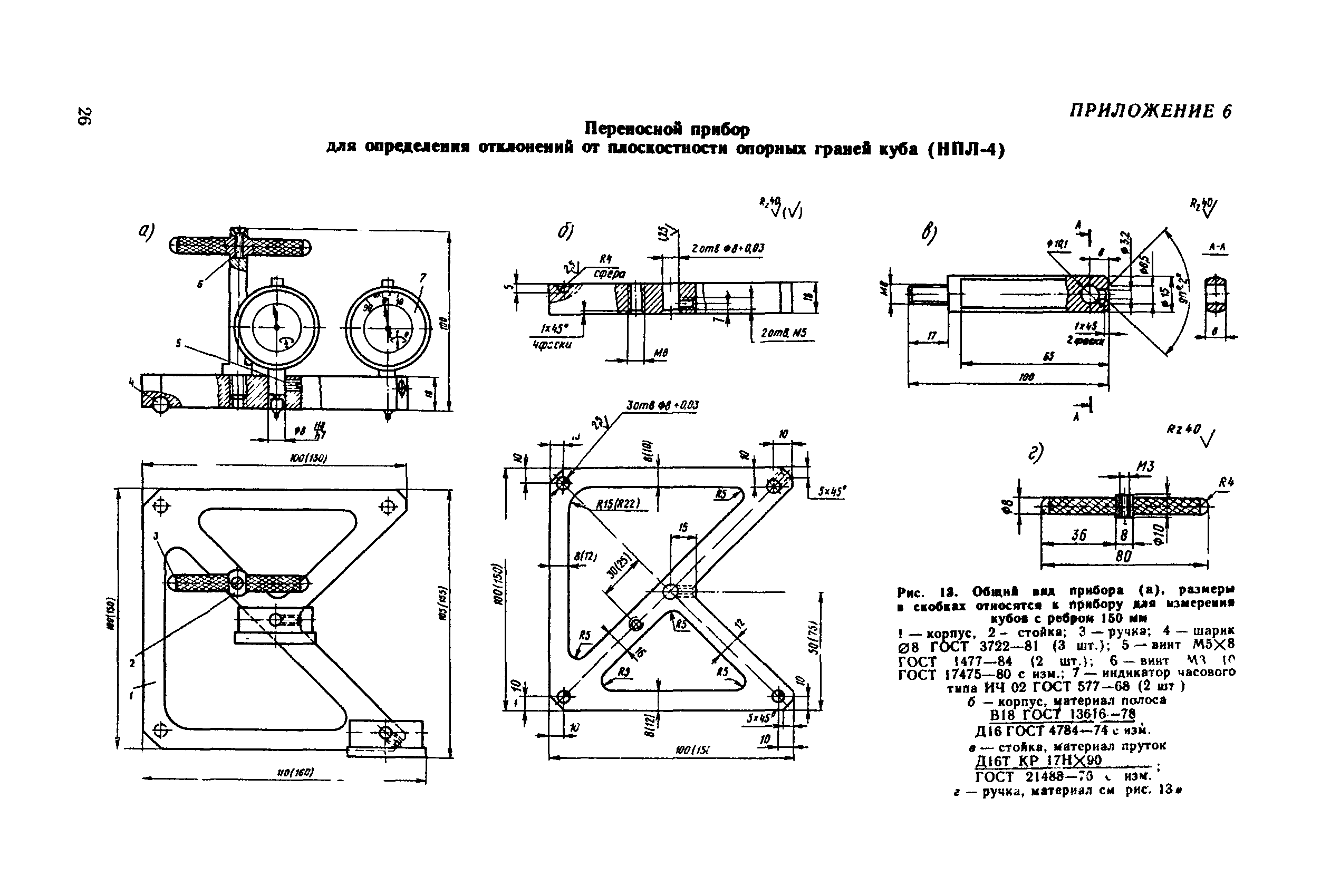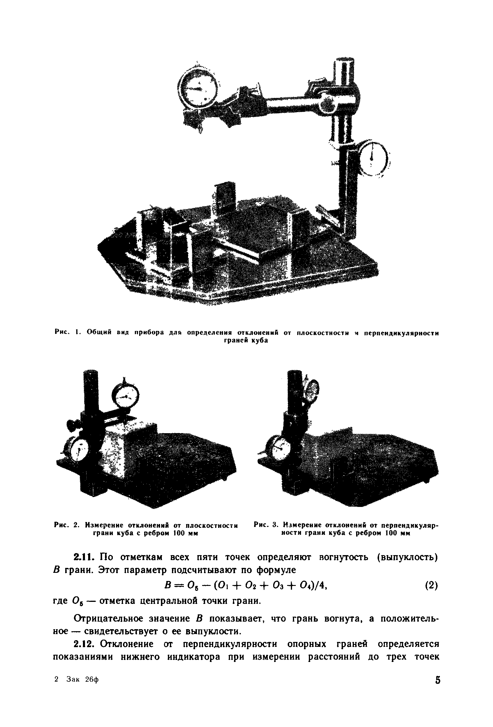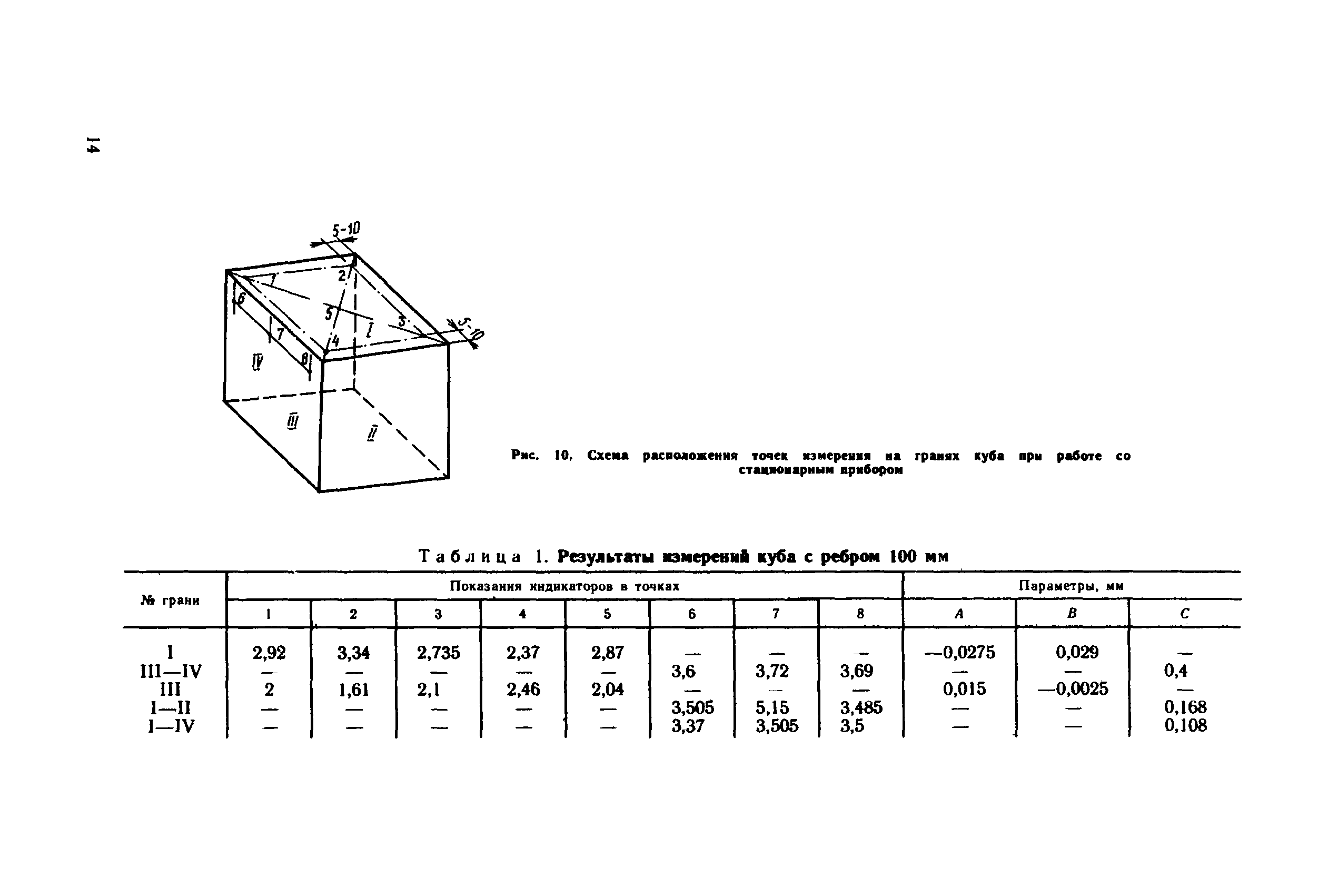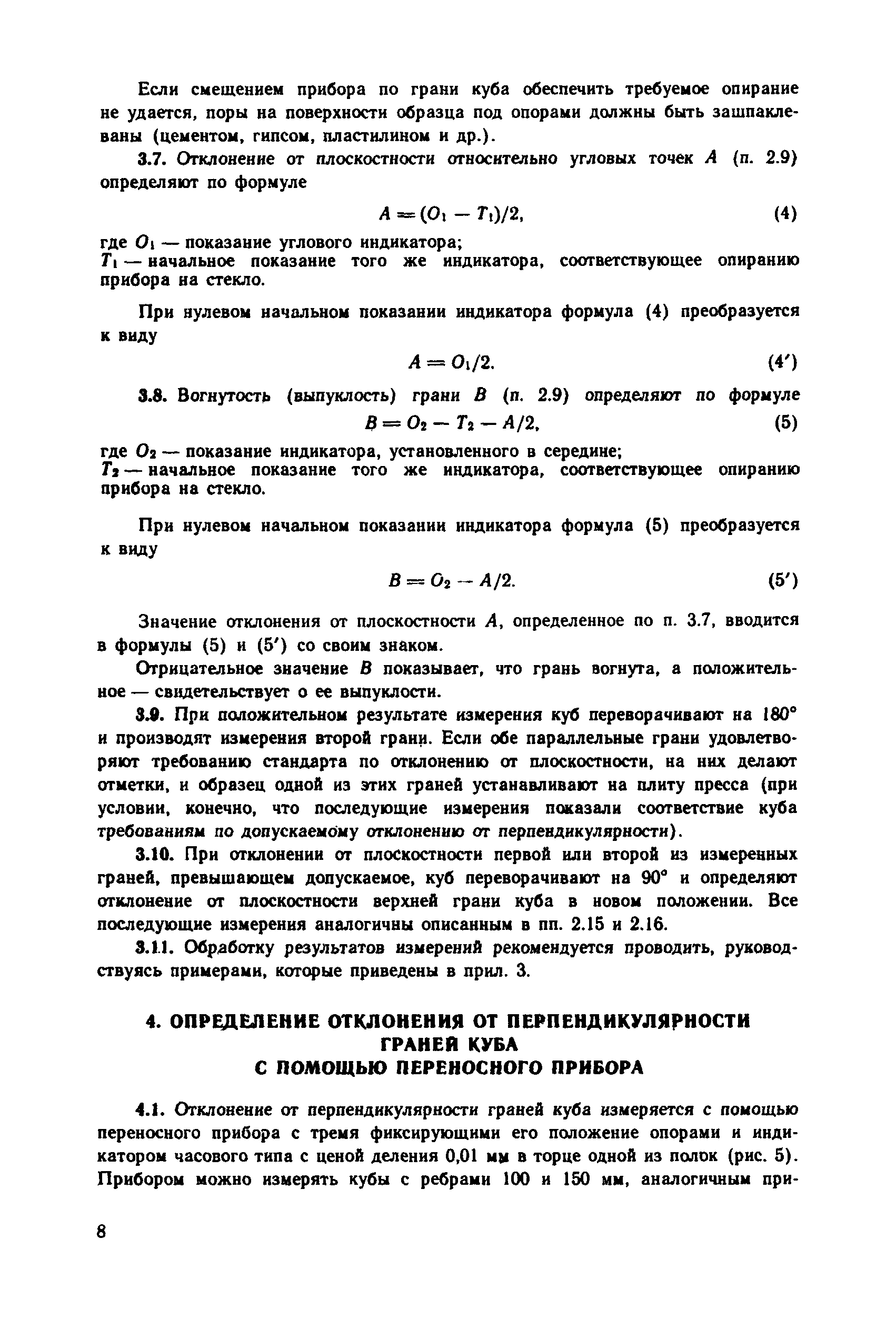 | Оглавление: | 1. Общие положения 2. Определение геометрических параметров опорных граней куба с помощью стационарного прибора 3. Определение отклонения от плоскостности опорных граней куба с помощью переносного прибора 4. Определение отклонения от перпендикулярности граней куба с помощью переносного прибора 5. Определение геометрических параметров форм для контрольных кубов бетона 6. Ведомственная поверка форм для контрольных образцов бетона Приложение 1. Определение отклонений от плоскостности и перпендикулярности граней цилиндров и призм Приложение 2. Примеры обработки результатов измерений кубов с помощью стационарного прибора Приложение 3. Примеры обработки результатов измерений кубов с помощью переносных приборов Приложение 4. Пример обработки результатов измерений формы для кубов Приложение 5. Стационарный прибор для измерения геометрических параметров опорных граней кубов Приложение 6. Переносный прибор для определения отклонения от плоскостности опорных граней куба (НПЛ-4) Приложение 7. Переносный прибор для определения отклонения от перпендикулярности опорных граней куба (НПЛ-2) Приложение 8. Переносный прибор для определения отклонений от плоскостности граней формы (НПЛ-1) Приложение 9. Переносный прибор для определения отклонения от перпендикулярности граней формы (НПР-1) |