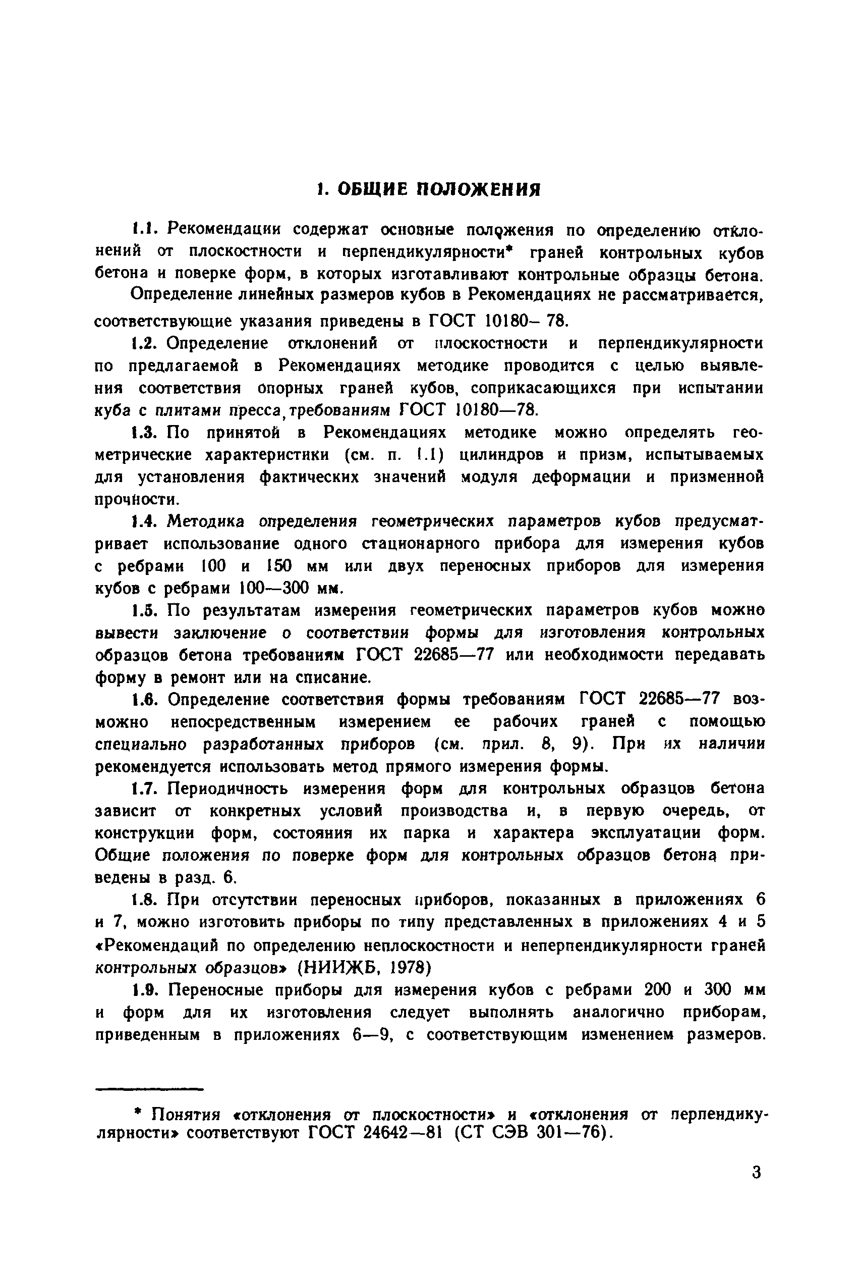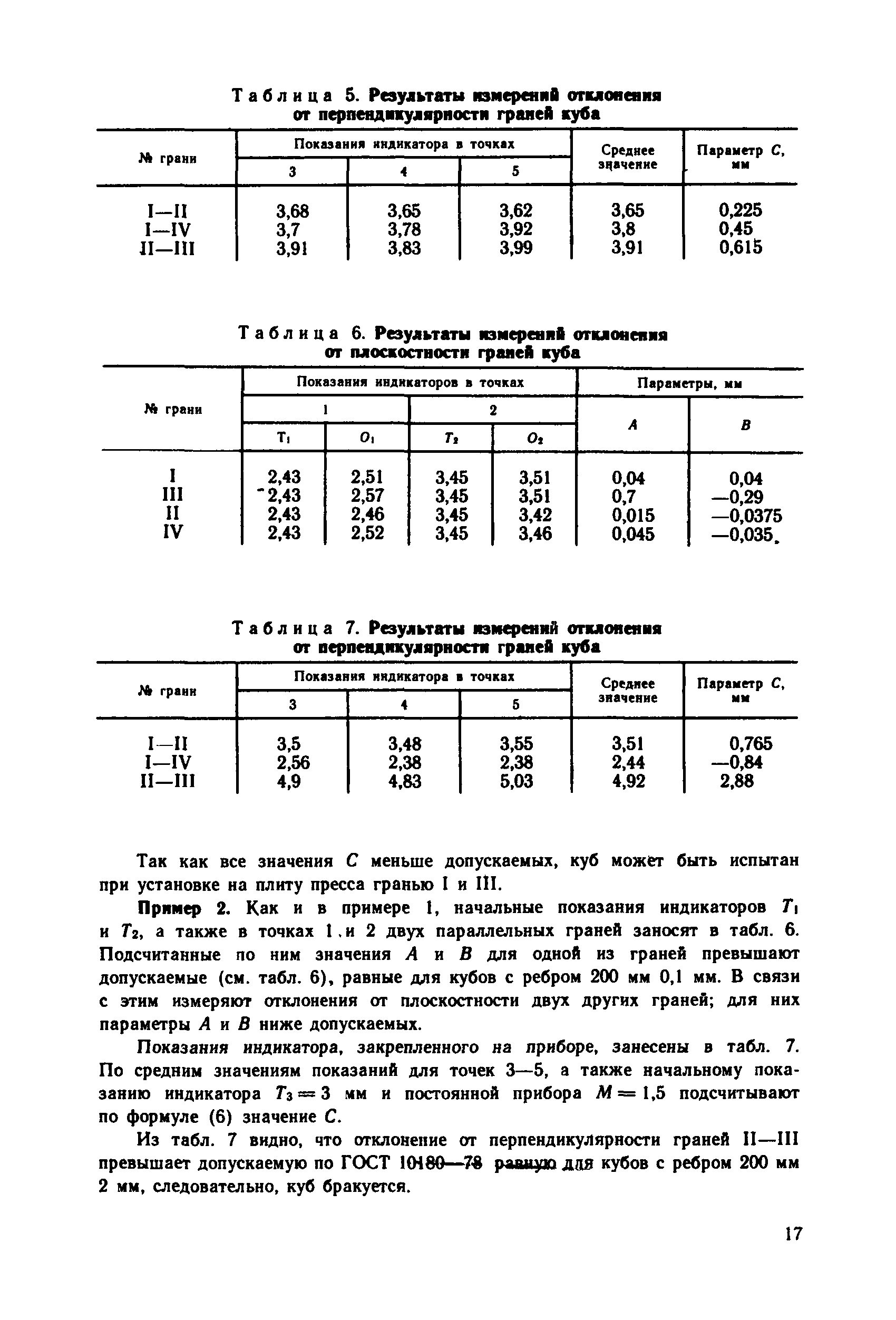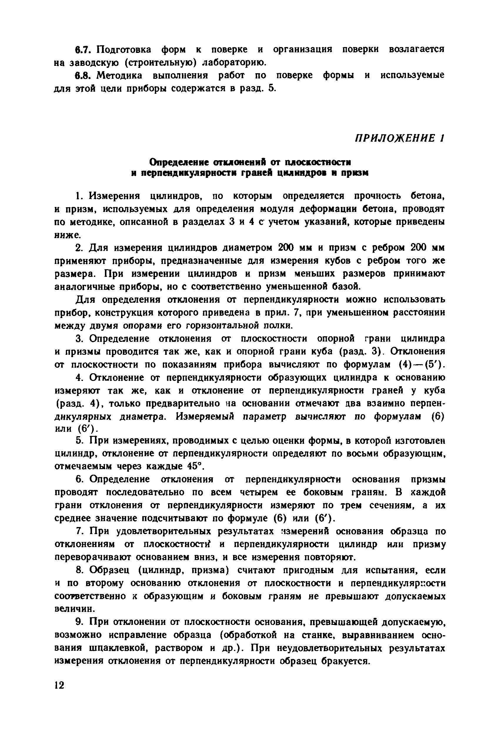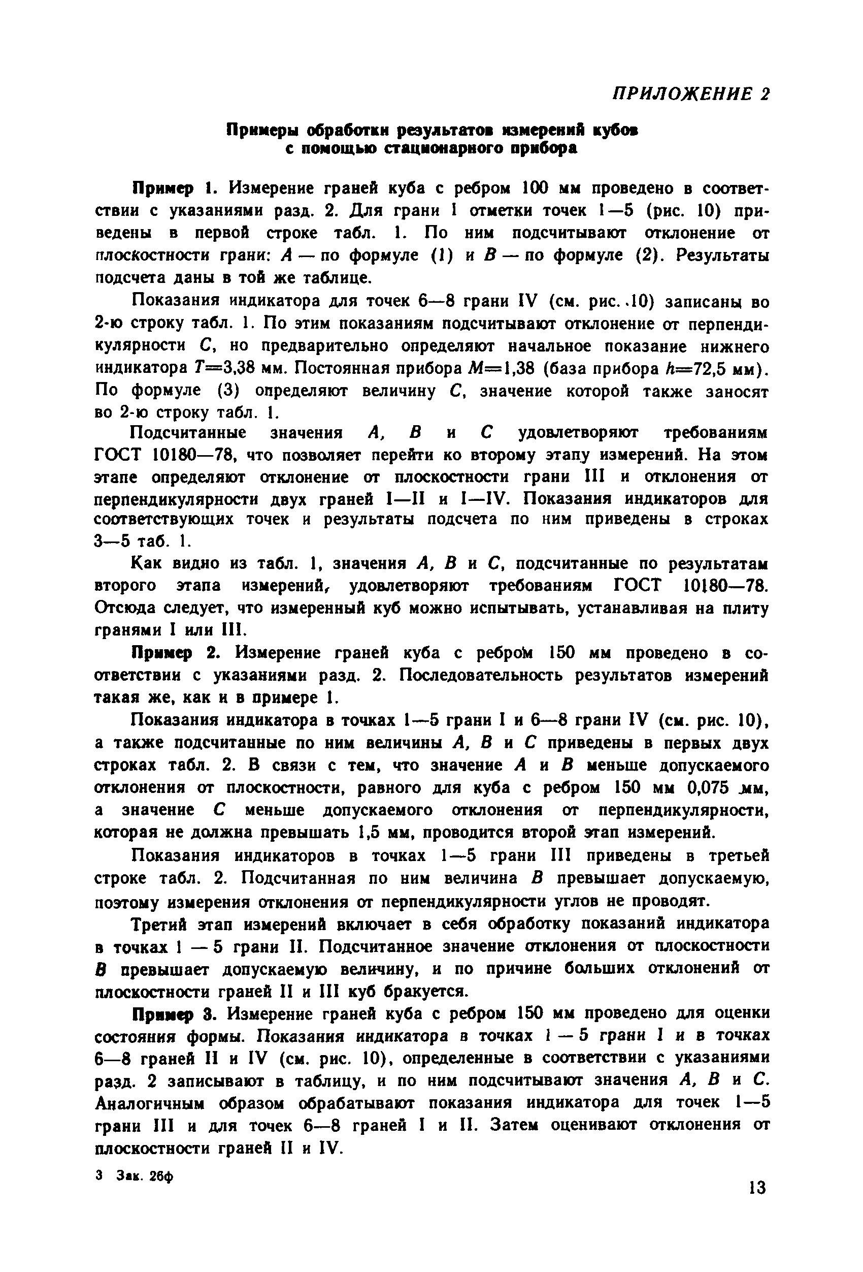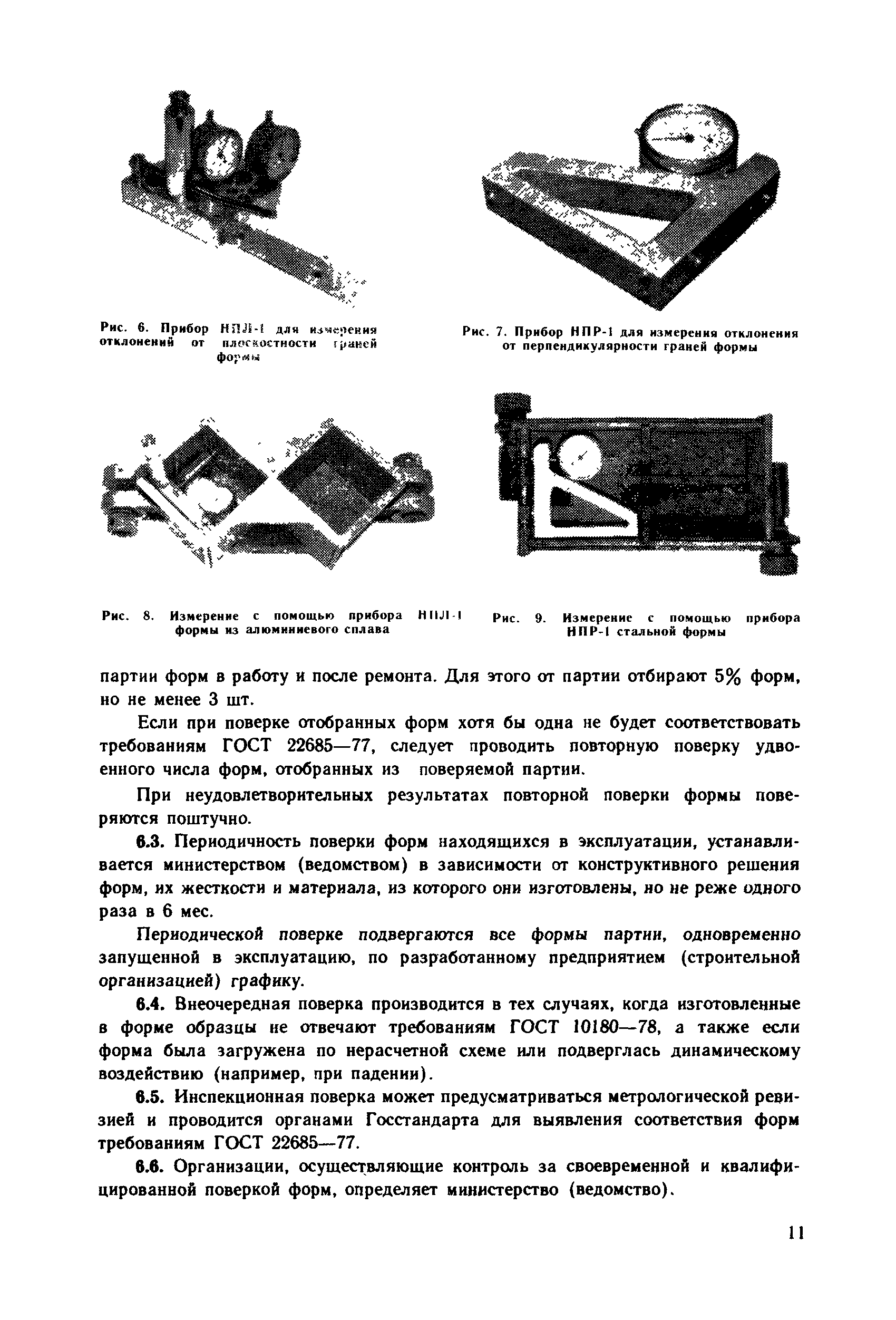 | Оглавление: | 1. Общие положения 2. Определение геометрических параметров опорных граней куба с помощью стационарного прибора 3. Определение отклонения от плоскостности опорных граней куба с помощью переносного прибора 4. Определение отклонения от перпендикулярности граней куба с помощью переносного прибора 5. Определение геометрических параметров форм для контрольных кубов бетона 6. Ведомственная поверка форм для контрольных образцов бетона Приложение 1. Определение отклонений от плоскостности и перпендикулярности граней цилиндров и призм Приложение 2. Примеры обработки результатов измерений кубов с помощью стационарного прибора Приложение 3. Примеры обработки результатов измерений кубов с помощью переносных приборов Приложение 4. Пример обработки результатов измерений формы для кубов Приложение 5. Стационарный прибор для измерения геометрических параметров опорных граней кубов Приложение 6. Переносный прибор для определения отклонения от плоскостности опорных граней куба (НПЛ-4) Приложение 7. Переносный прибор для определения отклонения от перпендикулярности опорных граней куба (НПЛ-2) Приложение 8. Переносный прибор для определения отклонений от плоскостности граней формы (НПЛ-1) Приложение 9. Переносный прибор для определения отклонения от перпендикулярности граней формы (НПР-1) |