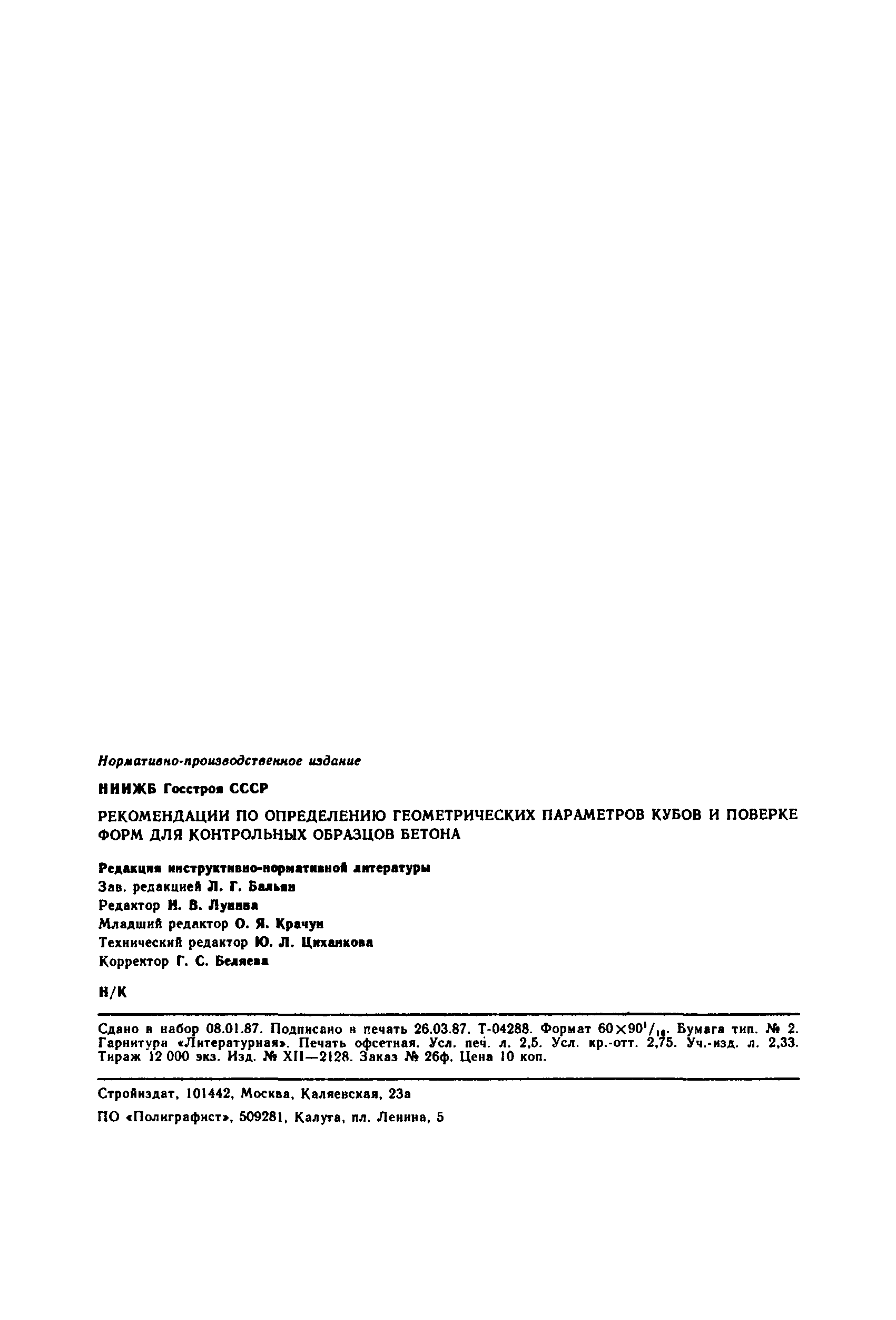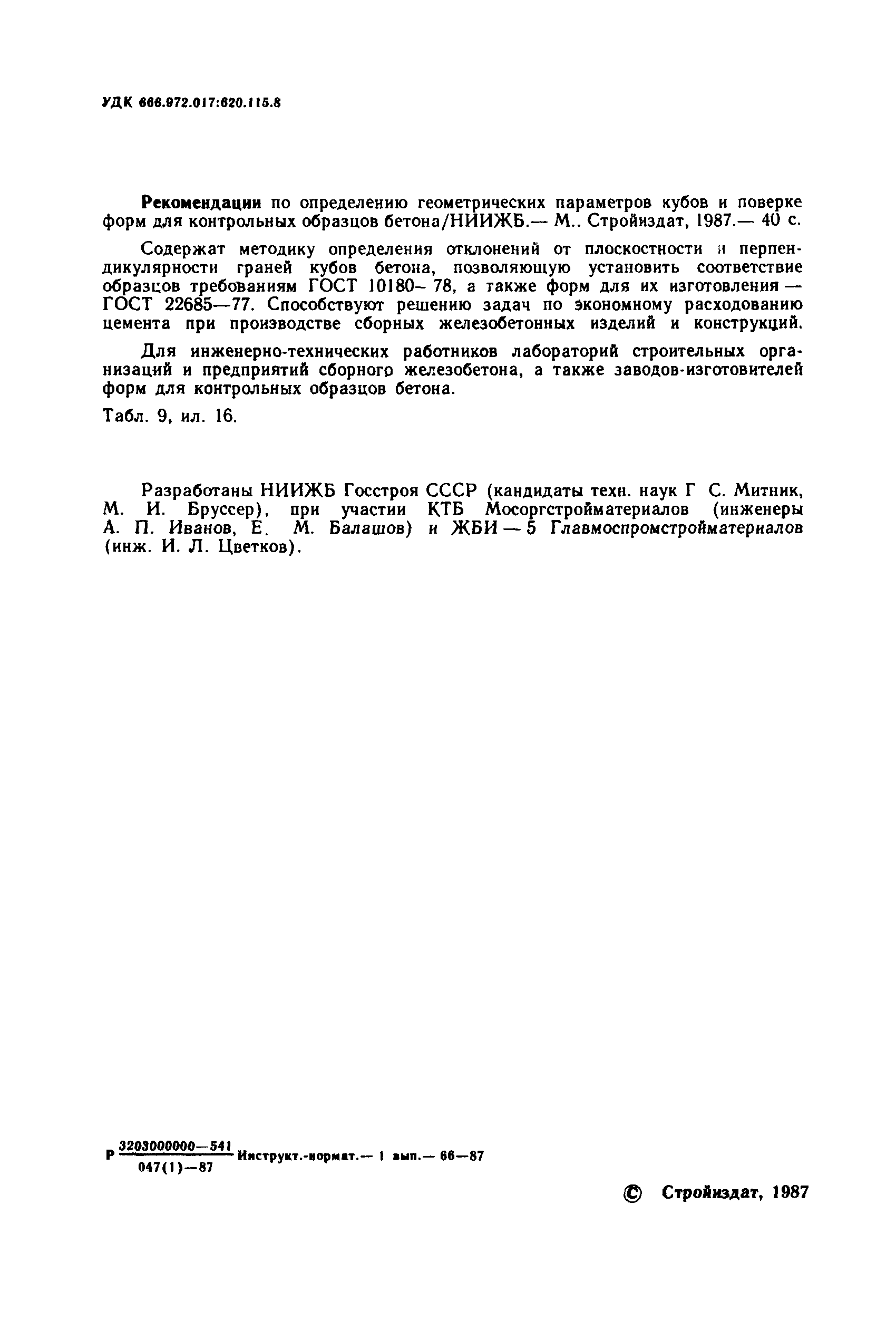 | Название рус.: | Рекомендации по определению геометрических параметров кубов и поверке форм для контрольных образцов бетона |