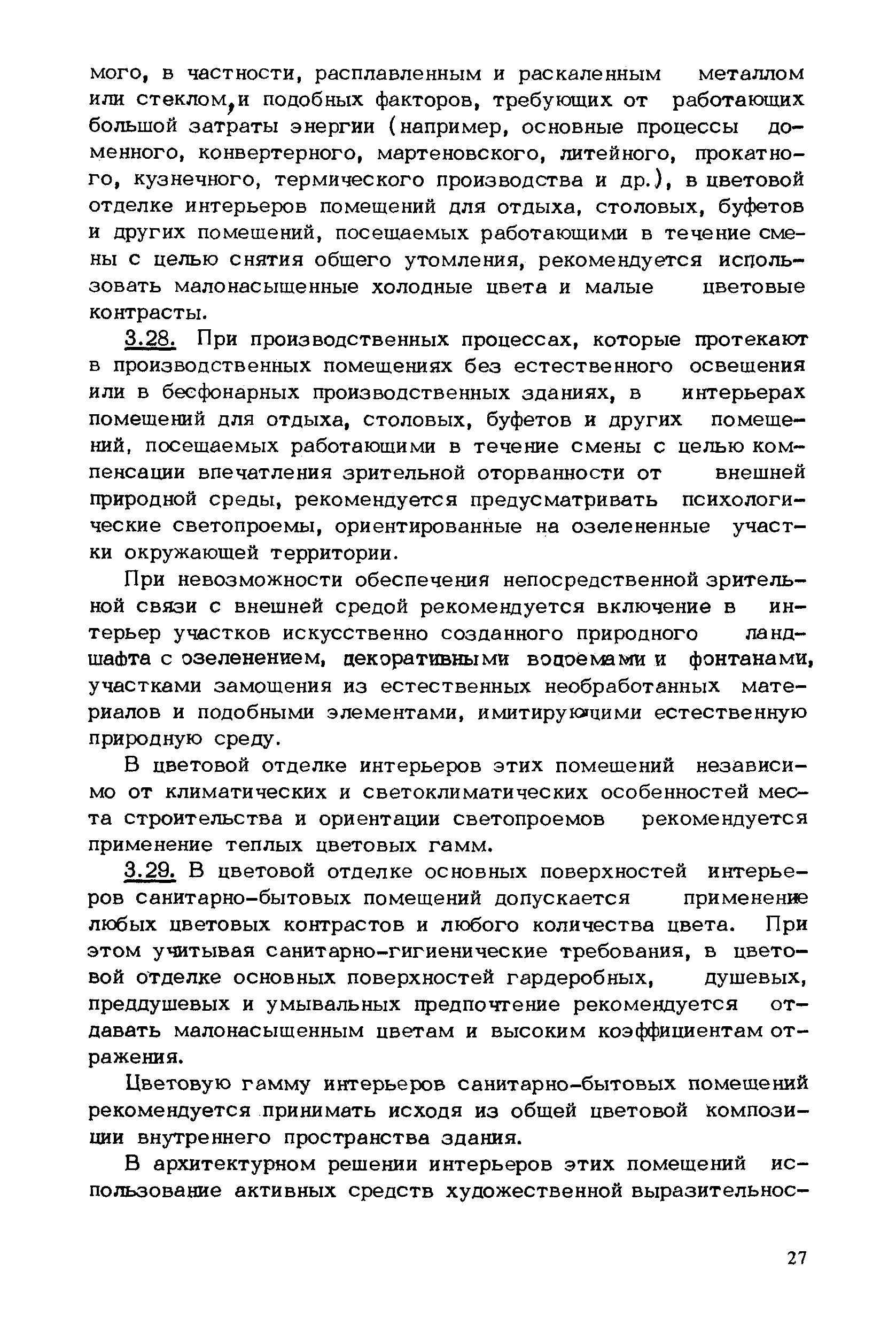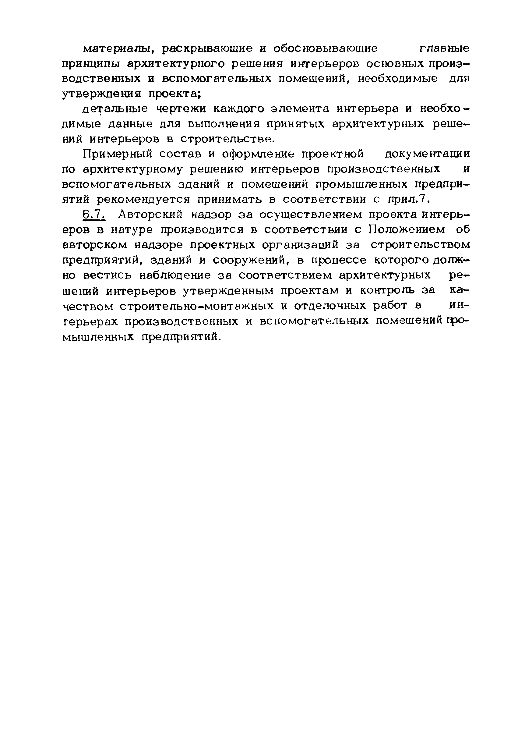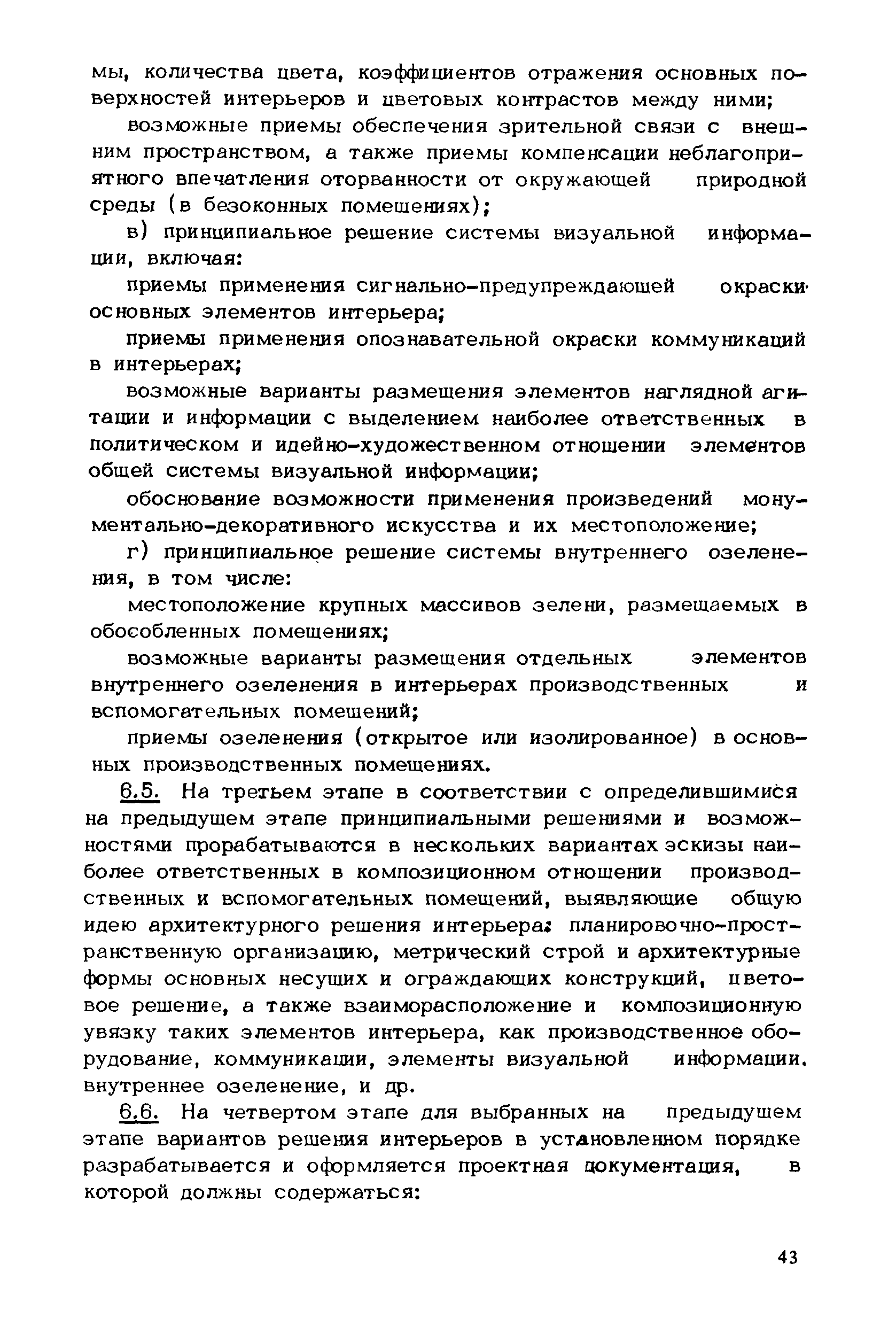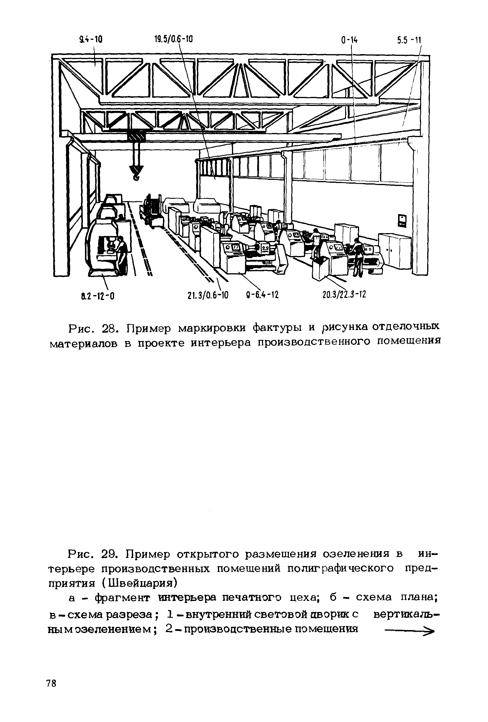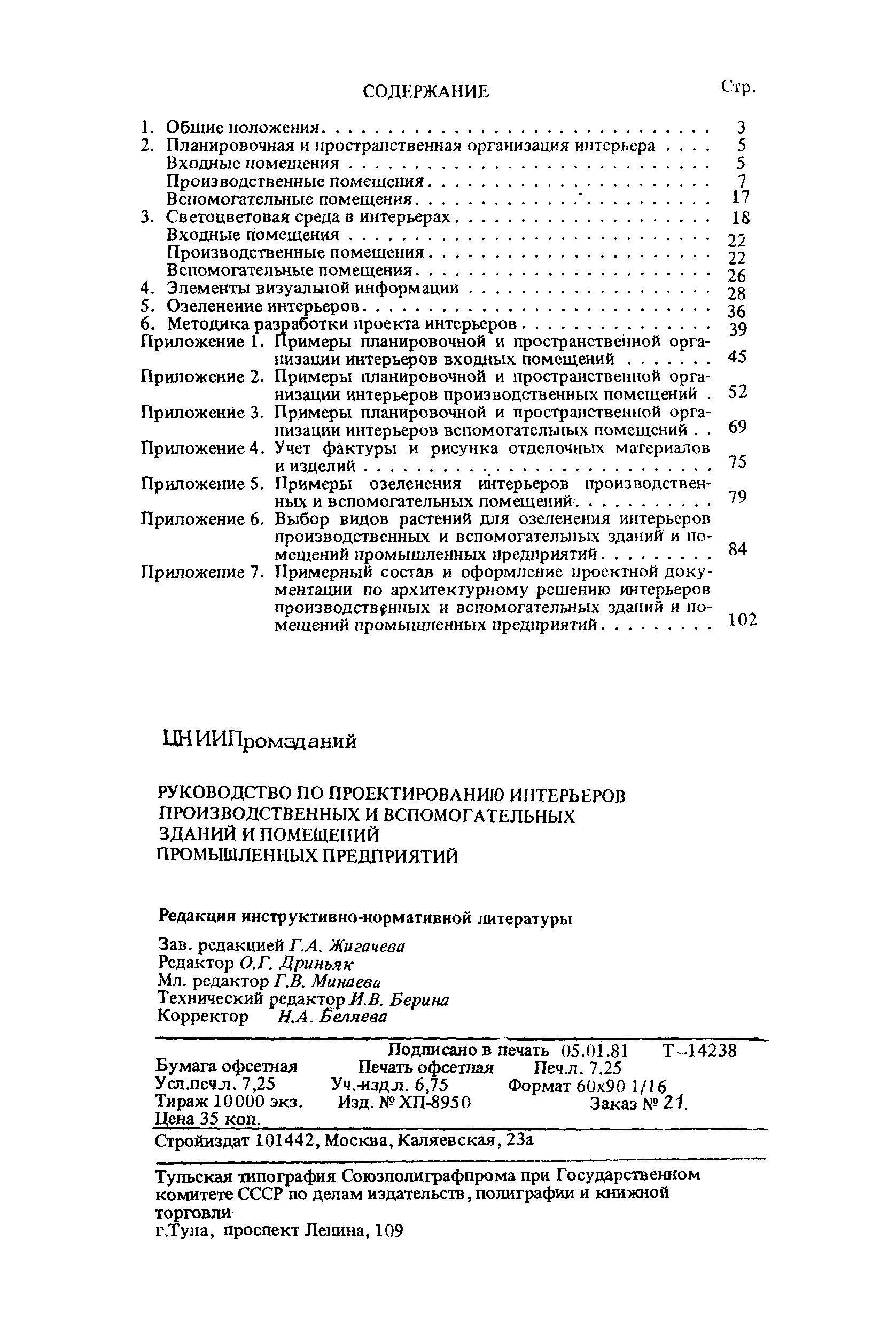 | Оглавление: | 1. Общие положения 2. Планировочная и пространственная организация интерьера Входные помещения Производственные помещения Вспомогательные помещения 3. Светоцветовая среда в интерьерах Входные помещения Производственные помещения Вспомогательные помещения 4. Элементы визуальной информации 5. Озеленение интерьеров 6. Методика разработки проекта интерьеров Приложение 1. Примеры планировочной и пространственной организации интерьеров входных помещений Приложение 2. Примеры планировочной и пространственной организации интерьеров производственных помещений Приложение 3. Примеры планировочной и пространственной организации интерьеров вспомогательных помещений Приложение 4. Учет фактуры и рисунка отделочных материалов и изделий Приложение 5. Примеры озеленения интерьеров производственных и вспомогательных помещений Приложение 6. Выбор видов растений для озеленения интерьеров производственных и вспомогательных зданий и помещений промышленных предприятий Приложение 7. Примерный состав и оформление проектной документации по архитектурному решению интерьеров производственных и вспомогательных зданий и помещений промышленных предприятий |