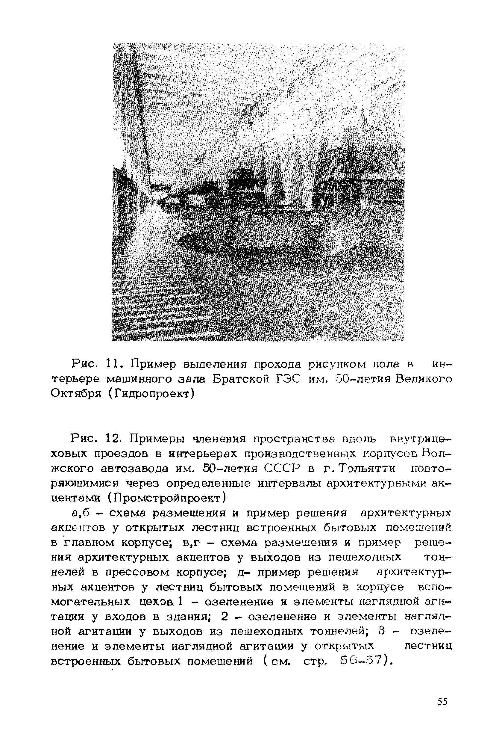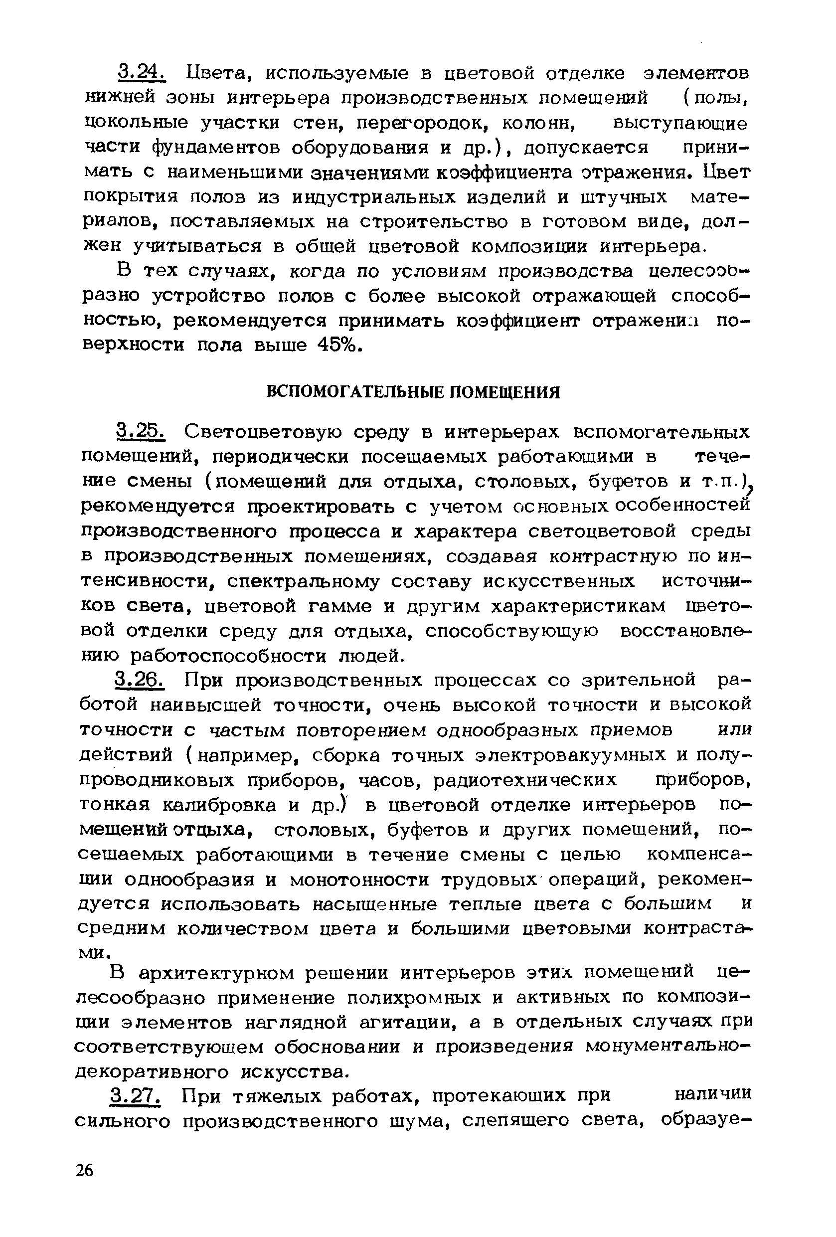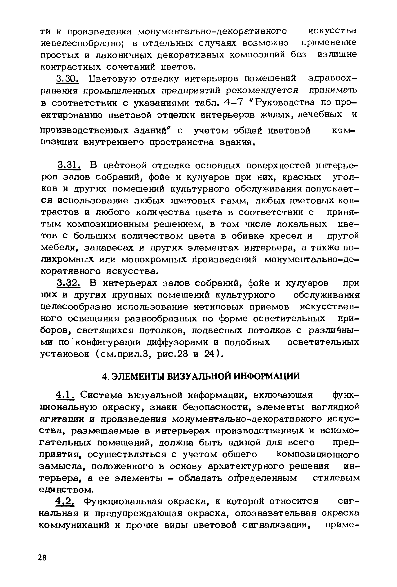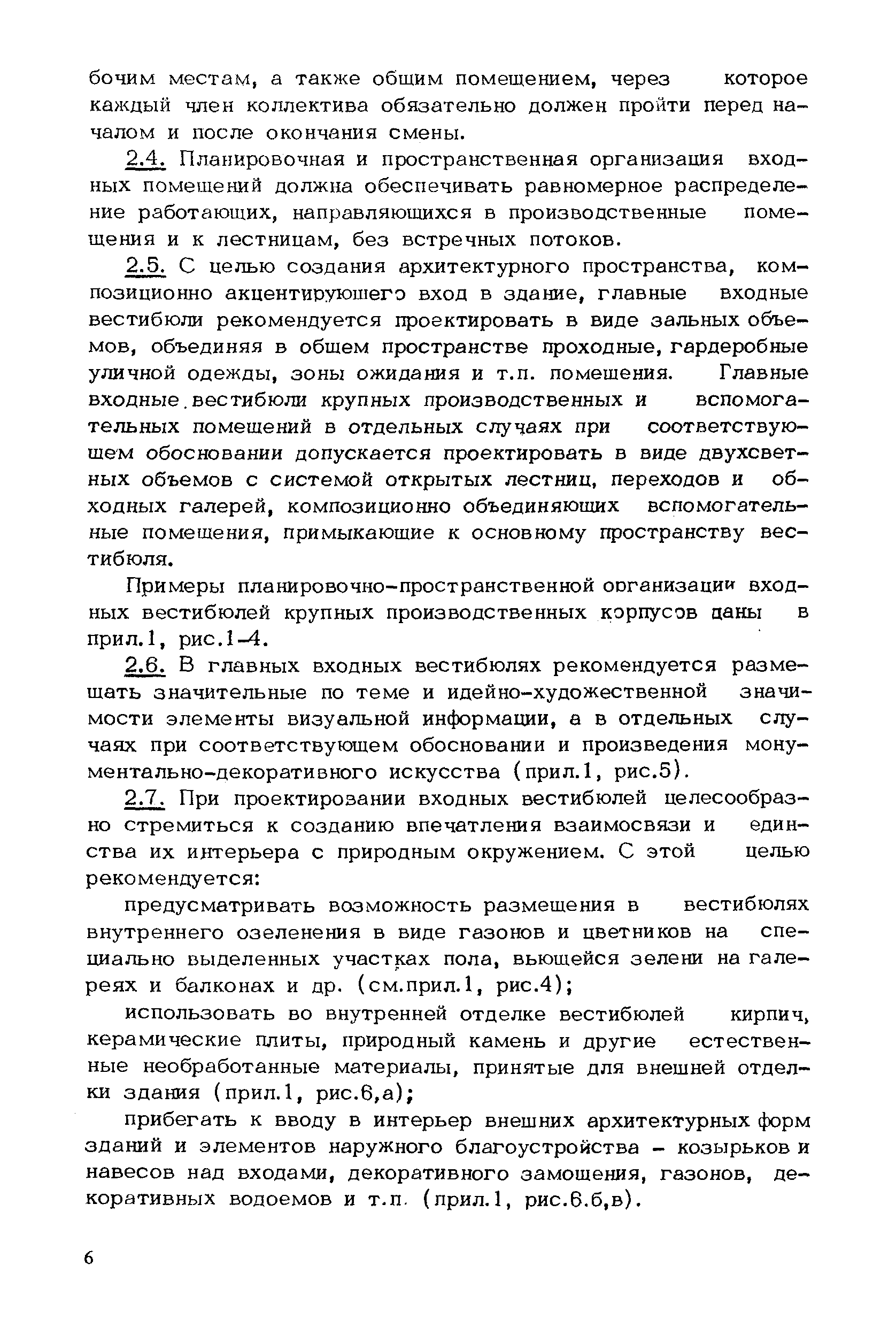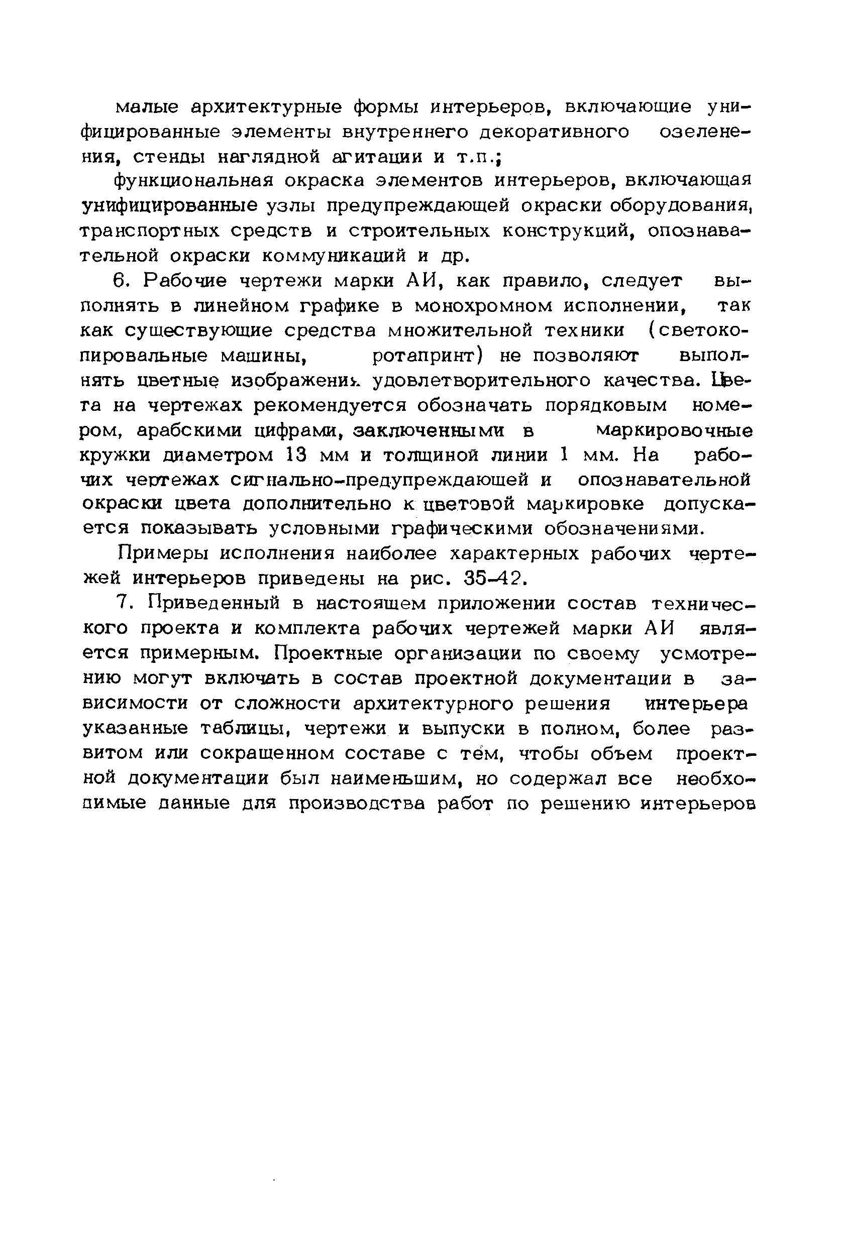 | Оглавление: | 1. Общие положения 2. Планировочная и пространственная организация интерьера Входные помещения Производственные помещения Вспомогательные помещения 3. Светоцветовая среда в интерьерах Входные помещения Производственные помещения Вспомогательные помещения 4. Элементы визуальной информации 5. Озеленение интерьеров 6. Методика разработки проекта интерьеров Приложение 1. Примеры планировочной и пространственной организации интерьеров входных помещений Приложение 2. Примеры планировочной и пространственной организации интерьеров производственных помещений Приложение 3. Примеры планировочной и пространственной организации интерьеров вспомогательных помещений Приложение 4. Учет фактуры и рисунка отделочных материалов и изделий Приложение 5. Примеры озеленения интерьеров производственных и вспомогательных помещений Приложение 6. Выбор видов растений для озеленения интерьеров производственных и вспомогательных зданий и помещений промышленных предприятий Приложение 7. Примерный состав и оформление проектной документации по архитектурному решению интерьеров производственных и вспомогательных зданий и помещений промышленных предприятий |