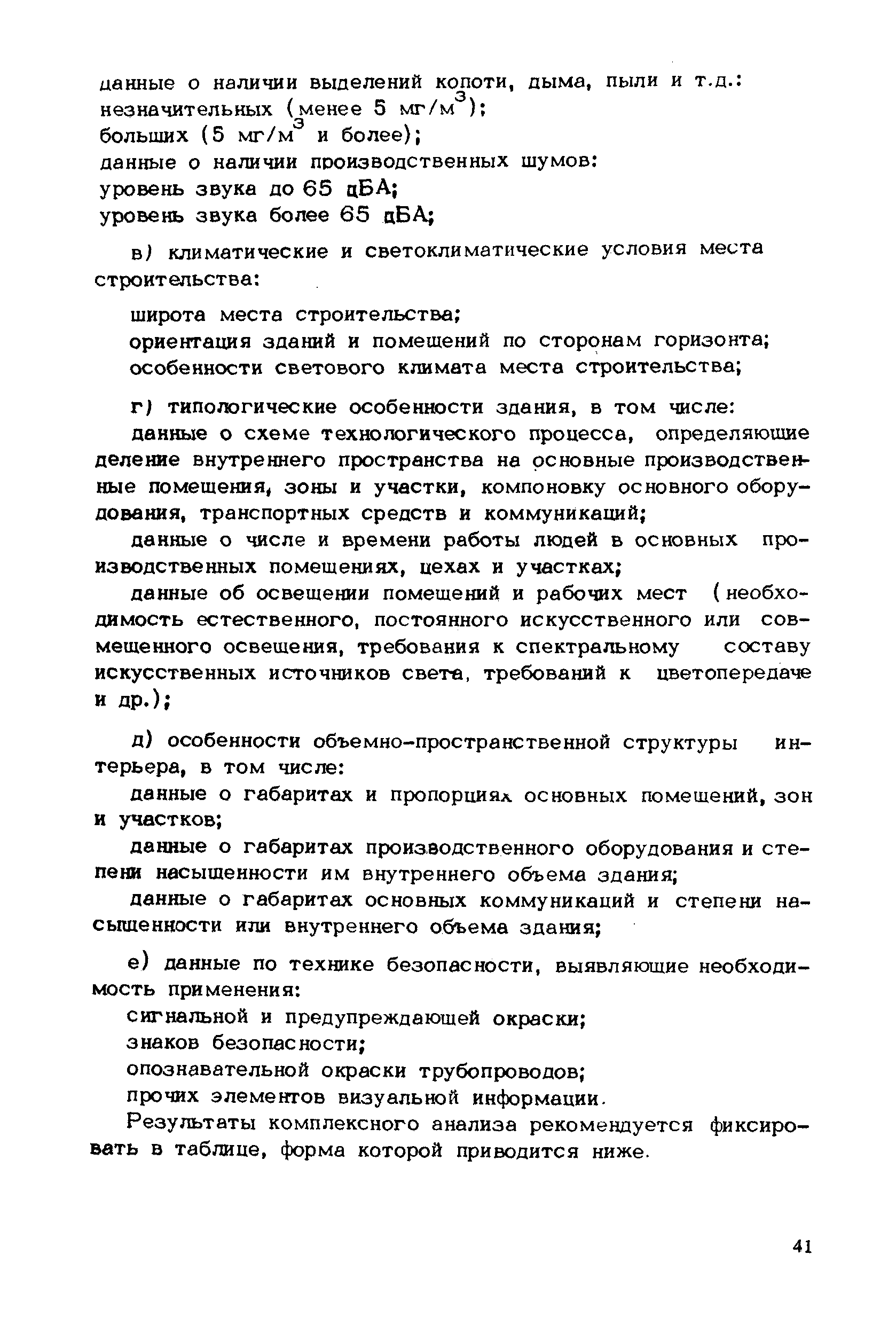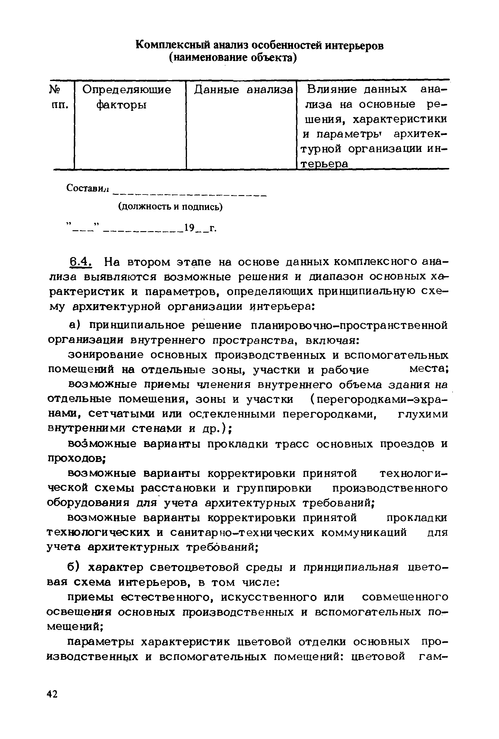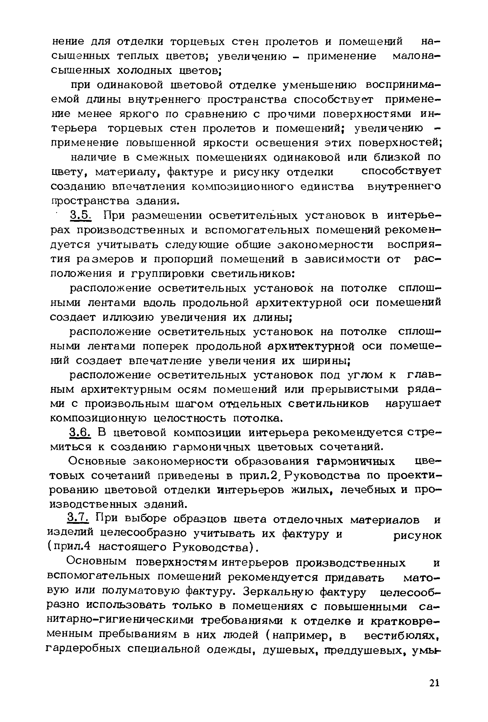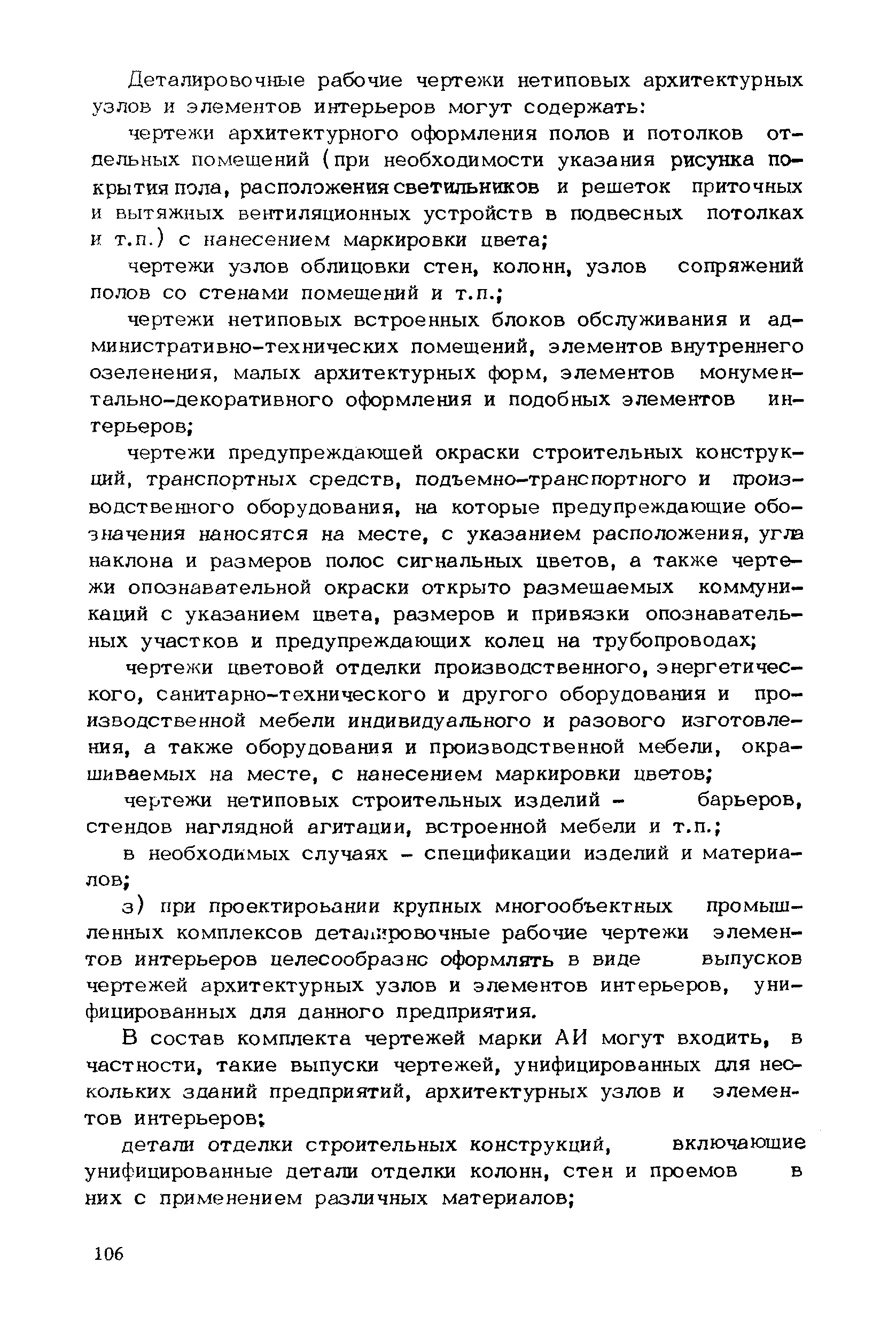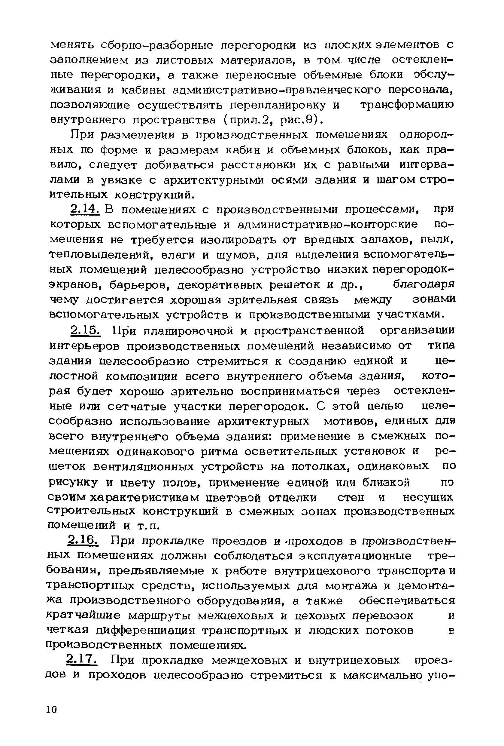 | Оглавление: | 1. Общие положения 2. Планировочная и пространственная организация интерьера Входные помещения Производственные помещения Вспомогательные помещения 3. Светоцветовая среда в интерьерах Входные помещения Производственные помещения Вспомогательные помещения 4. Элементы визуальной информации 5. Озеленение интерьеров 6. Методика разработки проекта интерьеров Приложение 1. Примеры планировочной и пространственной организации интерьеров входных помещений Приложение 2. Примеры планировочной и пространственной организации интерьеров производственных помещений Приложение 3. Примеры планировочной и пространственной организации интерьеров вспомогательных помещений Приложение 4. Учет фактуры и рисунка отделочных материалов и изделий Приложение 5. Примеры озеленения интерьеров производственных и вспомогательных помещений Приложение 6. Выбор видов растений для озеленения интерьеров производственных и вспомогательных зданий и помещений промышленных предприятий Приложение 7. Примерный состав и оформление проектной документации по архитектурному решению интерьеров производственных и вспомогательных зданий и помещений промышленных предприятий |