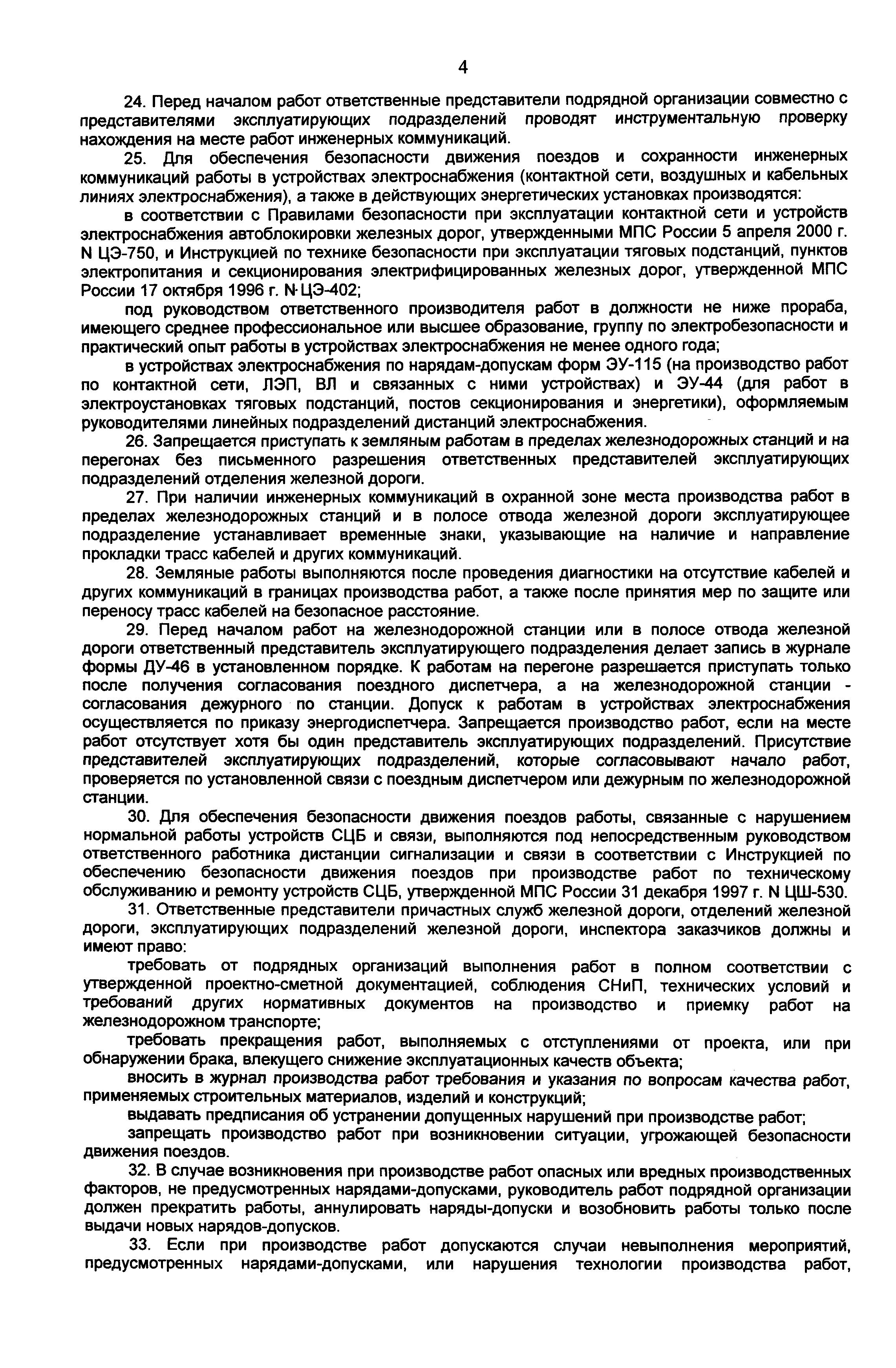 | Область применения: | Положение определяет порядок обеспечения безопасности движения поездов, сохранности инженерных коммуникаций и электробезопасности работников при производстве строительных и строительно-монтажных работ на железнодорожных станциях, перегонах, в полосе отвода железных дорог и в охранной зоне производственных объектов, сооружений и устройств ОАО "РЖД", получения заказчиками строительства и строительными организациями разрешающих документов на производство работ в зоне действия технических сооружений и устройств железных дорог, а также порядок обеспечения контроля за их производством. |