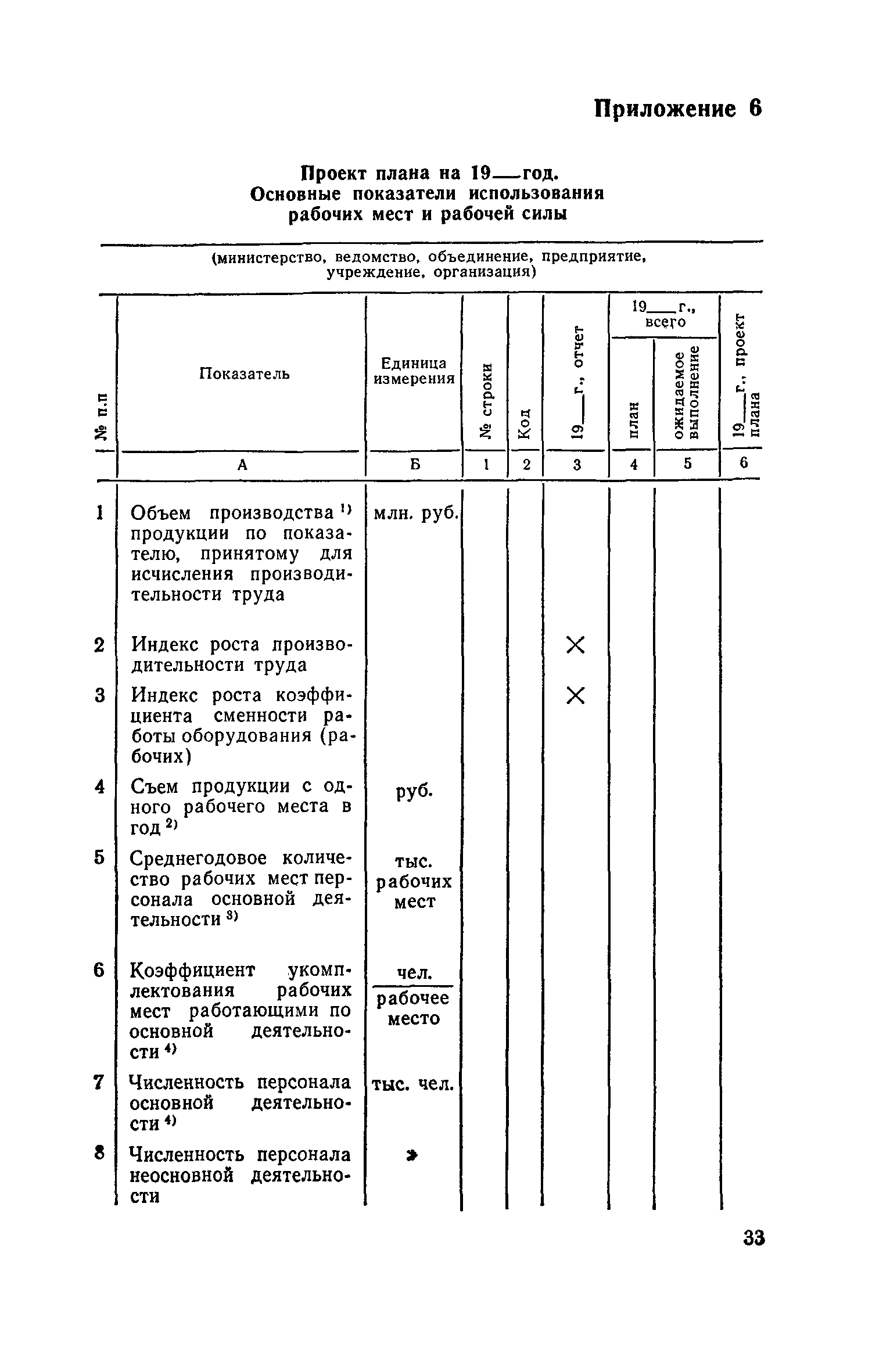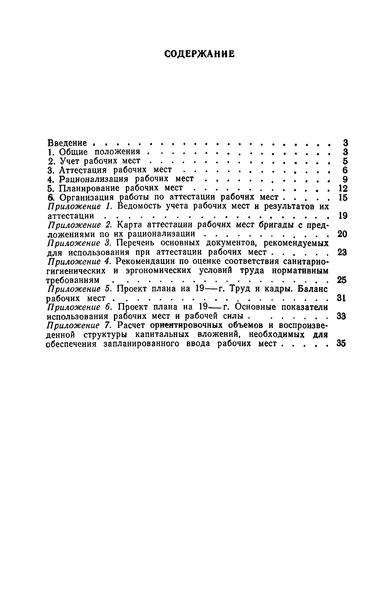 | Оглавление: | Введение 1. Общие положения 2. Учет рабочих мест 3. Аттестация рабочих мест 4. Рационализация рабочих мест 5. Планирование рабочих мест 6. Организация работы по аттестации рабочих мест Приложение 1. Ведомость учета рабочих мест и результатов их аттестации Приложение 2. Карта аттестации рабочих мест бригады с предложениями по их рационализации Приложение 3. Перечень основных документов, рекомендуемых для использования при аттестации рабочих мест Приложение 4. Рекомендации по оценке соответствия санитарно-гигиенических и эргономических условий труда нормативным требованиям Приложение 5. Проект плана на 19 - - г. Труд и кадры. Баланс рабочих мест Приложение 6. Проект плана на 19 - - г. Основные показатели использования рабочих мест и рабочей силы Приложение 7. Расчет ориентировочных объемов и воспроизведенной структуры капитальных вложений, необходимых для обеспечения запланированного ввода рабочих мест |