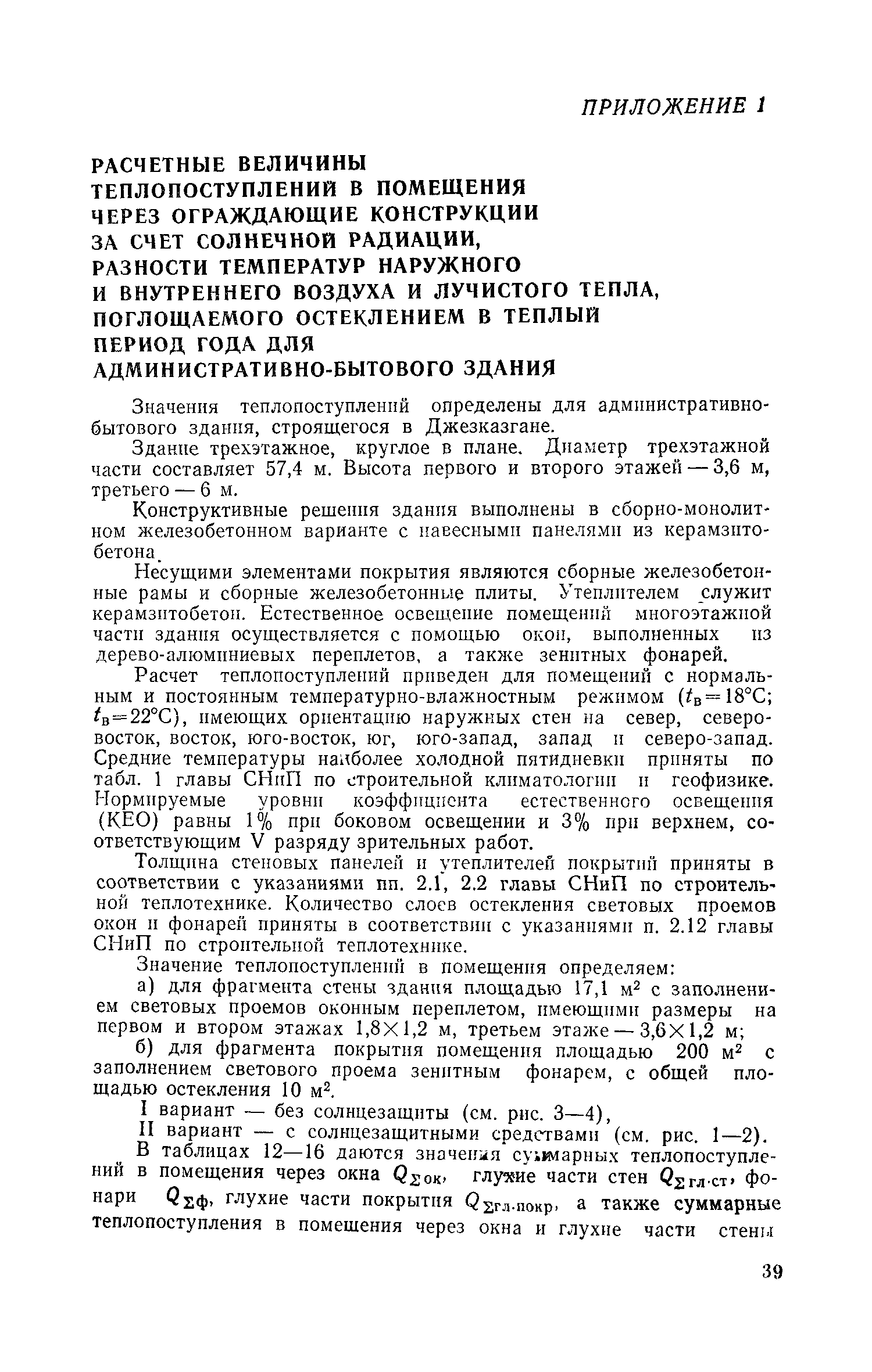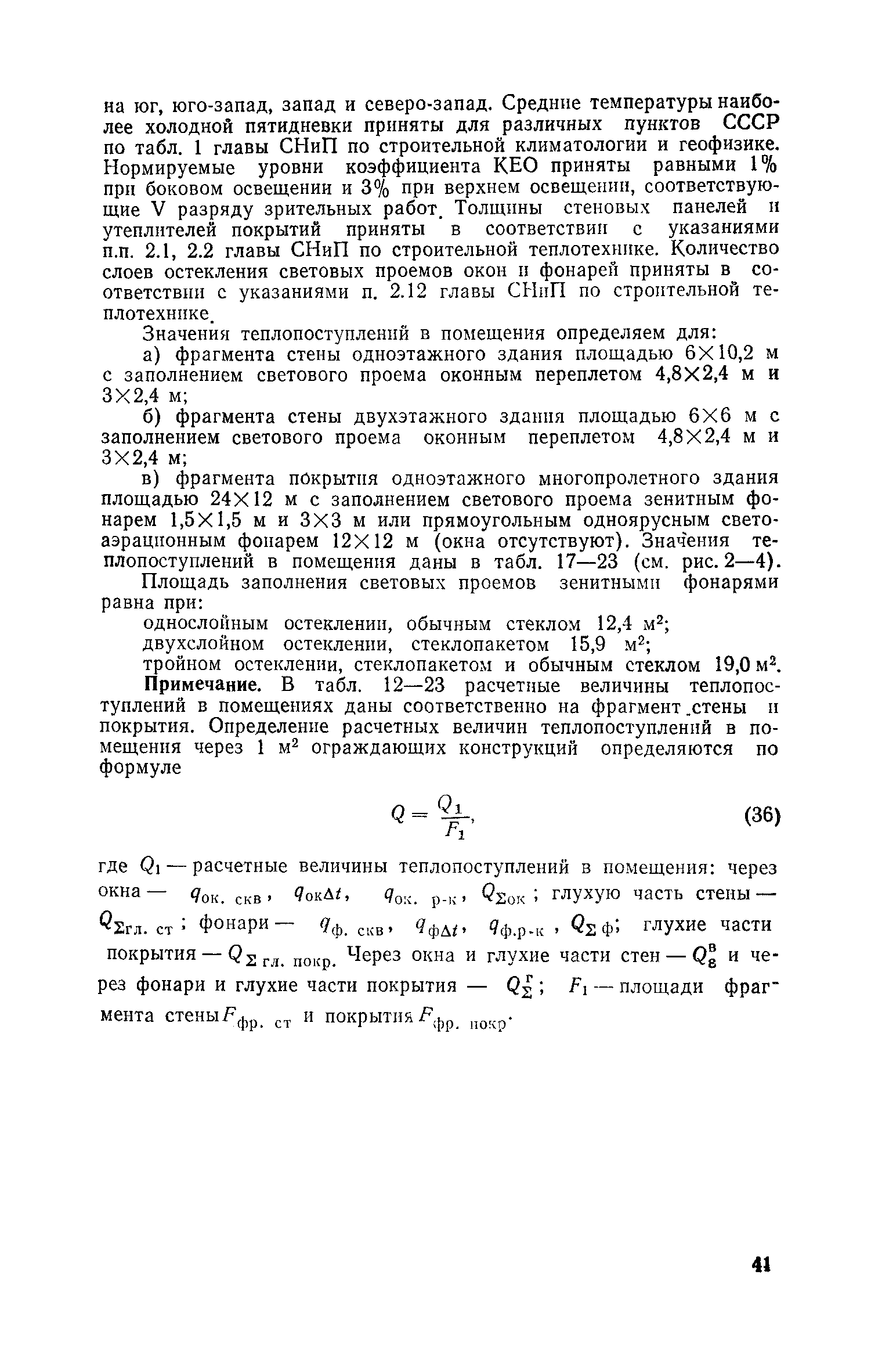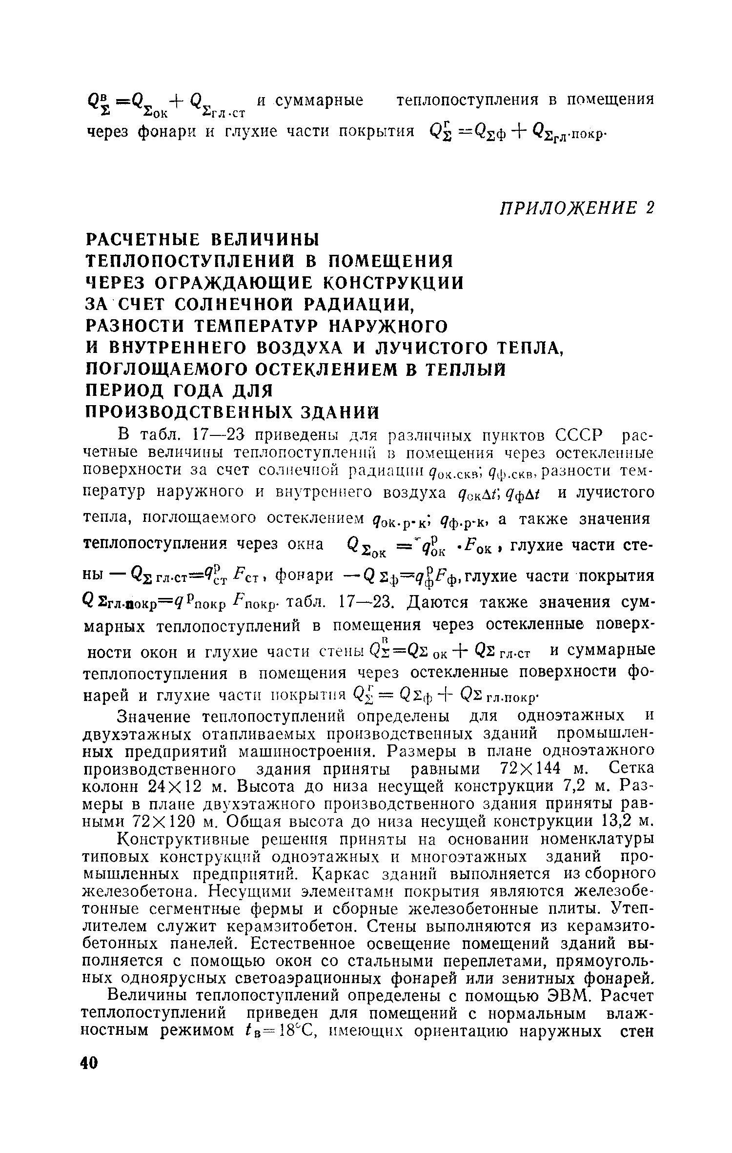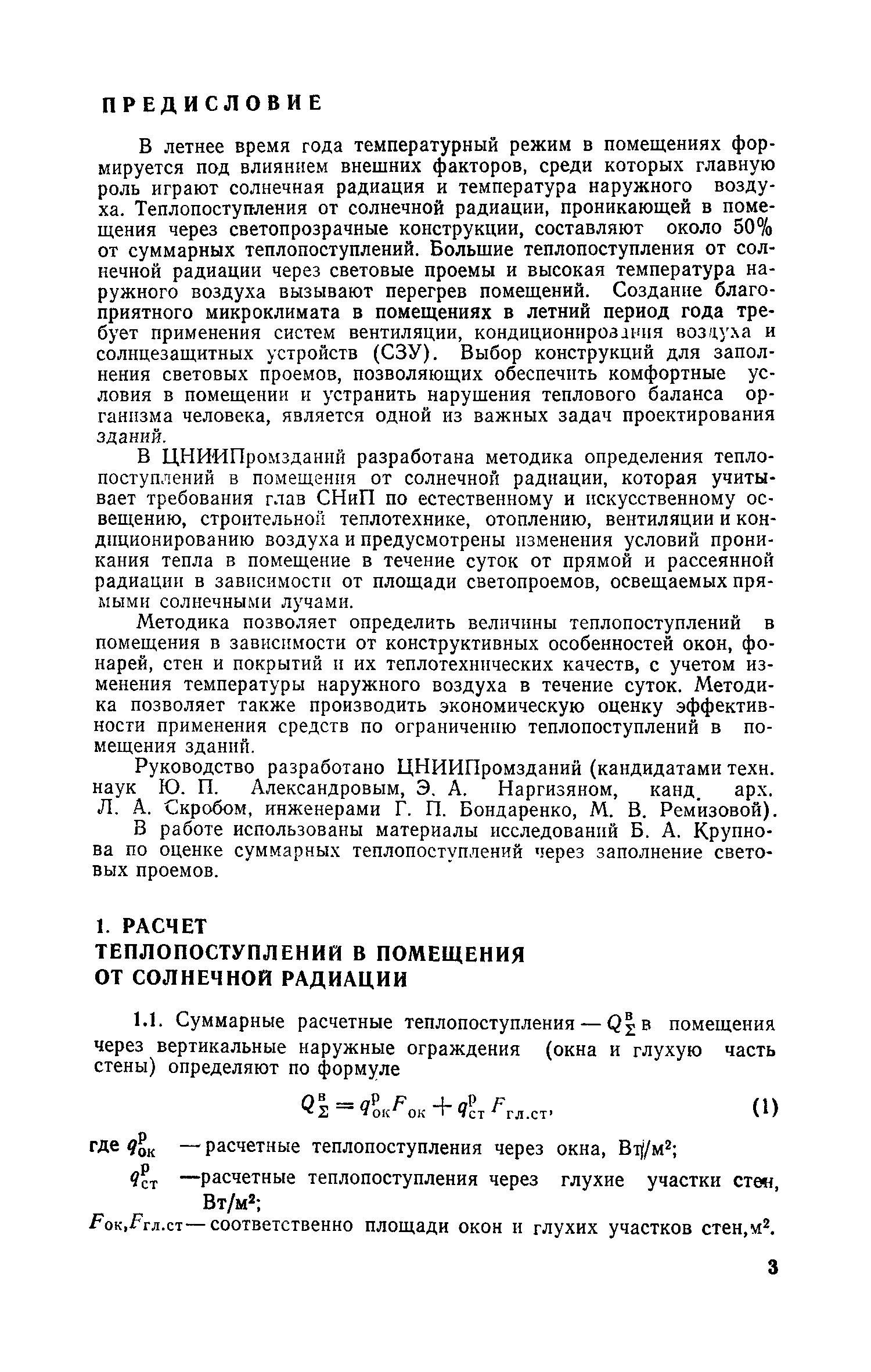 Руководство по определению теплопоступлений в помещения промышленных зданий от инсоляции| Статус: | действует | | Название рус.: | Руководство по определению теплопоступлений в помещения промышленных зданий от инсоляции | | Дата добавления в базу: | 01.09.2013 | | Дата актуализации: | 01.01.2021 | | Область применения: | Документ содержит материалы по расчету теплопоступлений в помещения за счет прямого и рассеянного солнечного излучения, разности температур наружного и внутреннего воздуха, лучистого тепла, поглощаемого остеклением, а также данные об экономической оценке мероприятий, направленных на сокращение теплопоступлений в помещения от солнечной радиации. | | Оглавление: | Предисловие 1. Расчет теплопоступлений в помещения от солнечной радиации 2. Экономическая оценка снижения теплопоступлений в помещения от солнечной радиации Приложение 1. Расчетные величины теплопоступлений в помещения через ограждающие конструкции за счет солнечной радиации, разности температур наружного и внутреннего воздуха и лучистого тепла, поглощаемого остеклением в теплый период года для административно-бытового здания Приложение 1. Расчетные величины теплопоступлений в помещения через ограждающие конструкции за счет солнечной радиации, разности температур наружного и внутреннего воздуха и лучистого тепла, поглощаемого остеклением в теплый период года для производственных зданий | | Разработан: | ЦНИИпромзданий