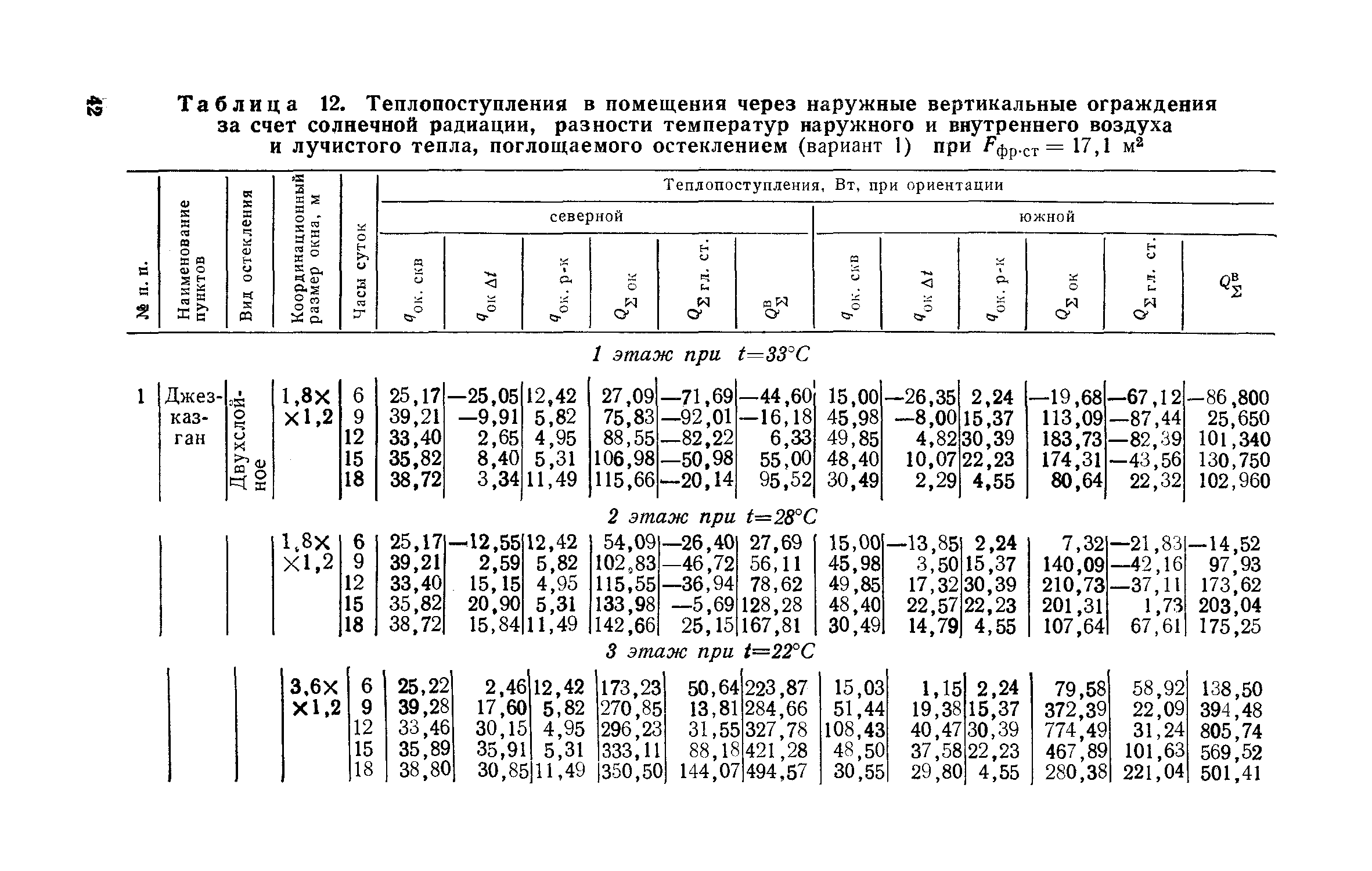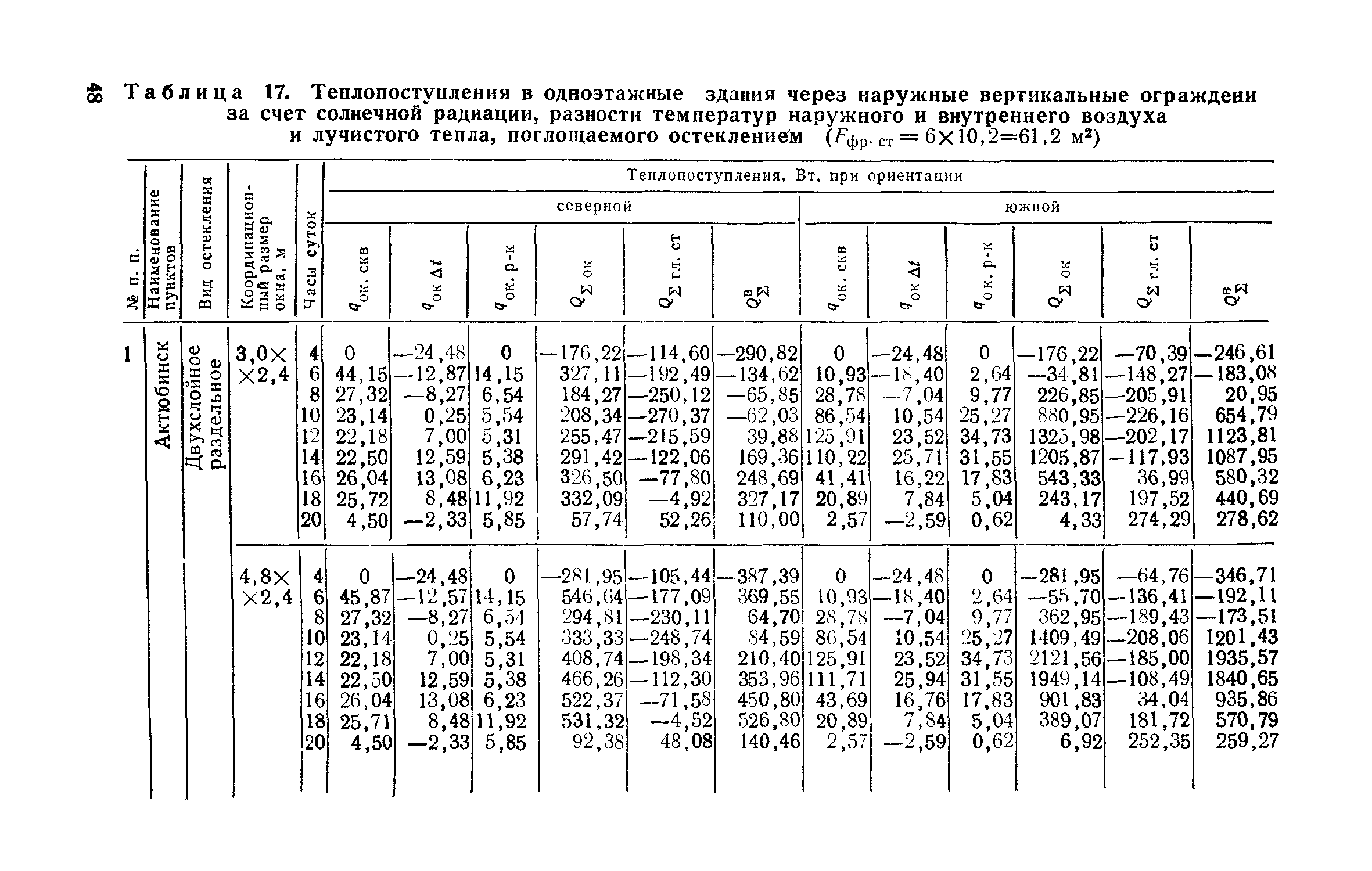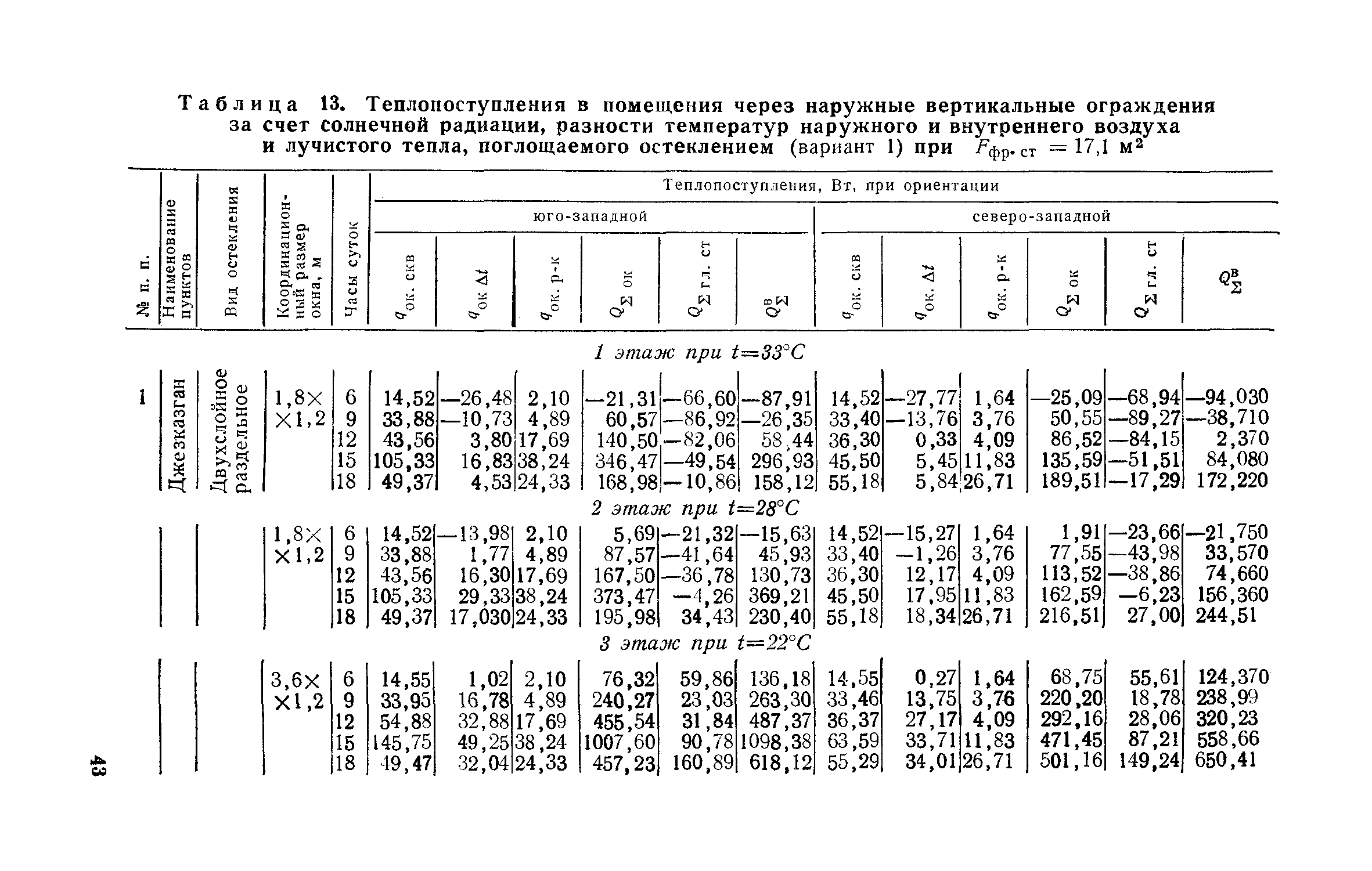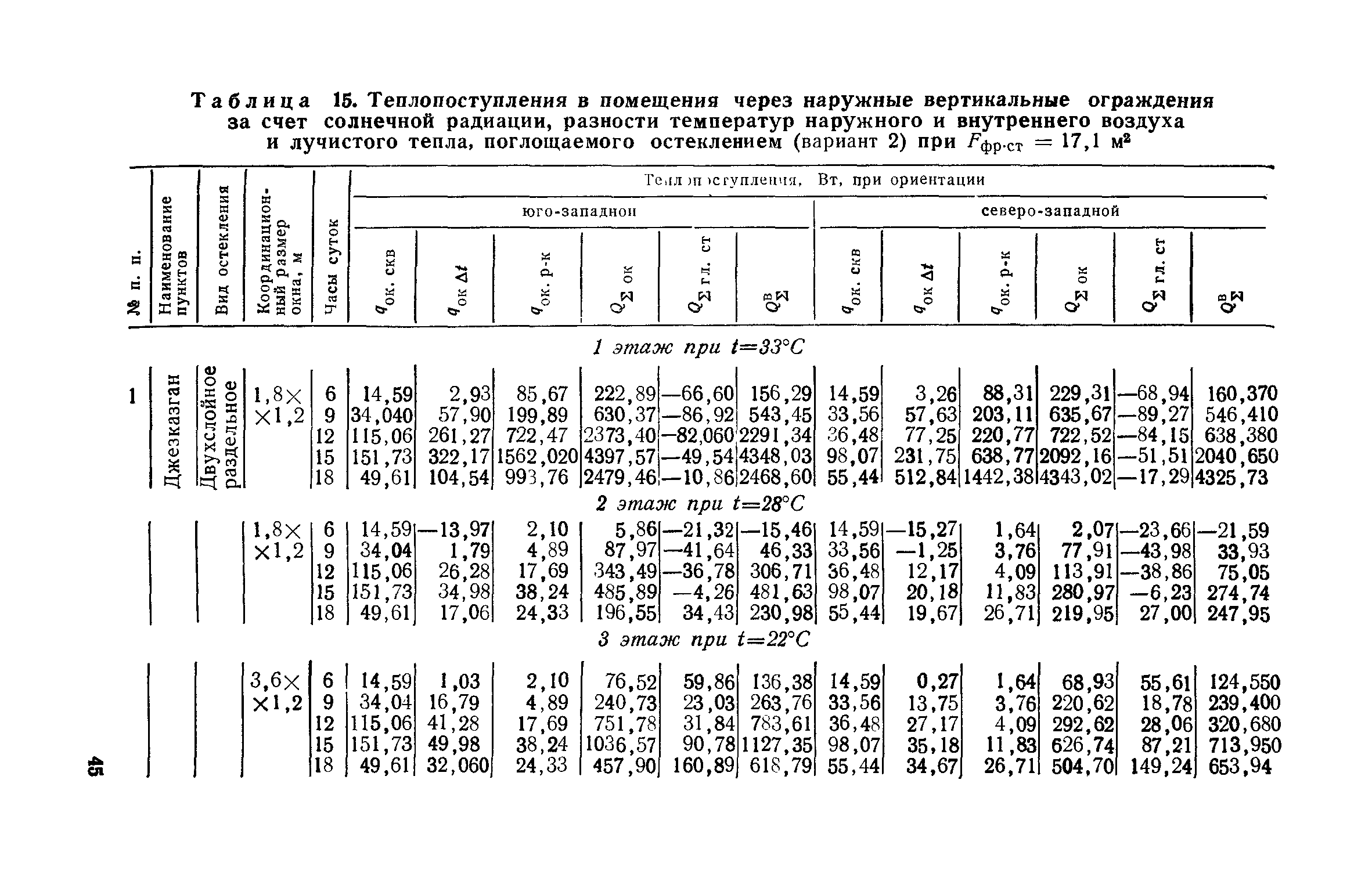 Руководство по определению теплопоступлений в помещения промышленных зданий от инсоляции| Статус: | действует | | Название рус.: | Руководство по определению теплопоступлений в помещения промышленных зданий от инсоляции | | Дата добавления в базу: | 01.09.2013 | | Дата актуализации: | 01.01.2021 | | Область применения: | Документ содержит материалы по расчету теплопоступлений в помещения за счет прямого и рассеянного солнечного излучения, разности температур наружного и внутреннего воздуха, лучистого тепла, поглощаемого остеклением, а также данные об экономической оценке мероприятий, направленных на сокращение теплопоступлений в помещения от солнечной радиации. | | Оглавление: | Предисловие 1. Расчет теплопоступлений в помещения от солнечной радиации 2. Экономическая оценка снижения теплопоступлений в помещения от солнечной радиации Приложение 1. Расчетные величины теплопоступлений в помещения через ограждающие конструкции за счет солнечной радиации, разности температур наружного и внутреннего воздуха и лучистого тепла, поглощаемого остеклением в теплый период года для административно-бытового здания Приложение 1. Расчетные величины теплопоступлений в помещения через ограждающие конструкции за счет солнечной радиации, разности температур наружного и внутреннего воздуха и лучистого тепла, поглощаемого остеклением в теплый период года для производственных зданий | | Разработан: | ЦНИИпромзданий