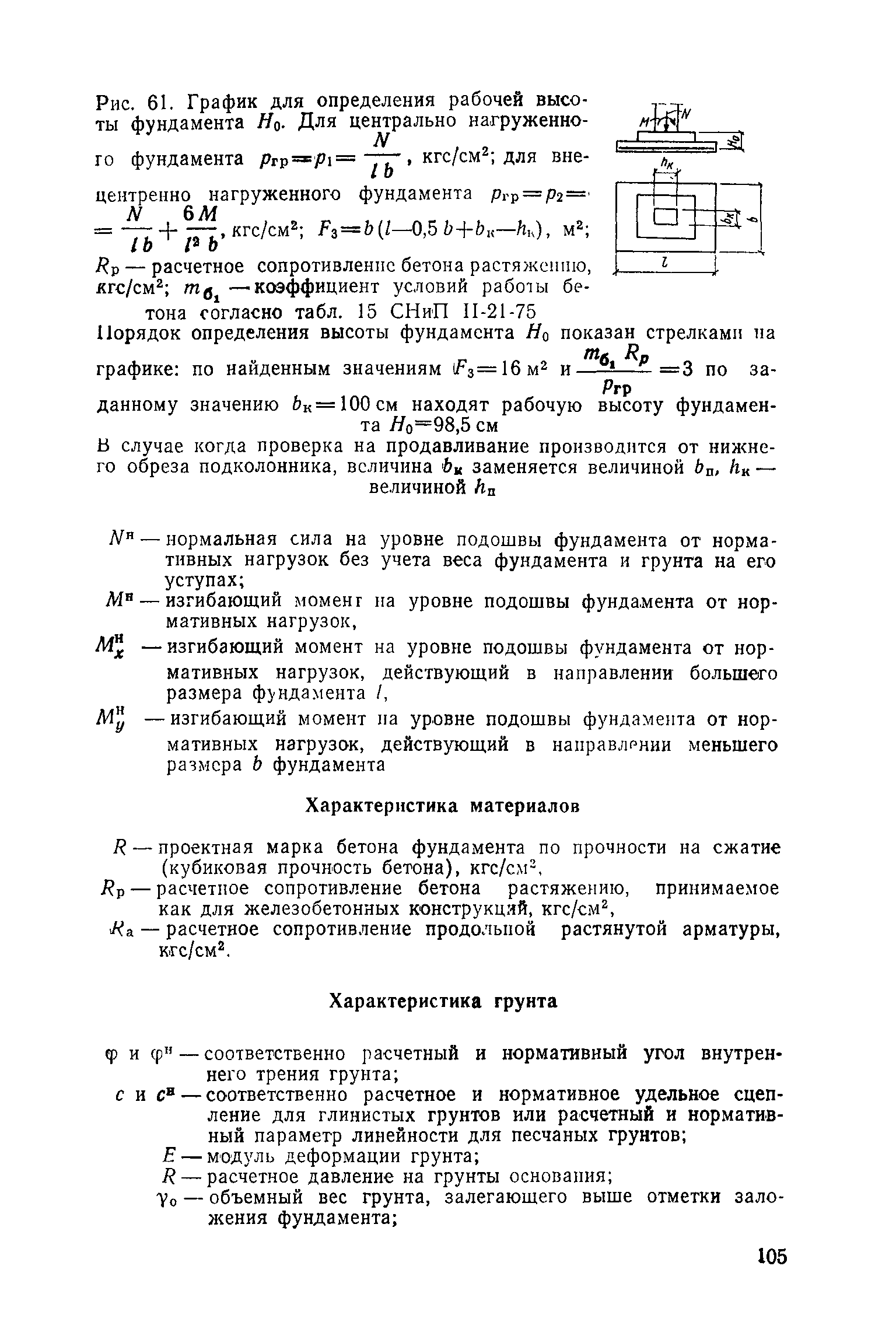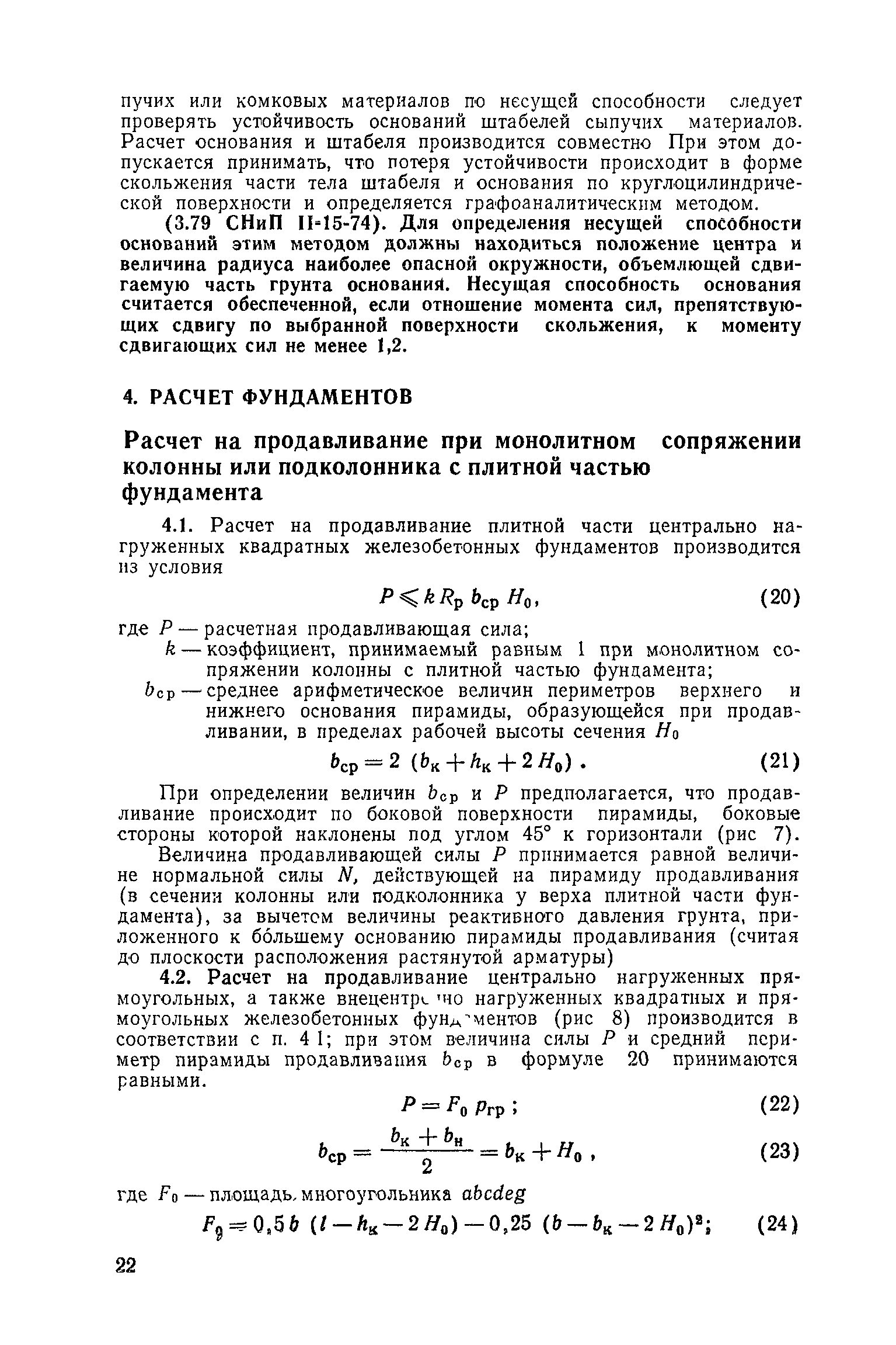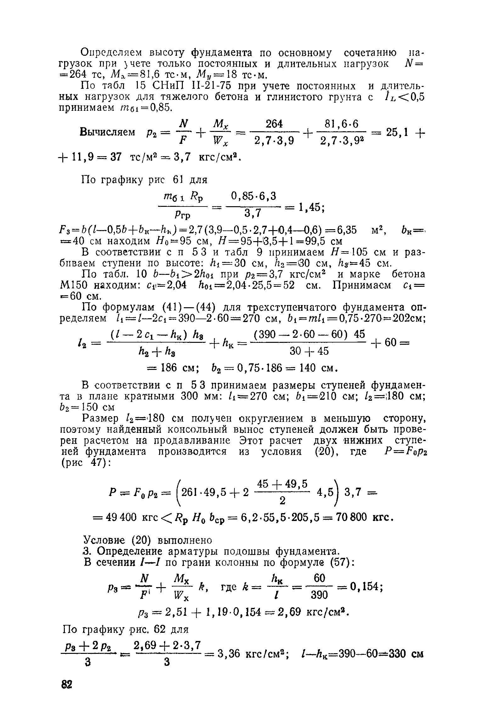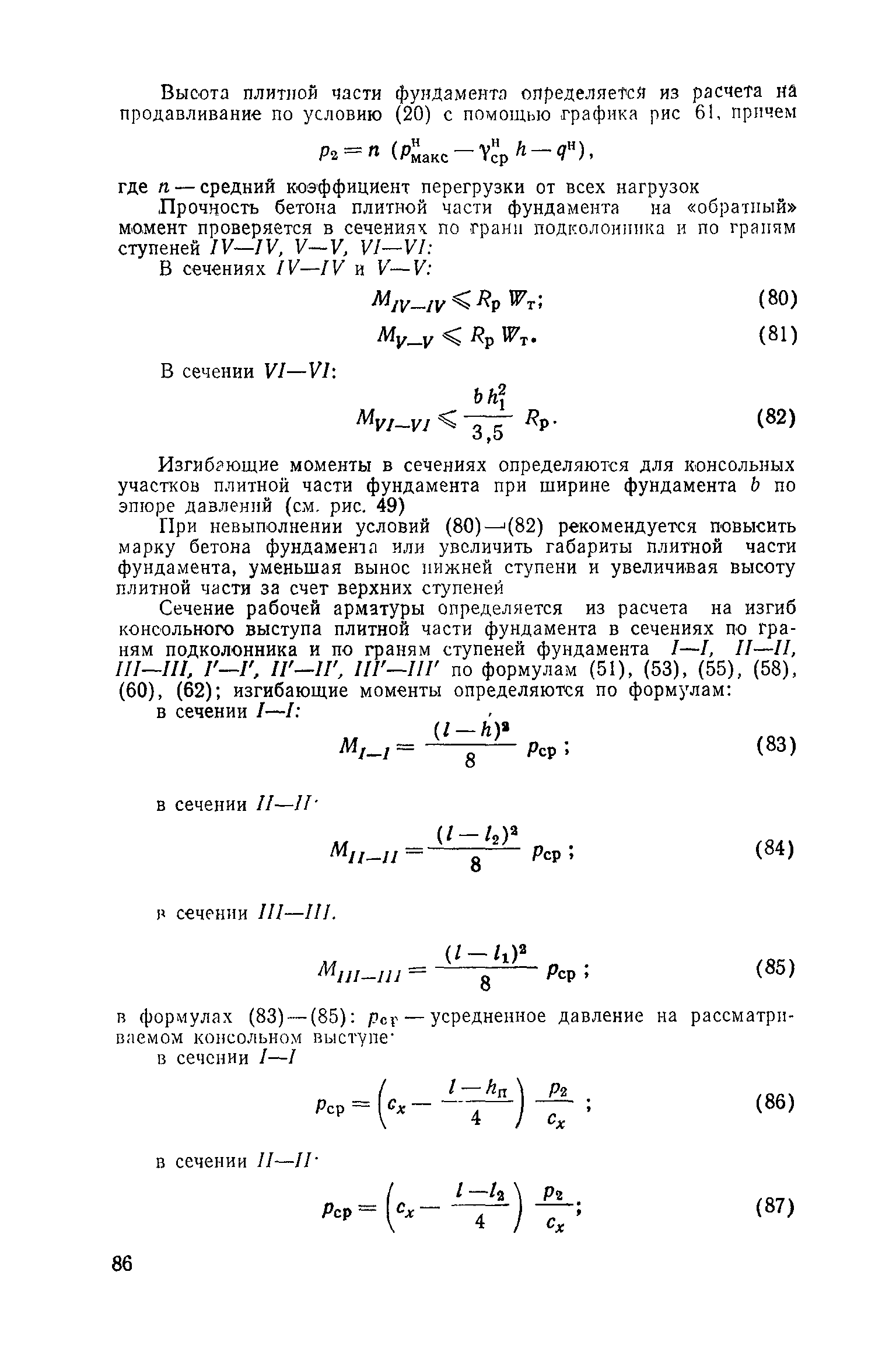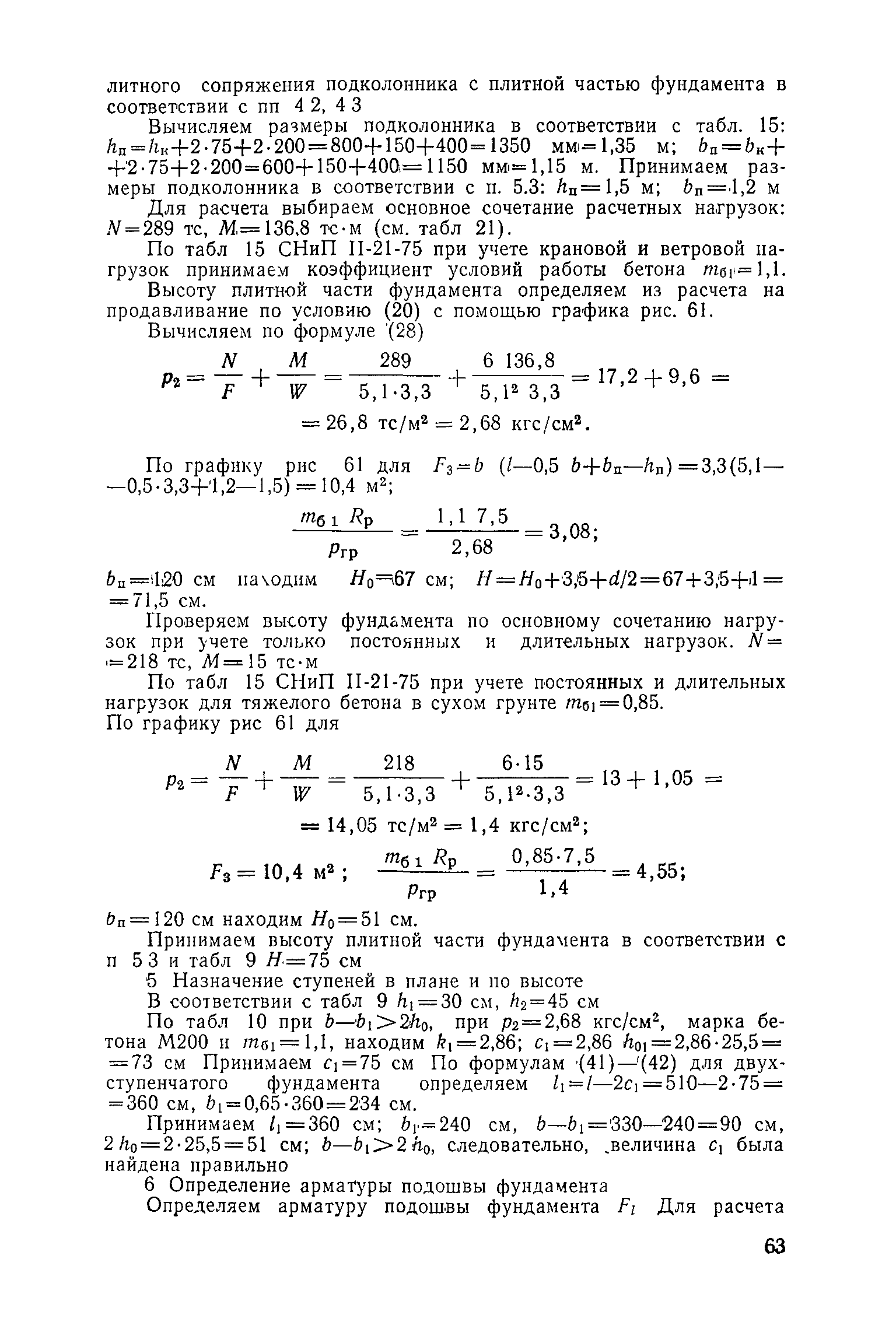 | Оглавление: | Предисловие 1. Общие указания 2. Нагрузки, учитываемые в расчетах оснований и конструкций фундаментов 3. Расчет оснований и определение размеров подошвы фундаментов 4. Расчет фундаментов Расчет на продавливание при монолитном сопряжении колонны или подколонника с плитной частью фундамента Расчет на продавливание при стаканном сопряжении сборной колонны с фундаментом Определение сечения арматуры подошвы фундамента Расчет подколонника и его стаканной части 5. Конструктивные указания Сборные фундаменты Фундаменты под стальные колонны Приложение 1. Примеры расчета Приложение 2. Графики для расчета оснований и фундаментов Приложение 3. Основные буквенные обозначения |