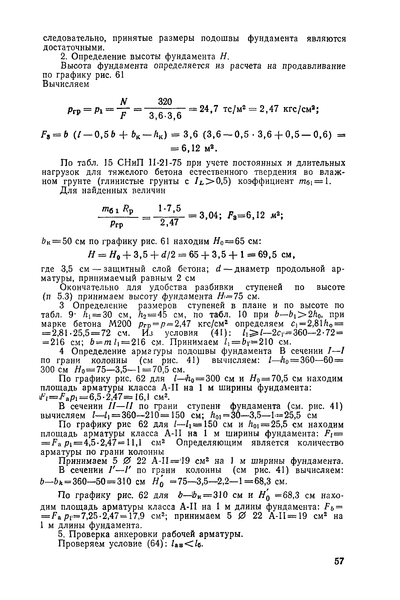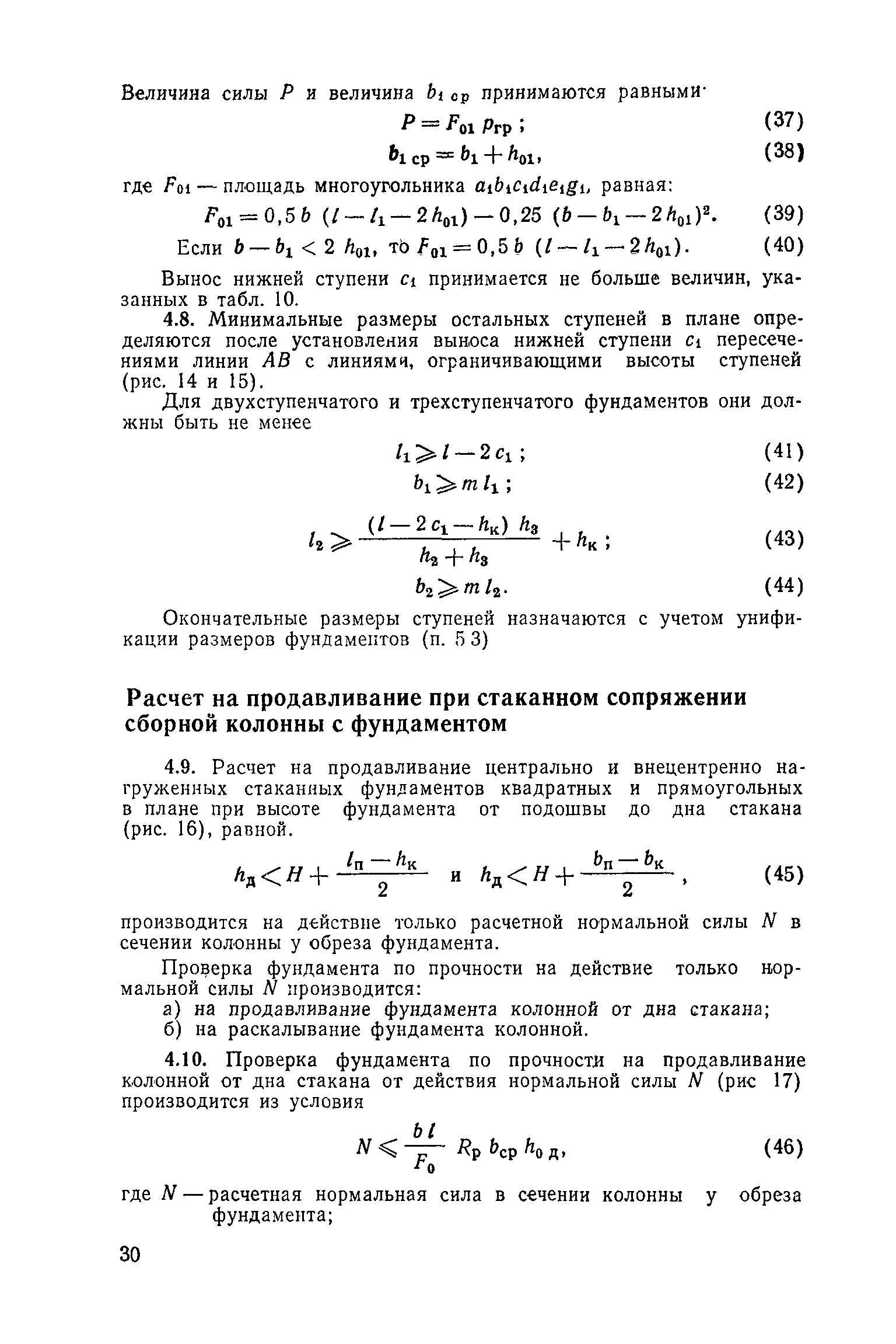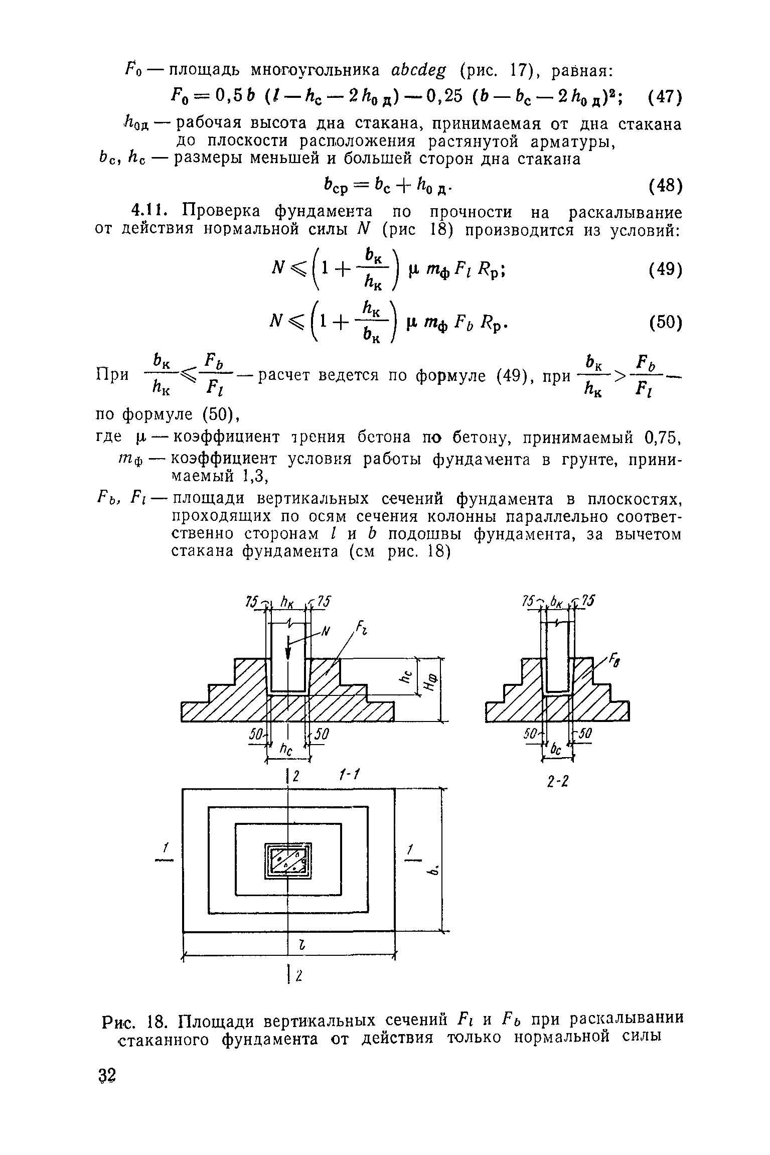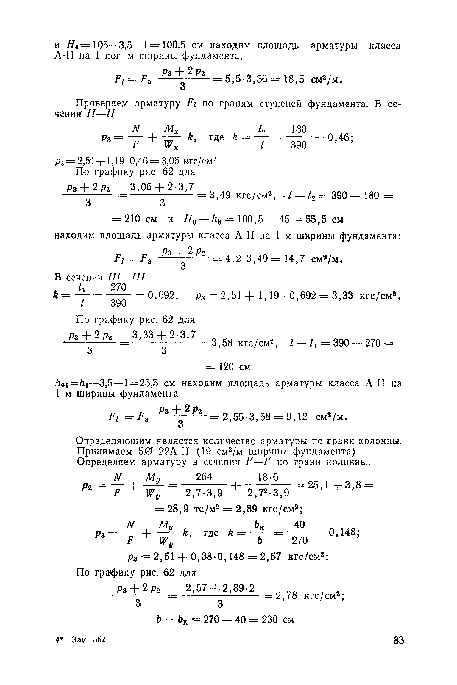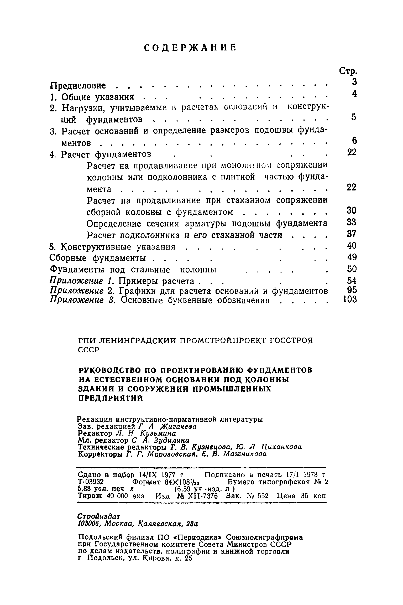 | Оглавление: | Предисловие 1. Общие указания 2. Нагрузки, учитываемые в расчетах оснований и конструкций фундаментов 3. Расчет оснований и определение размеров подошвы фундаментов 4. Расчет фундаментов Расчет на продавливание при монолитном сопряжении колонны или подколонника с плитной частью фундамента Расчет на продавливание при стаканном сопряжении сборной колонны с фундаментом Определение сечения арматуры подошвы фундамента Расчет подколонника и его стаканной части 5. Конструктивные указания Сборные фундаменты Фундаменты под стальные колонны Приложение 1. Примеры расчета Приложение 2. Графики для расчета оснований и фундаментов Приложение 3. Основные буквенные обозначения |
