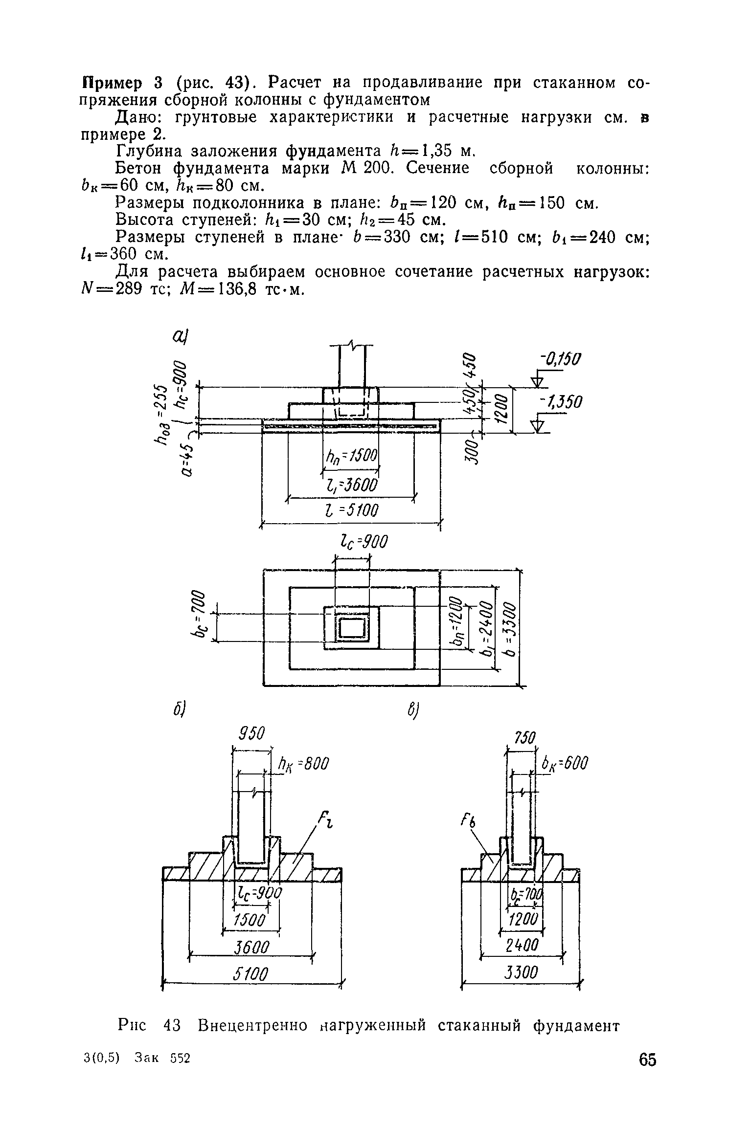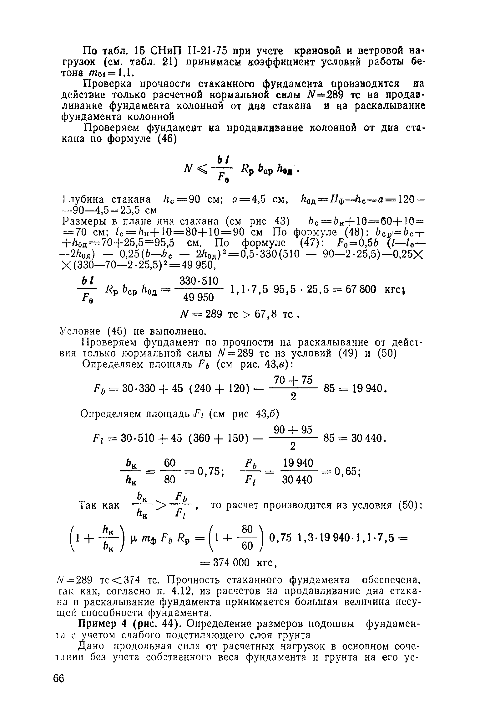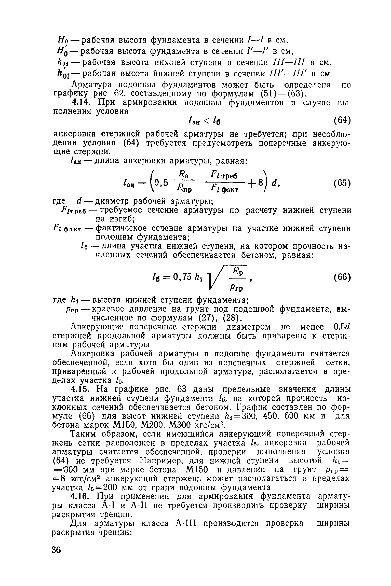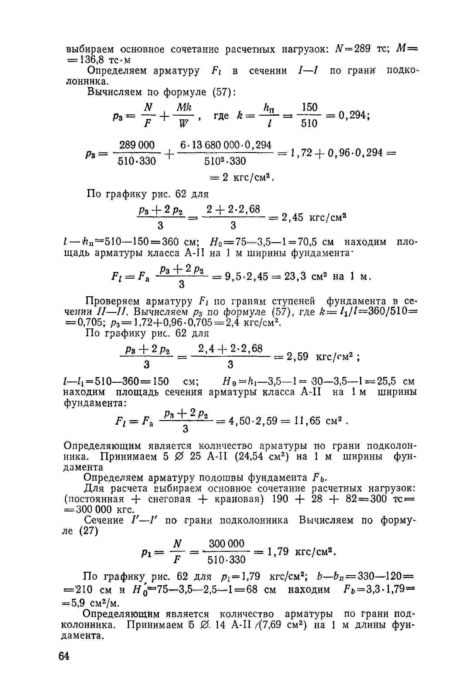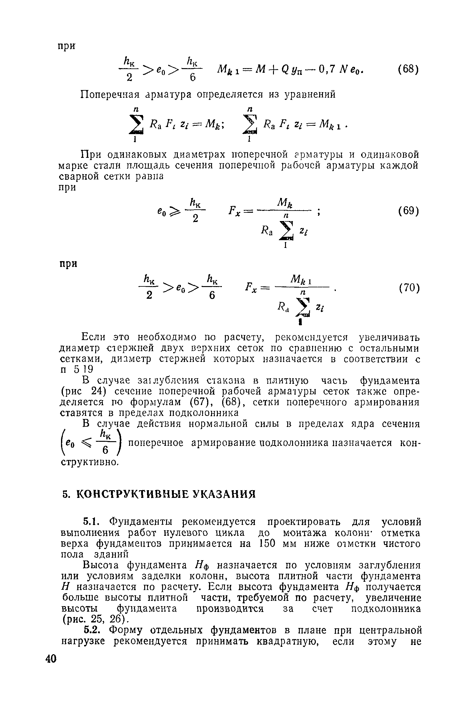 | Оглавление: | Предисловие 1. Общие указания 2. Нагрузки, учитываемые в расчетах оснований и конструкций фундаментов 3. Расчет оснований и определение размеров подошвы фундаментов 4. Расчет фундаментов Расчет на продавливание при монолитном сопряжении колонны или подколонника с плитной частью фундамента Расчет на продавливание при стаканном сопряжении сборной колонны с фундаментом Определение сечения арматуры подошвы фундамента Расчет подколонника и его стаканной части 5. Конструктивные указания Сборные фундаменты Фундаменты под стальные колонны Приложение 1. Примеры расчета Приложение 2. Графики для расчета оснований и фундаментов Приложение 3. Основные буквенные обозначения |
