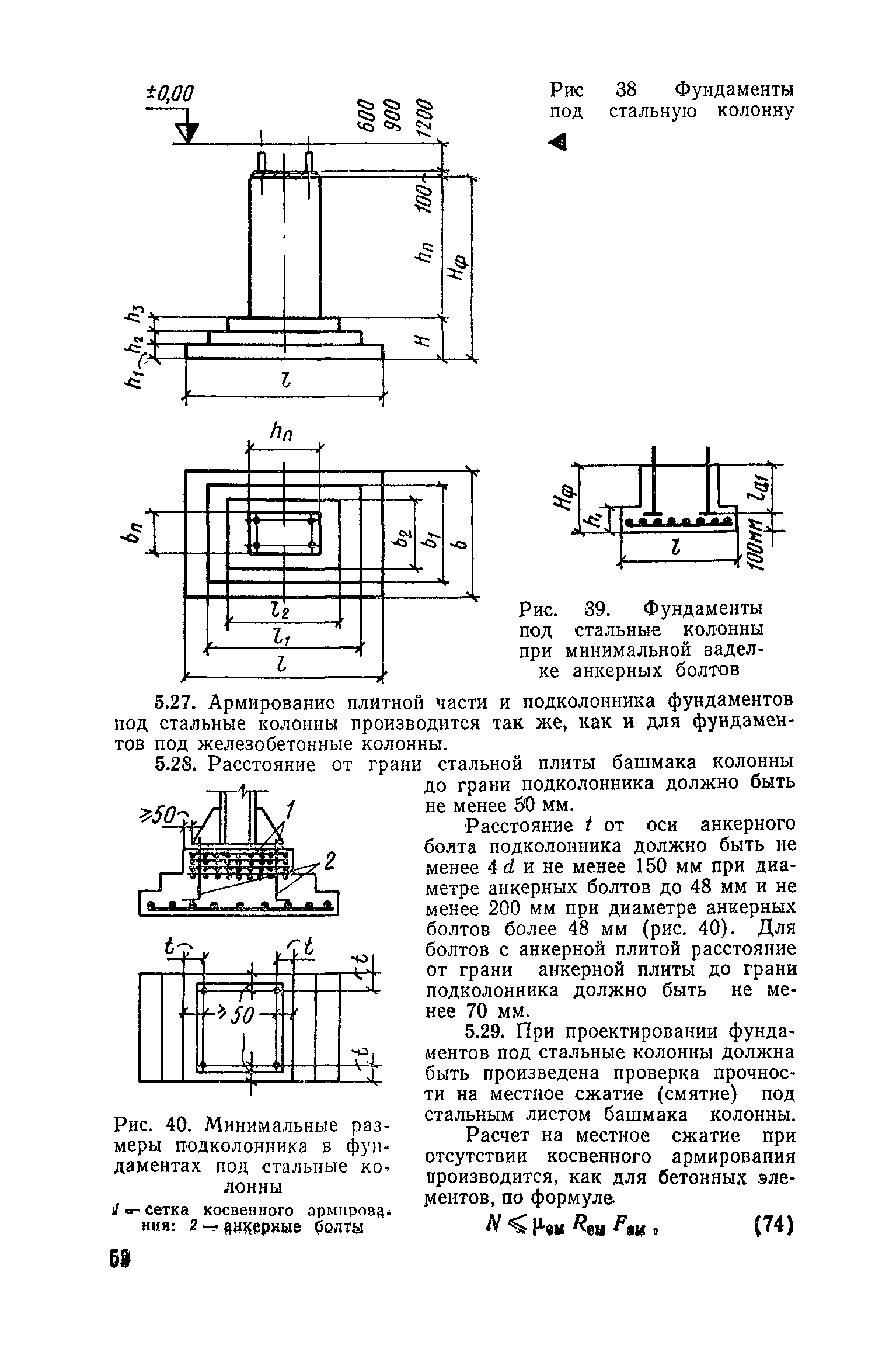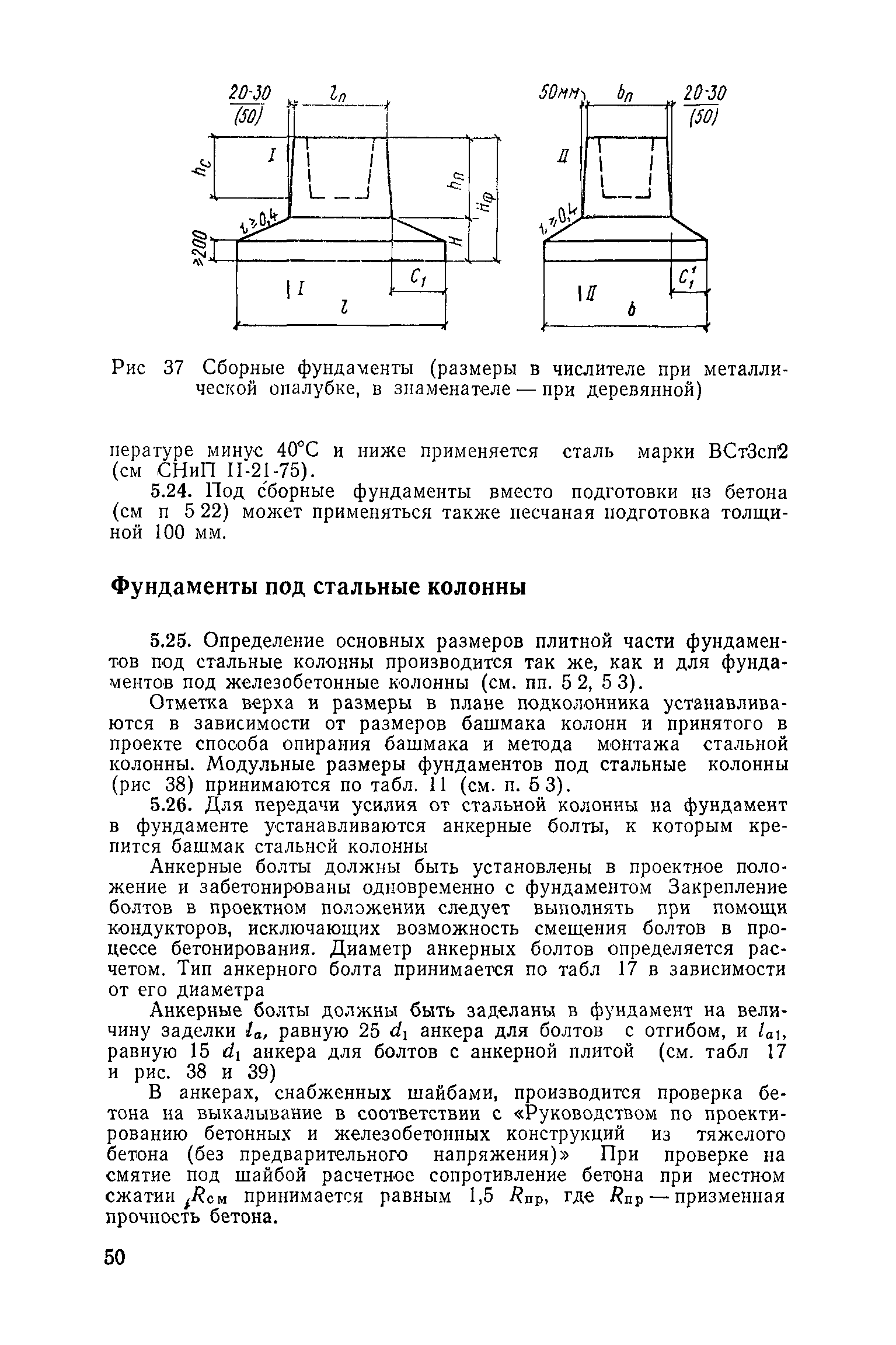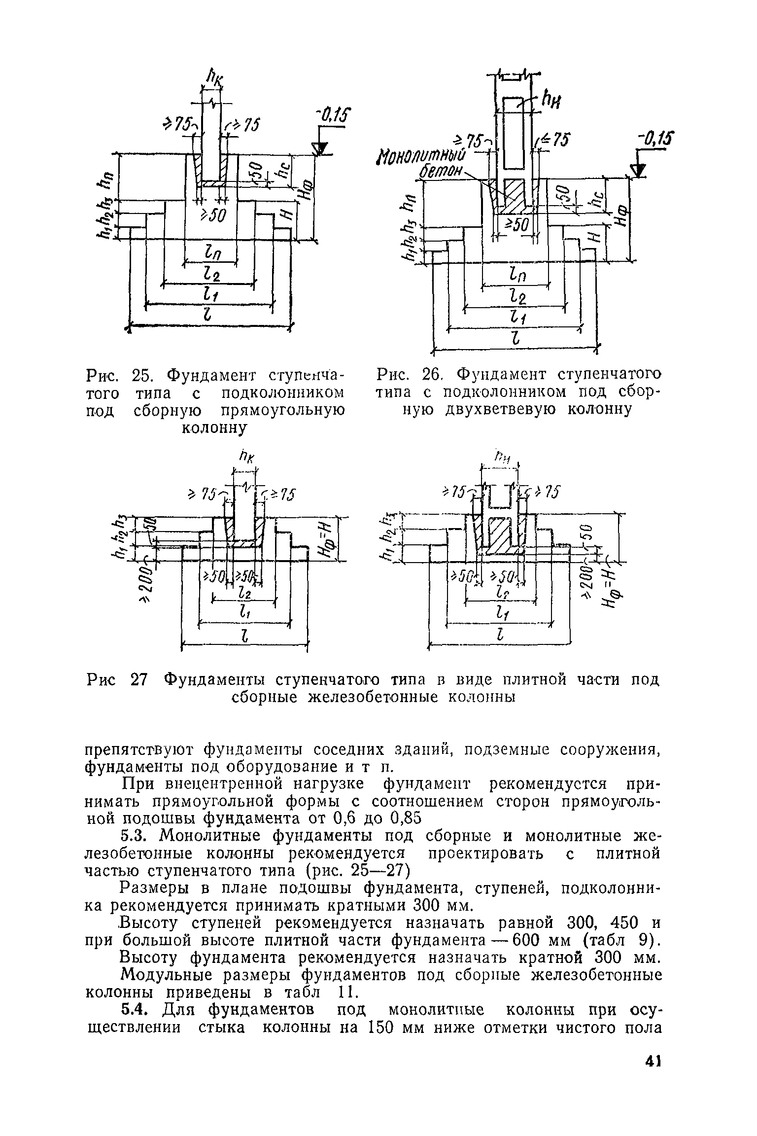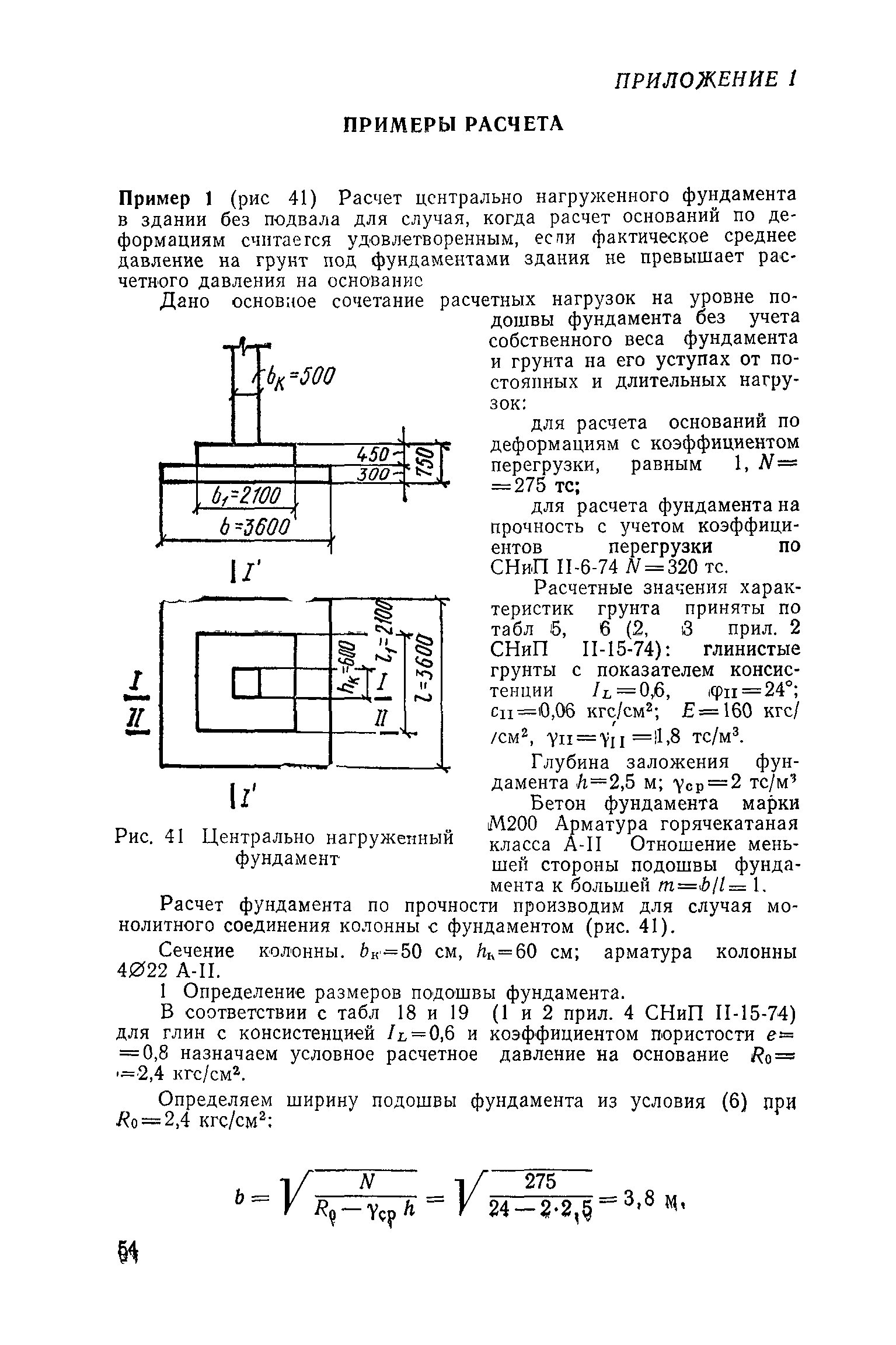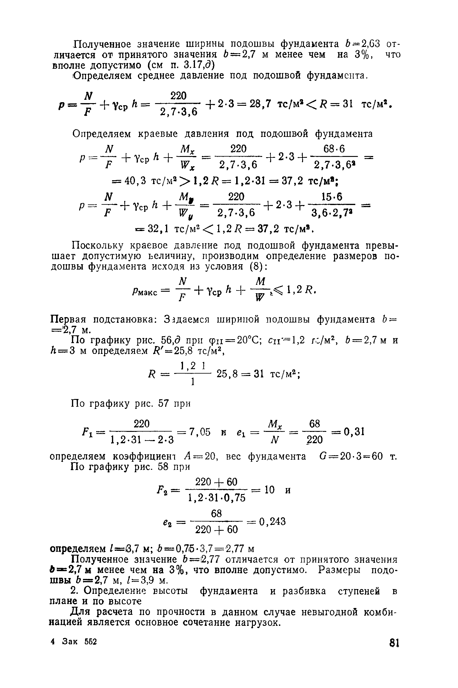 | Оглавление: | Предисловие 1. Общие указания 2. Нагрузки, учитываемые в расчетах оснований и конструкций фундаментов 3. Расчет оснований и определение размеров подошвы фундаментов 4. Расчет фундаментов Расчет на продавливание при монолитном сопряжении колонны или подколонника с плитной частью фундамента Расчет на продавливание при стаканном сопряжении сборной колонны с фундаментом Определение сечения арматуры подошвы фундамента Расчет подколонника и его стаканной части 5. Конструктивные указания Сборные фундаменты Фундаменты под стальные колонны Приложение 1. Примеры расчета Приложение 2. Графики для расчета оснований и фундаментов Приложение 3. Основные буквенные обозначения |