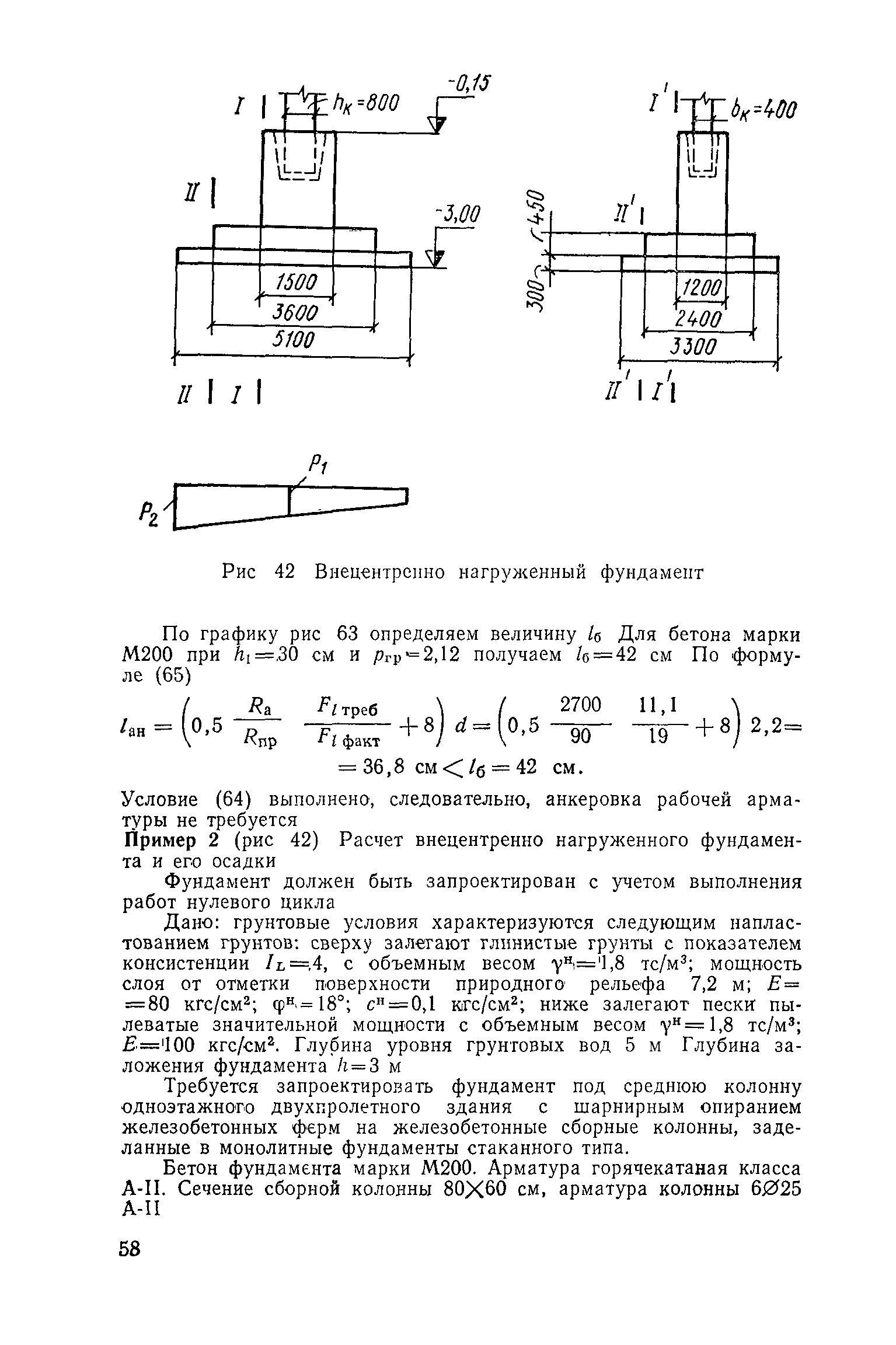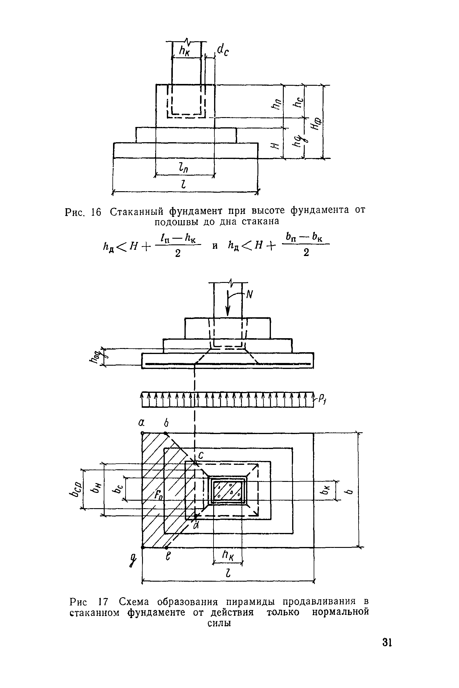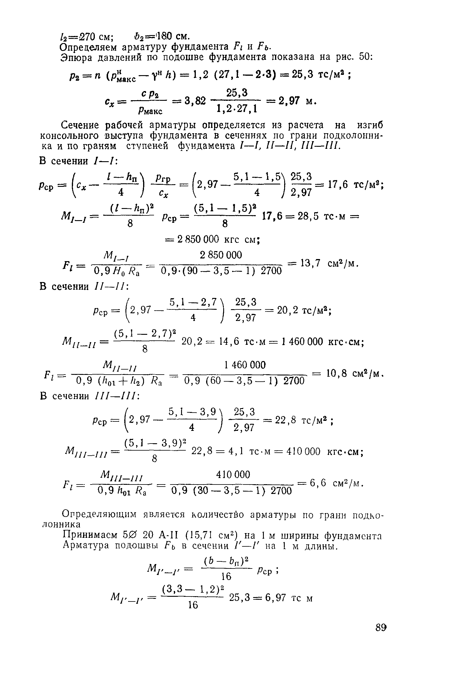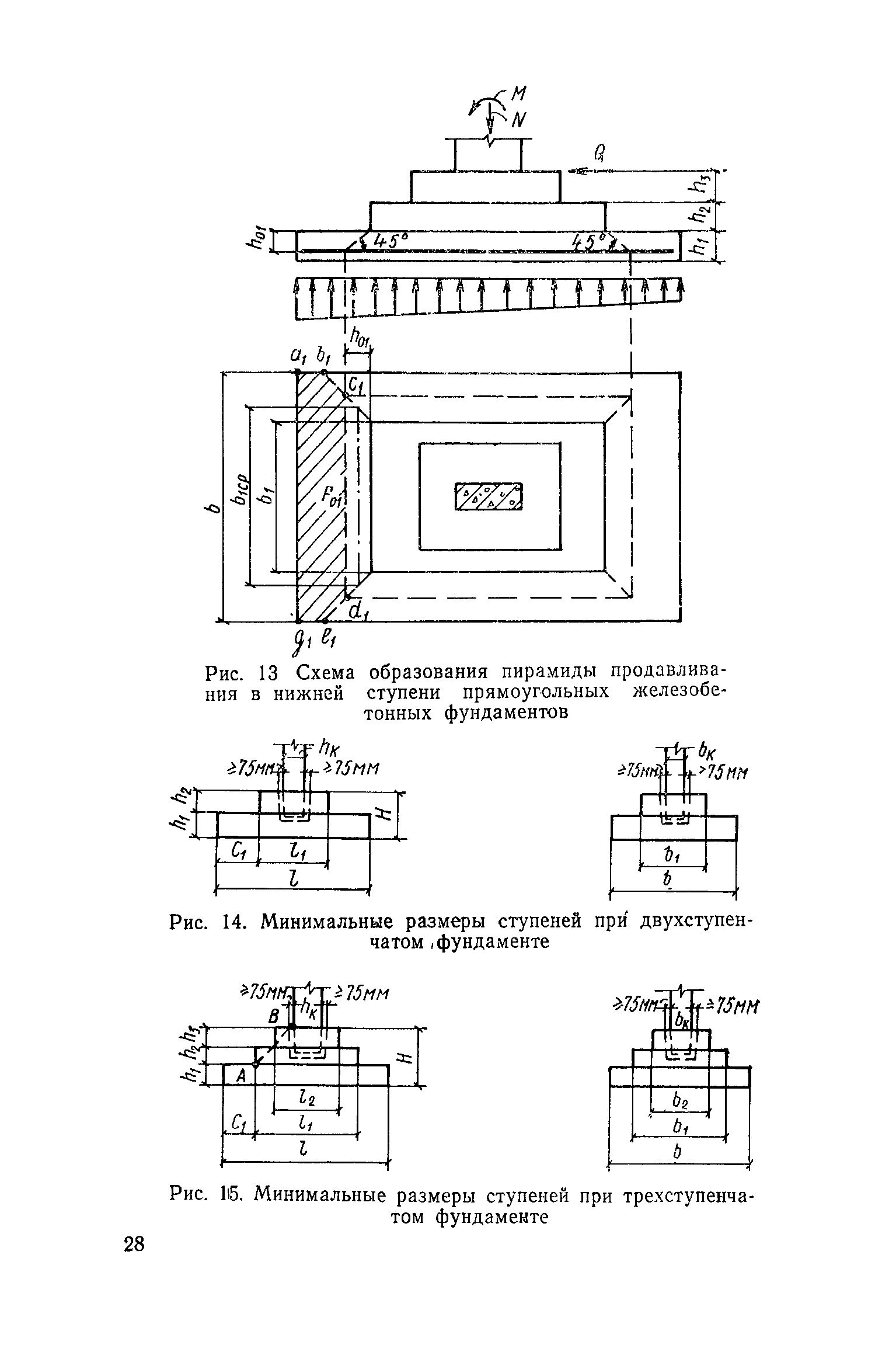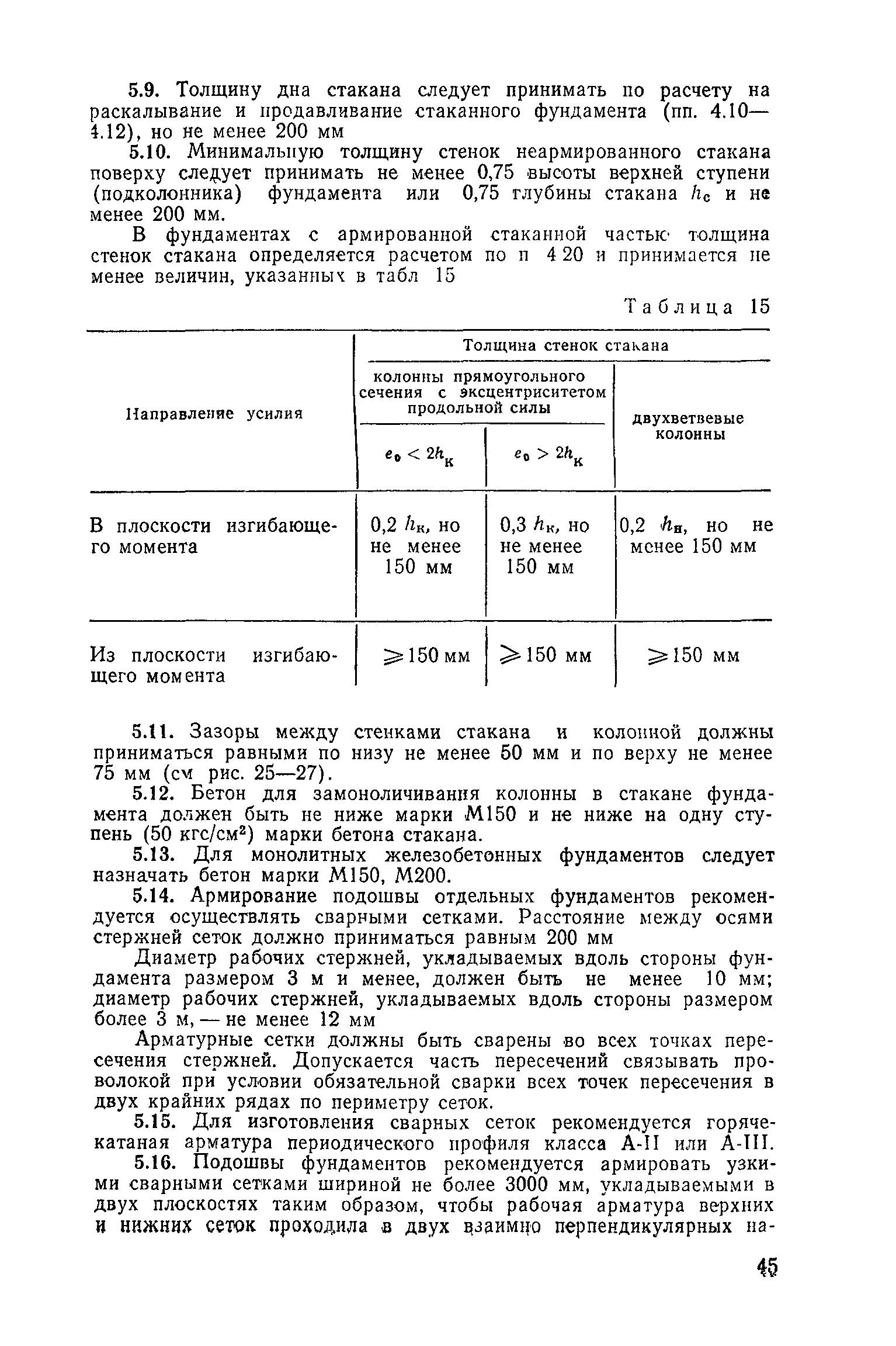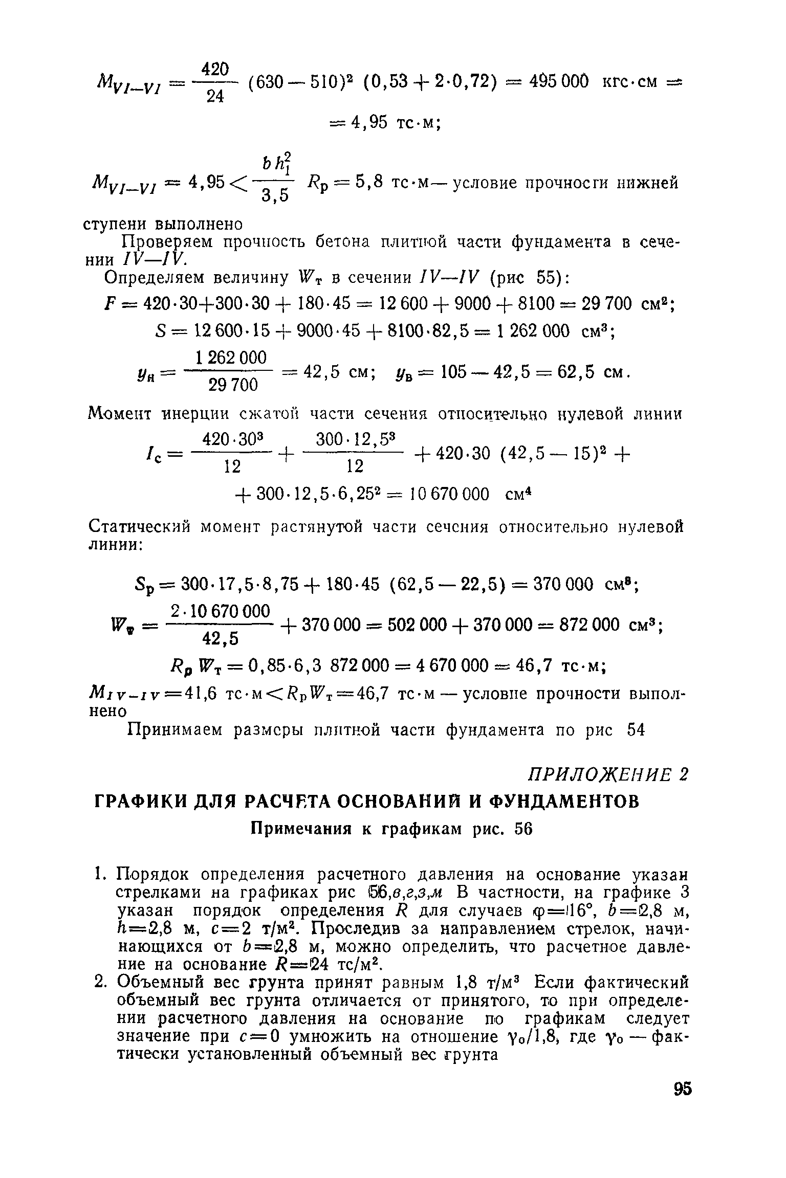 | Оглавление: | Предисловие 1. Общие указания 2. Нагрузки, учитываемые в расчетах оснований и конструкций фундаментов 3. Расчет оснований и определение размеров подошвы фундаментов 4. Расчет фундаментов Расчет на продавливание при монолитном сопряжении колонны или подколонника с плитной частью фундамента Расчет на продавливание при стаканном сопряжении сборной колонны с фундаментом Определение сечения арматуры подошвы фундамента Расчет подколонника и его стаканной части 5. Конструктивные указания Сборные фундаменты Фундаменты под стальные колонны Приложение 1. Примеры расчета Приложение 2. Графики для расчета оснований и фундаментов Приложение 3. Основные буквенные обозначения |
