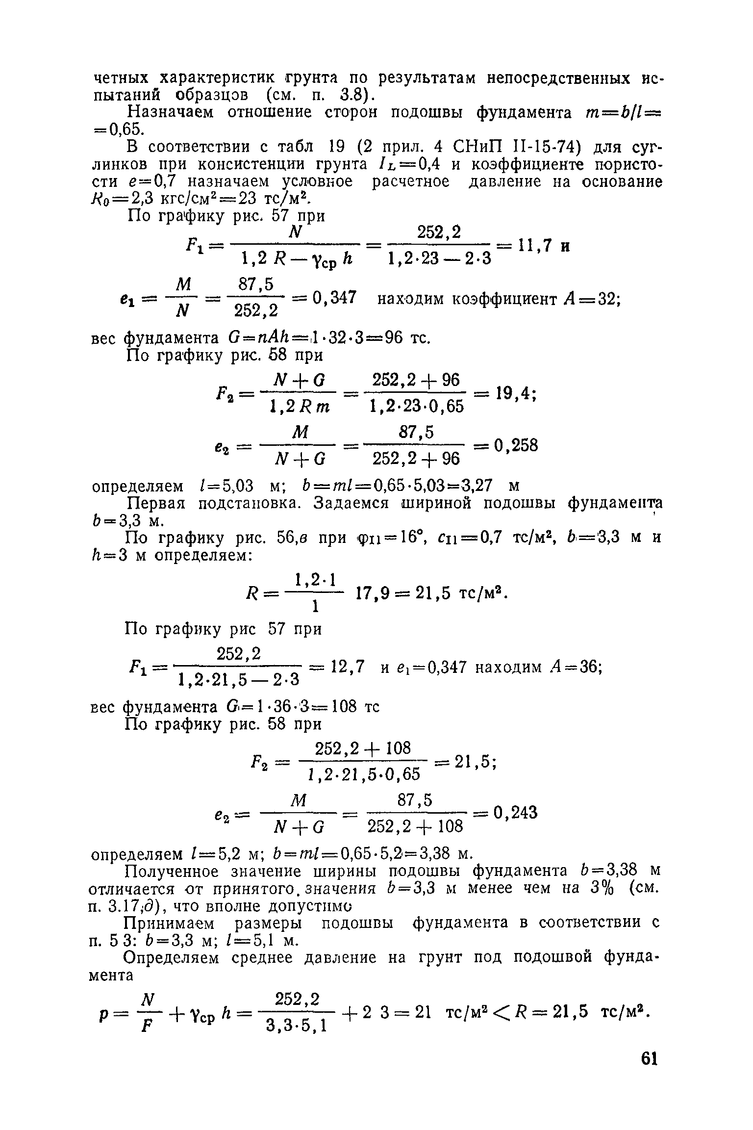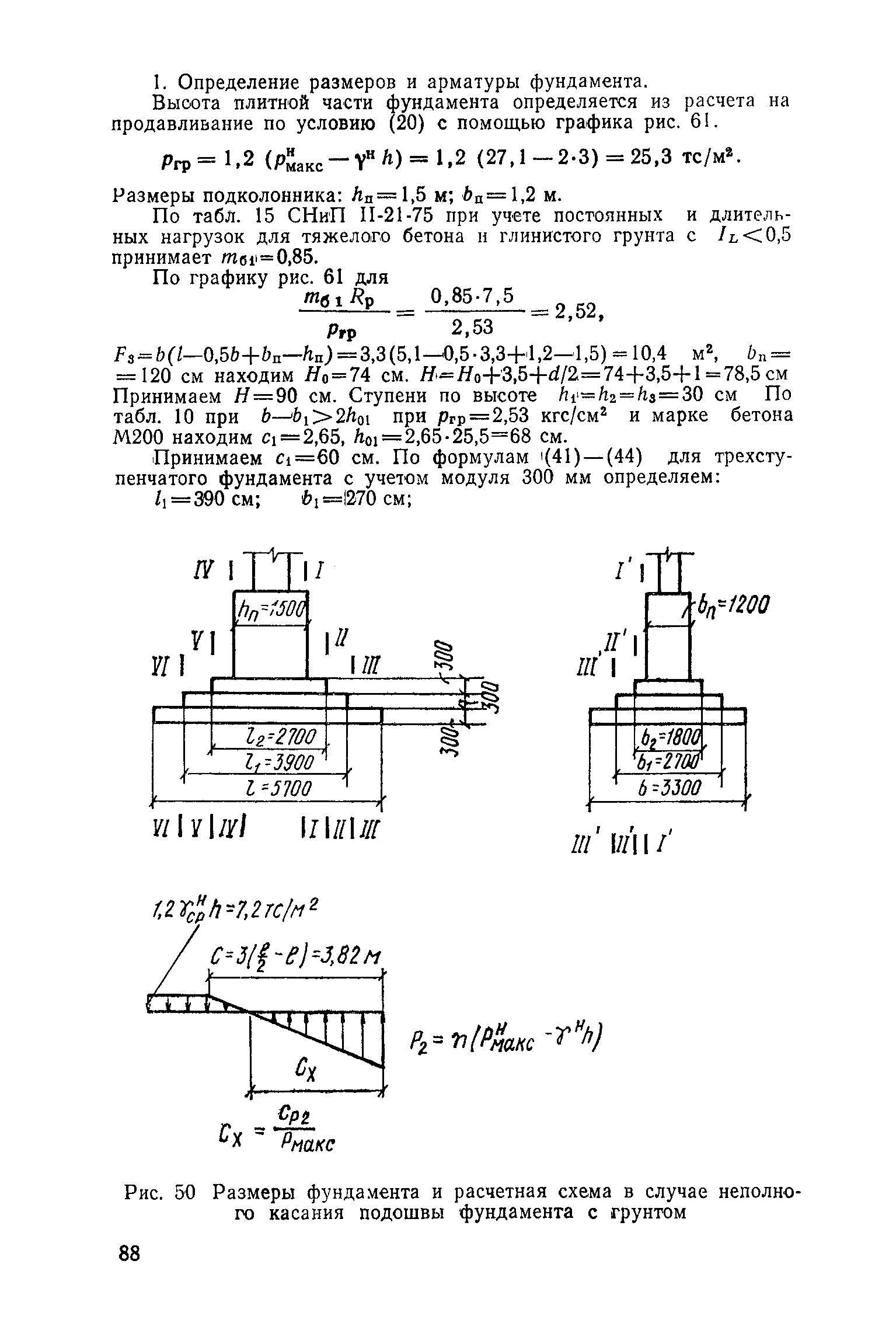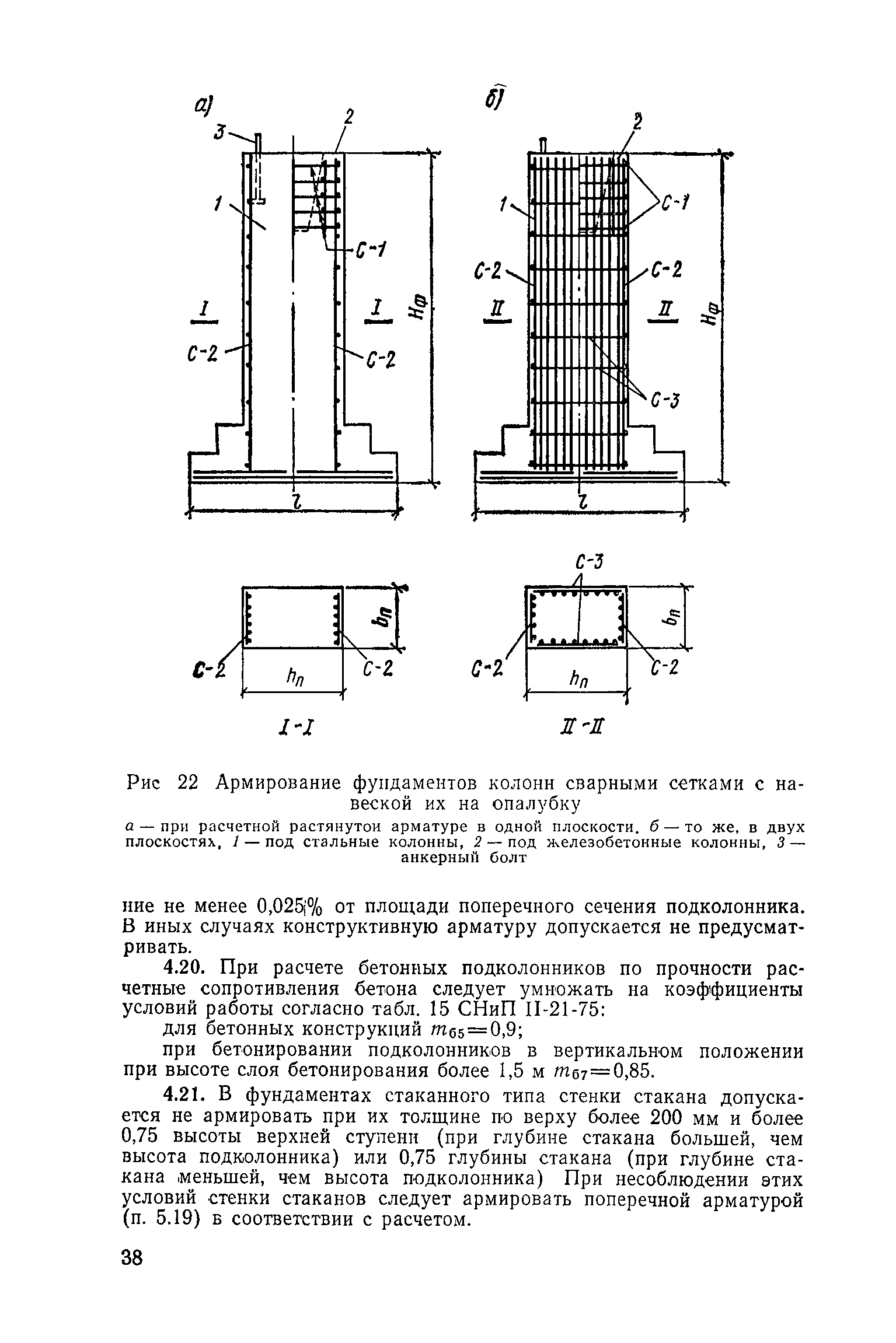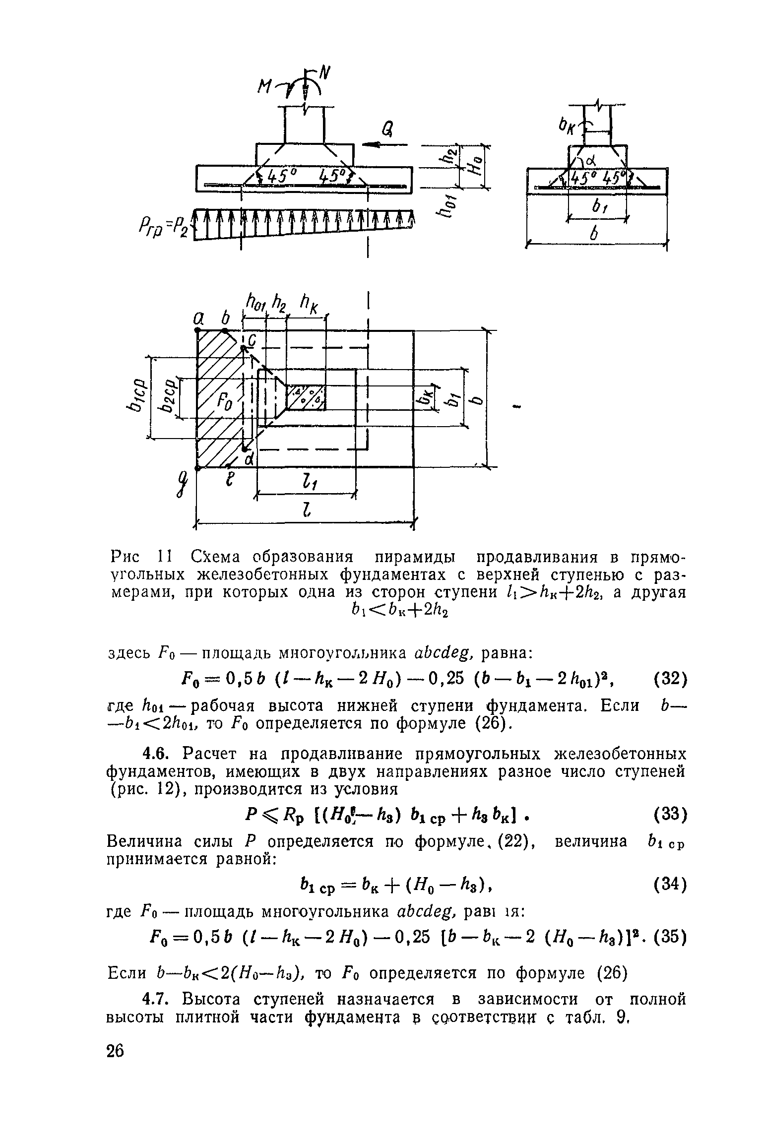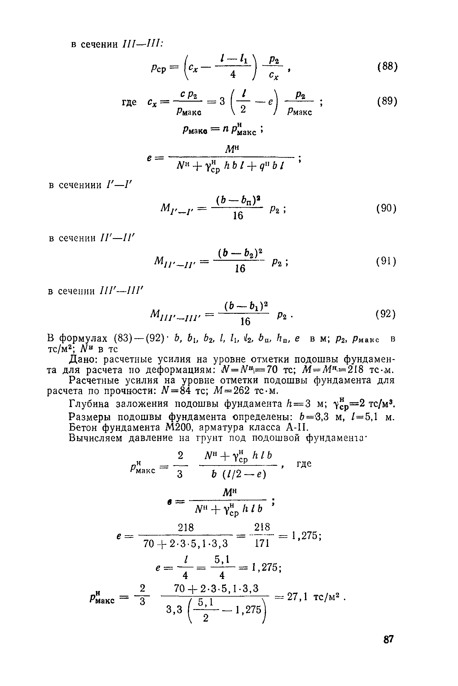 | Оглавление: | Предисловие 1. Общие указания 2. Нагрузки, учитываемые в расчетах оснований и конструкций фундаментов 3. Расчет оснований и определение размеров подошвы фундаментов 4. Расчет фундаментов Расчет на продавливание при монолитном сопряжении колонны или подколонника с плитной частью фундамента Расчет на продавливание при стаканном сопряжении сборной колонны с фундаментом Определение сечения арматуры подошвы фундамента Расчет подколонника и его стаканной части 5. Конструктивные указания Сборные фундаменты Фундаменты под стальные колонны Приложение 1. Примеры расчета Приложение 2. Графики для расчета оснований и фундаментов Приложение 3. Основные буквенные обозначения |