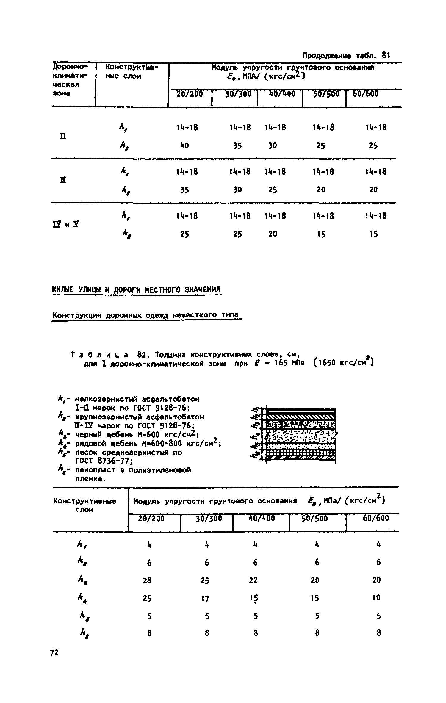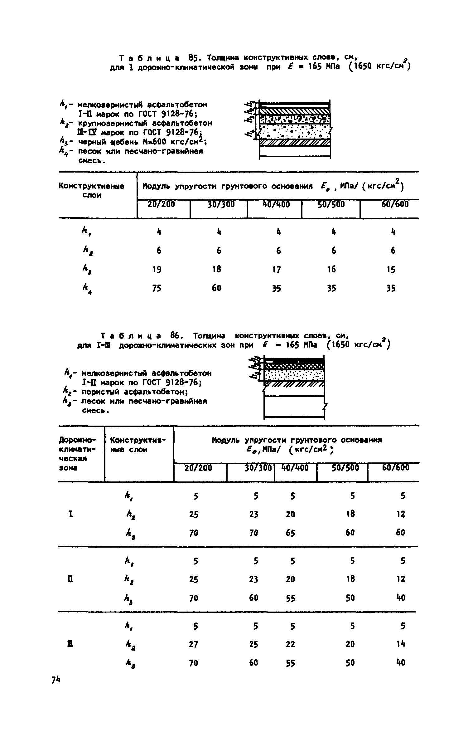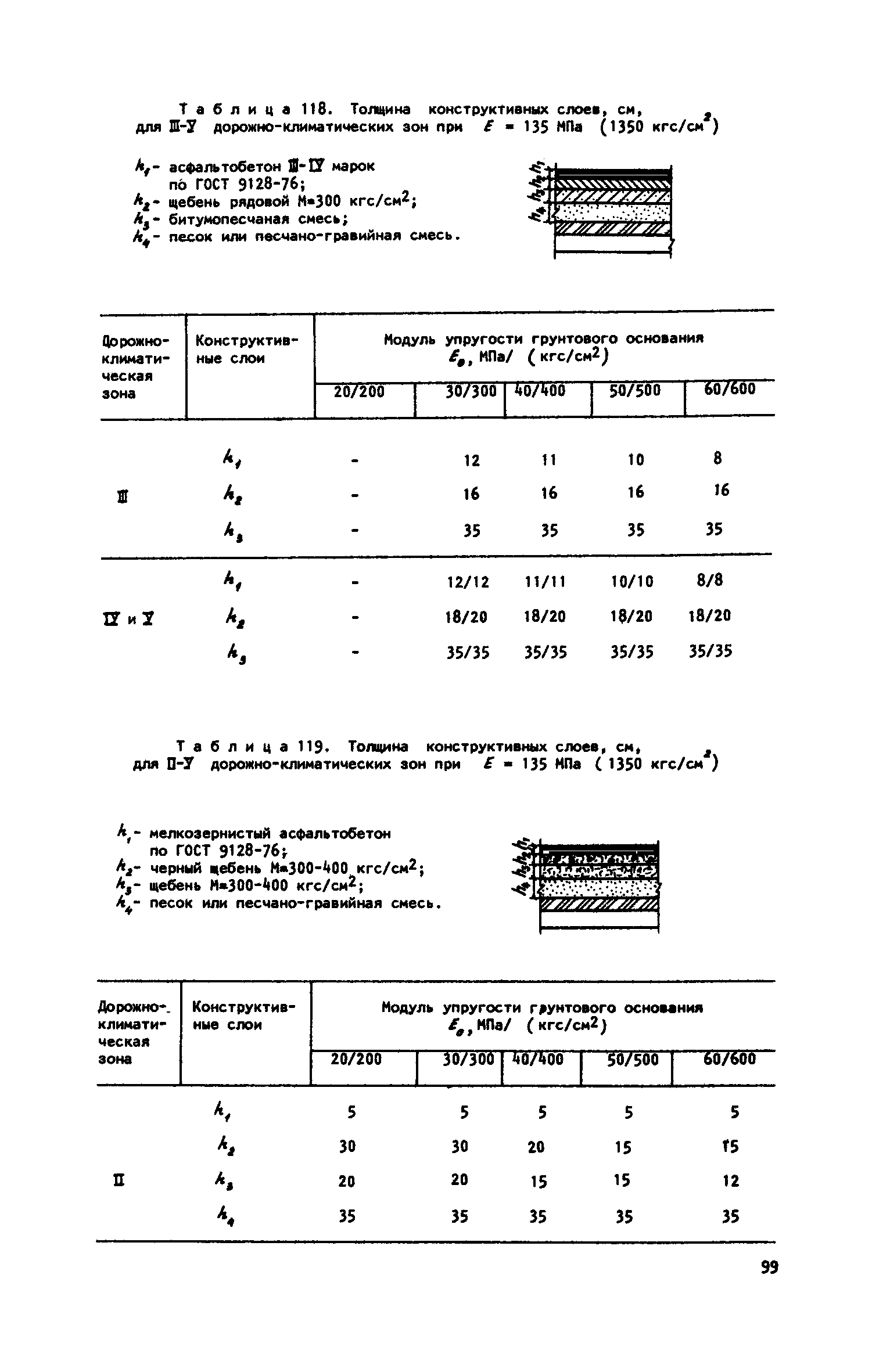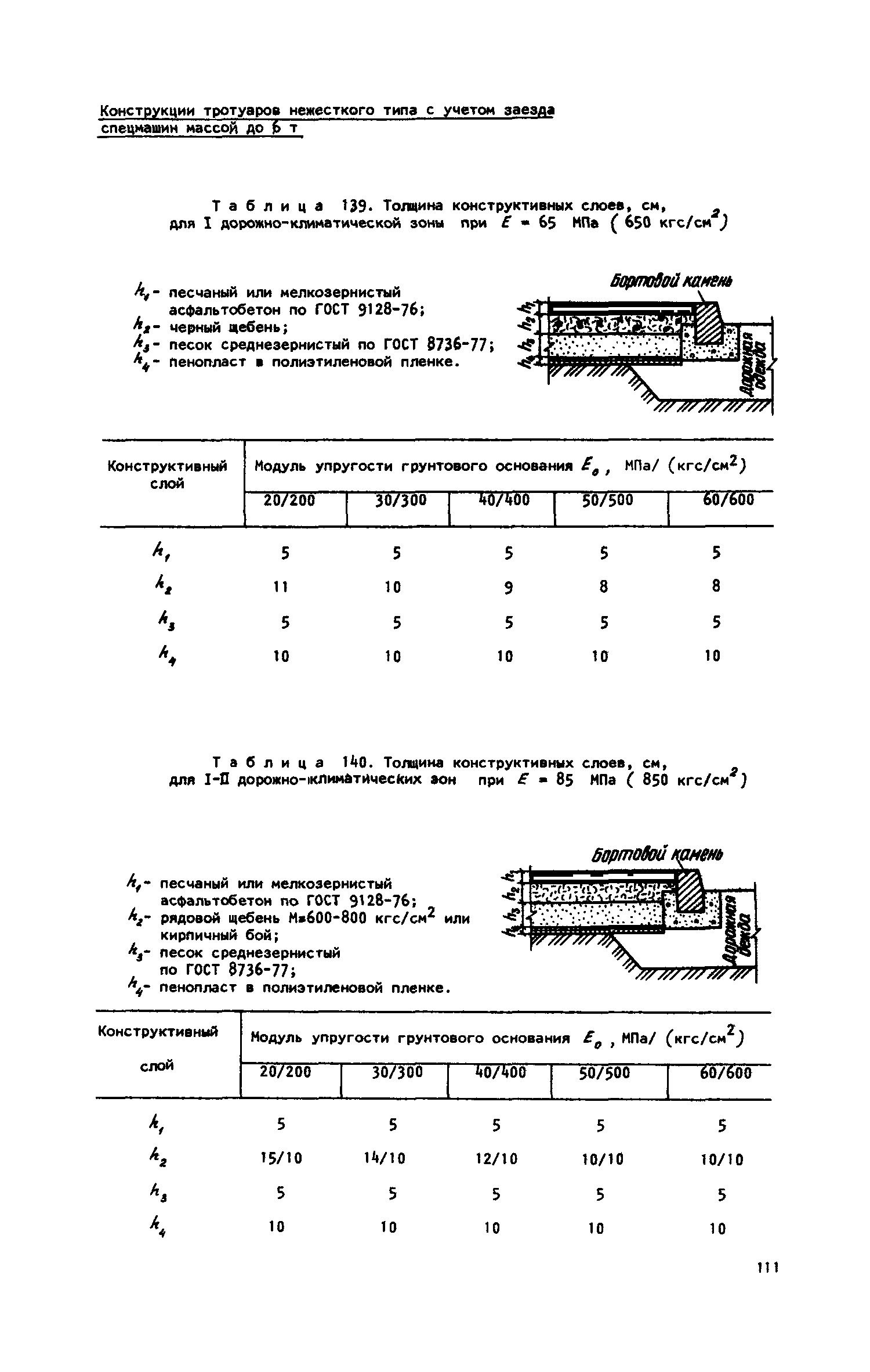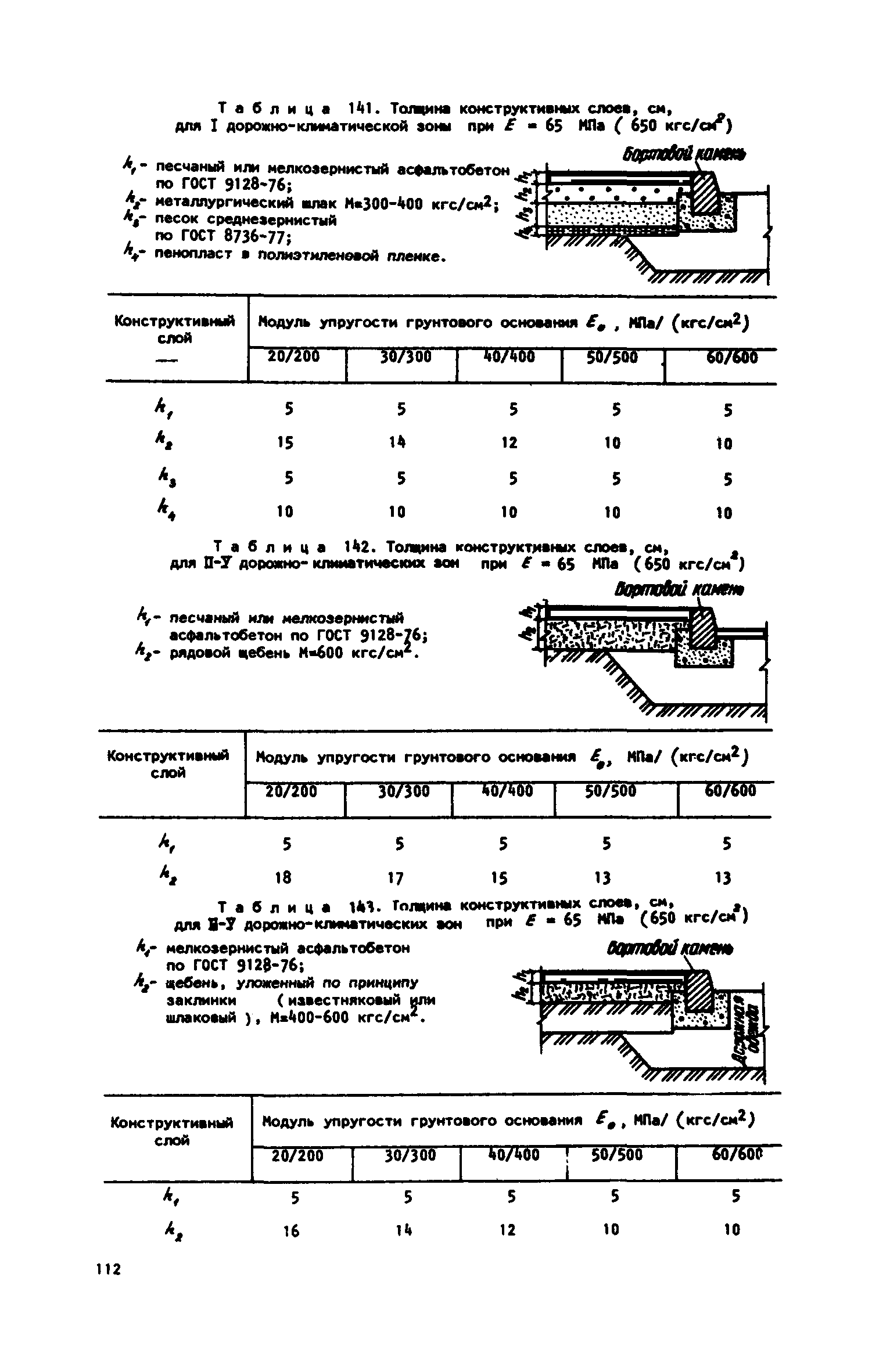 | Оглавление: | 1. Общие положения 2. Основные принципы расчета типовых конструкций дорожных одежд 3. Конструирование дорожных одежд городских дорог 4. Обеспечение морозоустойчивости дорожной одежды 5. Конструкции тротуаров Приложение. Таблицы расчета конструкций дорожных одежд Скоростные дороги, магистральные улицы и дороги общегородского значения Конструкции дорожных одежд нежесткого типа Конструкции дорожных одежд жесткого типа Магистральные улицы и дороги районного значения Конструкции дорожных одежд нежесткого типа Конструкции дорожных одежд жесткого типа Промышленные и складские дороги Конструкции дорожных одежд нежесткого типа Конструкции дорожных одежд жесткого типа Жилые улицы и дороги местного значения Конструкции дорожных одежд нежесткого типа Конструкции дорожных одежд жесткого типа Внутриквартальные проезды и пешеходные улицы Конструкции дорожных одежд нежесткого типа Поселковые улицы Конструкции дорожных одежд нежесткого типа Конструкции тротуаров нежесткого типа с учетом заезда тяжелых спецмашин массой до 8,5 т Конструкции тротуаров жесткого типа с учетом заезда тяжелых спецмашин массой до 8,5 т Конструкции тротуаров нежесткого типа с учетом заезда тяжелых спецмашин массой до 6 т Конструкции тротуаров жесткого типа с учетом заезда тяжелых спецмашин массой до 6 т Конструкции тротуаров жесткого типа без заезда спецмашин |