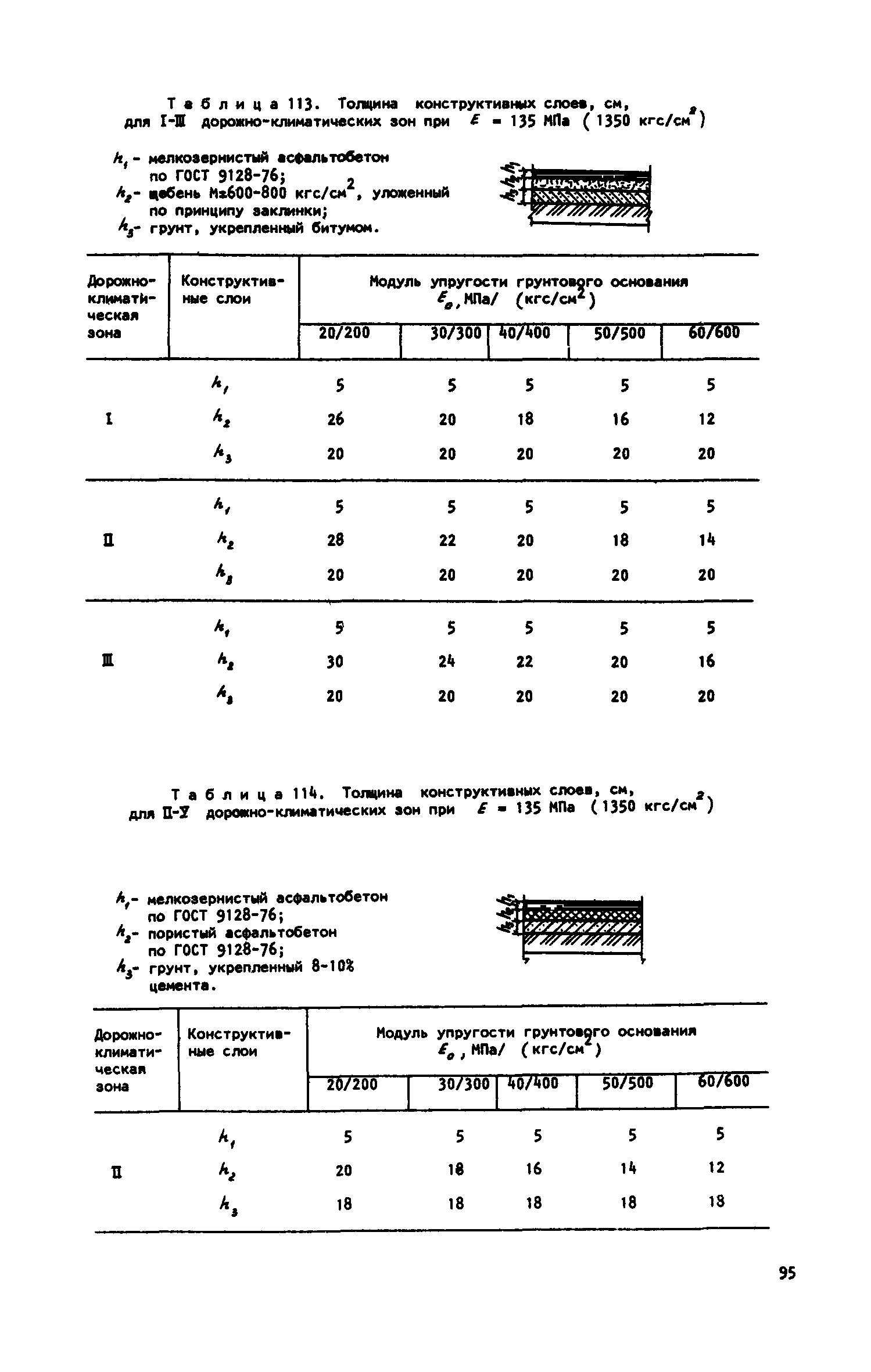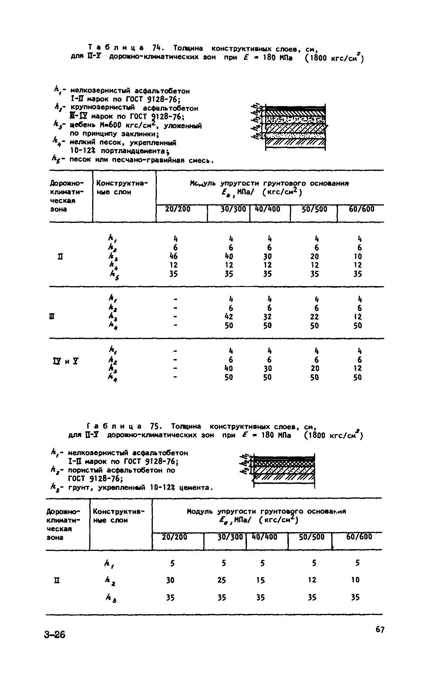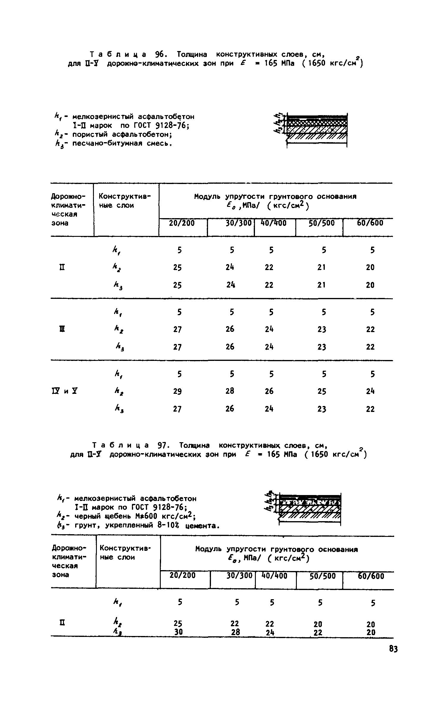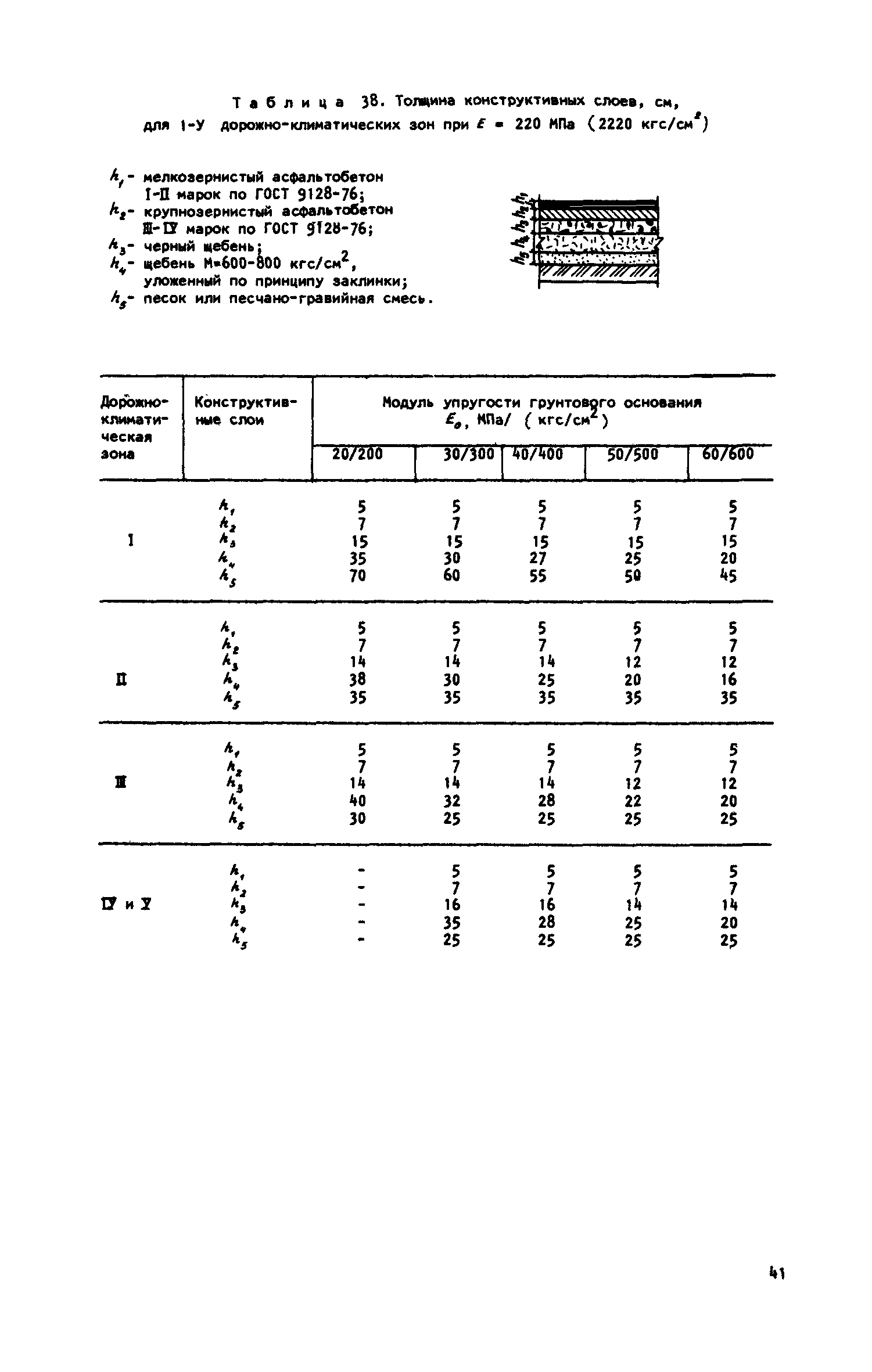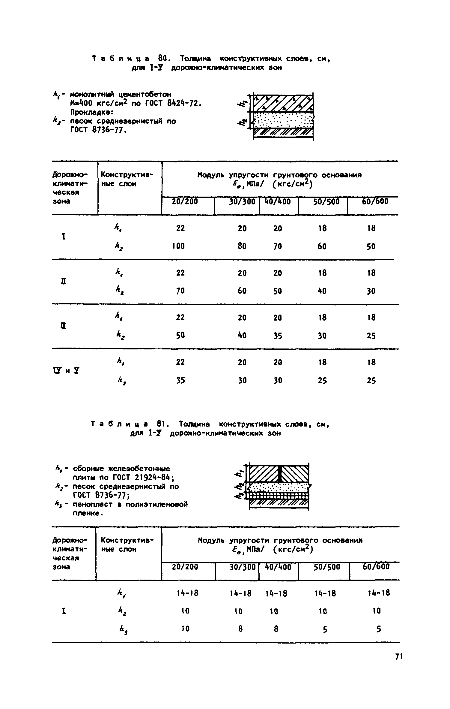 | Оглавление: | 1. Общие положения 2. Основные принципы расчета типовых конструкций дорожных одежд 3. Конструирование дорожных одежд городских дорог 4. Обеспечение морозоустойчивости дорожной одежды 5. Конструкции тротуаров Приложение. Таблицы расчета конструкций дорожных одежд Скоростные дороги, магистральные улицы и дороги общегородского значения Конструкции дорожных одежд нежесткого типа Конструкции дорожных одежд жесткого типа Магистральные улицы и дороги районного значения Конструкции дорожных одежд нежесткого типа Конструкции дорожных одежд жесткого типа Промышленные и складские дороги Конструкции дорожных одежд нежесткого типа Конструкции дорожных одежд жесткого типа Жилые улицы и дороги местного значения Конструкции дорожных одежд нежесткого типа Конструкции дорожных одежд жесткого типа Внутриквартальные проезды и пешеходные улицы Конструкции дорожных одежд нежесткого типа Поселковые улицы Конструкции дорожных одежд нежесткого типа Конструкции тротуаров нежесткого типа с учетом заезда тяжелых спецмашин массой до 8,5 т Конструкции тротуаров жесткого типа с учетом заезда тяжелых спецмашин массой до 8,5 т Конструкции тротуаров нежесткого типа с учетом заезда тяжелых спецмашин массой до 6 т Конструкции тротуаров жесткого типа с учетом заезда тяжелых спецмашин массой до 6 т Конструкции тротуаров жесткого типа без заезда спецмашин |