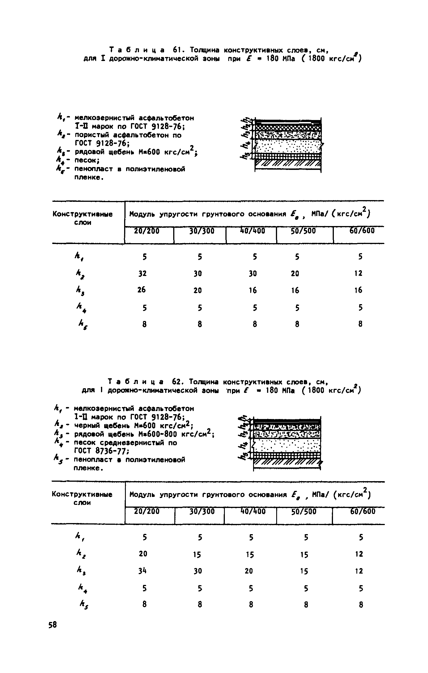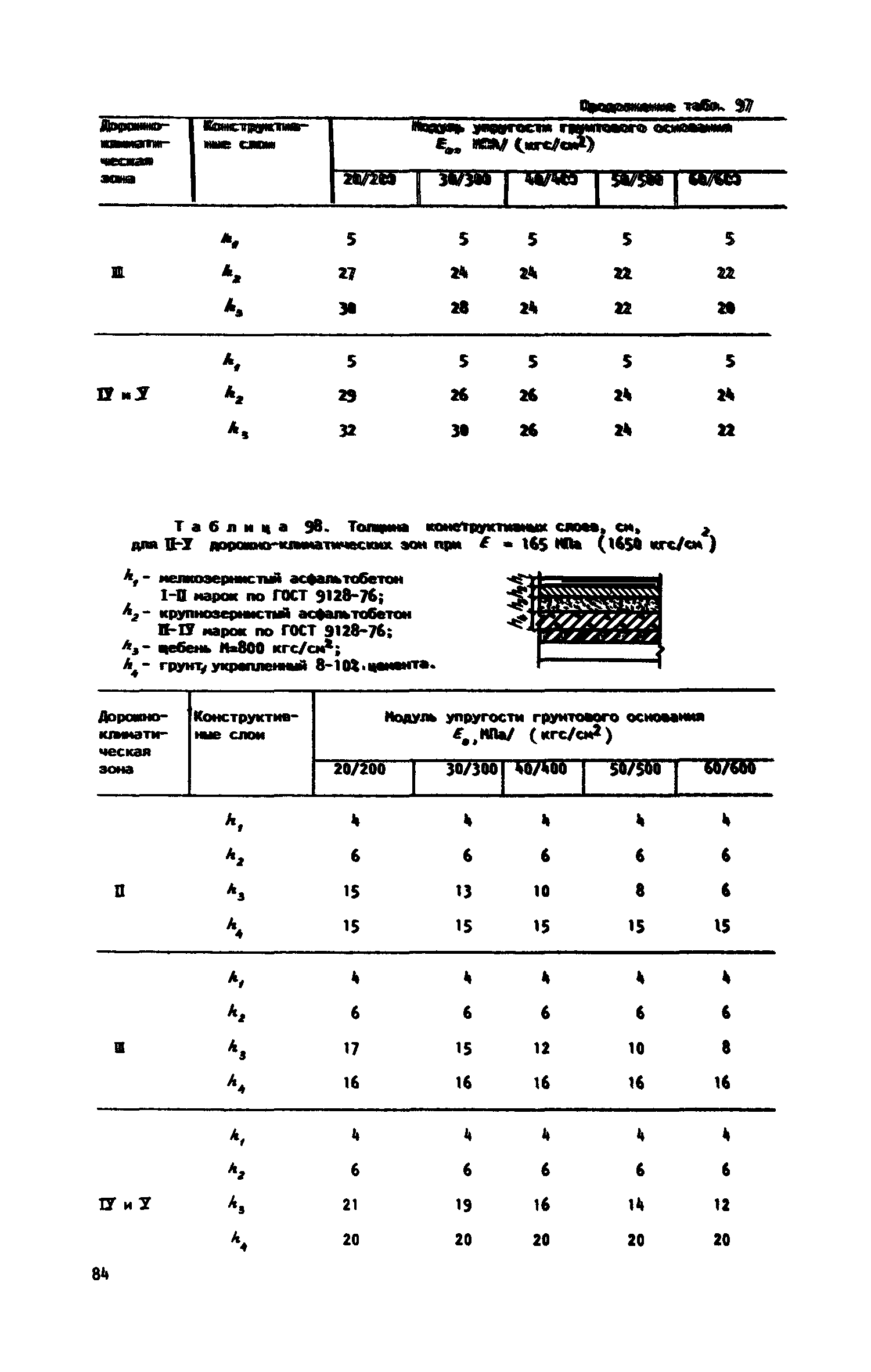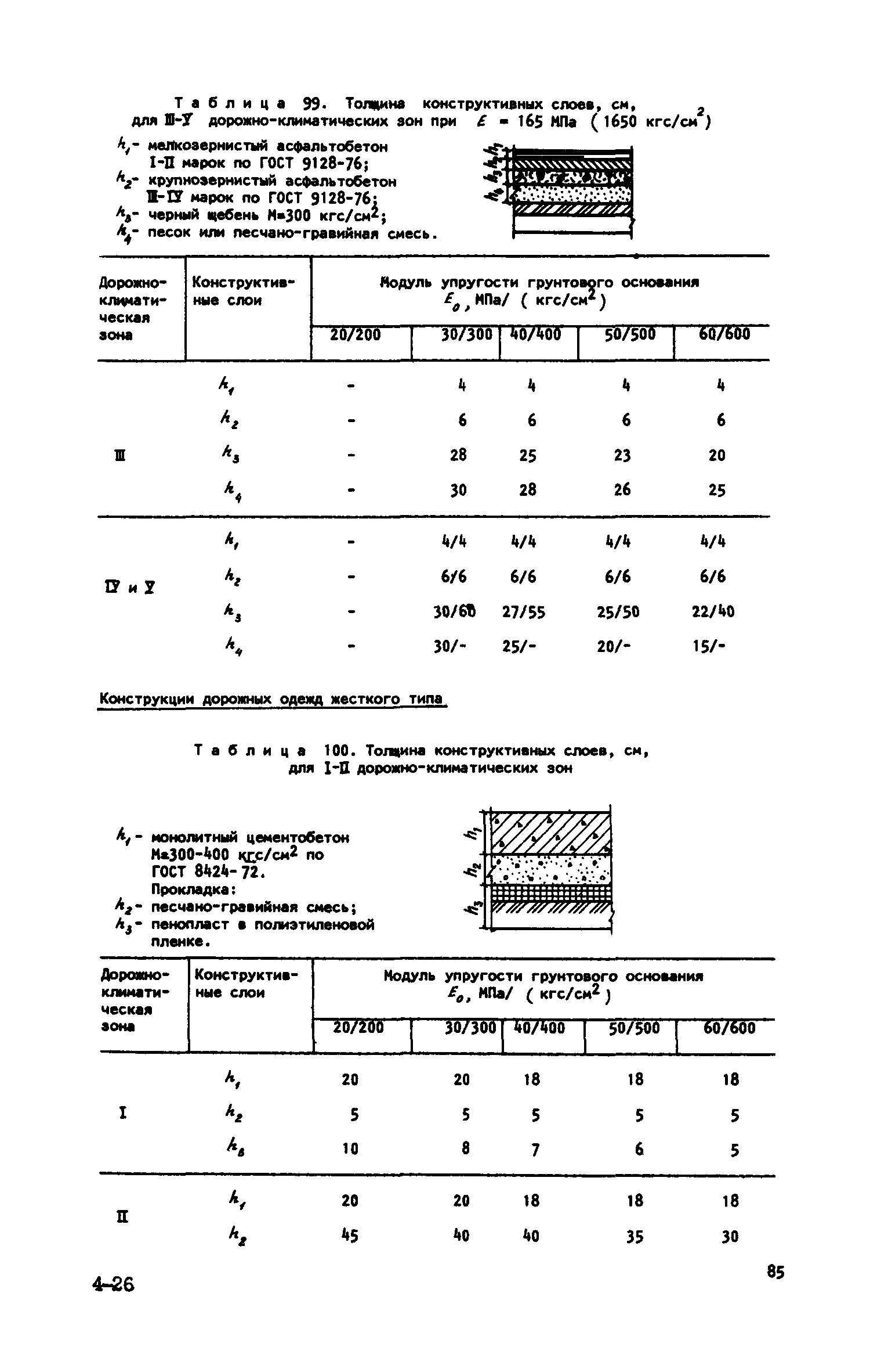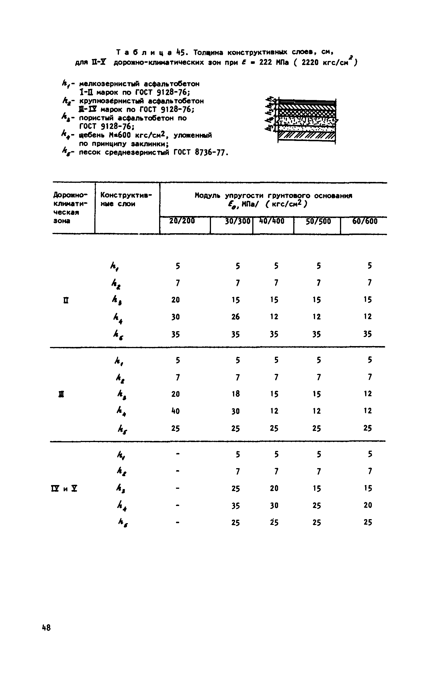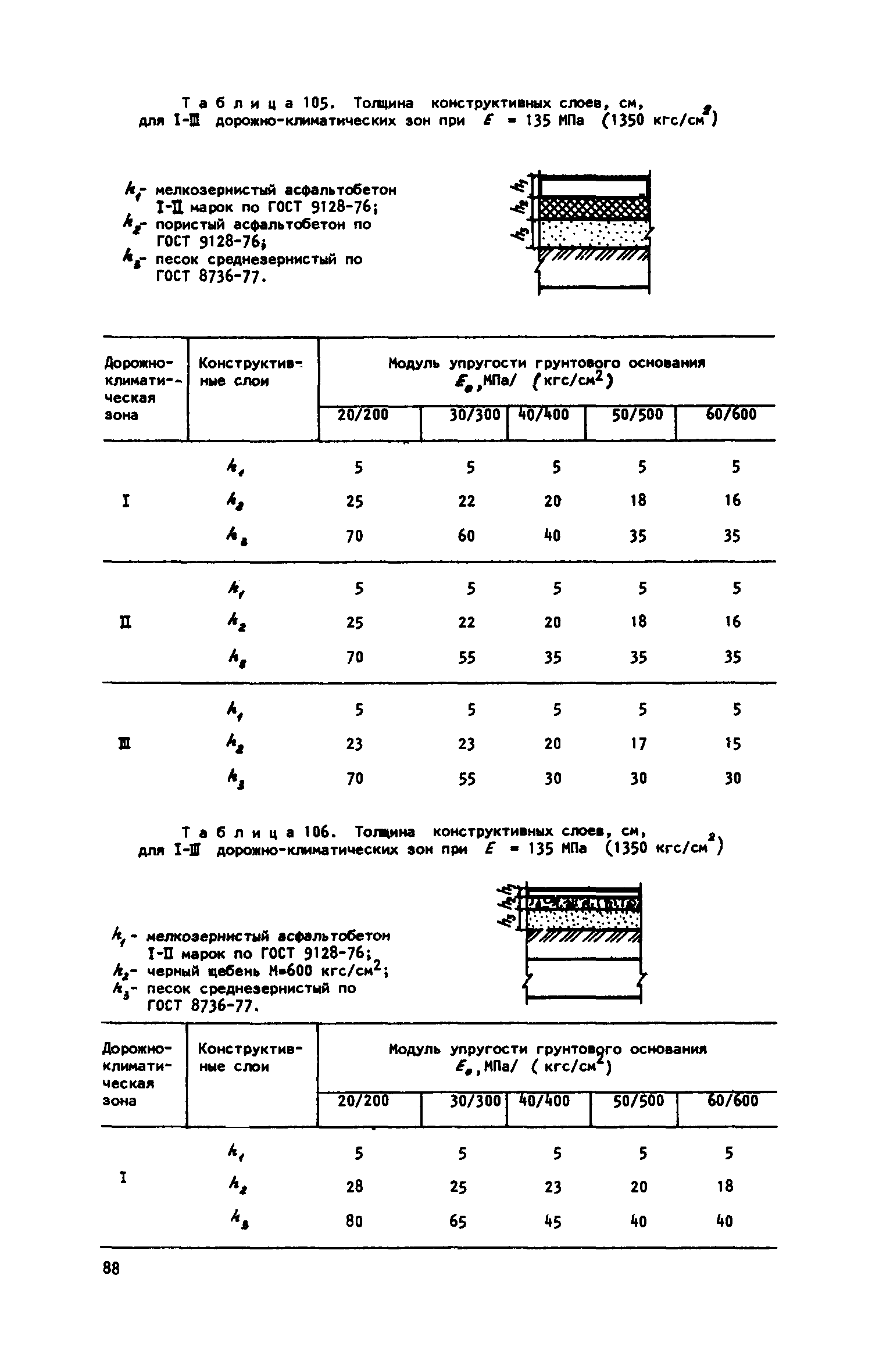 | Оглавление: | 1. Общие положения 2. Основные принципы расчета типовых конструкций дорожных одежд 3. Конструирование дорожных одежд городских дорог 4. Обеспечение морозоустойчивости дорожной одежды 5. Конструкции тротуаров Приложение. Таблицы расчета конструкций дорожных одежд Скоростные дороги, магистральные улицы и дороги общегородского значения Конструкции дорожных одежд нежесткого типа Конструкции дорожных одежд жесткого типа Магистральные улицы и дороги районного значения Конструкции дорожных одежд нежесткого типа Конструкции дорожных одежд жесткого типа Промышленные и складские дороги Конструкции дорожных одежд нежесткого типа Конструкции дорожных одежд жесткого типа Жилые улицы и дороги местного значения Конструкции дорожных одежд нежесткого типа Конструкции дорожных одежд жесткого типа Внутриквартальные проезды и пешеходные улицы Конструкции дорожных одежд нежесткого типа Поселковые улицы Конструкции дорожных одежд нежесткого типа Конструкции тротуаров нежесткого типа с учетом заезда тяжелых спецмашин массой до 8,5 т Конструкции тротуаров жесткого типа с учетом заезда тяжелых спецмашин массой до 8,5 т Конструкции тротуаров нежесткого типа с учетом заезда тяжелых спецмашин массой до 6 т Конструкции тротуаров жесткого типа с учетом заезда тяжелых спецмашин массой до 6 т Конструкции тротуаров жесткого типа без заезда спецмашин |