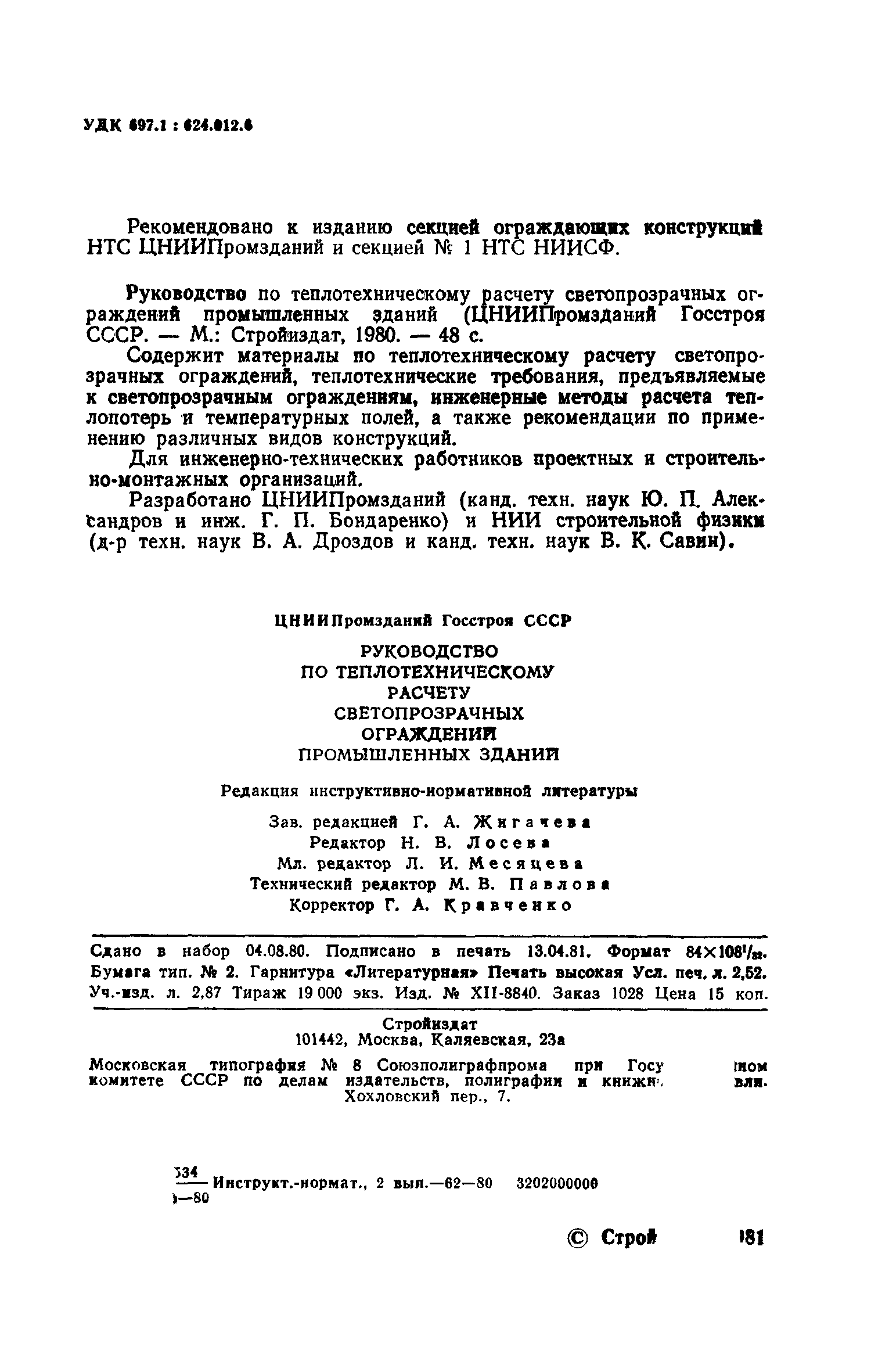 | Название рус.: | Руководство по теплотехническому расчету светопрозрачных ограждений промышленных зданий |
