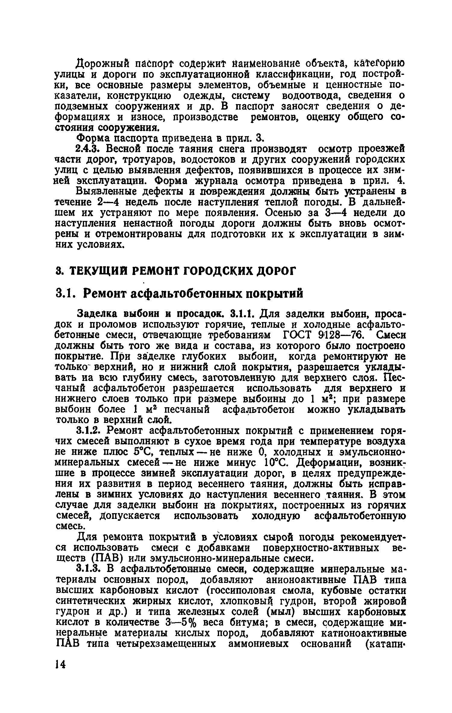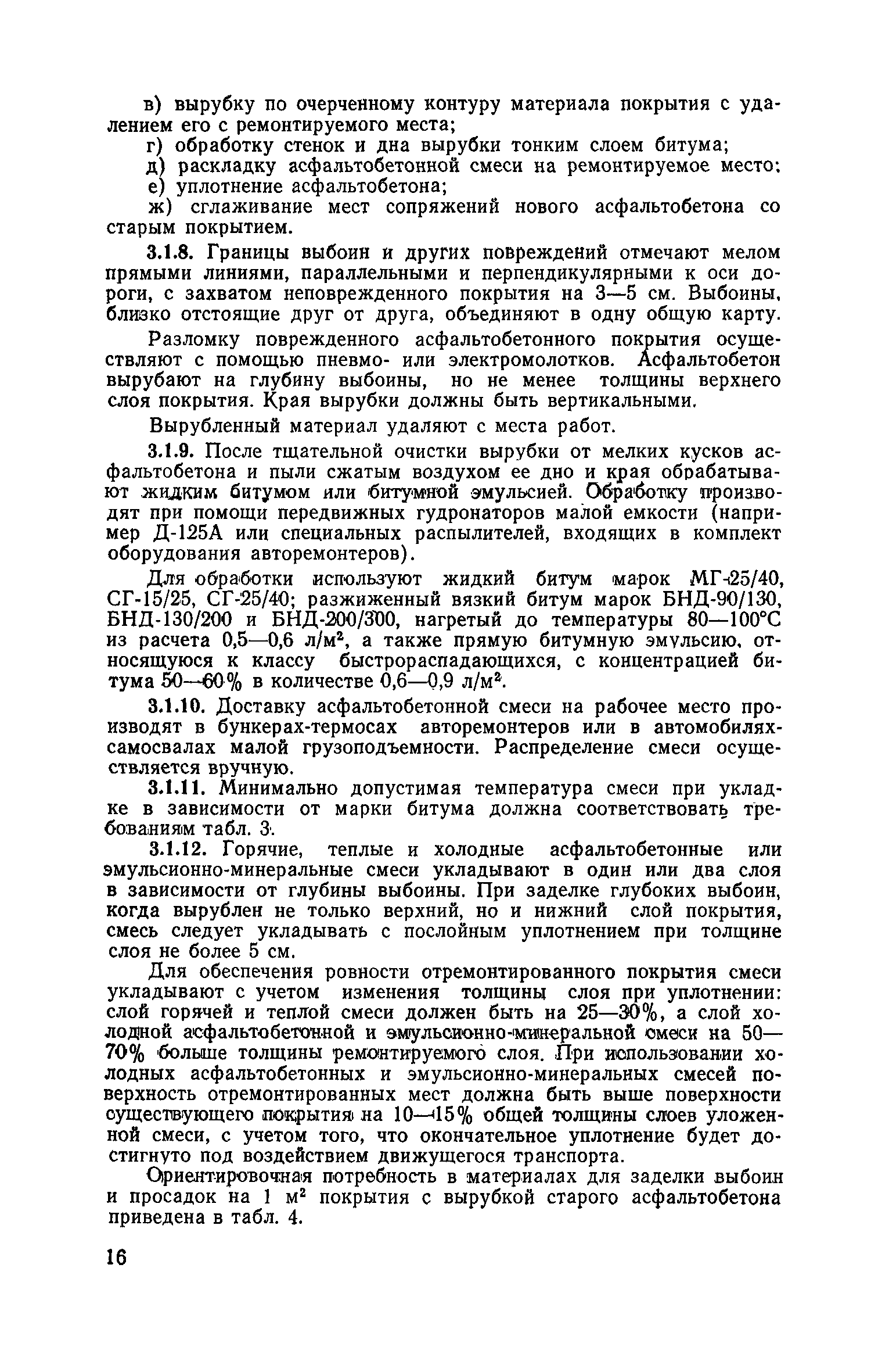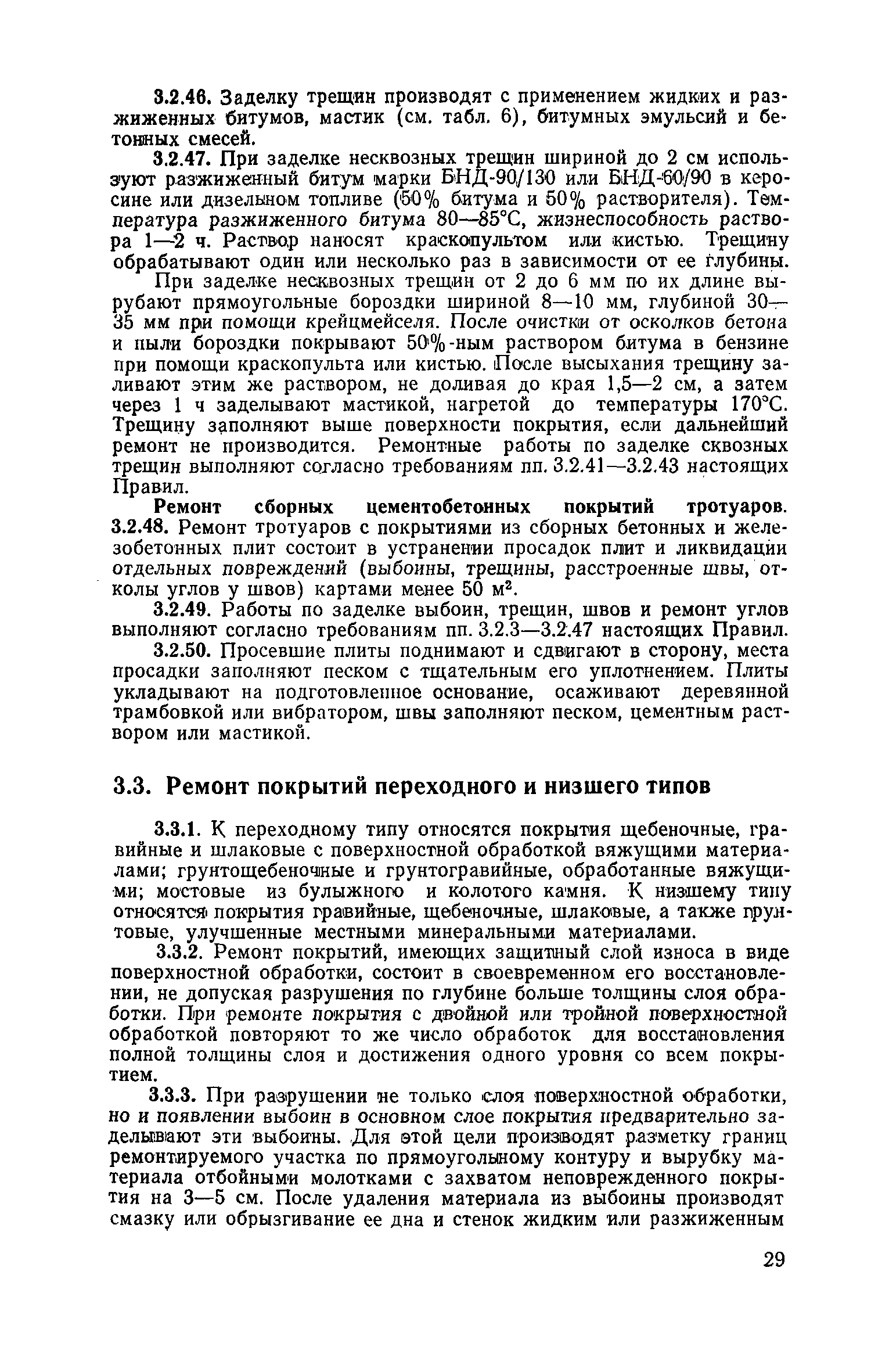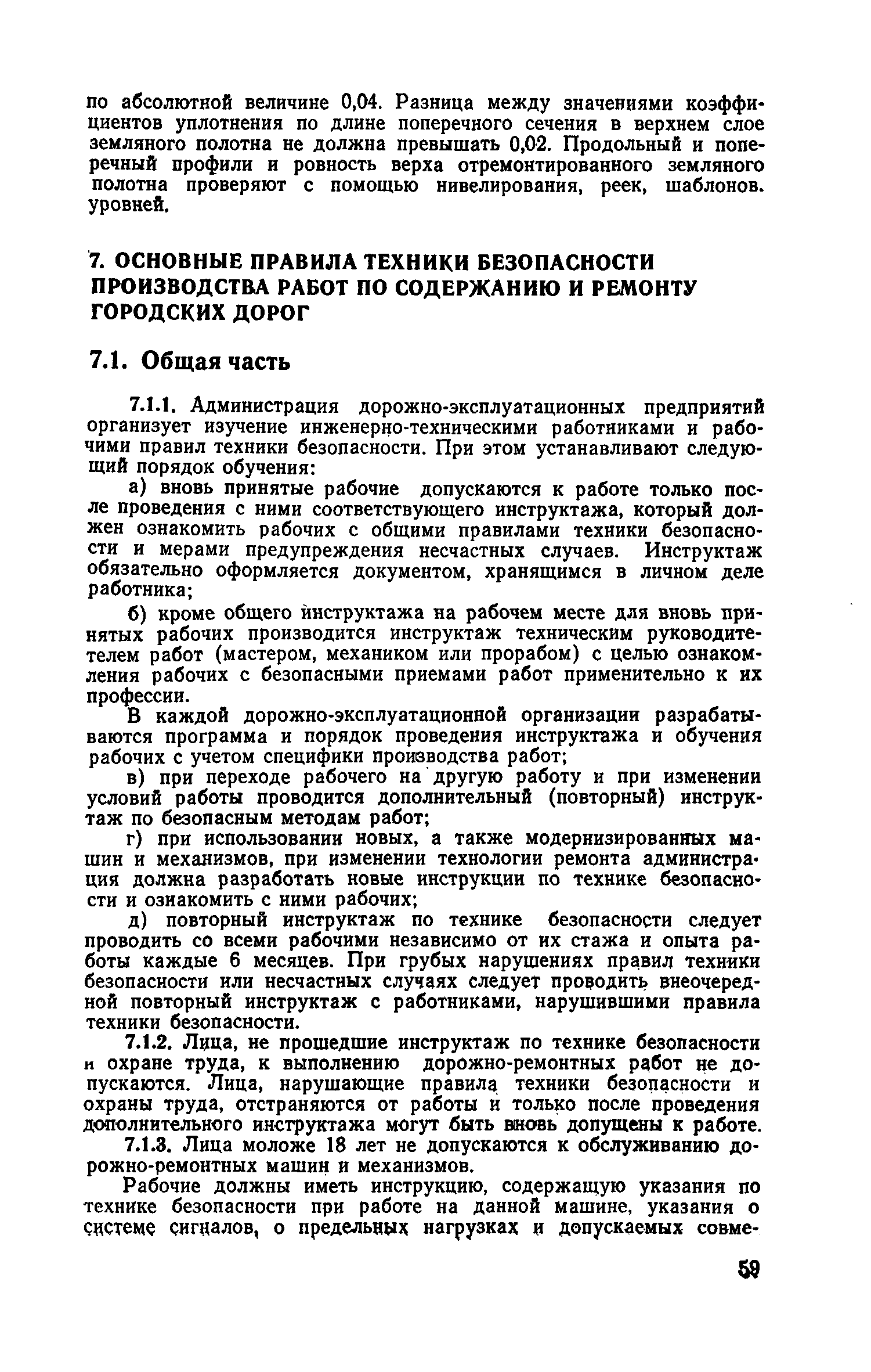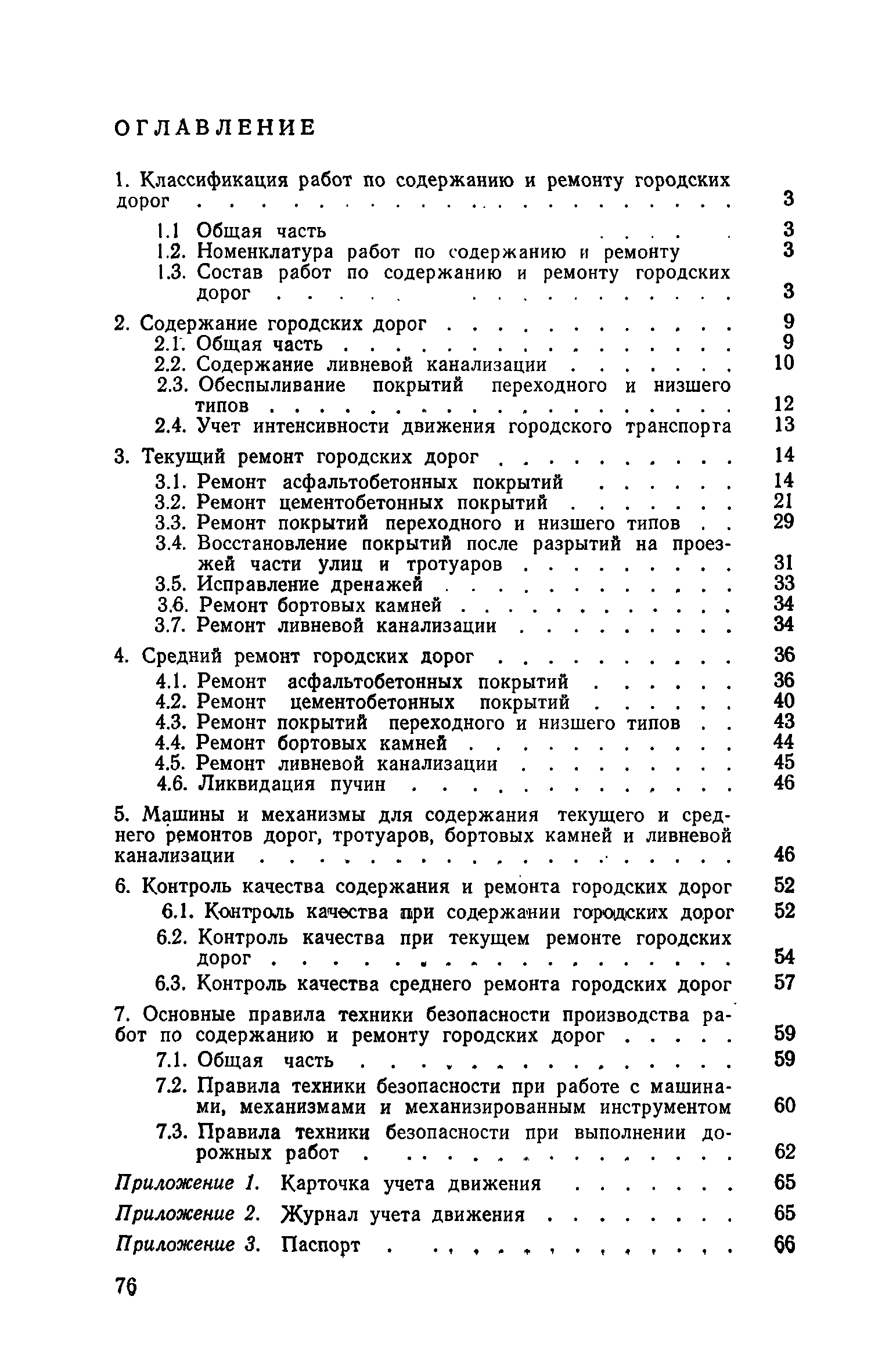 | Оглавление: | 1. Классификация работ по содержанию и ремонту городских дорог 1.1 Общая часть 1.2 Номенклатура работ по содержанию и ремонту 1.3 Состав работ по содержанию и ремонту городских дорог 2. Содержание городских дорог 2.1 Общая часть 2.2 Содержание ливневой канализации 2.3 Обеспыливание покрытий переходного т низшего типов 2.4 Учет интенсивности движения городского транспорта 3. Текущий ремонт городских дорог 3.1 Ремонт асфальтобетонных покрытий 3.2 Ремонт цементобетонных покрытий 3.3 Ремонт покрытий переходного и низшего типов 3.4 Восстановление покрытий после разрытий на проезжей части улиц и тротуаров 3.5 Исправление дренажей 3.6 Ремонт бортовых камней 3.7 Ремонт ливневой канализации 4. Средний ремонт городских дорог 4.1 Ремонт асфальтобетонных покрытий 4.2 Ремонт цементобетонных покрытий 4.3 Ремонт покрытий переходного и низшего типов 4.4 Ремонт бортовых камней 4.5 Ремонт ливневой канализации 4.6 Ликвидация пучин 5. Машины и механизмы для содержания текущего и среднего ремонтов дорог, тротуаров, бортовых камней и ливневой канализации 6. Контроль качества содержания и ремонта городских дорог 6.1 Контроль качества при содержании городских дорог 6.2 Контроль качества при текущем ремонте городских дорог 6.3 Контроль качества среднего ремонта городских дорог 7. Основные правила техники безопасности производства работ по содержанию и ремонту городских дорог 7.1 Общая часть 7.2 Правила техники безопасности при работе с машинами, механизмами и механизированным инструментом 7.3 Правила техники безопасности при выполнении дорожных работ Приложение 1. Карточка учета движения Приложение 2. Журнал учета движения Приложение 3. Паспорт Приложение 4. Журнал осмотра городских дорог и тротуаров Приложение 5. Накладная на битум (битумную эмульсию) Приложение 6. Накладная на замес Приложение 7. Накладная на бетонную смесь Приложение 8. Ведомость промеров толщины, поперечных уклонов, ширины и ровности покрытия Приложение 9. Ведомость промеров толщины, поперечных уклонов, ширины и ровности основания под покрытие Приложение 10. Журнал контроля уплотнения грунта под основание дороги Приложение 11. Журнал качества укладки бетонной смеси Приложение 12. Журнал качества укладки асфальтобетонной смеси за смену |