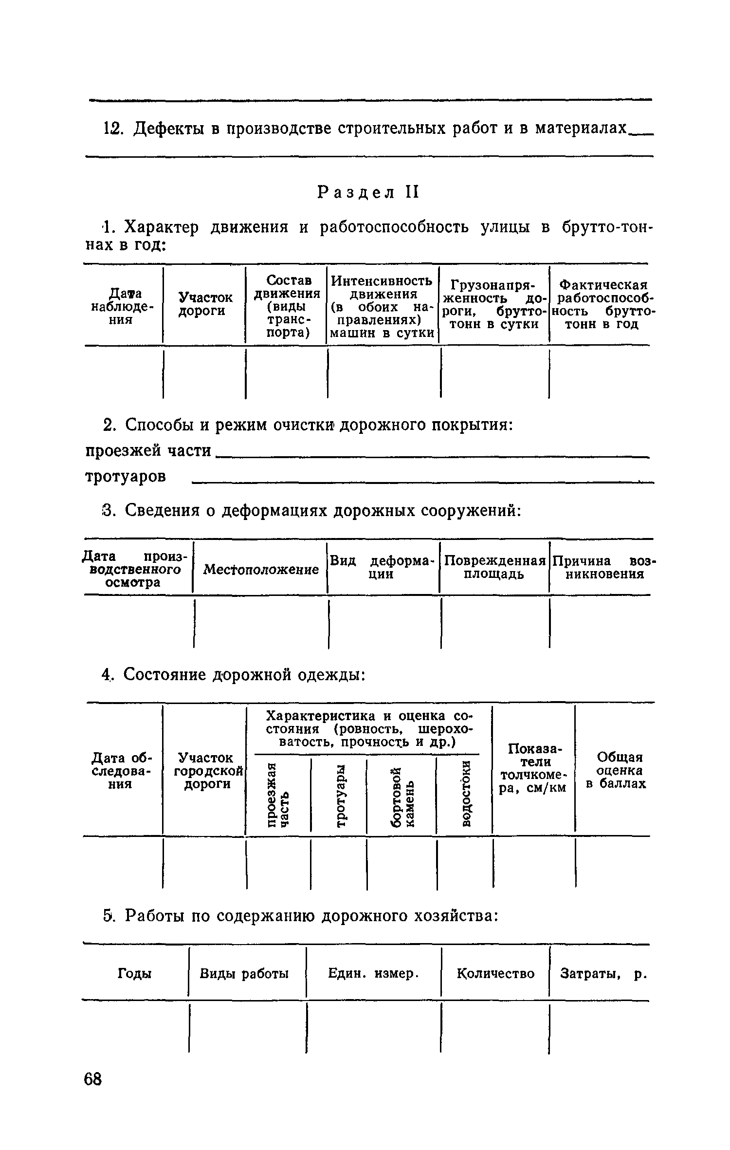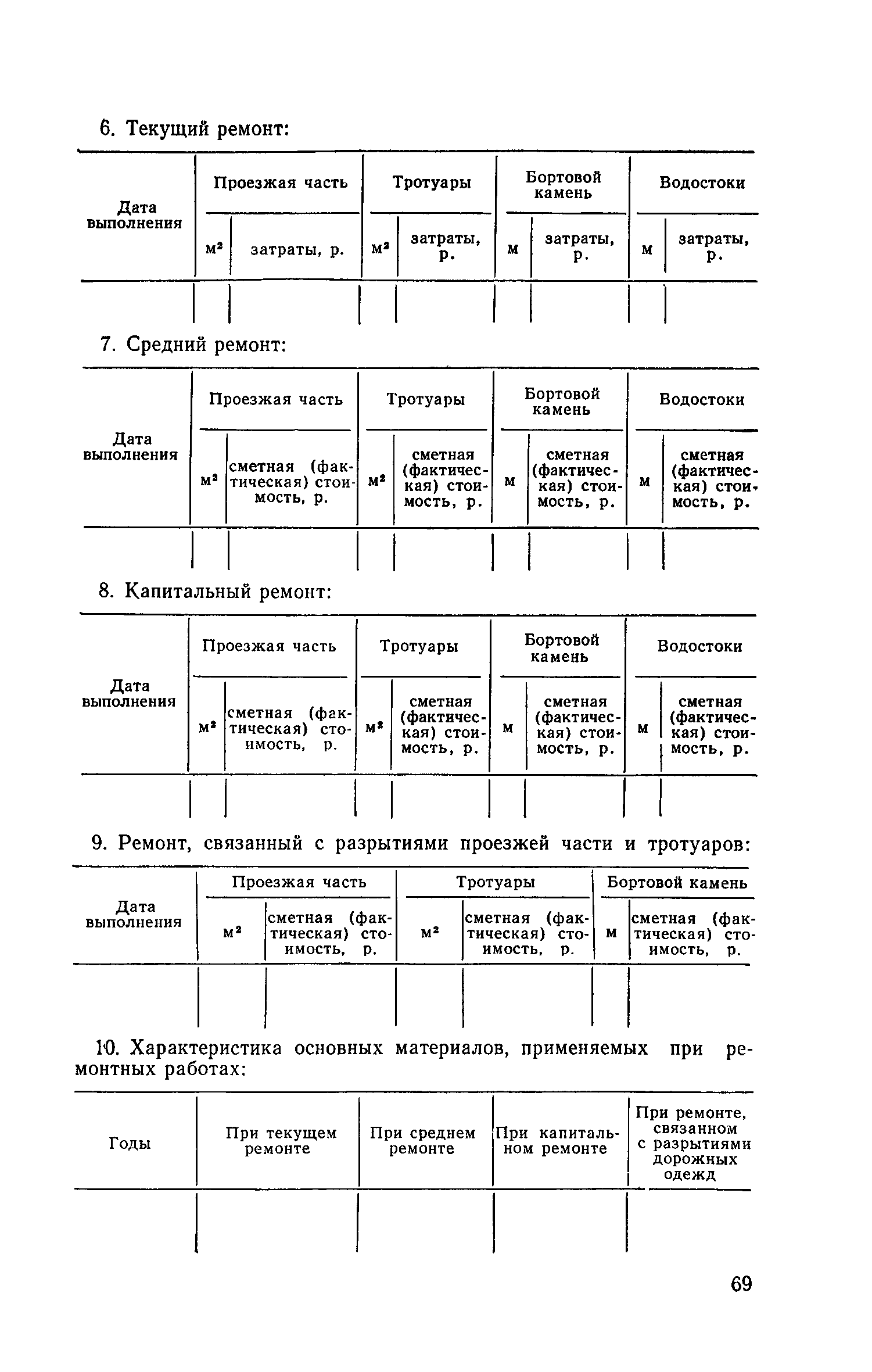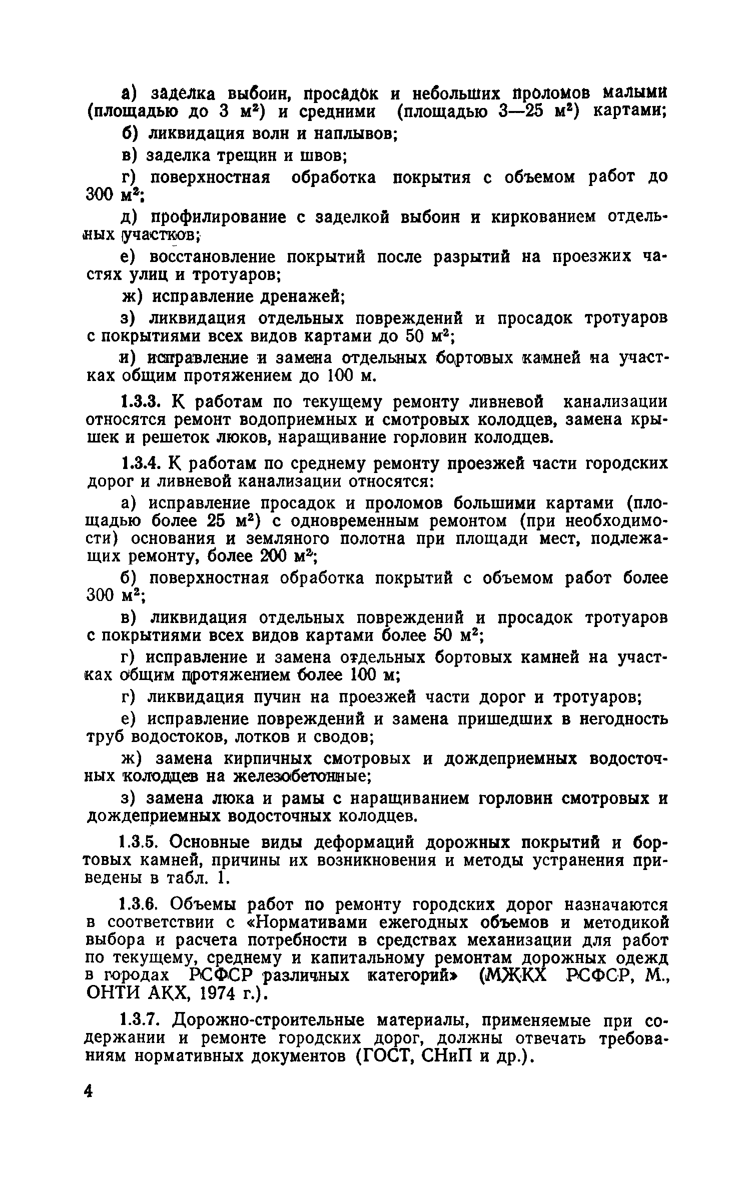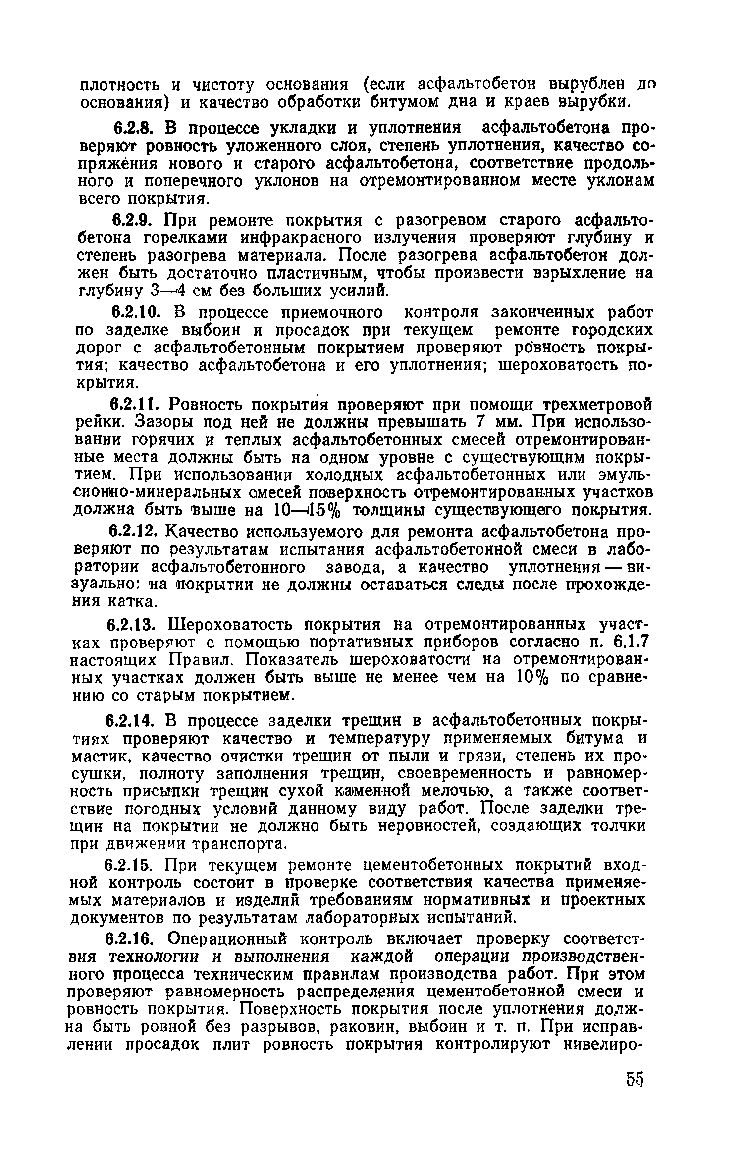 | Оглавление: | 1. Классификация работ по содержанию и ремонту городских дорог 1.1 Общая часть 1.2 Номенклатура работ по содержанию и ремонту 1.3 Состав работ по содержанию и ремонту городских дорог 2. Содержание городских дорог 2.1 Общая часть 2.2 Содержание ливневой канализации 2.3 Обеспыливание покрытий переходного т низшего типов 2.4 Учет интенсивности движения городского транспорта 3. Текущий ремонт городских дорог 3.1 Ремонт асфальтобетонных покрытий 3.2 Ремонт цементобетонных покрытий 3.3 Ремонт покрытий переходного и низшего типов 3.4 Восстановление покрытий после разрытий на проезжей части улиц и тротуаров 3.5 Исправление дренажей 3.6 Ремонт бортовых камней 3.7 Ремонт ливневой канализации 4. Средний ремонт городских дорог 4.1 Ремонт асфальтобетонных покрытий 4.2 Ремонт цементобетонных покрытий 4.3 Ремонт покрытий переходного и низшего типов 4.4 Ремонт бортовых камней 4.5 Ремонт ливневой канализации 4.6 Ликвидация пучин 5. Машины и механизмы для содержания текущего и среднего ремонтов дорог, тротуаров, бортовых камней и ливневой канализации 6. Контроль качества содержания и ремонта городских дорог 6.1 Контроль качества при содержании городских дорог 6.2 Контроль качества при текущем ремонте городских дорог 6.3 Контроль качества среднего ремонта городских дорог 7. Основные правила техники безопасности производства работ по содержанию и ремонту городских дорог 7.1 Общая часть 7.2 Правила техники безопасности при работе с машинами, механизмами и механизированным инструментом 7.3 Правила техники безопасности при выполнении дорожных работ Приложение 1. Карточка учета движения Приложение 2. Журнал учета движения Приложение 3. Паспорт Приложение 4. Журнал осмотра городских дорог и тротуаров Приложение 5. Накладная на битум (битумную эмульсию) Приложение 6. Накладная на замес Приложение 7. Накладная на бетонную смесь Приложение 8. Ведомость промеров толщины, поперечных уклонов, ширины и ровности покрытия Приложение 9. Ведомость промеров толщины, поперечных уклонов, ширины и ровности основания под покрытие Приложение 10. Журнал контроля уплотнения грунта под основание дороги Приложение 11. Журнал качества укладки бетонной смеси Приложение 12. Журнал качества укладки асфальтобетонной смеси за смену |