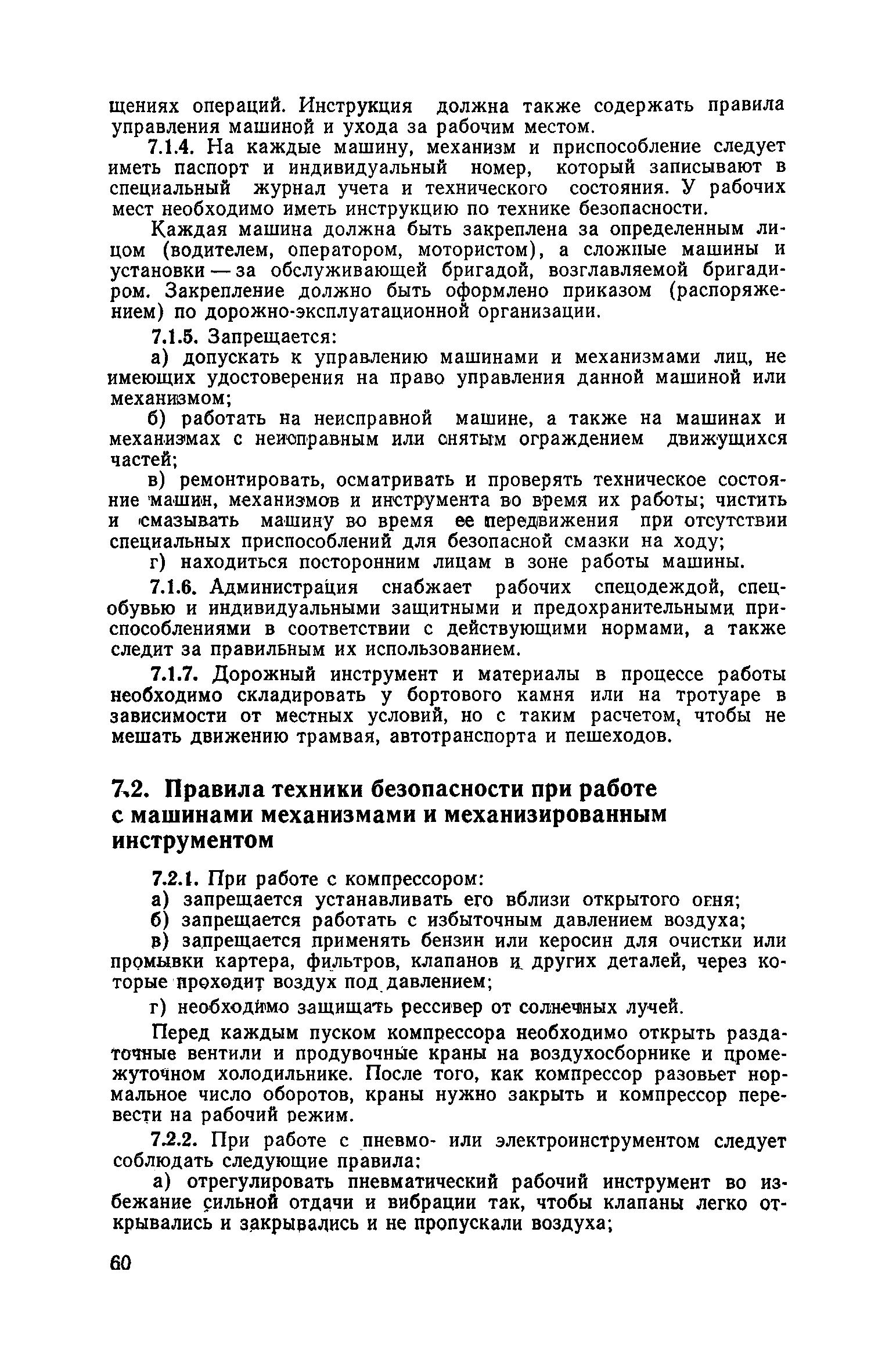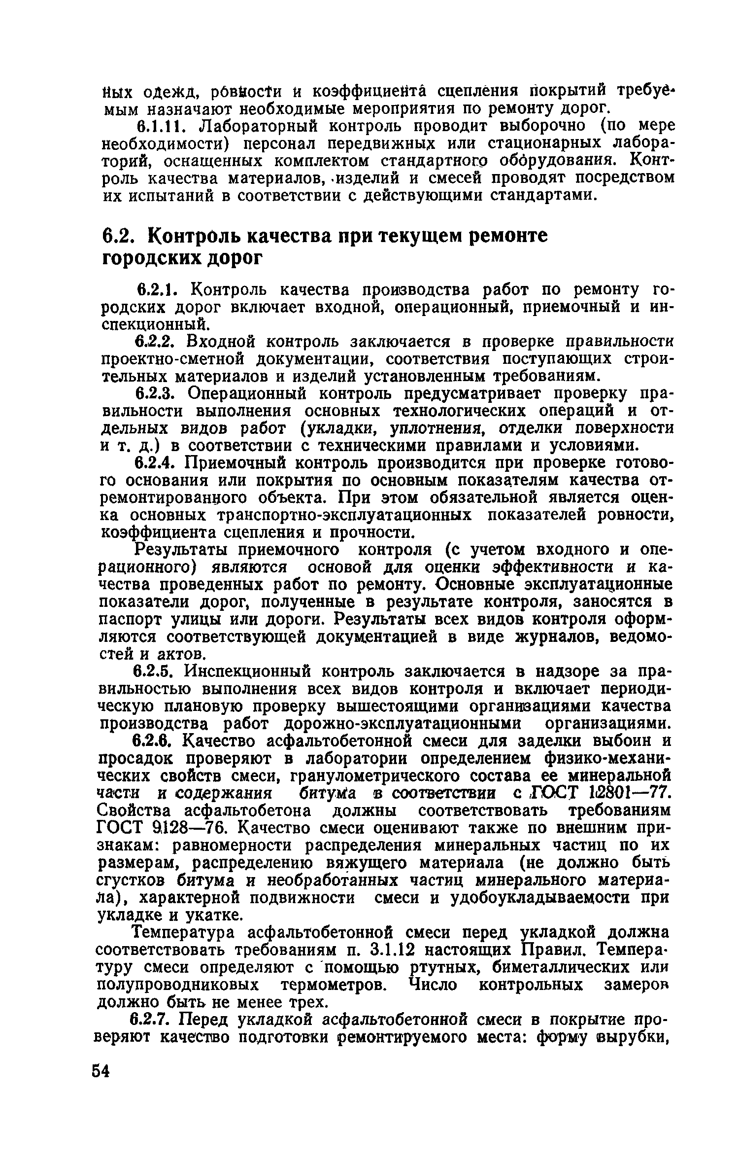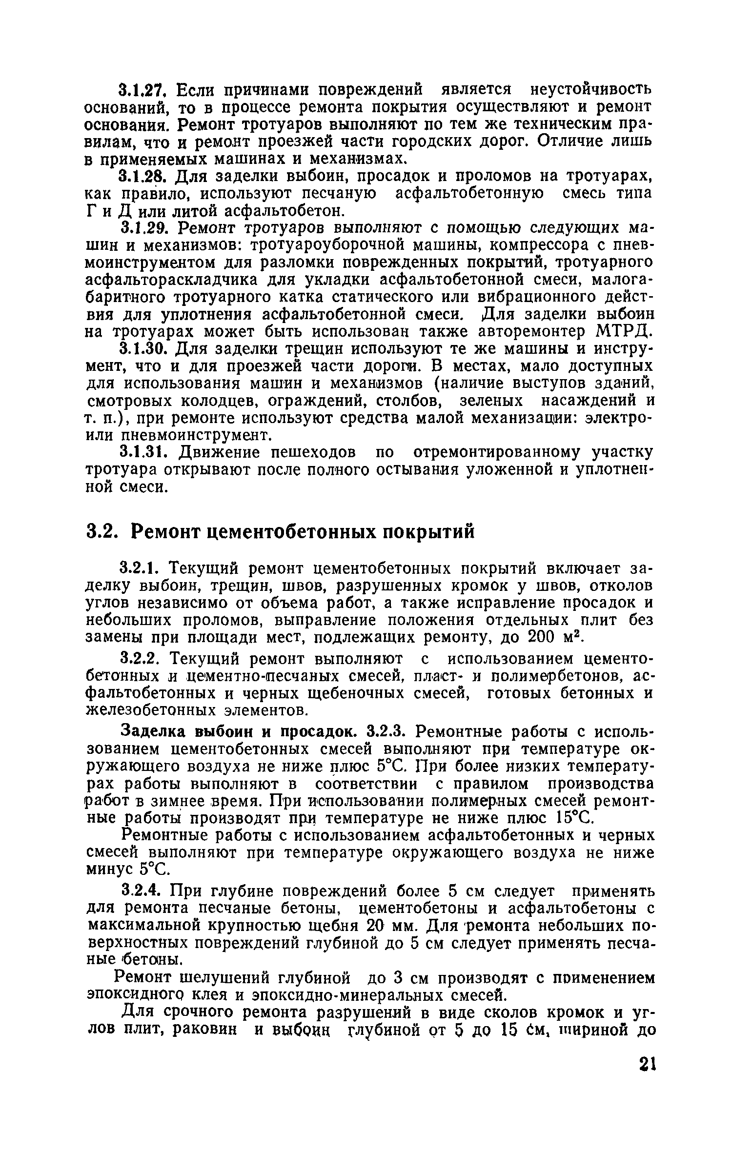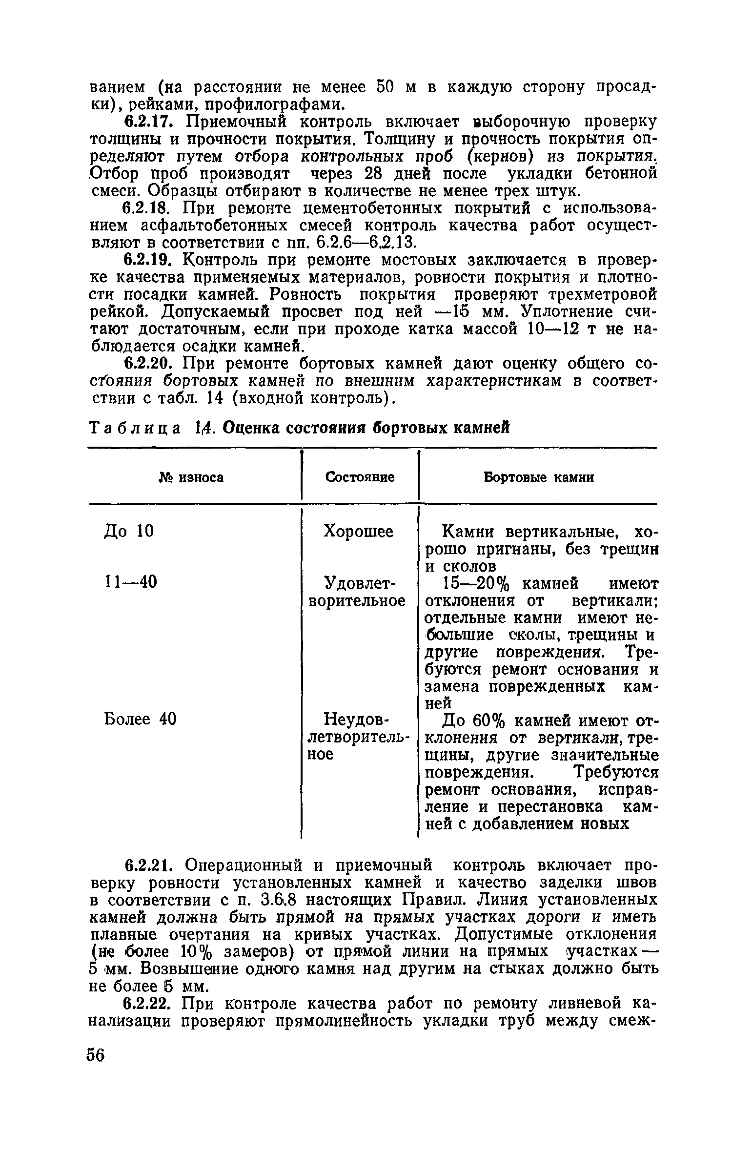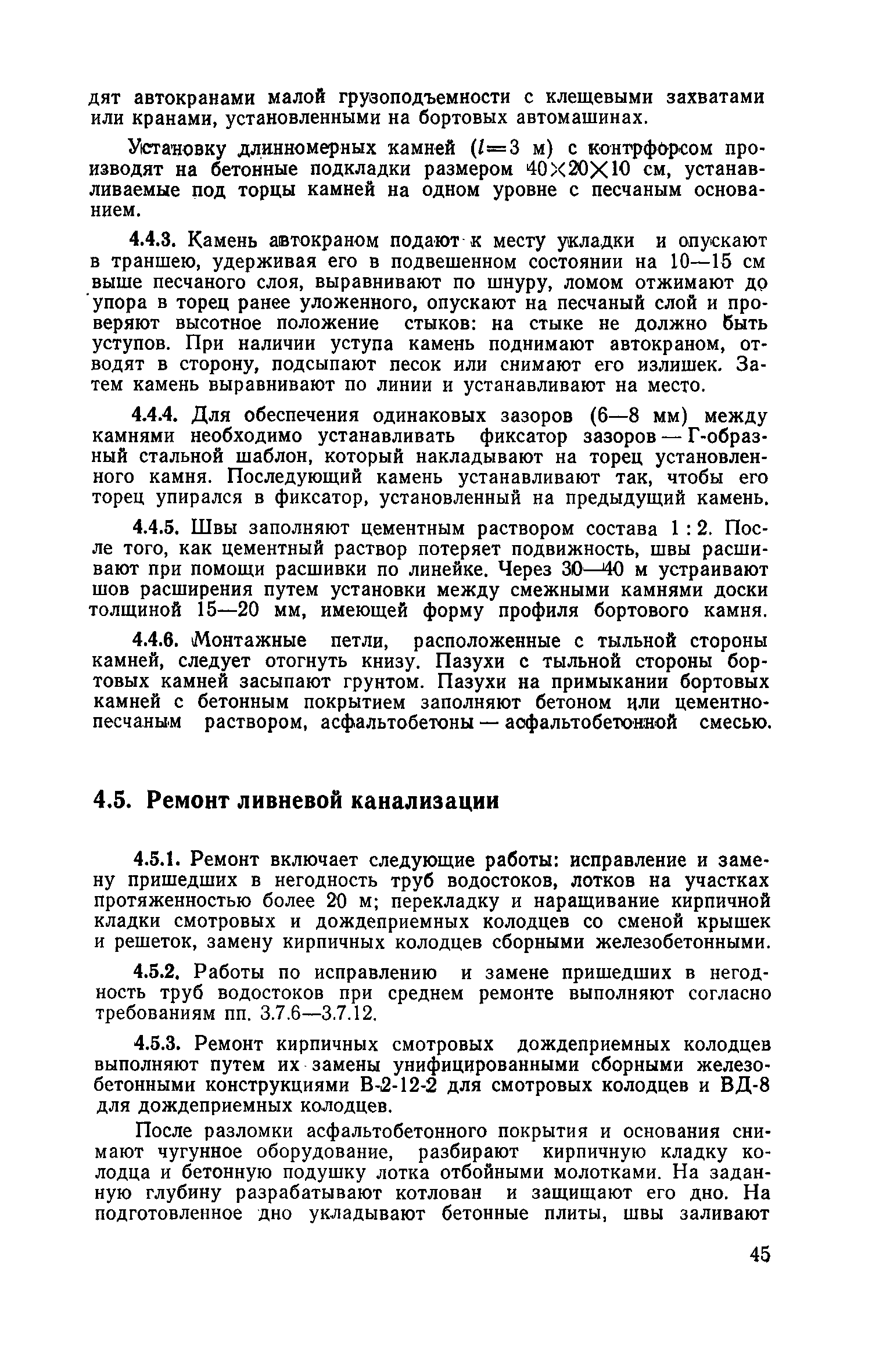 | Оглавление: | 1. Классификация работ по содержанию и ремонту городских дорог 1.1 Общая часть 1.2 Номенклатура работ по содержанию и ремонту 1.3 Состав работ по содержанию и ремонту городских дорог 2. Содержание городских дорог 2.1 Общая часть 2.2 Содержание ливневой канализации 2.3 Обеспыливание покрытий переходного т низшего типов 2.4 Учет интенсивности движения городского транспорта 3. Текущий ремонт городских дорог 3.1 Ремонт асфальтобетонных покрытий 3.2 Ремонт цементобетонных покрытий 3.3 Ремонт покрытий переходного и низшего типов 3.4 Восстановление покрытий после разрытий на проезжей части улиц и тротуаров 3.5 Исправление дренажей 3.6 Ремонт бортовых камней 3.7 Ремонт ливневой канализации 4. Средний ремонт городских дорог 4.1 Ремонт асфальтобетонных покрытий 4.2 Ремонт цементобетонных покрытий 4.3 Ремонт покрытий переходного и низшего типов 4.4 Ремонт бортовых камней 4.5 Ремонт ливневой канализации 4.6 Ликвидация пучин 5. Машины и механизмы для содержания текущего и среднего ремонтов дорог, тротуаров, бортовых камней и ливневой канализации 6. Контроль качества содержания и ремонта городских дорог 6.1 Контроль качества при содержании городских дорог 6.2 Контроль качества при текущем ремонте городских дорог 6.3 Контроль качества среднего ремонта городских дорог 7. Основные правила техники безопасности производства работ по содержанию и ремонту городских дорог 7.1 Общая часть 7.2 Правила техники безопасности при работе с машинами, механизмами и механизированным инструментом 7.3 Правила техники безопасности при выполнении дорожных работ Приложение 1. Карточка учета движения Приложение 2. Журнал учета движения Приложение 3. Паспорт Приложение 4. Журнал осмотра городских дорог и тротуаров Приложение 5. Накладная на битум (битумную эмульсию) Приложение 6. Накладная на замес Приложение 7. Накладная на бетонную смесь Приложение 8. Ведомость промеров толщины, поперечных уклонов, ширины и ровности покрытия Приложение 9. Ведомость промеров толщины, поперечных уклонов, ширины и ровности основания под покрытие Приложение 10. Журнал контроля уплотнения грунта под основание дороги Приложение 11. Журнал качества укладки бетонной смеси Приложение 12. Журнал качества укладки асфальтобетонной смеси за смену |