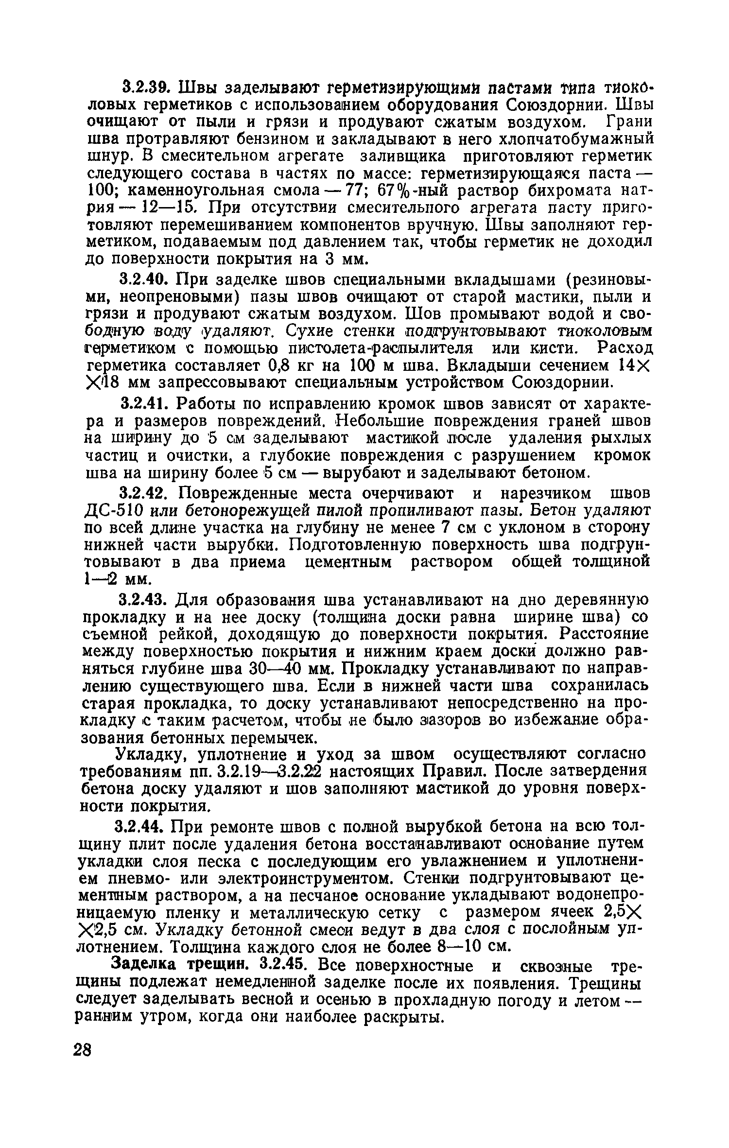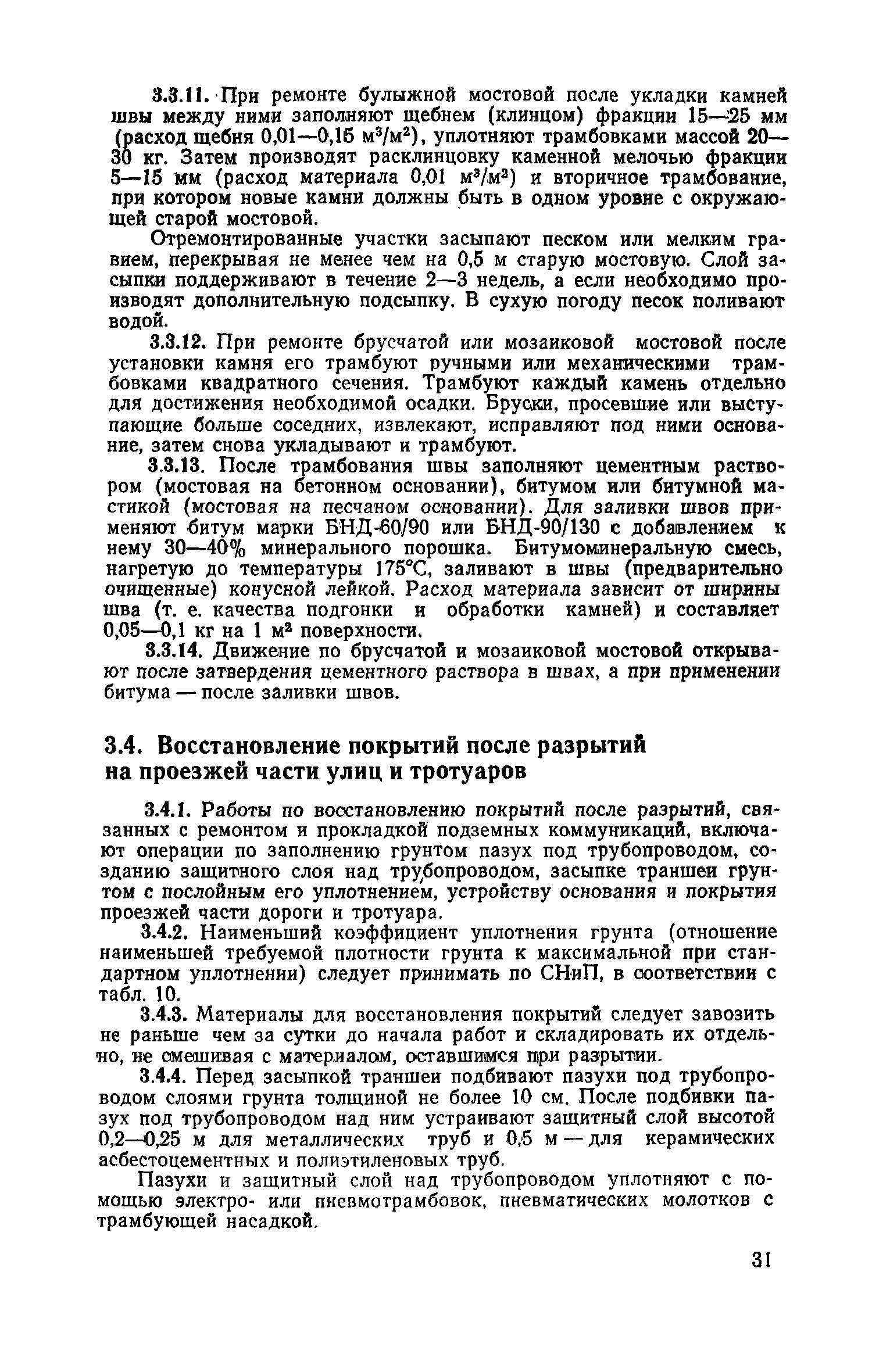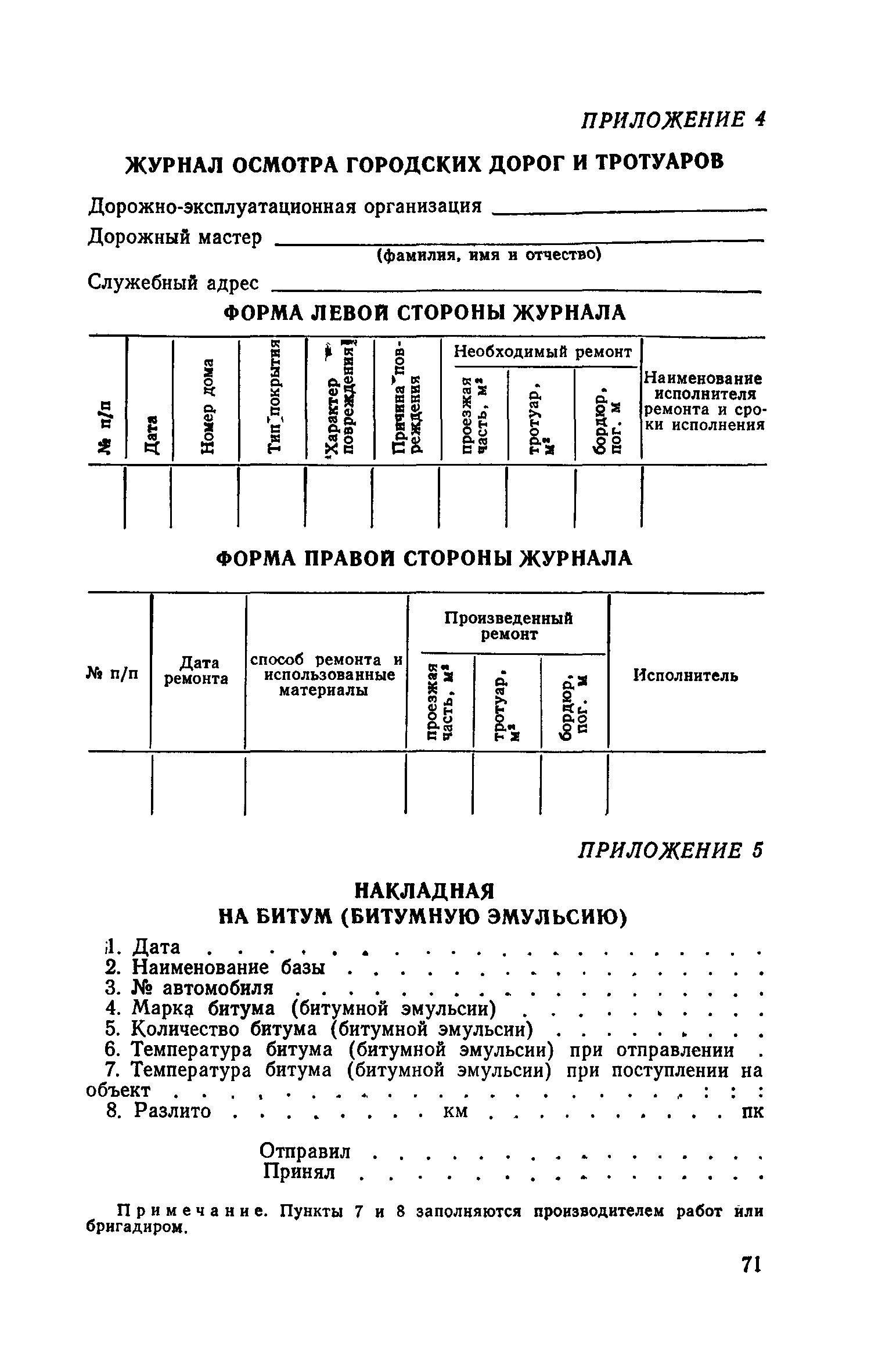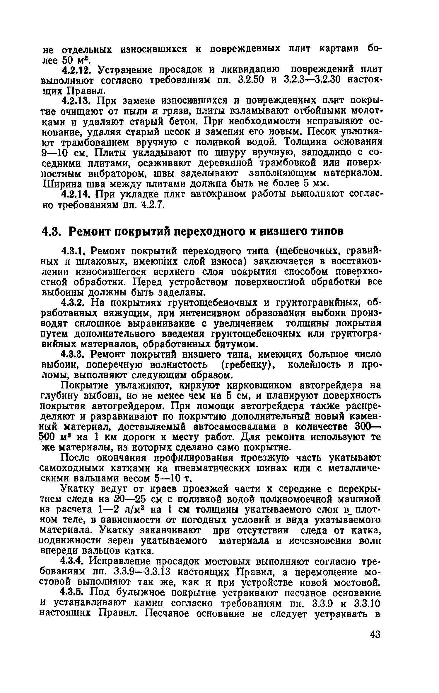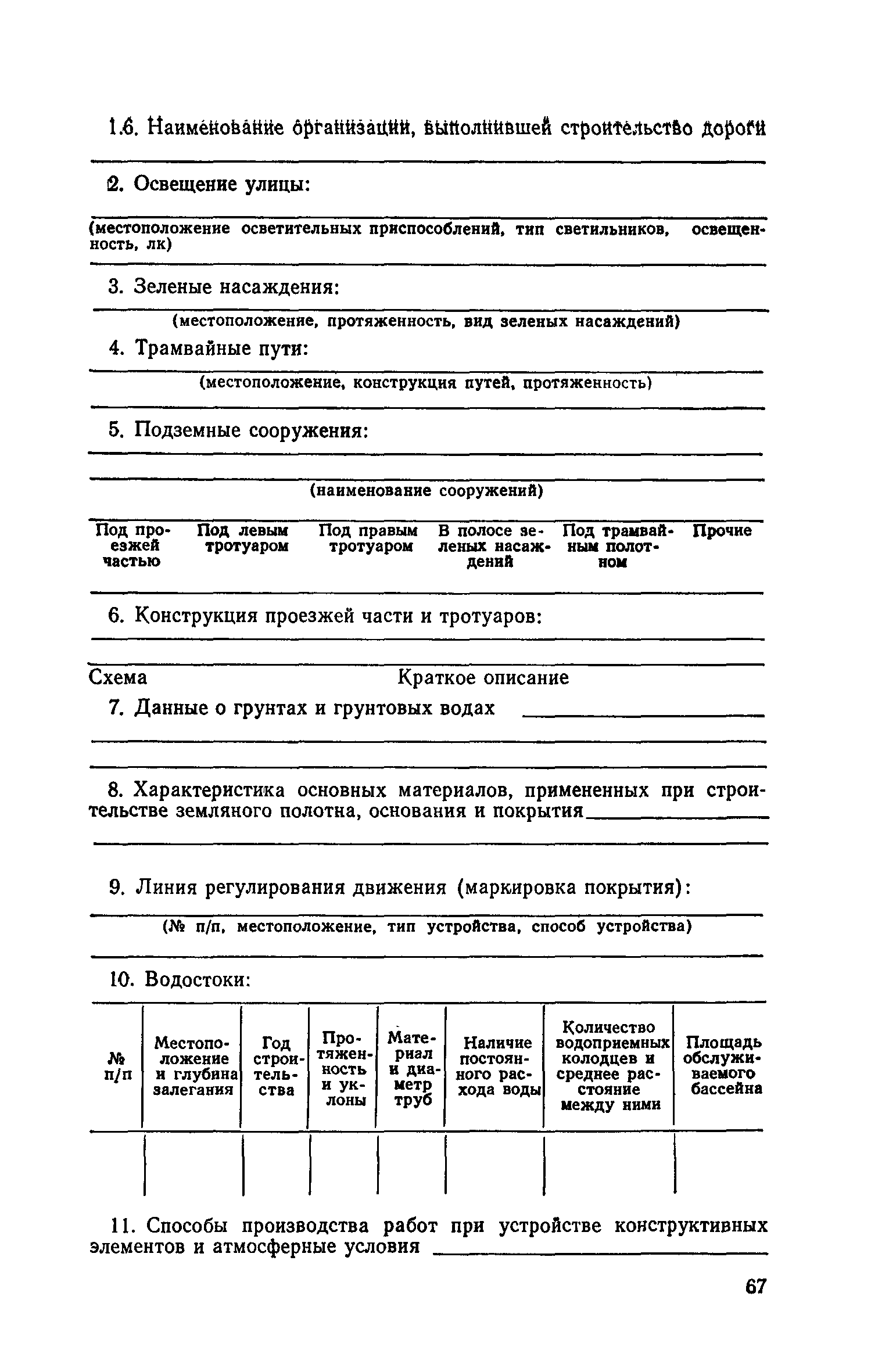| Оглавление: | 1. Классификация работ по содержанию и ремонту городских дорог 1.1 Общая часть 1.2 Номенклатура работ по содержанию и ремонту 1.3 Состав работ по содержанию и ремонту городских дорог 2. Содержание городских дорог 2.1 Общая часть 2.2 Содержание ливневой канализации 2.3 Обеспыливание покрытий переходного т низшего типов 2.4 Учет интенсивности движения городского транспорта 3. Текущий ремонт городских дорог 3.1 Ремонт асфальтобетонных покрытий 3.2 Ремонт цементобетонных покрытий 3.3 Ремонт покрытий переходного и низшего типов 3.4 Восстановление покрытий после разрытий на проезжей части улиц и тротуаров 3.5 Исправление дренажей 3.6 Ремонт бортовых камней 3.7 Ремонт ливневой канализации 4. Средний ремонт городских дорог 4.1 Ремонт асфальтобетонных покрытий 4.2 Ремонт цементобетонных покрытий 4.3 Ремонт покрытий переходного и низшего типов 4.4 Ремонт бортовых камней 4.5 Ремонт ливневой канализации 4.6 Ликвидация пучин 5. Машины и механизмы для содержания текущего и среднего ремонтов дорог, тротуаров, бортовых камней и ливневой канализации 6. Контроль качества содержания и ремонта городских дорог 6.1 Контроль качества при содержании городских дорог 6.2 Контроль качества при текущем ремонте городских дорог 6.3 Контроль качества среднего ремонта городских дорог 7. Основные правила техники безопасности производства работ по содержанию и ремонту городских дорог 7.1 Общая часть 7.2 Правила техники безопасности при работе с машинами, механизмами и механизированным инструментом 7.3 Правила техники безопасности при выполнении дорожных работ Приложение 1. Карточка учета движения Приложение 2. Журнал учета движения Приложение 3. Паспорт Приложение 4. Журнал осмотра городских дорог и тротуаров Приложение 5. Накладная на битум (битумную эмульсию) Приложение 6. Накладная на замес Приложение 7. Накладная на бетонную смесь Приложение 8. Ведомость промеров толщины, поперечных уклонов, ширины и ровности покрытия Приложение 9. Ведомость промеров толщины, поперечных уклонов, ширины и ровности основания под покрытие Приложение 10. Журнал контроля уплотнения грунта под основание дороги Приложение 11. Журнал качества укладки бетонной смеси Приложение 12. Журнал качества укладки асфальтобетонной смеси за смену |