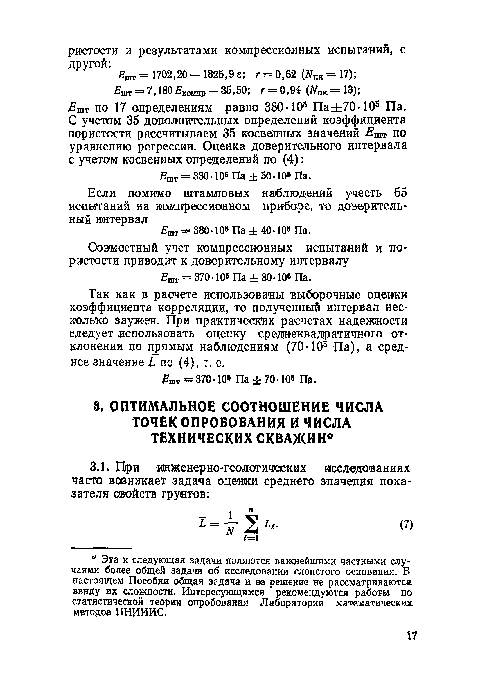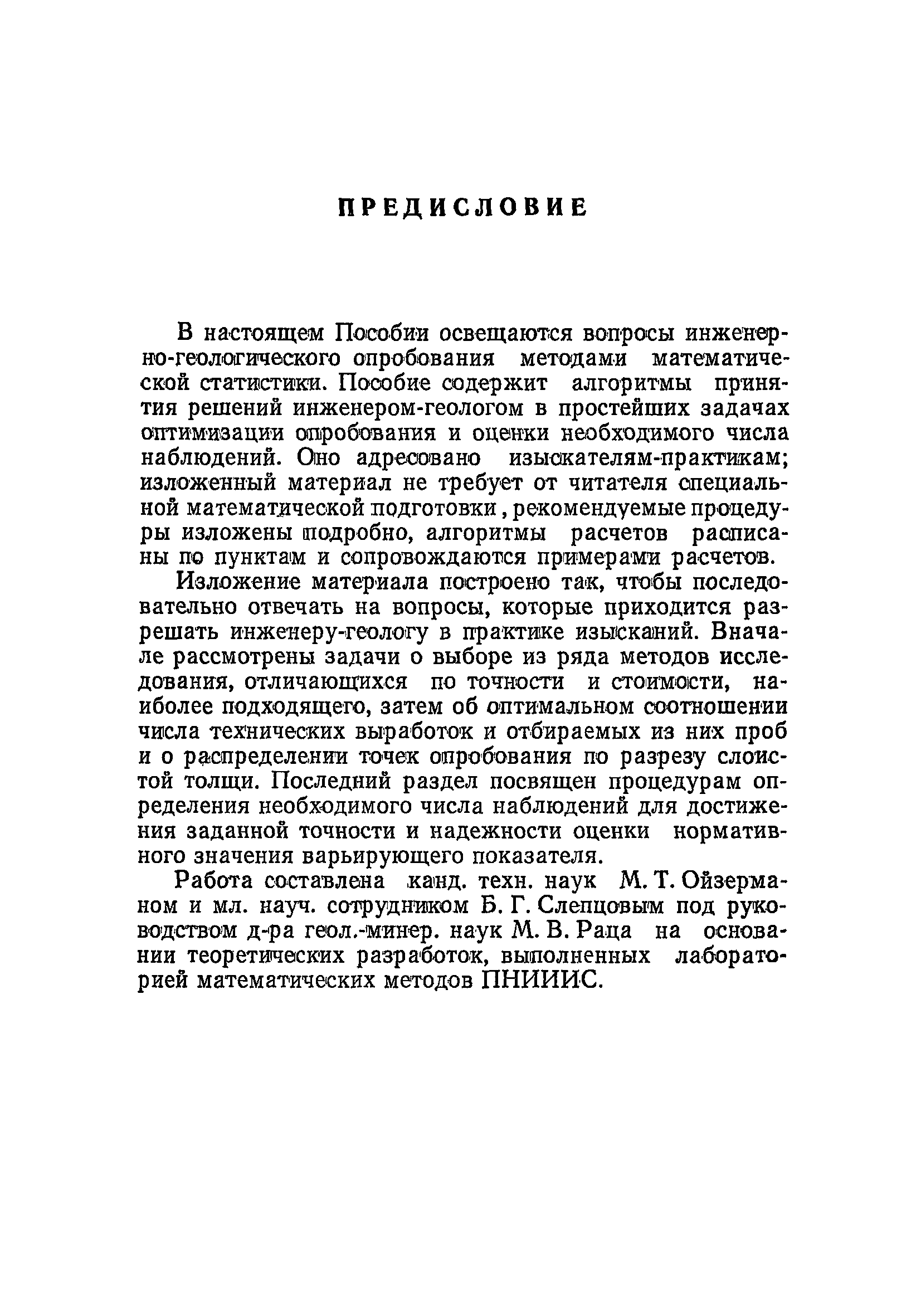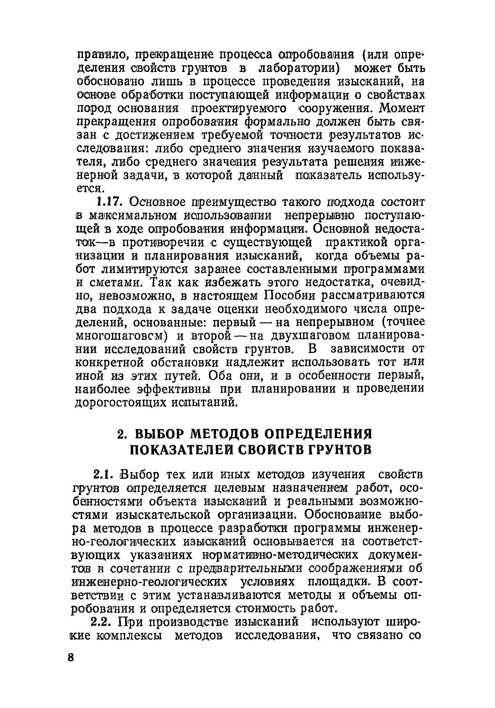 Пособие по расчетам опробования грунтов при инженерных изысканиях для строительства| Статус: | действует | | Название рус.: | Пособие по расчетам опробования грунтов при инженерных изысканиях для строительства | | Дата добавления в базу: | 01.09.2013 | | Дата актуализации: | 01.01.2021 | | Область применения: | Пособие содержит решения нескольких задач, относящихся к выбору наилучшего плана инженерно-геологического опробования грунтов: выбор метода исследования, оптимальное размещение точек опробования в слоистой толще и их концентрация в выработках, определение необходимого числа проб. Рекомендации, вытекающие из этих решений, рассчитаны на практическое применение инженерами-геологами на участках изысканий. | | Оглавление: | Предисловие 1. Общие положения 2. Выбор методов определения показателей свойств грунтов 3. Оптимальное соотношение числа точек опробования и числа технических скважин 4. Оптимальное размещение точек инженерно-геологического опробования между слоями основания при линейной расчетной схеме инженерной задачи 5. Определение необходимого числа проб при оценке среднего значения показателя Приложение. Расчет статистических параметров | | Разработан: | ПНИИИС Госстроя СССР (PNIIS, Gosstroy (USSR) )