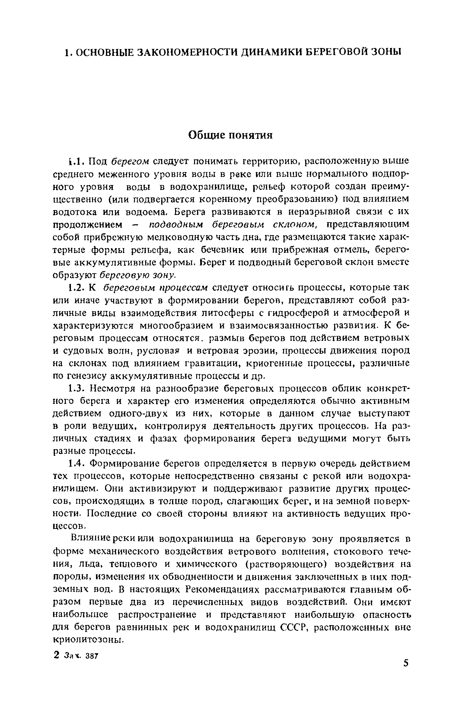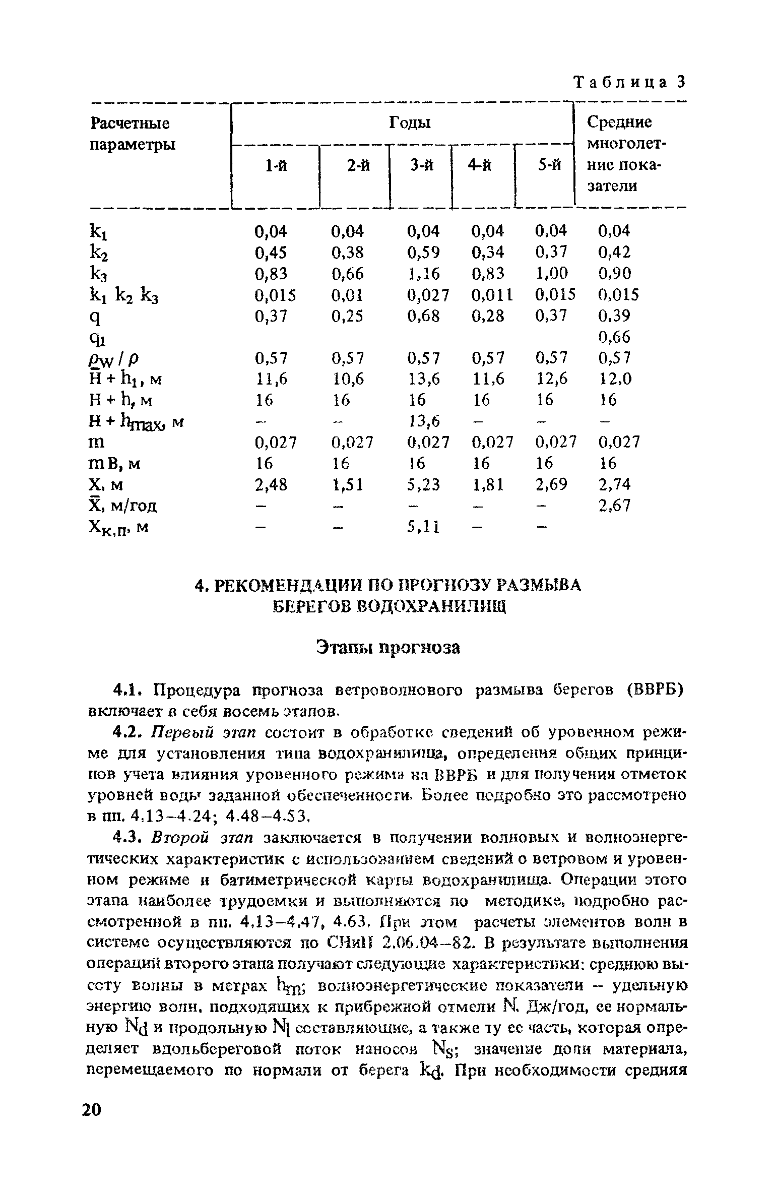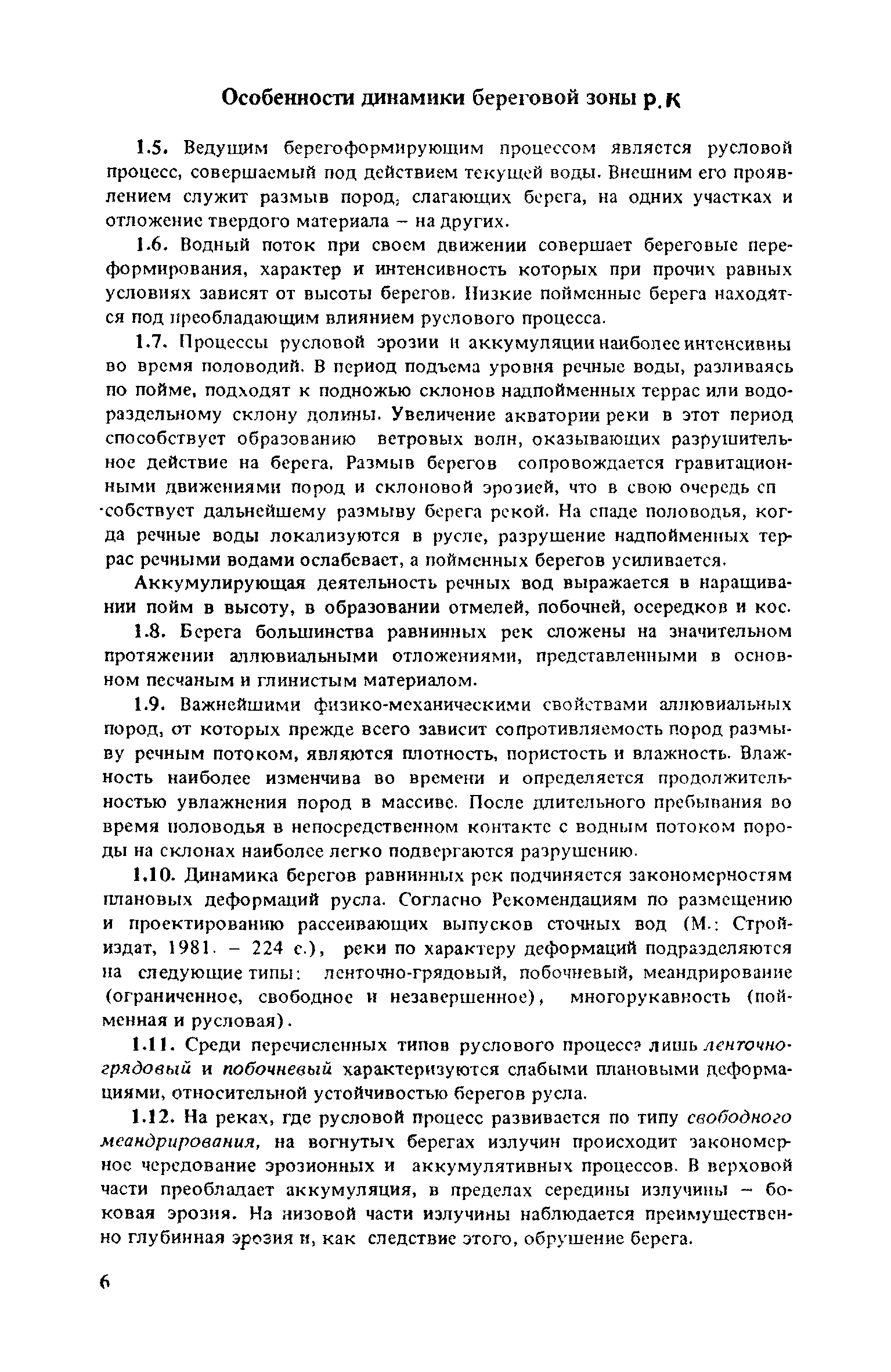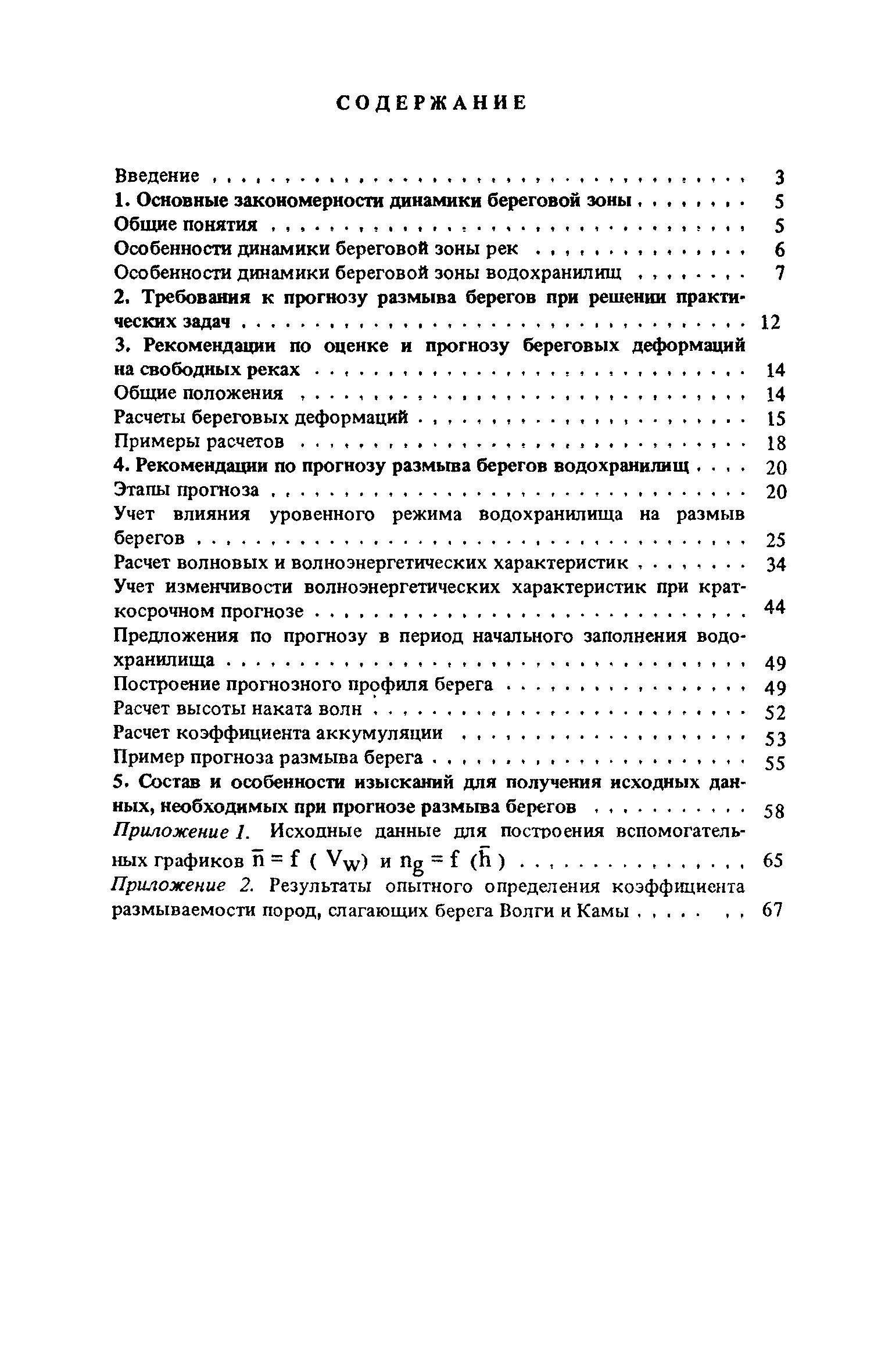 | Оглавление: | Введение 1. Основные закономерности динамики береговой зоны Общие понятия Особенности динамики береговой зоны рек Особенности динамики береговой зоны водохранилищ 2. Требования к прогнозу размыва берегов при решении практических задач 3. Рекомендации по оценке и прогнозу береговых деформаций на свободных реках Общие положения Расчеты береговых деформаций Примеры расчетов 4. Рекомендации по прогнозу размыва берегов водохранилищ Этапы прогноза Учет влияния уровенного режима водохранилища на размыв берегов Расчет волновых и волноэнергетических характеристик Учет изменчивости волноэнергетических характеристик при краткосрочном прогнозе Предложения по прогнозу в период начального заполнения водохранилища Построение прогнозного профиля берега Расчет высоты наката волн Расчет коэффициента аккумуляции Пример прогноза размыва берега 5. Состав и особенности изысканий для получения исходных данных, необходимых при прогнозе размыва берегов Приложение 1. Исходные данные для построения вспомогательных графиков Приложение 2. Результаты опытного определения коэффициента размываемости пород, слагающих берега Волги и Камы |