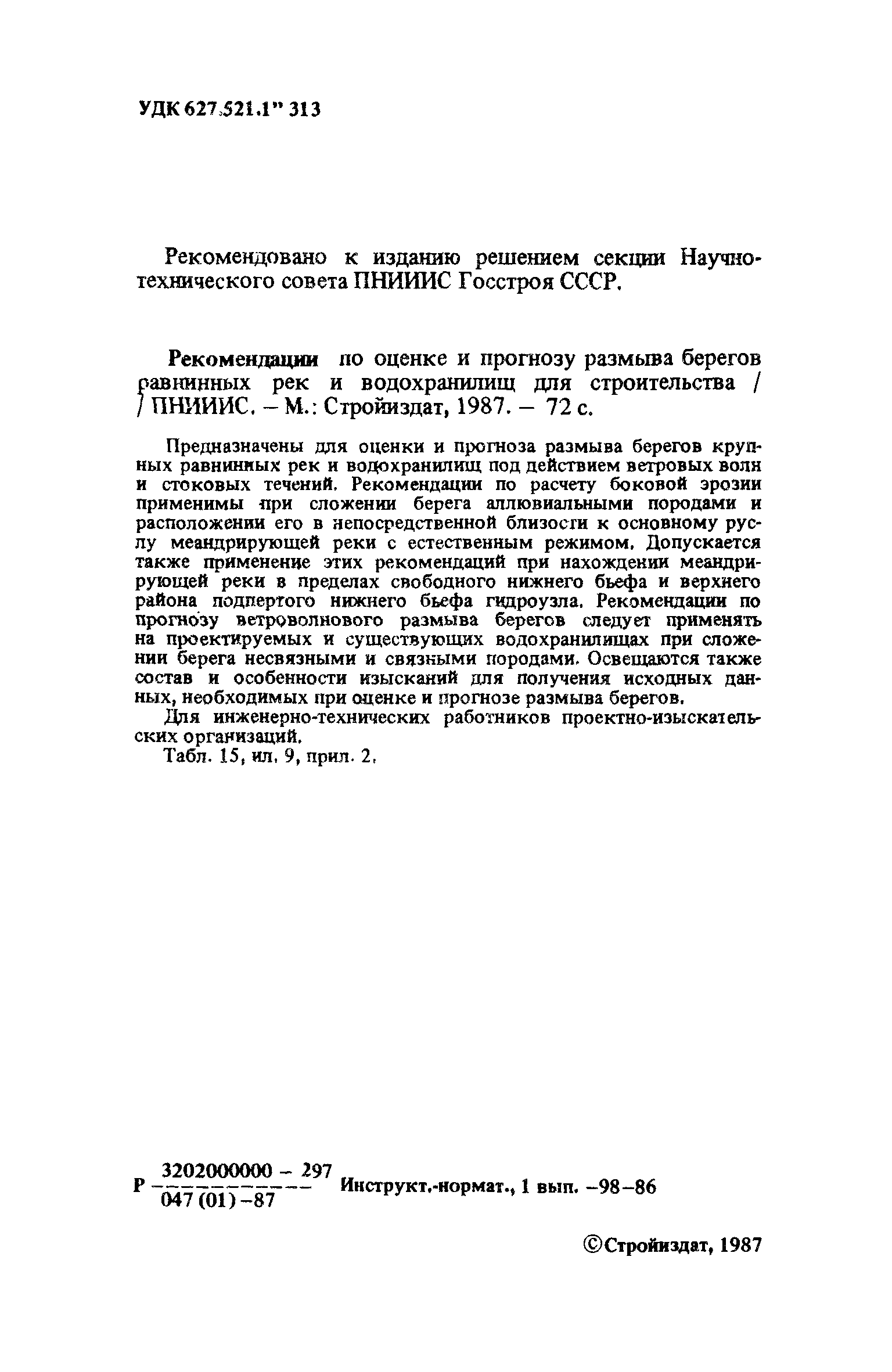 | Название рус.: | Рекомендации по оценке и прогнозу размыва берегов равнинных рек и водохранилищ для строительства |