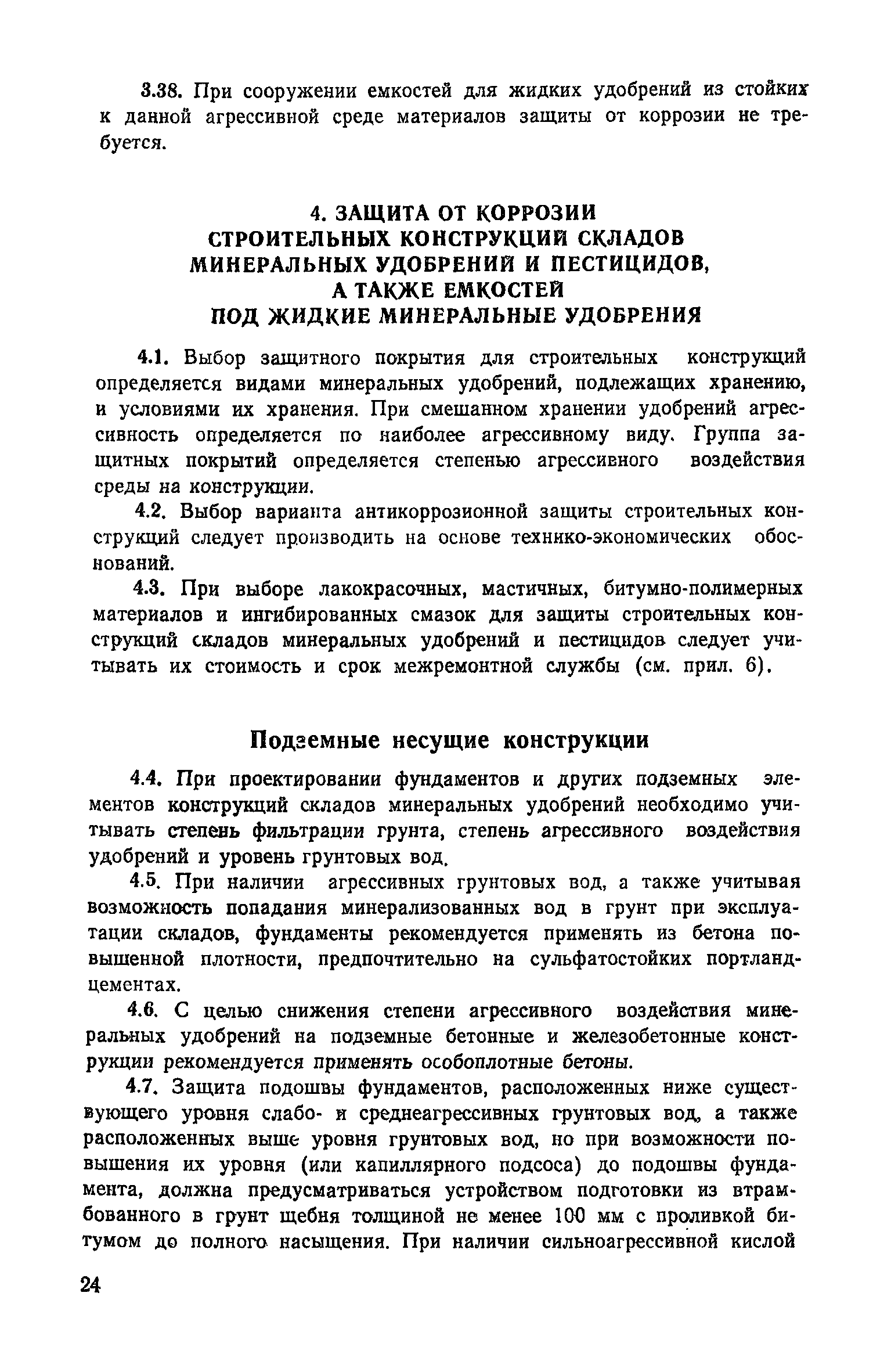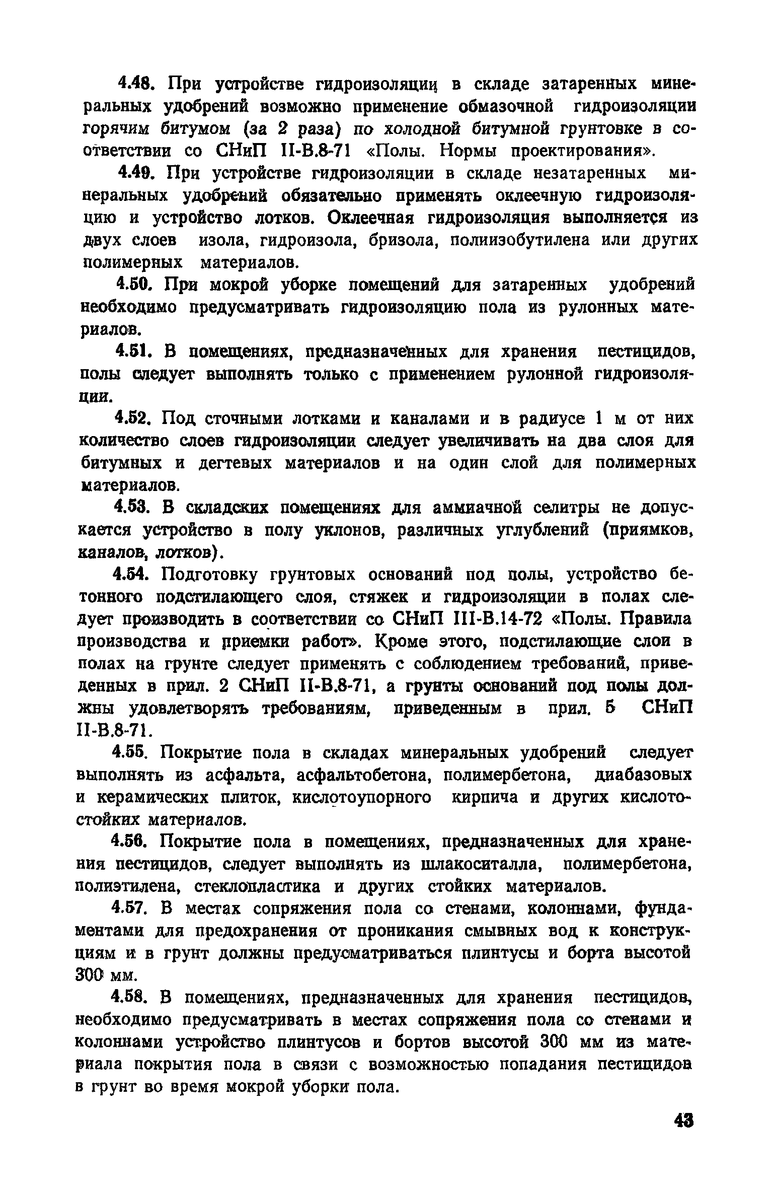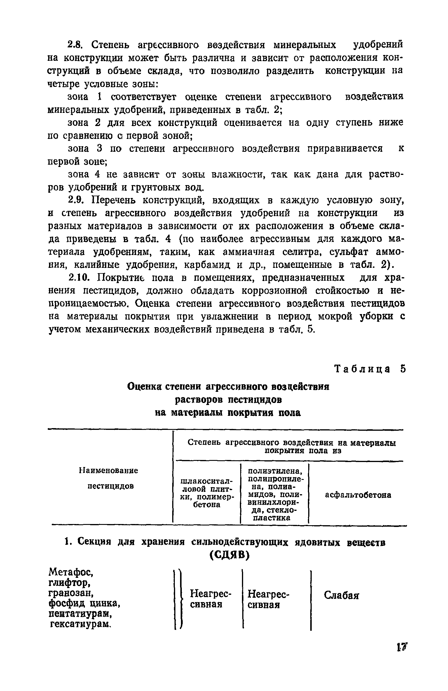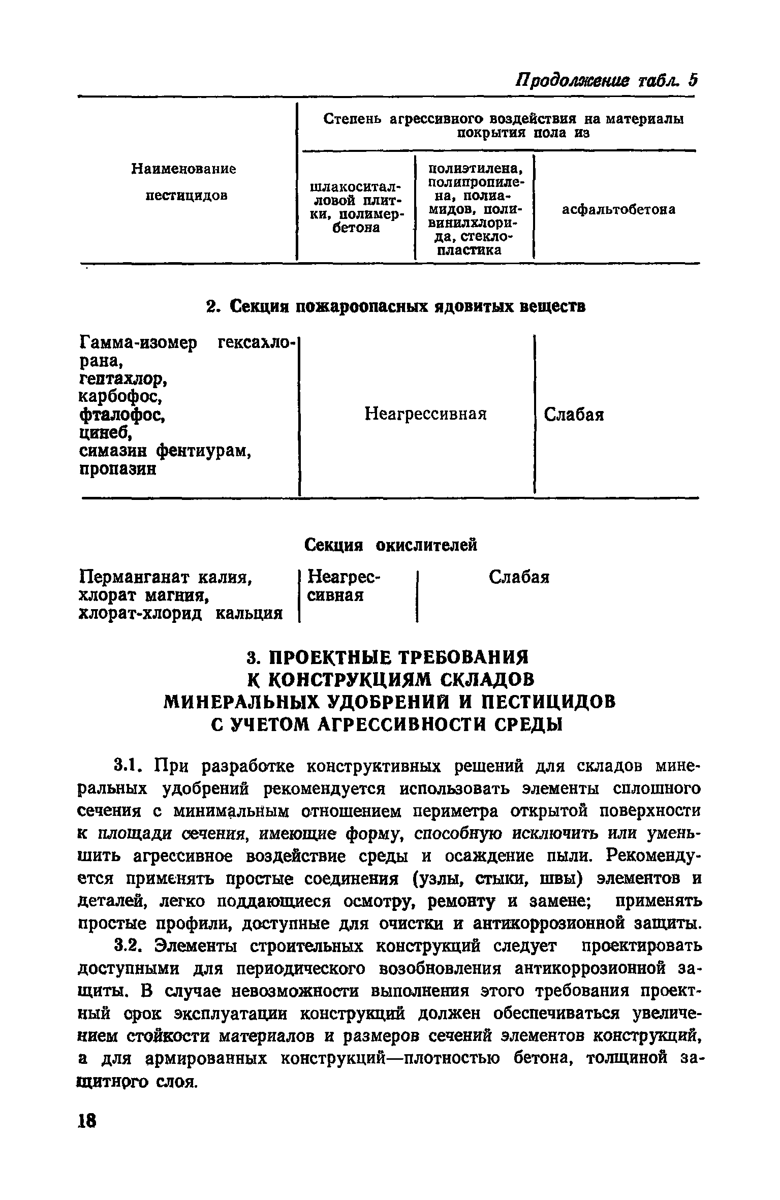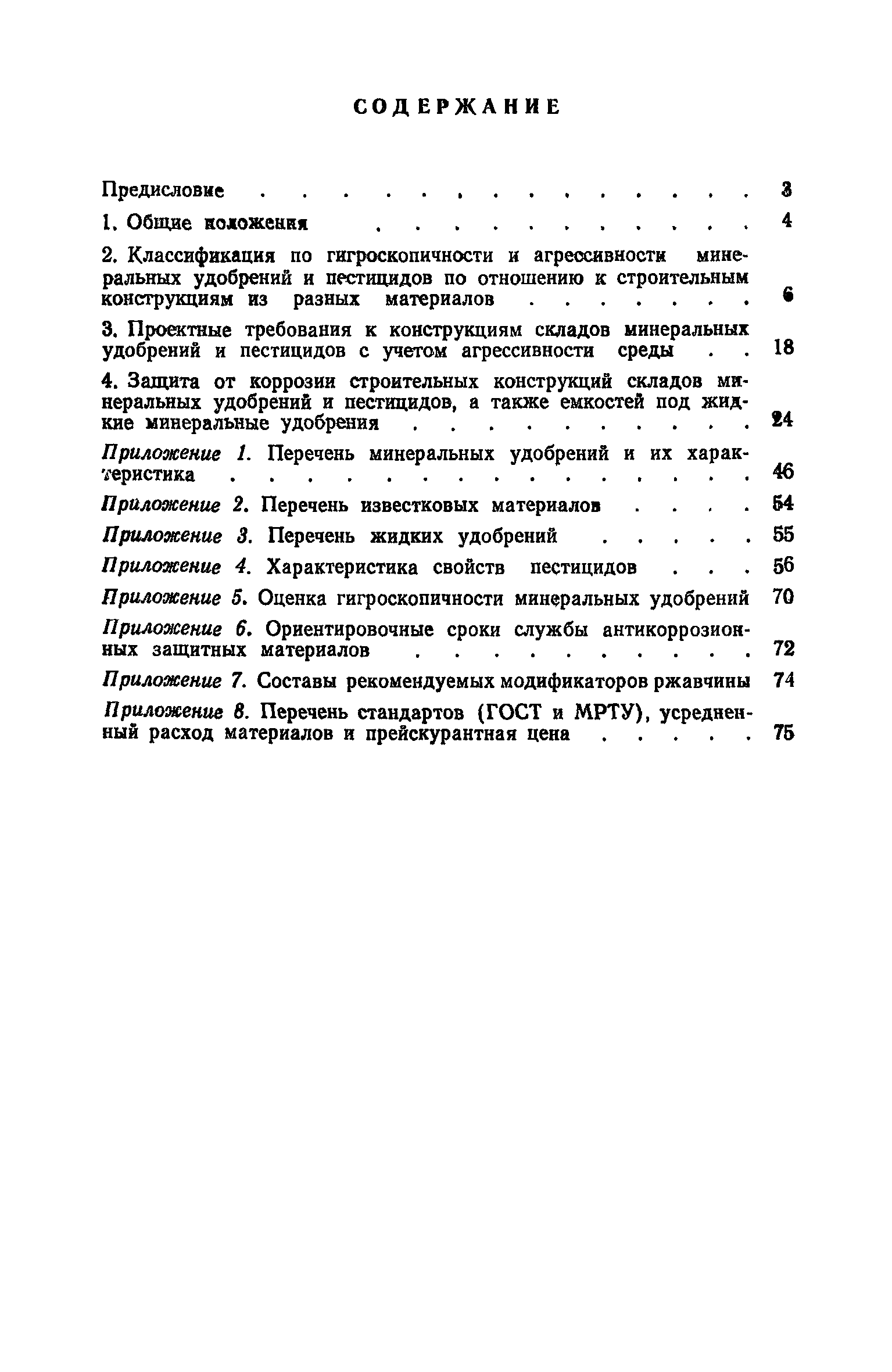 | Оглавление: | Предисловие 1. Общие положения 2. Классификация по гигроскопичности и агрессивности минеральных удобрений и пестицидов по отношению к строительным конструкциям из разных материалов 3. Проектные требования к конструкциям складов минеральных удобрений и пестицидов с учетом агрессивности среды 4. Защита от коррозии строительных конструкций складов минеральных удобрений и пестицидов, а также емкостей под жидкие минеральные удобрения Приложение 1. Перечень минеральных удобрений и их характеристика Приложение 2. Перечень известковых материалов Приложение 3. Перечень жидких удобрений Приложение 4. Характеристика свойств пестицидов Приложение 5. Оценка гигроскопичности минеральных удобрений Приложение 6. Ориентировочные сроки службы антикоррозионных защитных материалов Приложение 7. Составы рекомендуемых модификаторов ржавчины Приложение 8. Перечень стандартов (ГОСТ и МРТУ), усредненный расход материалов и прейскурантная цена |