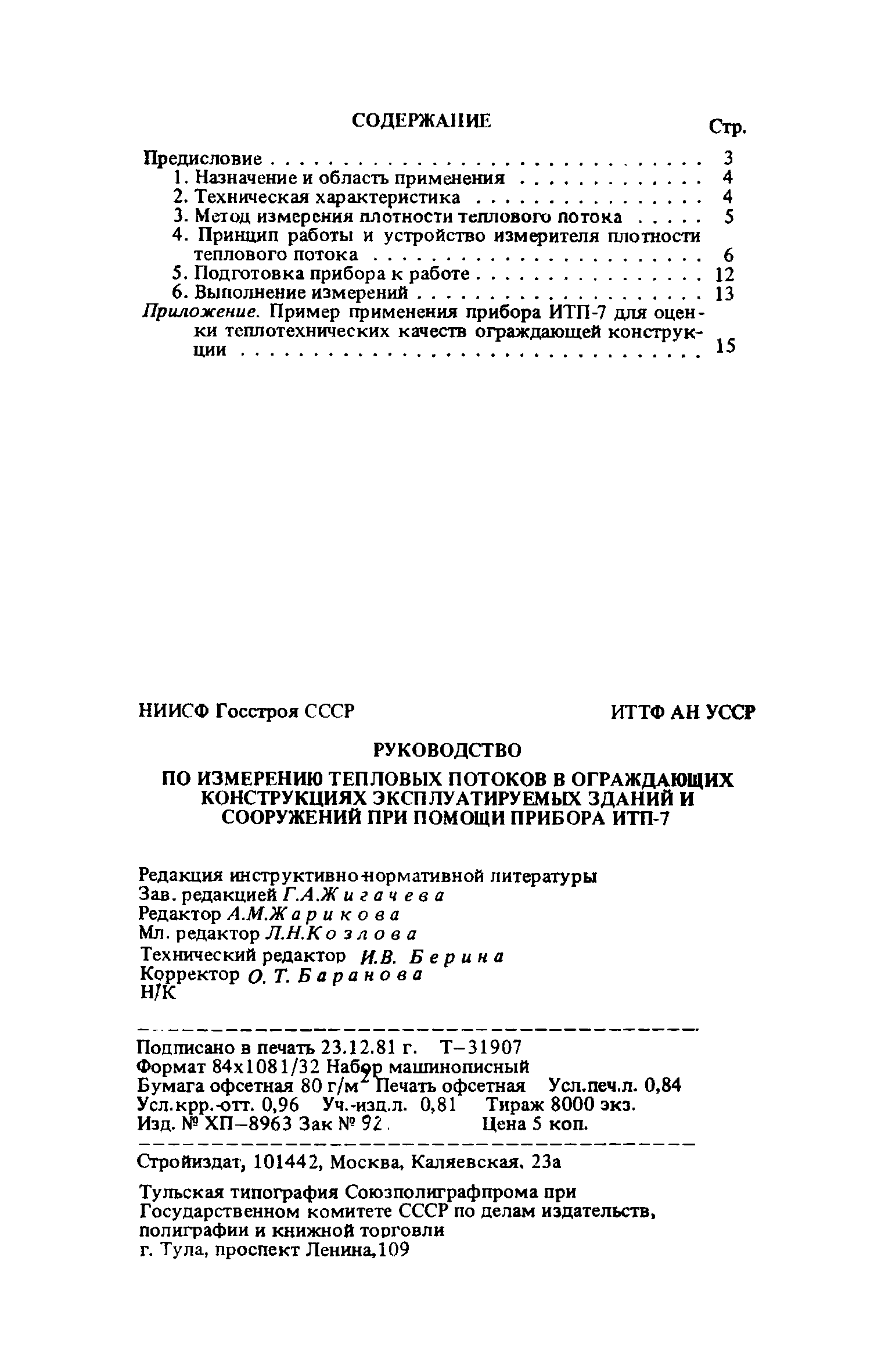 | Оглавление: | Предисловие 1. Назначение и область применения 2. Техническая характеристика 3. Метод измерения плотности теплового потока 4. Принцип работы и устройство измерителя плотности теплового потока 5. Подготовка прибора к работе 6. Выполнение измерений Приложение. Пример применения прибора ИТП-7 для оценки теплотехнических качеств ограждающей конструкции |