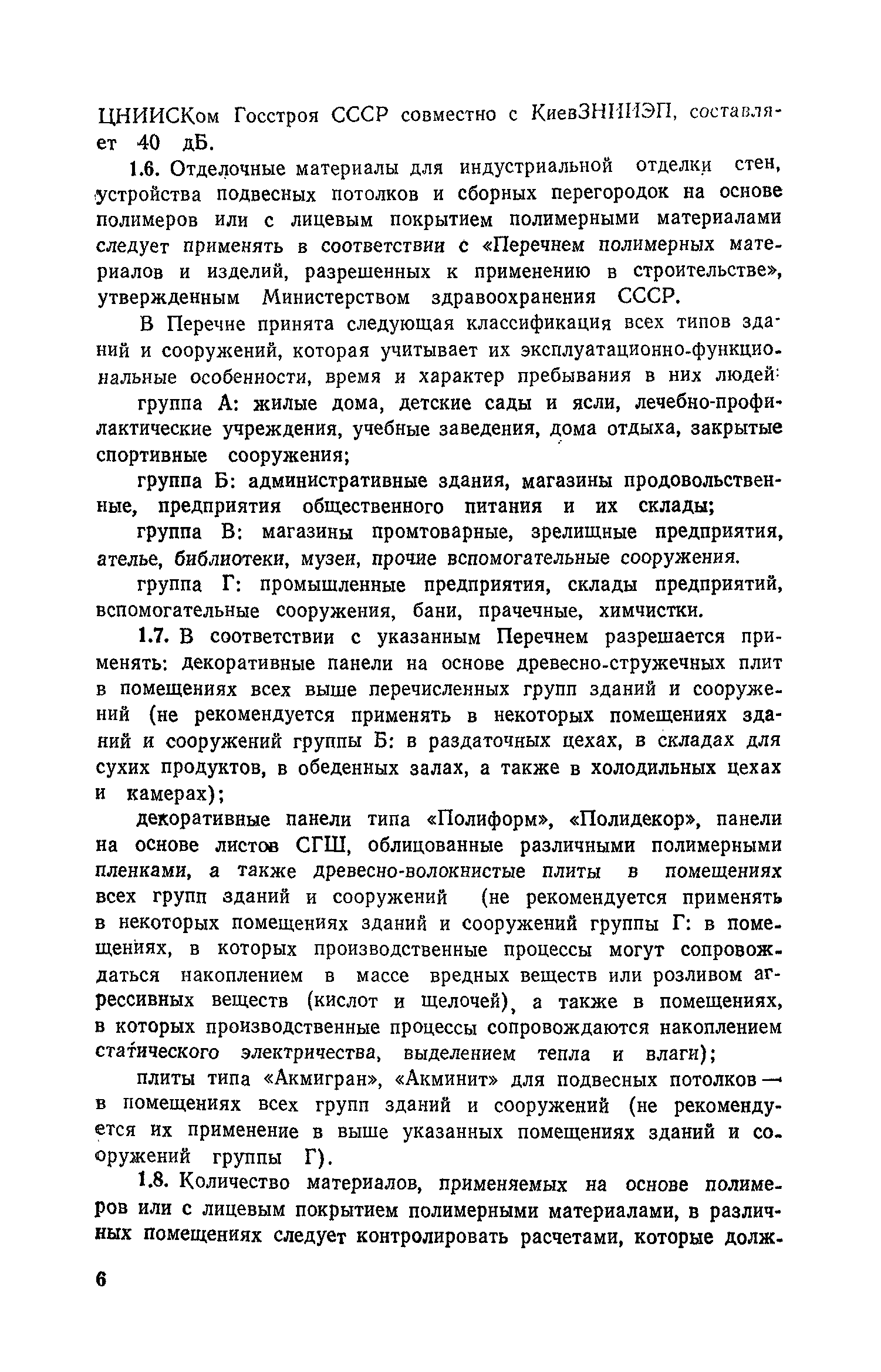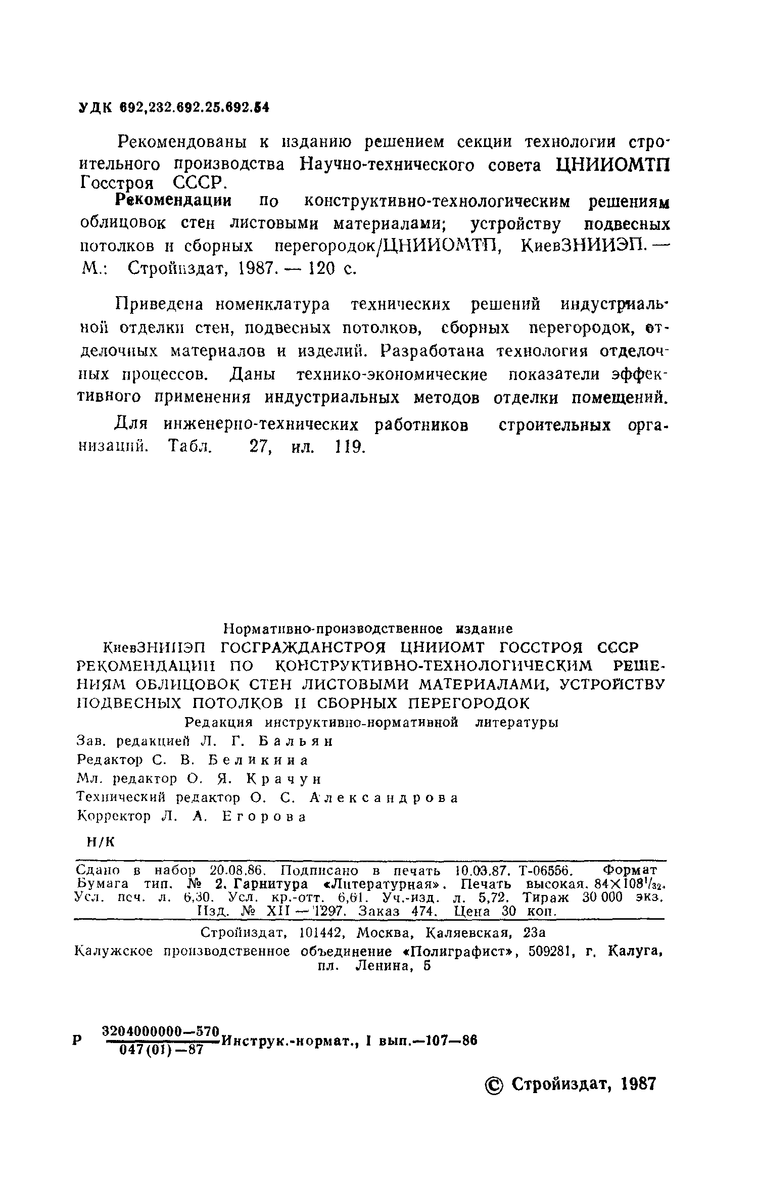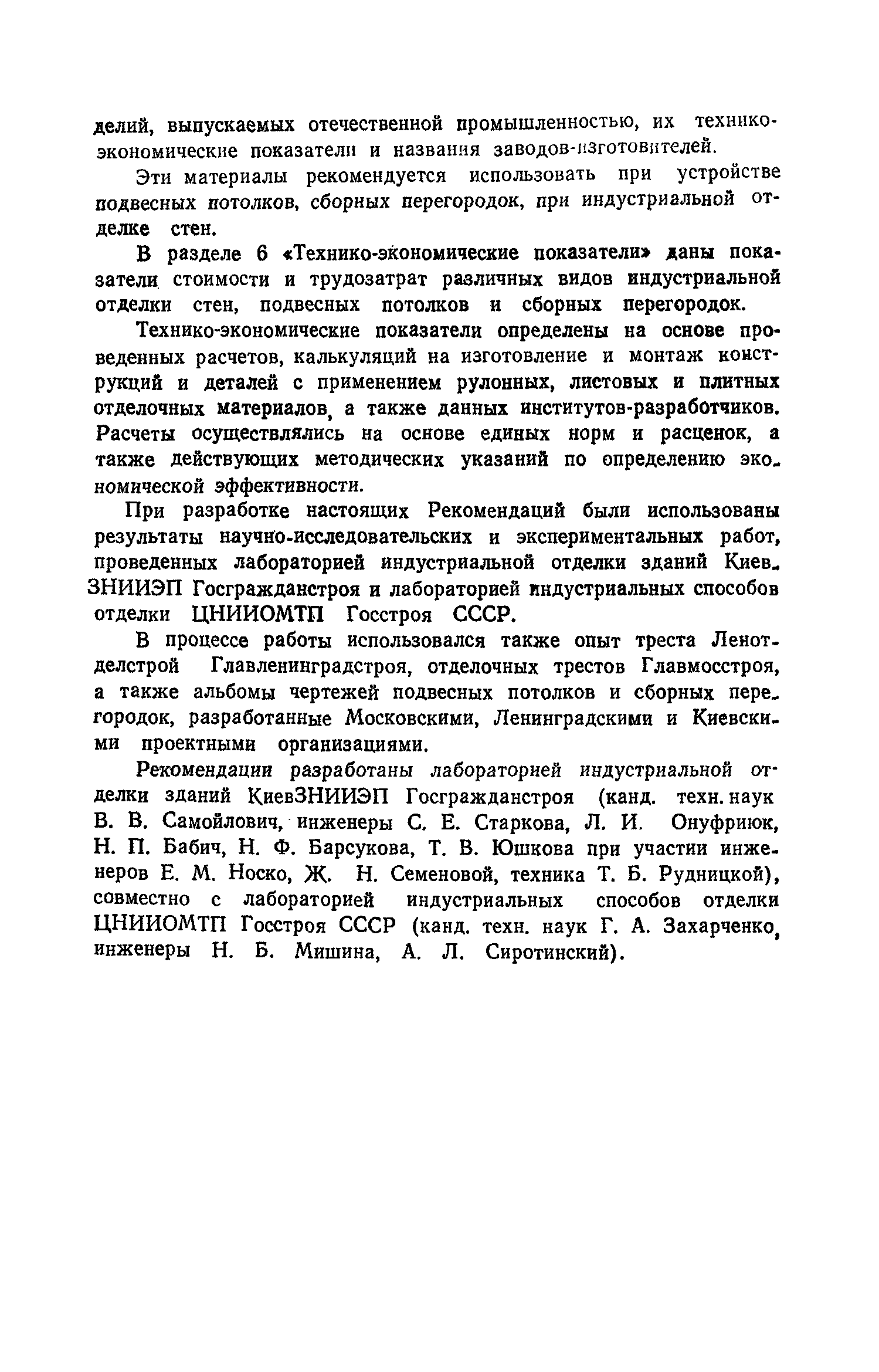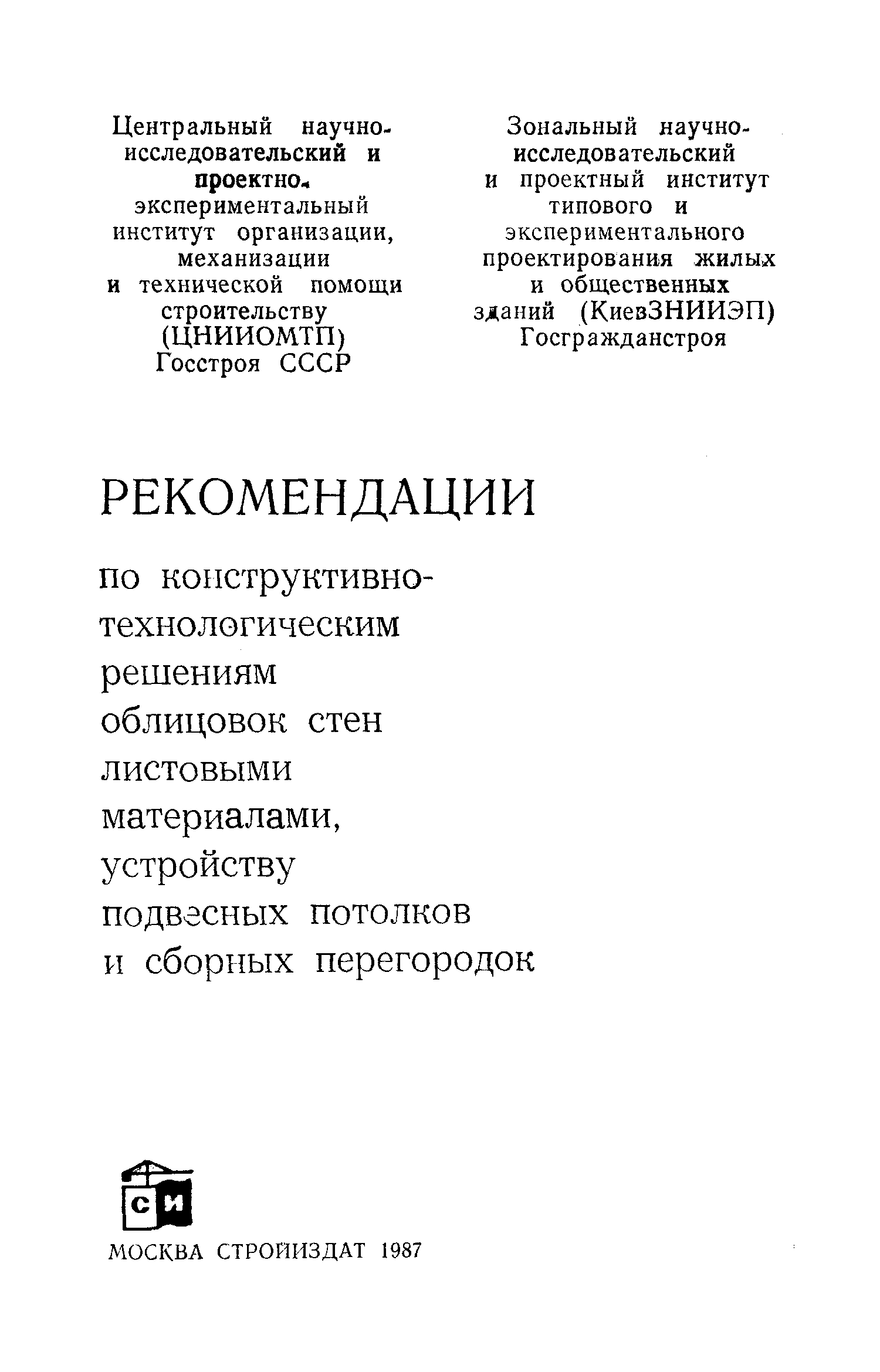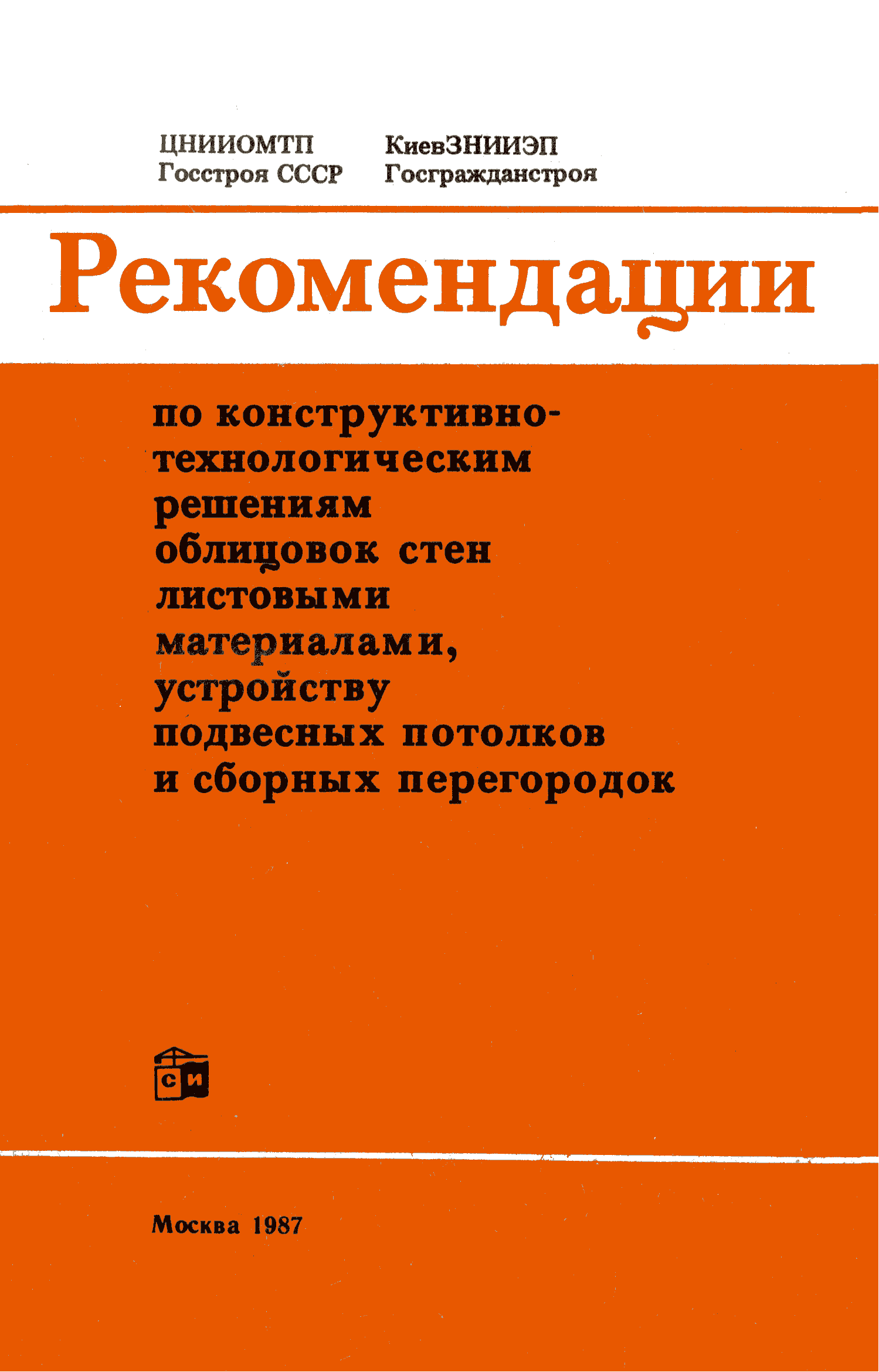 Рекомендации по конструктивно-технологическим решениям облицовок стен листовыми материалами, устройству подвесных потолков и сборных перегородок| Статус: | действует | | Название рус.: | Рекомендации по конструктивно-технологическим решениям облицовок стен листовыми материалами, устройству подвесных потолков и сборных перегородок | | Дата добавления в базу: | 01.09.2013 | | Дата актуализации: | 01.01.2021 | | Область применения: | В документе приведена номенклатура технических решений индустриальной отделки стен, подвесных потолков, сборных перегородок, отделочных материалов и изделий. Разработана технология отделочных процессов. Даны технико-экономические показатели эффективного применения индустриальных ме | | Оглавление: | Предисловие 1. Область применения 2. Технология производства работ Отделка стен Устройство подвесных потолков Устройство сборных перегородок Техника безопасности 3. Номенклатура технических решений 4. Технические решения Индустриальная отделка стен Подвесные потолки Сборные перегородки 5. Номенклатура материалов и изделий 6. Технико-экономические показатели | | Разработан: | КиевЗНИИЭП Госгражданстроя ЦНИИОМТП