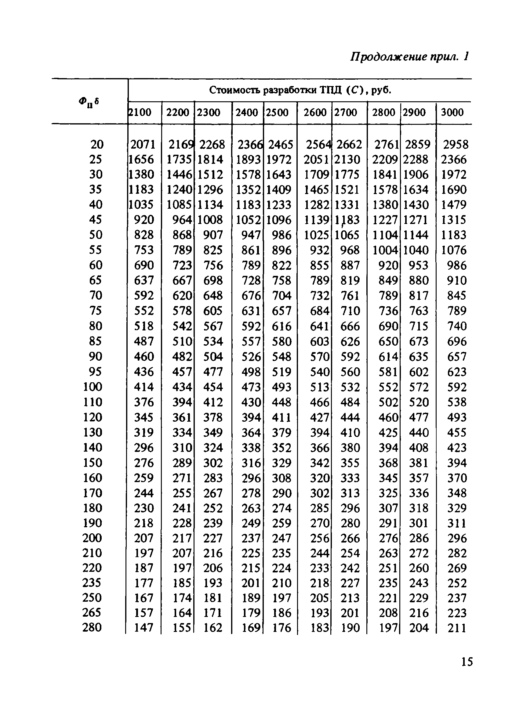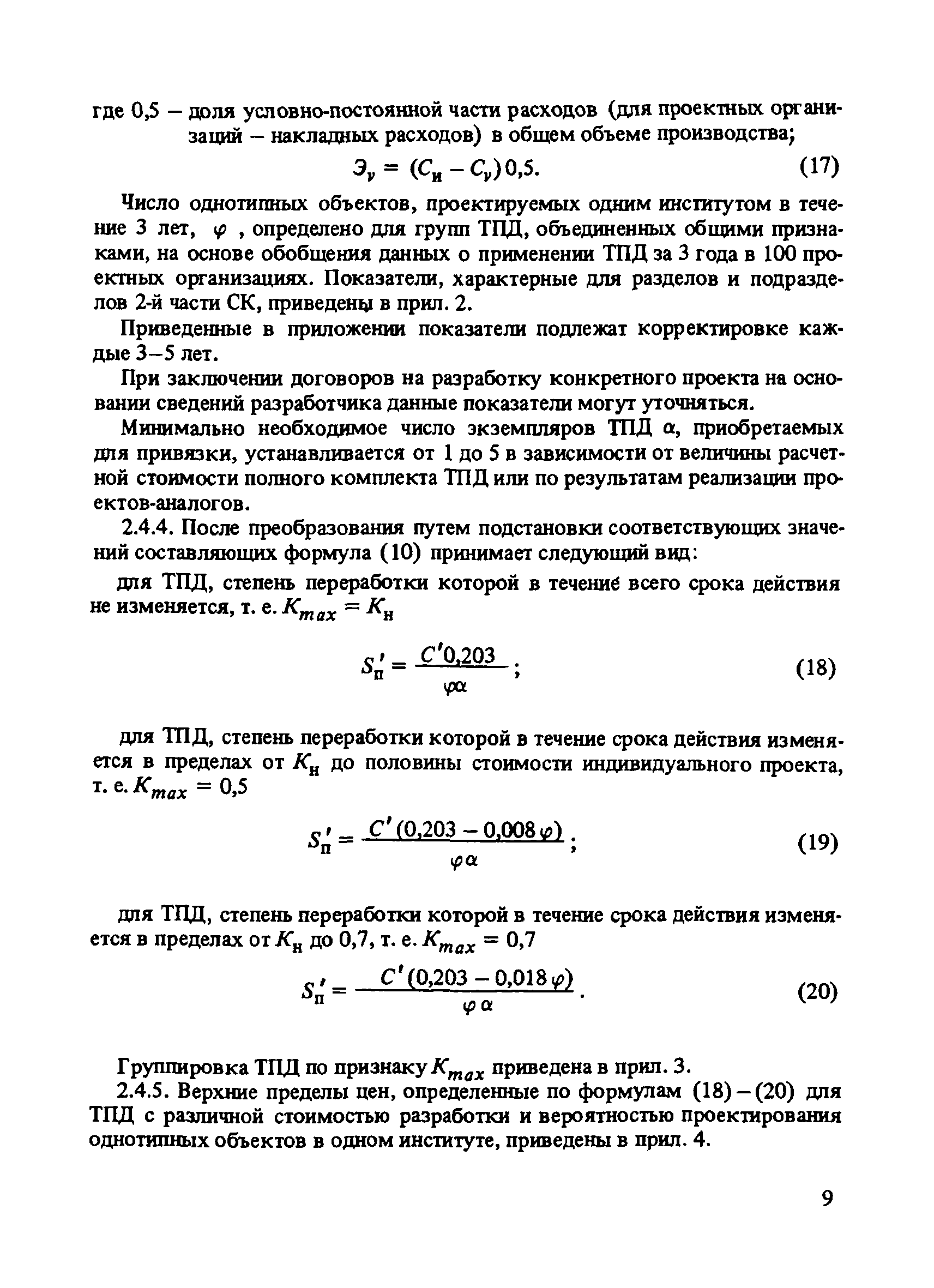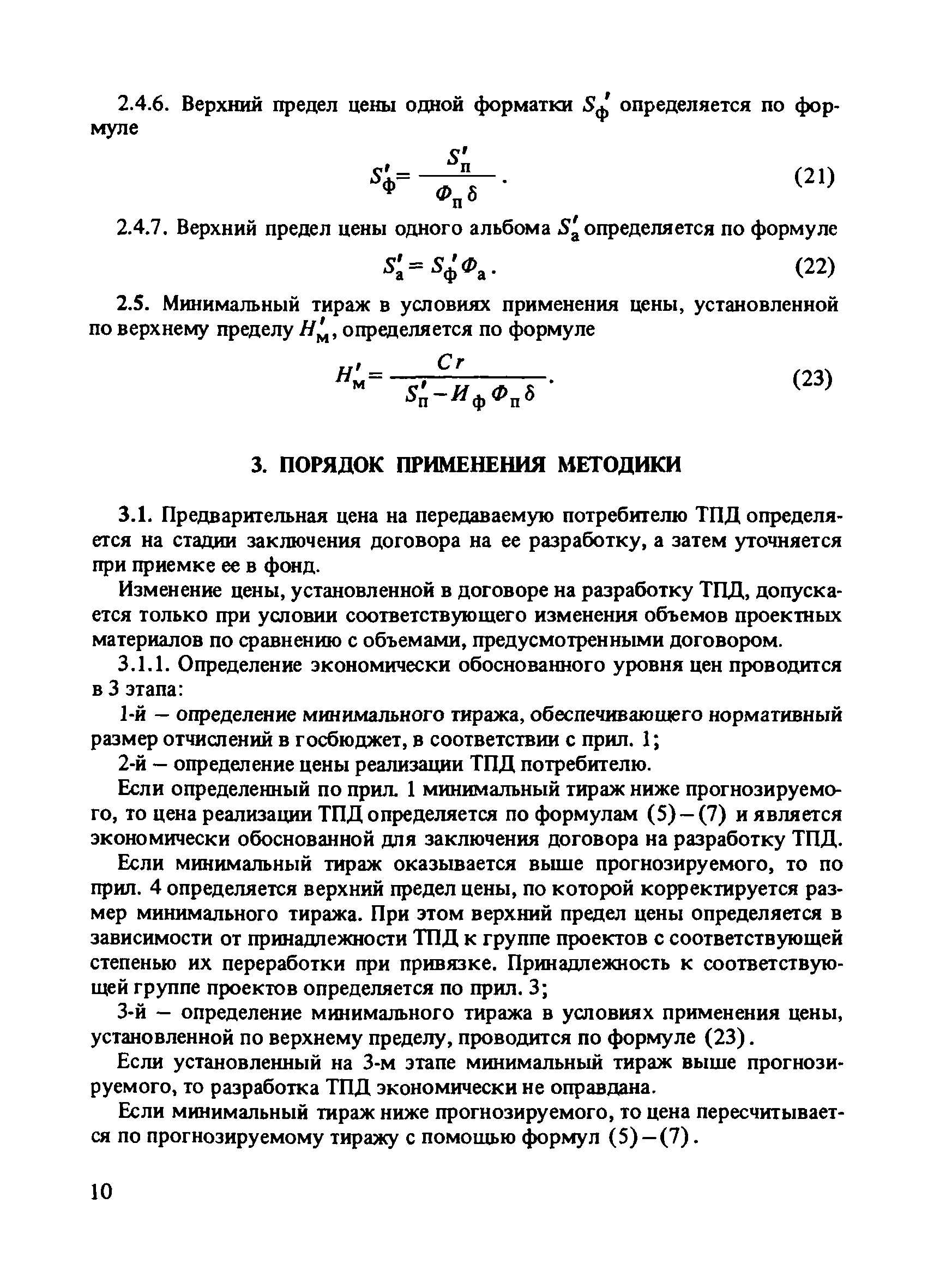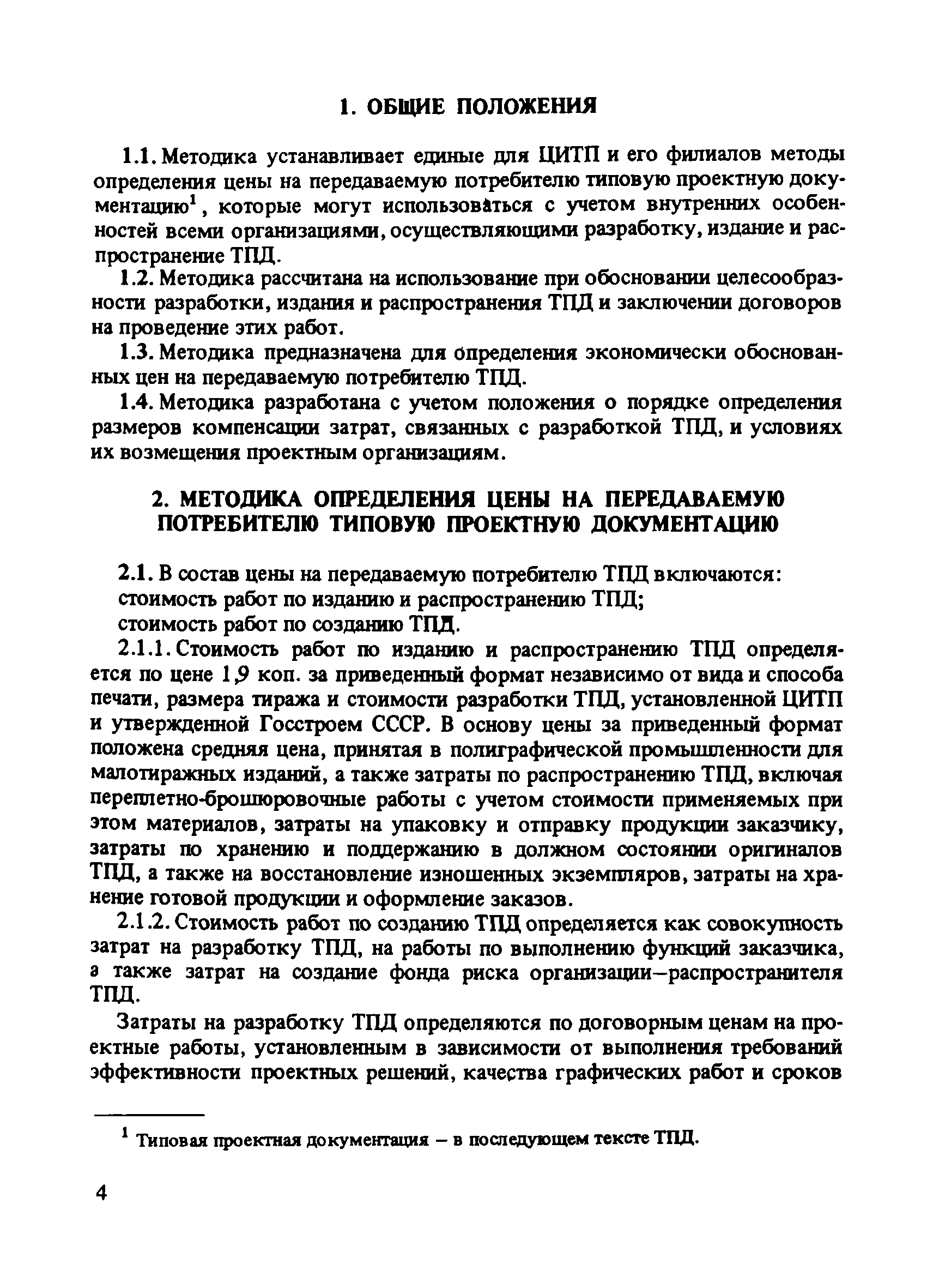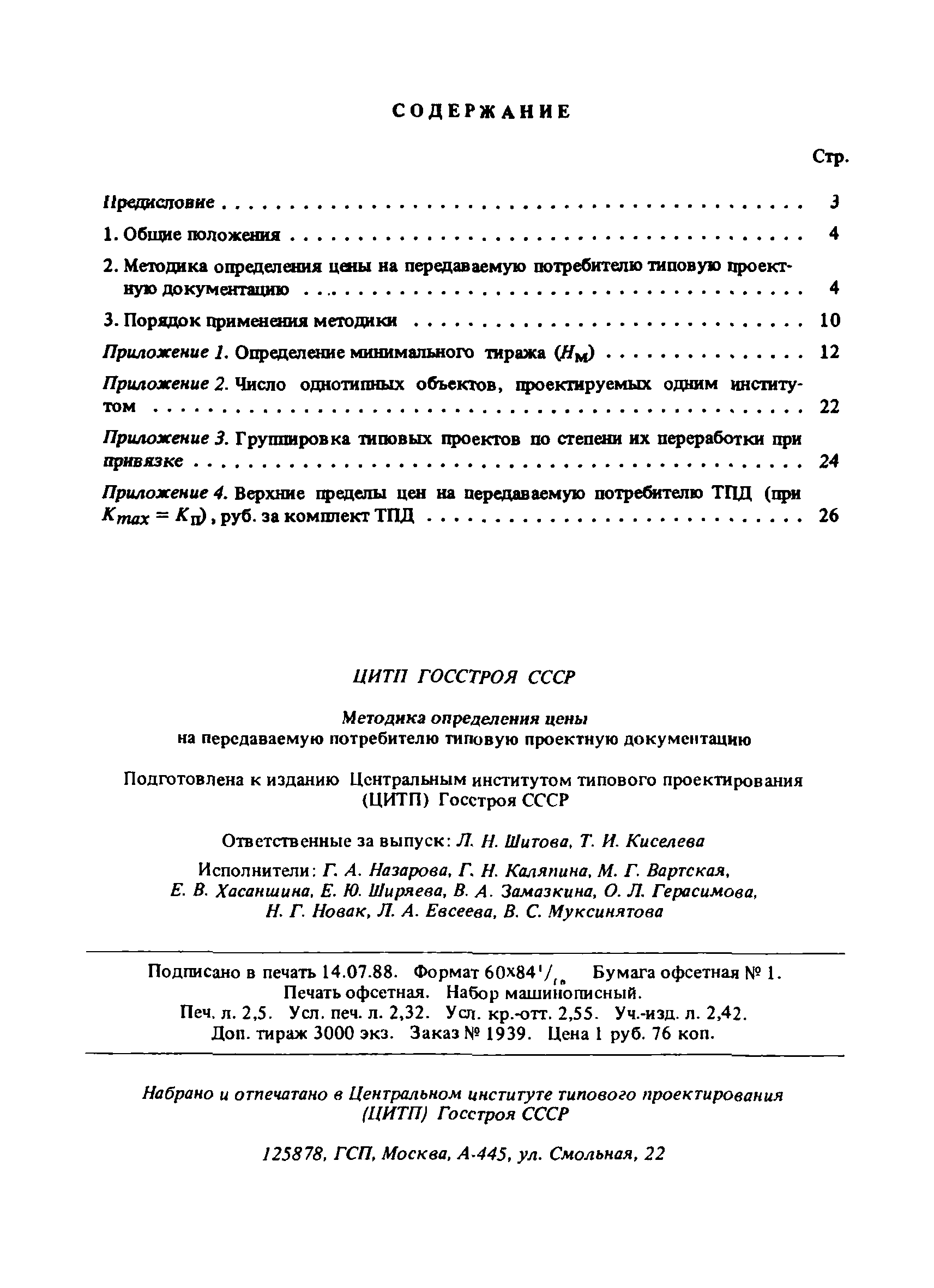 | Оглавление: | Предисловие 1. Общие положения 2. Методика определения цены на передаваемую потребителю типовую проектную документацию 3. Порядок применения методики Приложение 1. Определение минимального тиража (Нм) Приложение 2. Число однотипных объектов, проектируемых одним институтом Приложение 3. Группировка типовых проектов по степени их переработки при привязке Приложение 4. Верхние пределы цен на передаваемую потребителю ТПД (при Кmax = Кп), руб. за комплект ТПД |