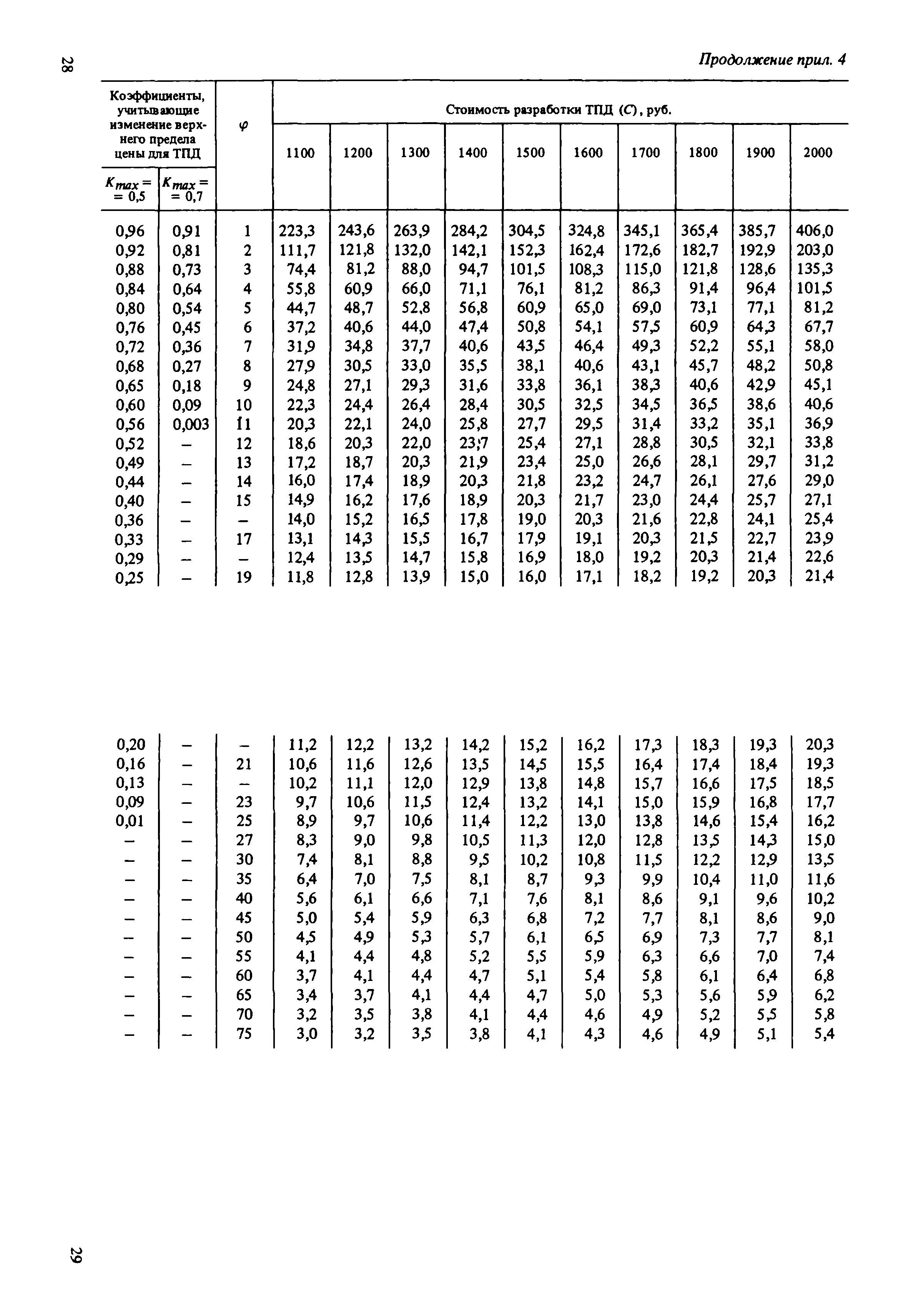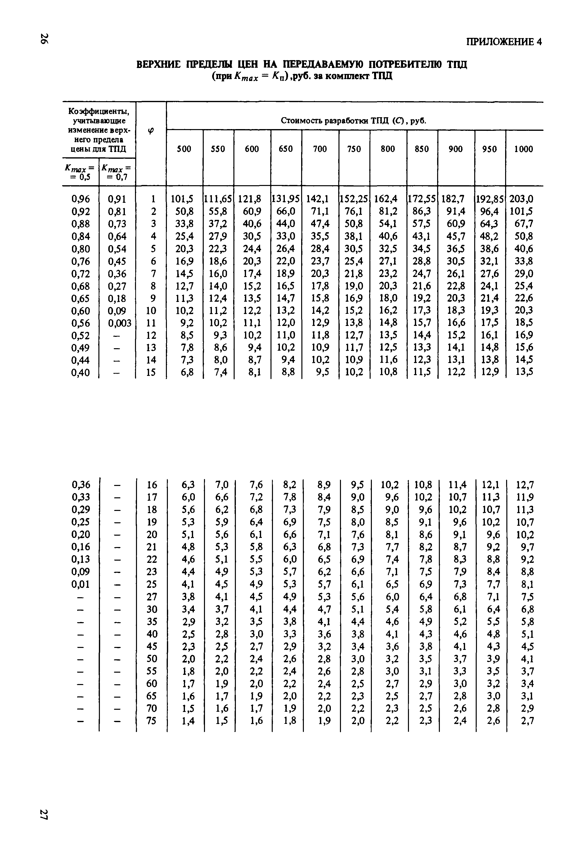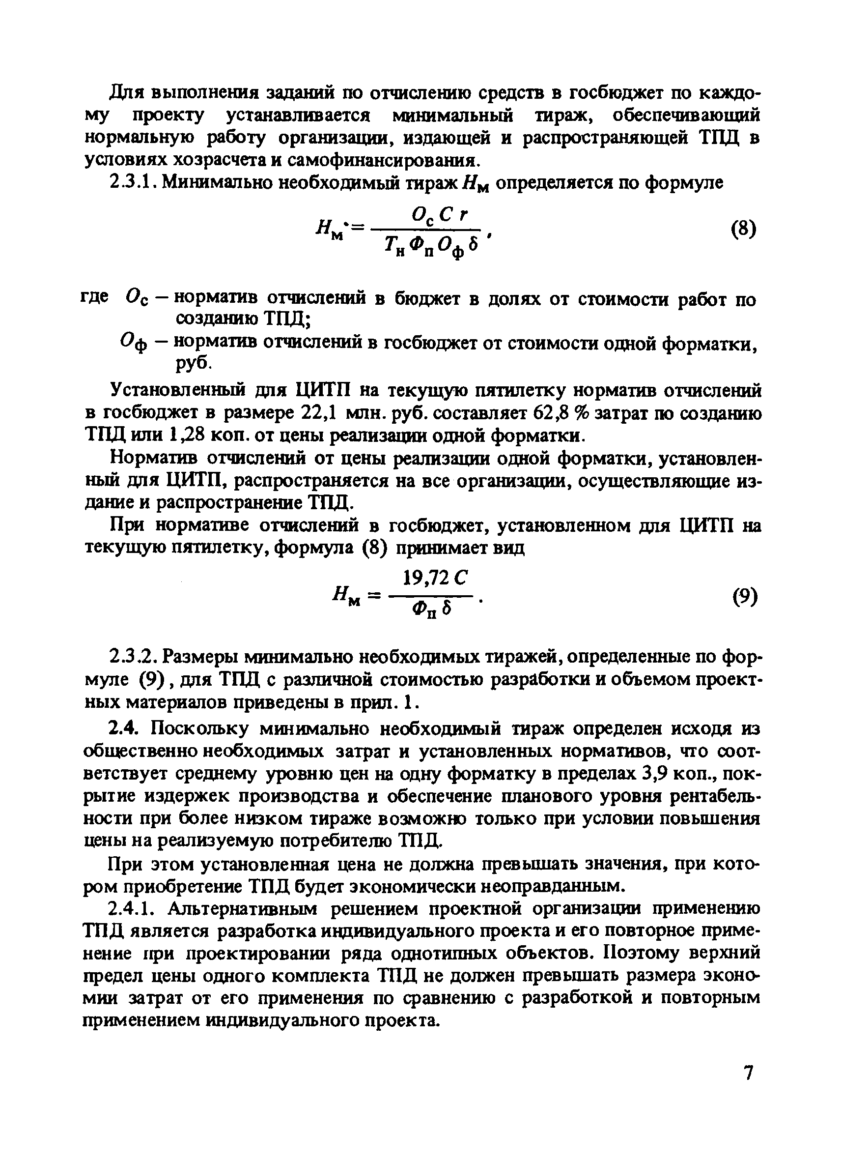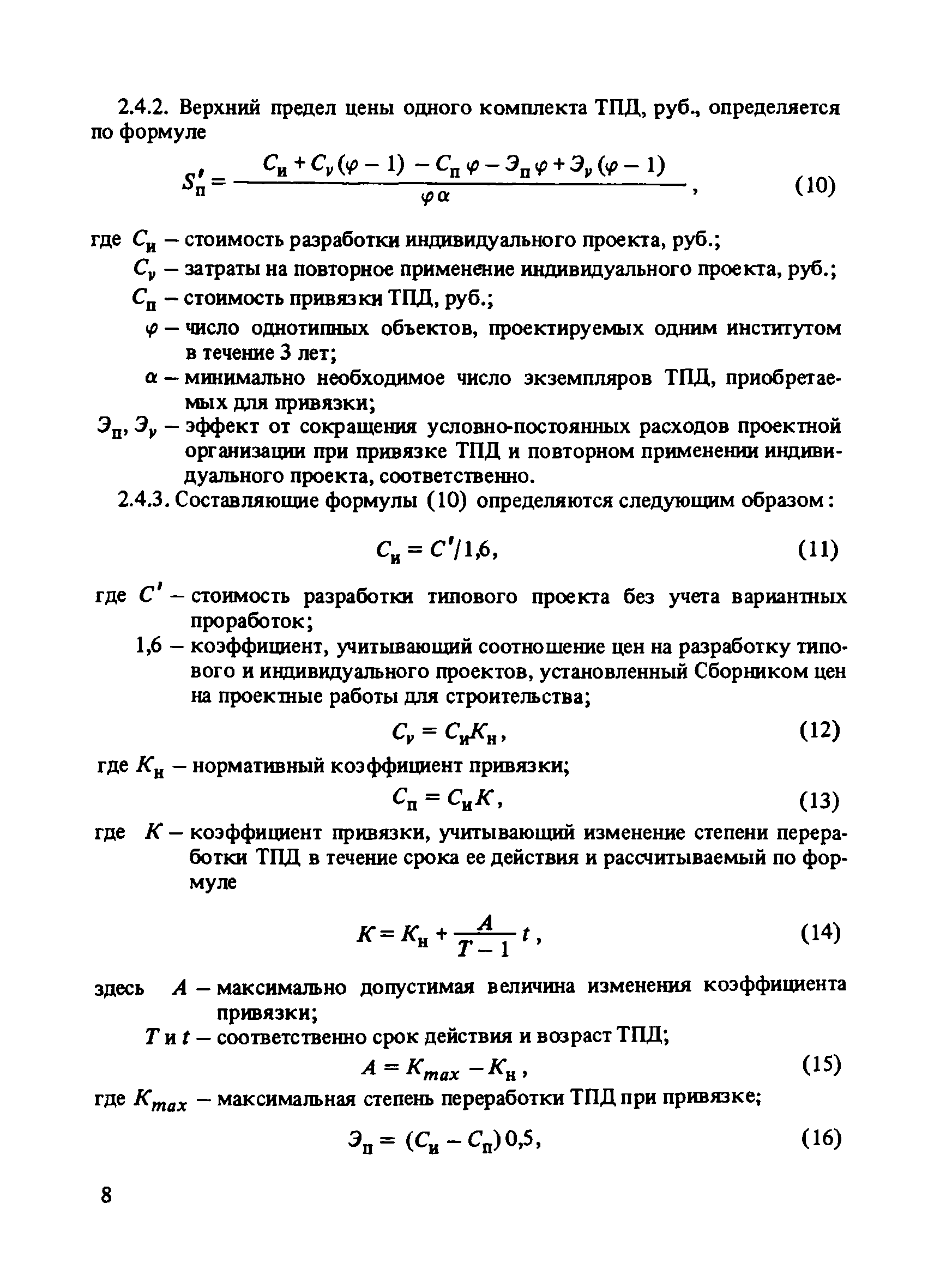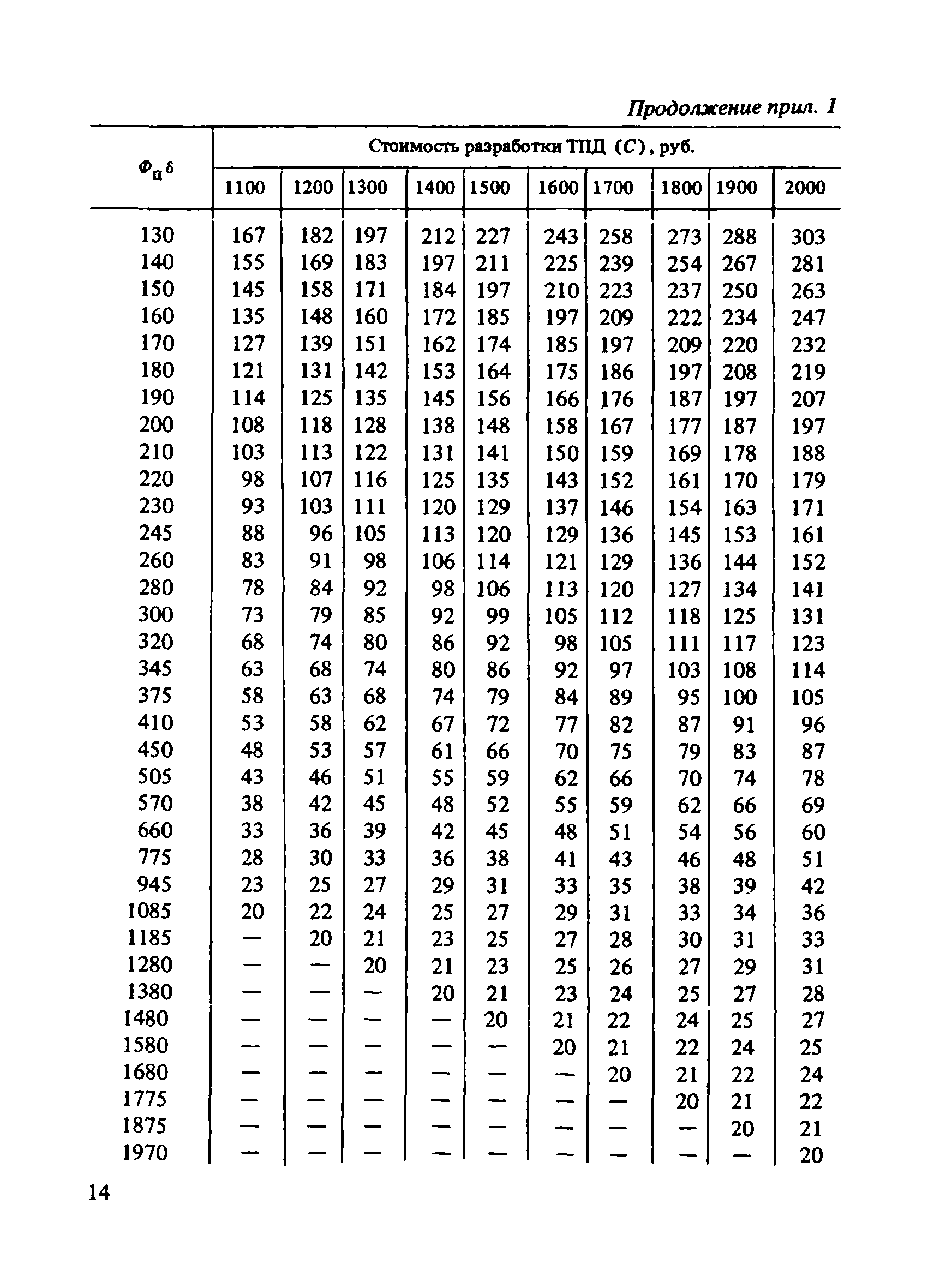 | Оглавление: | Предисловие 1. Общие положения 2. Методика определения цены на передаваемую потребителю типовую проектную документацию 3. Порядок применения методики Приложение 1. Определение минимального тиража (Нм) Приложение 2. Число однотипных объектов, проектируемых одним институтом Приложение 3. Группировка типовых проектов по степени их переработки при привязке Приложение 4. Верхние пределы цен на передаваемую потребителю ТПД (при Кmax = Кп), руб. за комплект ТПД |