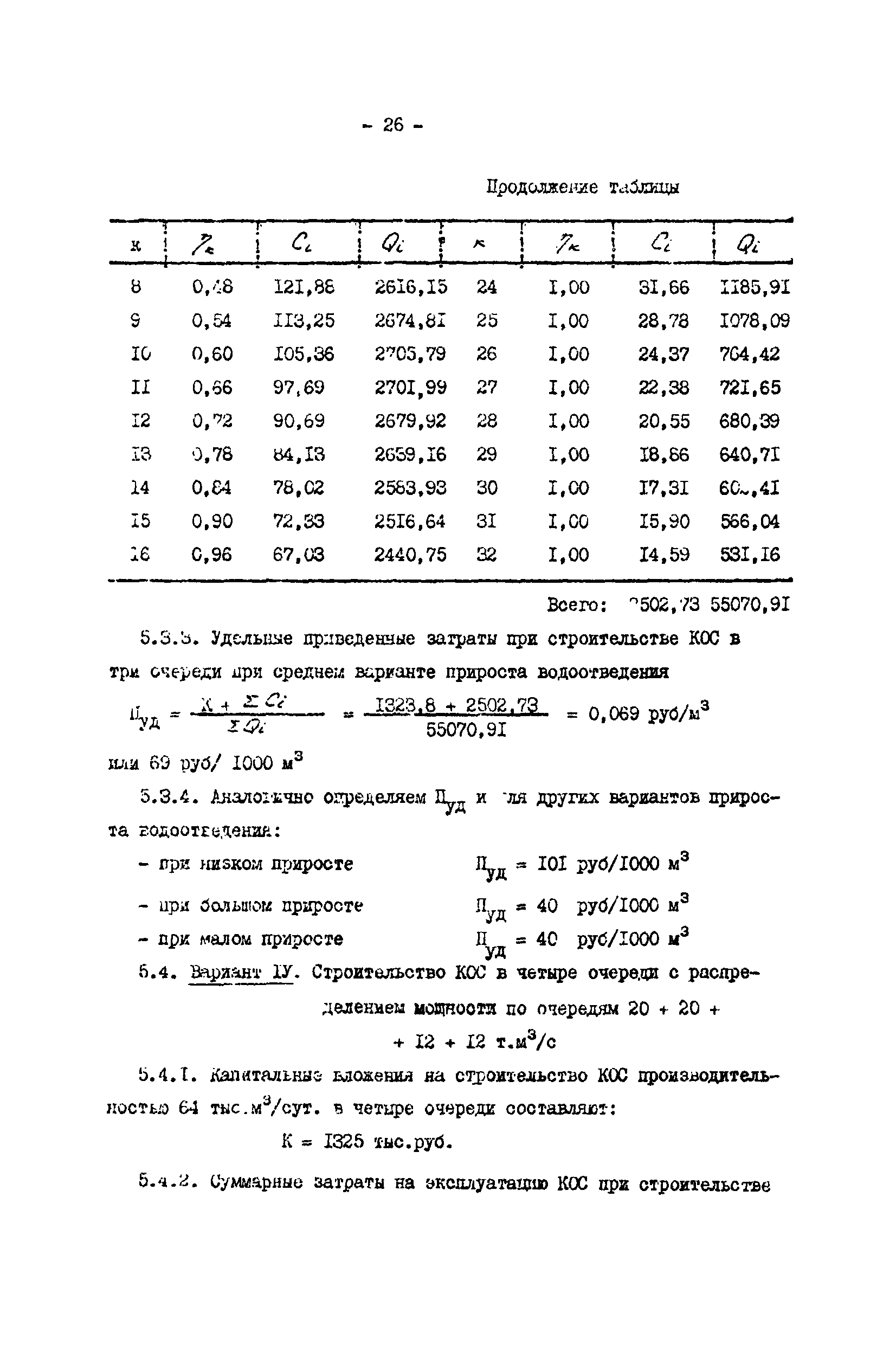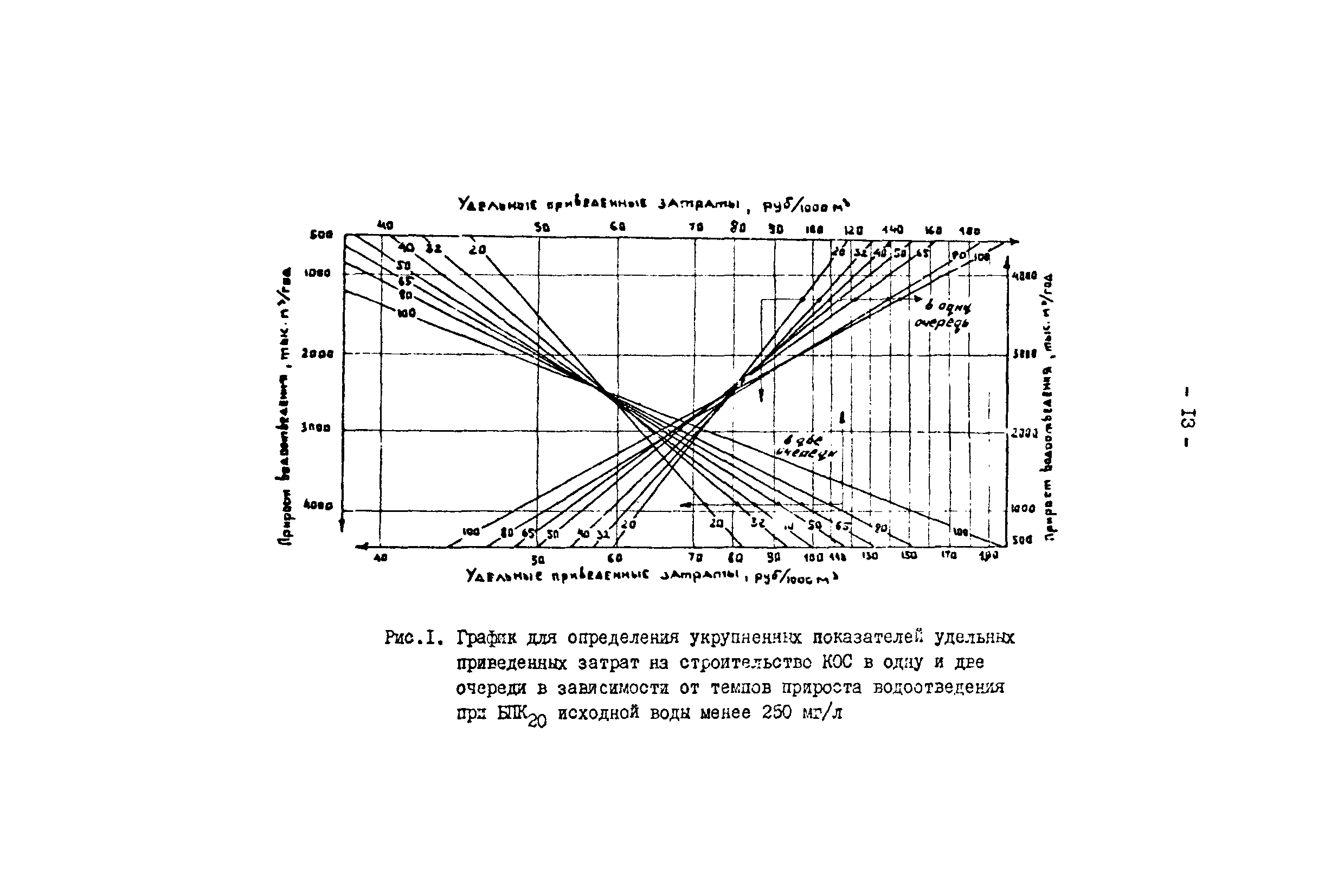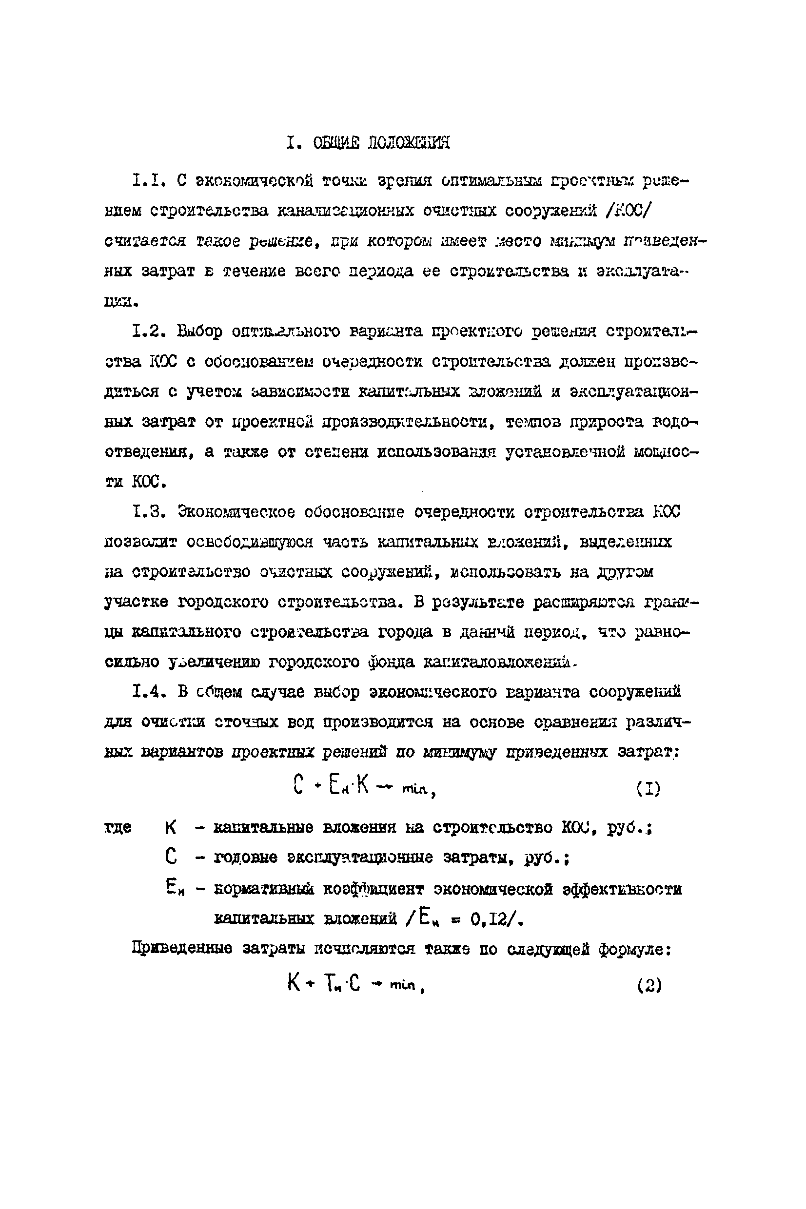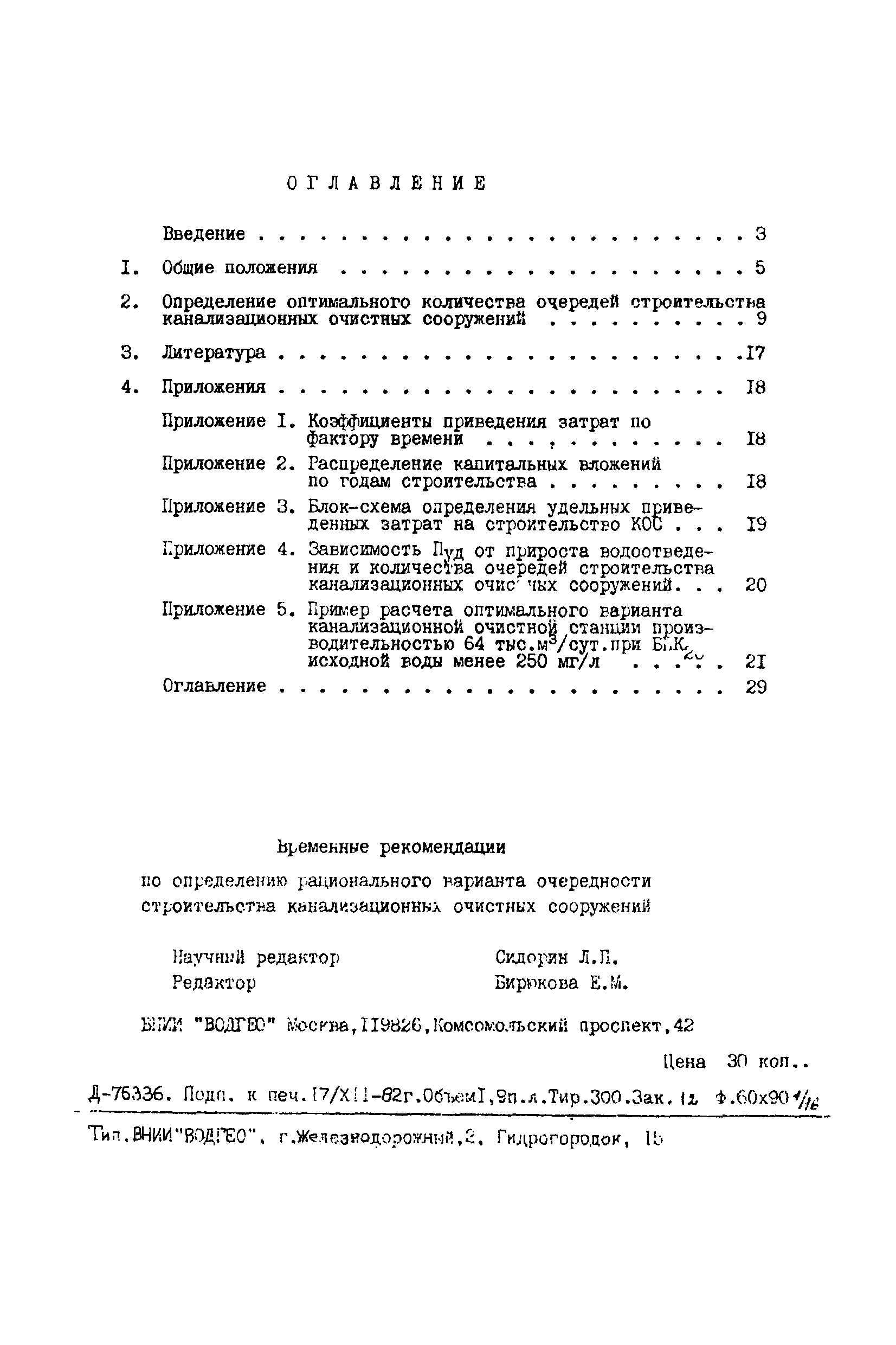 | Оглавление: | Введение 1. Общие положения 2. Определение оптимального количества очередей строительства канализационных очистных сооружений 3. Литература Приложение 1. Коэффициенты приведения затрат по фактору времени Приложения 2. Распределение капитальных вложений по годам строительства Приложение 3. Блок-схема определения удельных приведенных затрат на строительство КОС Приложение 4. Зависимость Пуд от прироста водоотведения и количества очередей строительства канализационных очистных сооружений Приложение 5. Пример расчета оптимального варианта канализационной очистной станции производительности 64 тыс.м3/сут. при БПК20 исходной воды менее 250 мг/л |