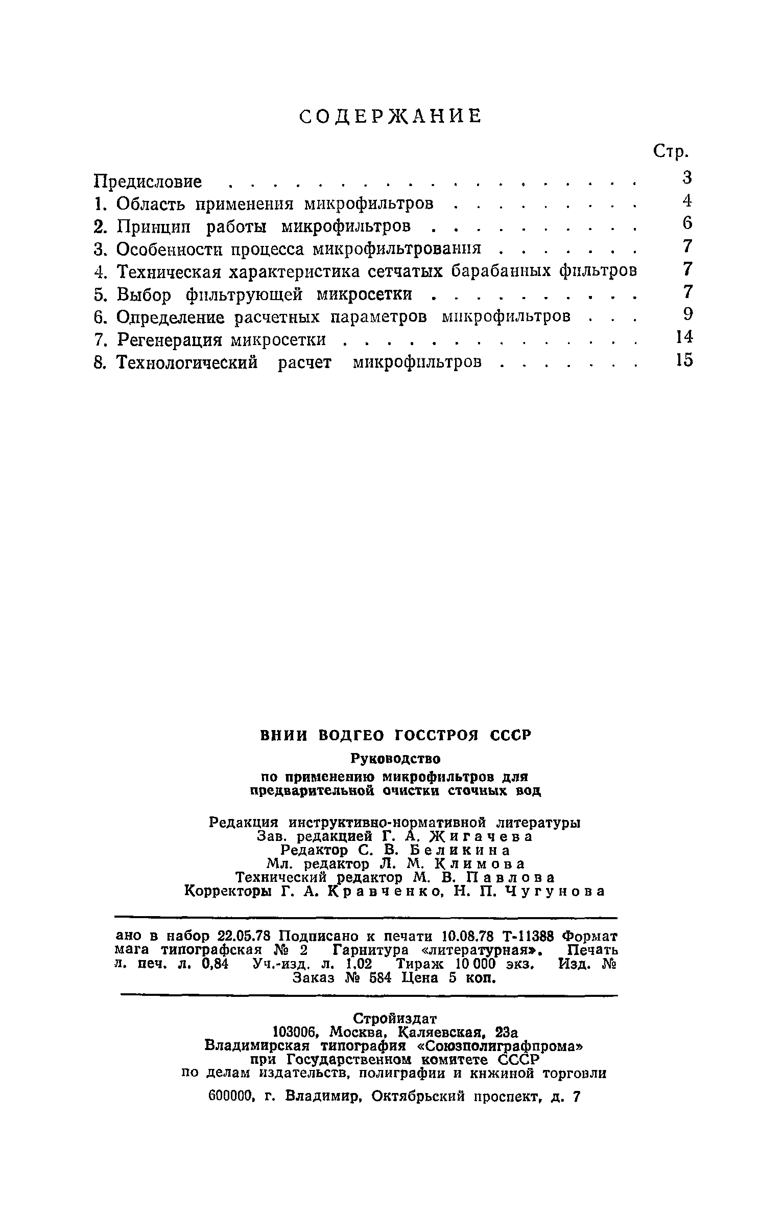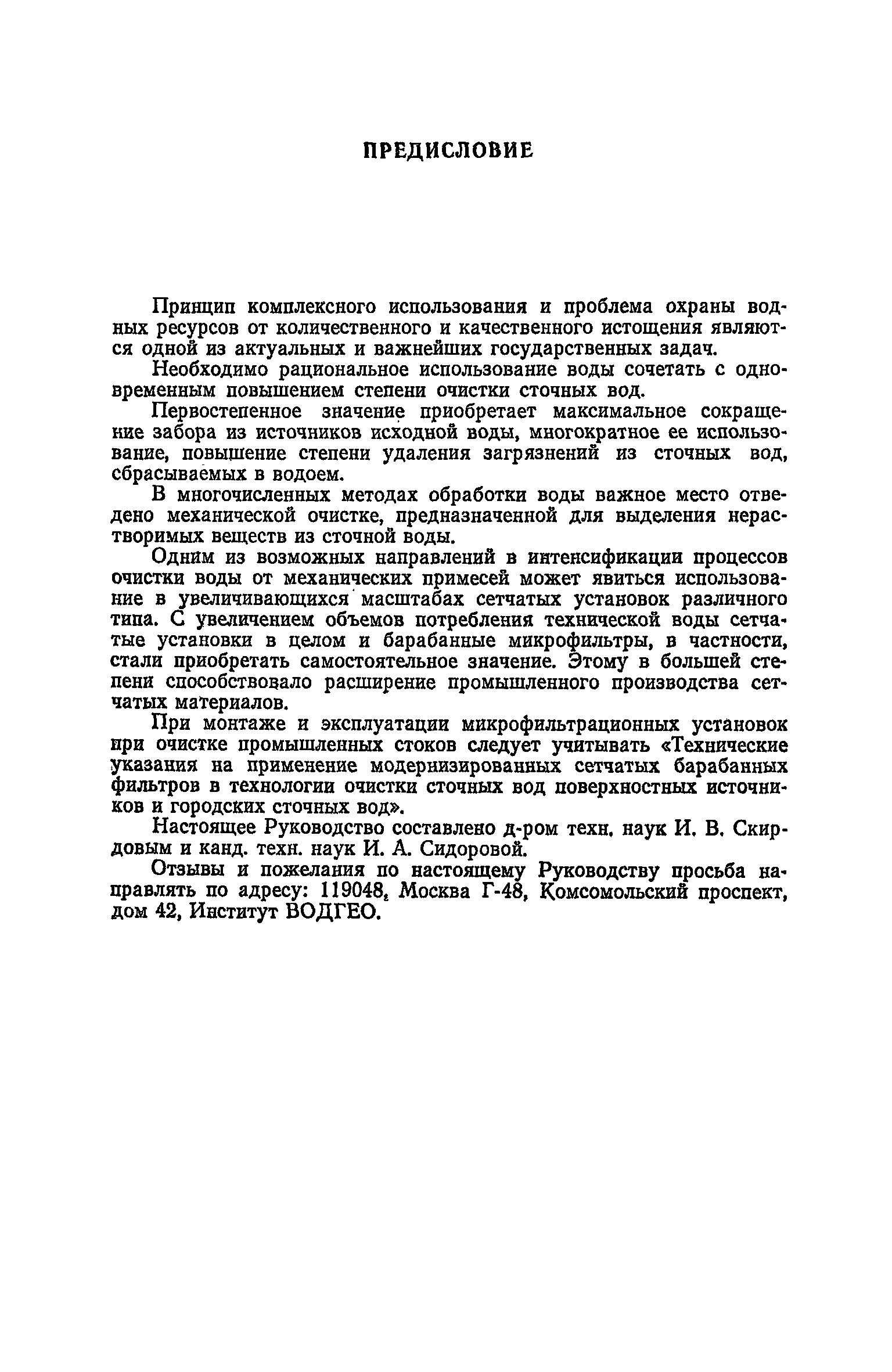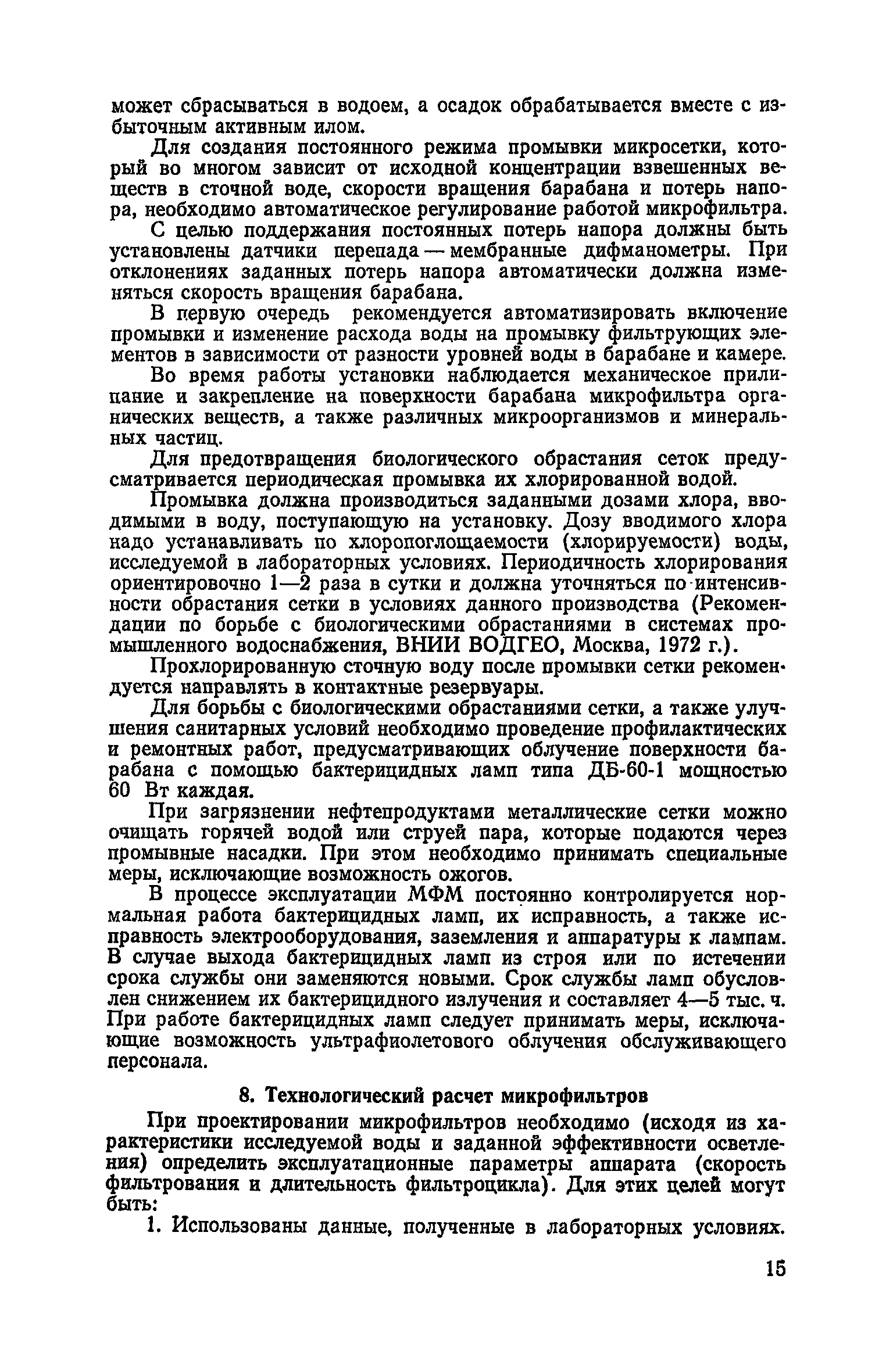 | Оглавление: | Предисловие 1. Область применения микрофильтров 2. Принцип работы микрофильтров 3. Особенности процесса микрофильтрования 4. Техническая характеристика сетчатых барабанных фильтров 5. Выбор фильтрующей микросетки 6. Определение расчетных параметров микрофильтров 7. Регенерация микросетки 8. Технологический расчет микрофильтров |