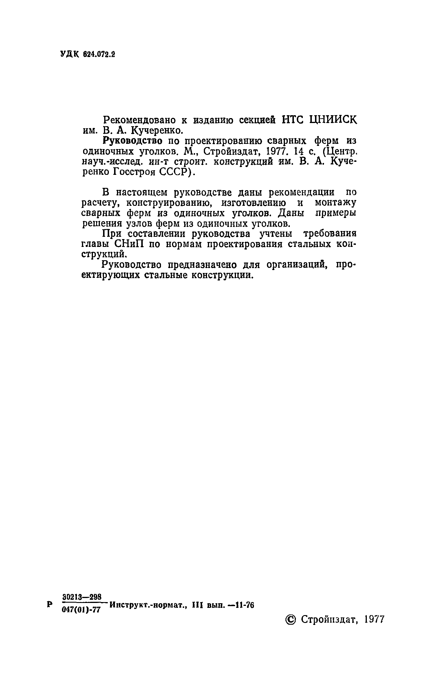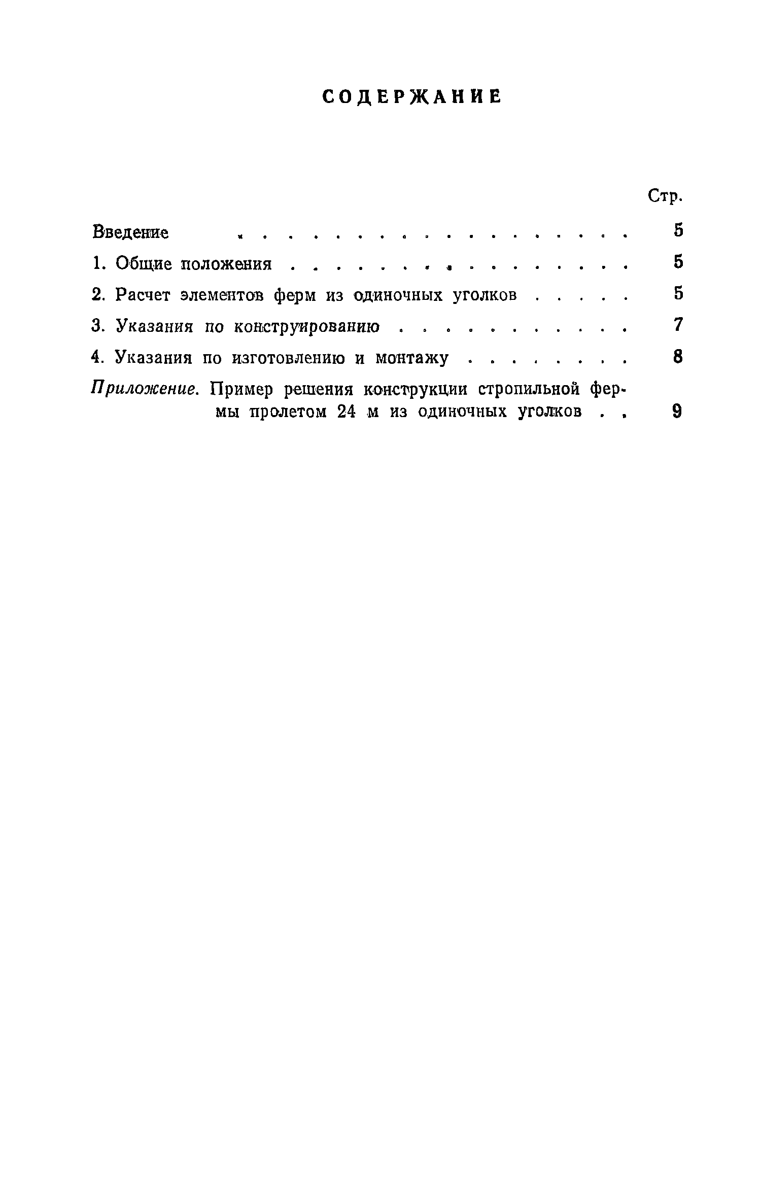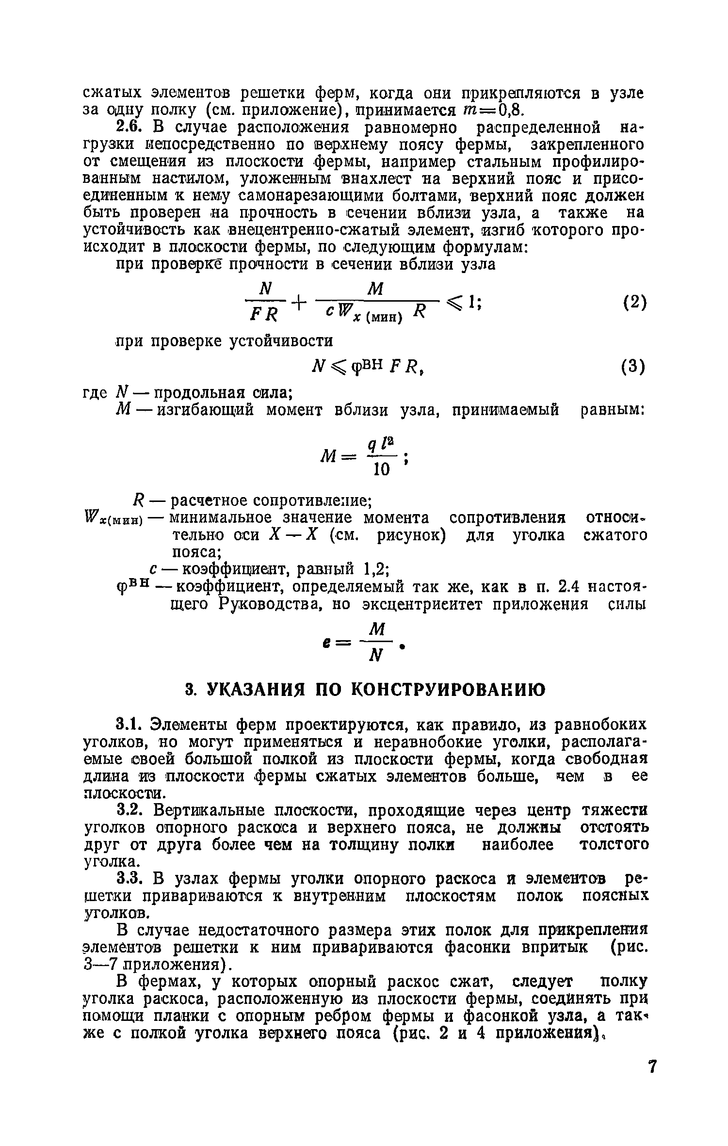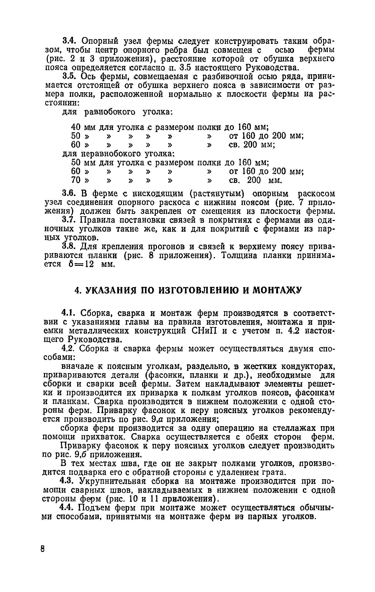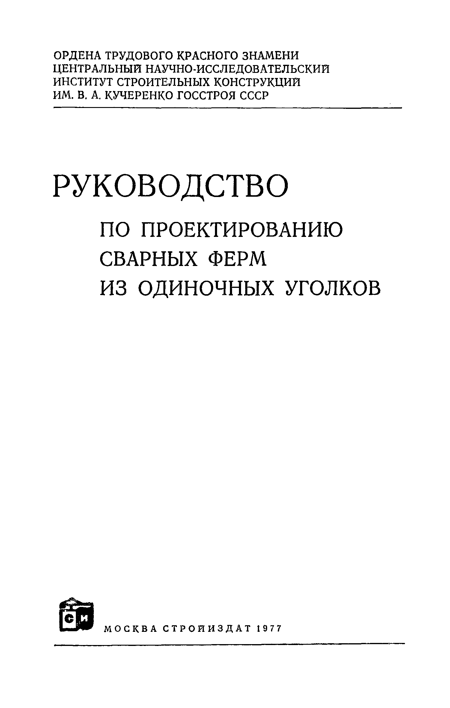 | Оглавление: | Введение 1. Общие положения 2. Расчет элементов ферм из одиночных уголков 3. Указания по конструированию 4. Указания по изготовлению и монтажу Приложение. Пример решения конструкции стропильной фермы пролетом 24 м из одиночных уголков |