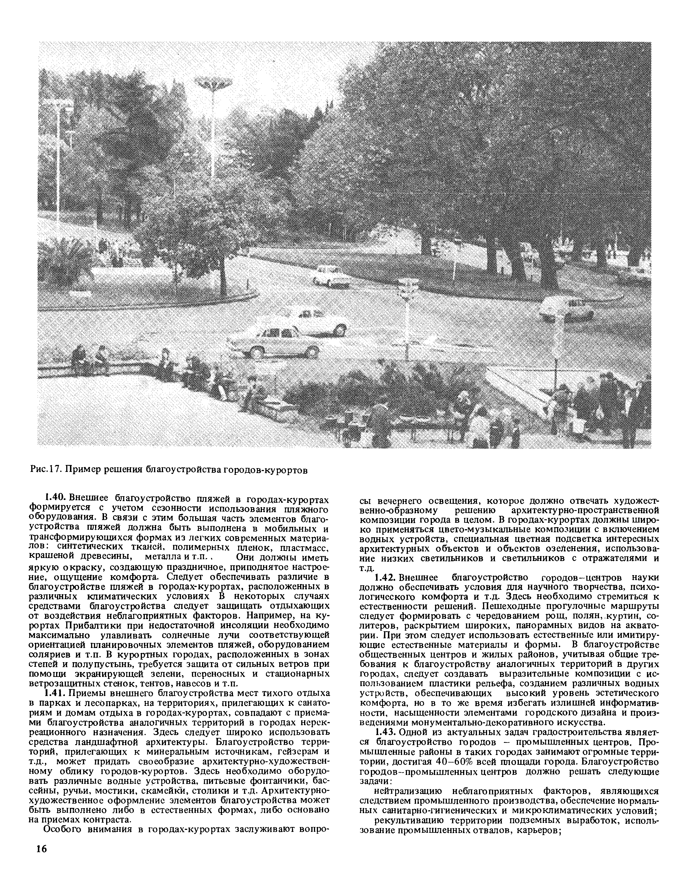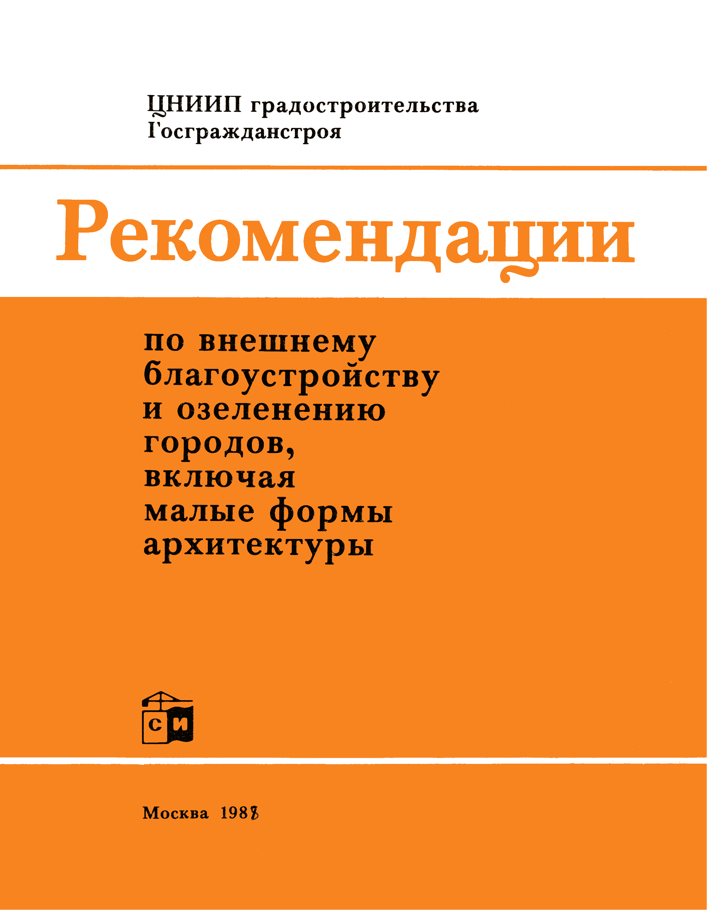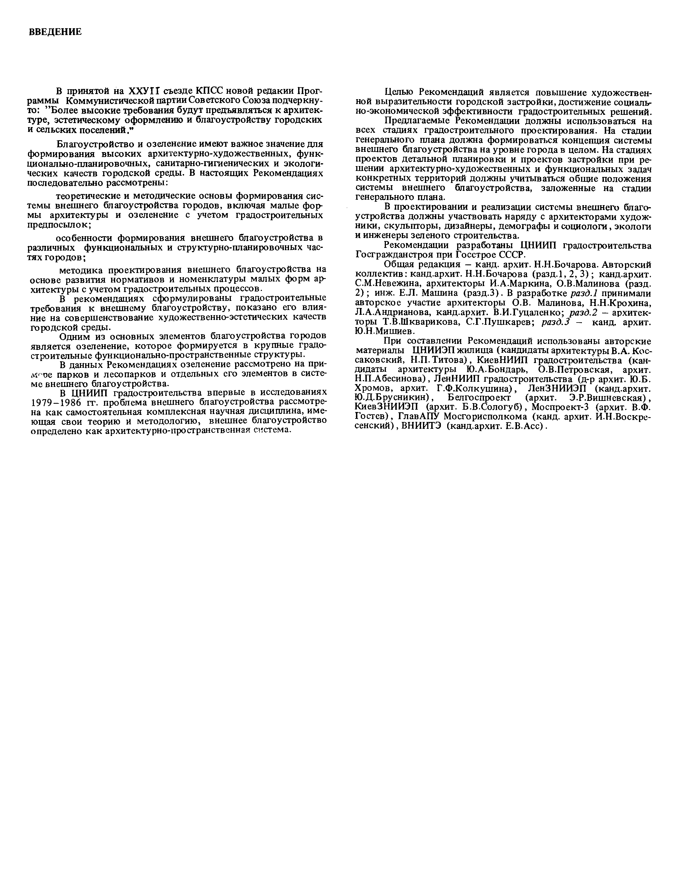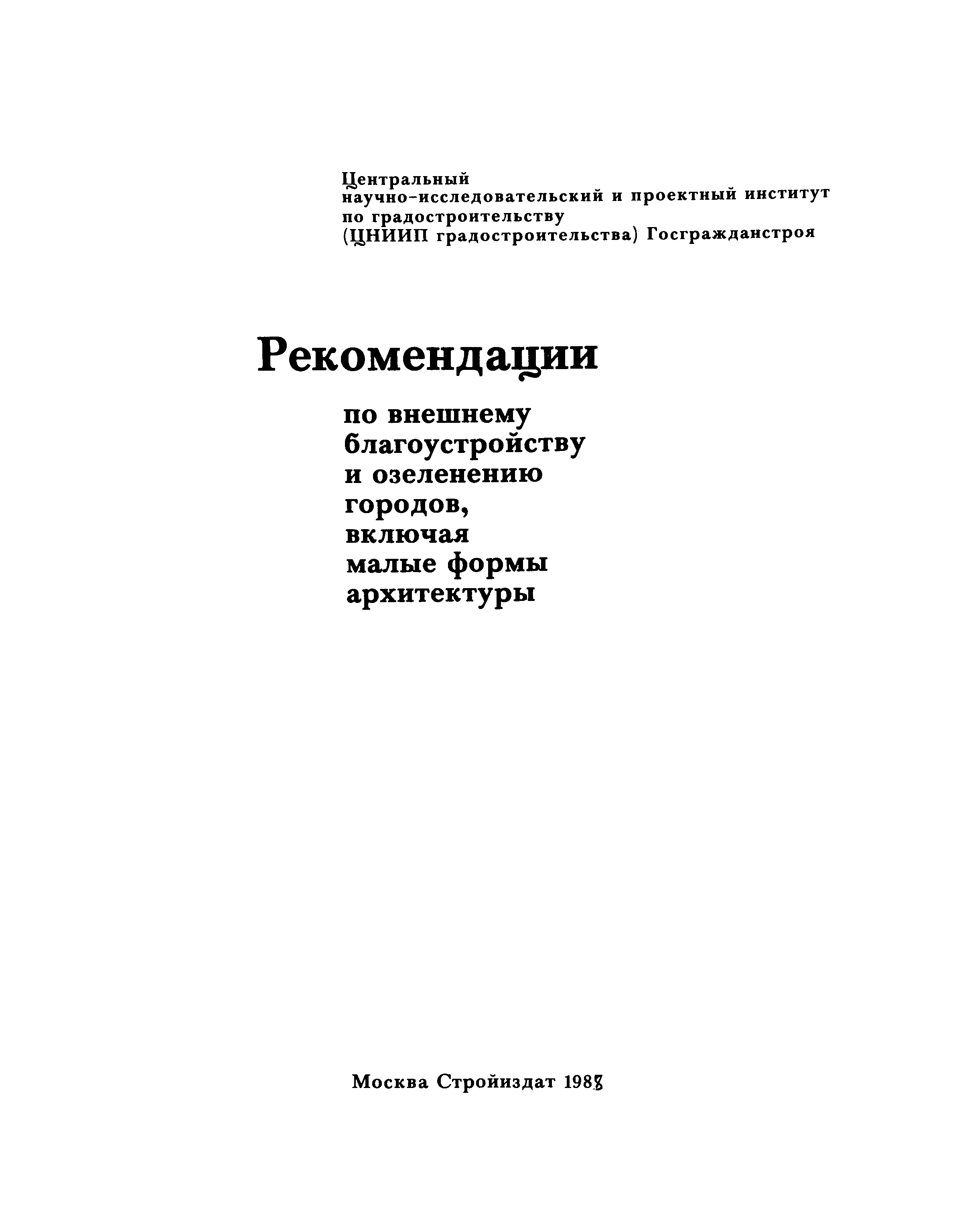 Рекомендации по внешнему благоустройству и озеленению городов, включая малые формы архитектуры| Статус: | действует | | Название рус.: | Рекомендации по внешнему благоустройству и озеленению городов, включая малые формы архитектуры | | Дата добавления в базу: | 01.09.2013 | | Дата актуализации: | 01.01.2021 | | Область применения: | Документ предназначен для специалистов проектных организаций и научно-исследовательских институтов градостроительного профиля, архитекторов, художников. | | Оглавление: | Введение 1. Теоретические и методические основы формирования внешнего благоустройства городов Градостроительные предпосылки и методические основы формирования системы внешнего благоустройства городов Произведения монументально-декоративного искусства, праздничное оформление и дизайн во внешнем благоустройстве города Ландшафтно-экологические условия, санитарно-гигиеническое значение внешнего благоустройства городов Особенности внешнего благоустройства городов различного народнохозяйственного профиля 2. Внешнее благоустройство территории различных функциональных и структурно-планировочных частей городов Внешнее благоустройство в архитектурно-пространственной среде общегородского центра Планировочные элементы благоустройства и оборудование территорий жилой застройки Приемы благоустройства на предзаводских территориях и в санитарно-защитных зонах Внешнее благоустройство ландшафтно-рекреационных территорий городов 3. Совершенствование проектирования объектов внешнего благоустройства Общие положения и нормативные показатели проектирования объектов внешнего благоустройства Методика составления номенклатуры малых форм архитектуры и планировочных элементов благоустройства Повышение эффективности внешнего благоустройства Приложение. Некоторые показатели внешнего благоустройства городов | | Разработан: | ЛенНИИПградостроительства КиевНИИП градостроительства КиевЗНИИЭП ЦНИИП градостроительства ВНИИТЭ ЛенЗНИИЭП ГлавАПУ Мосгорисполкома