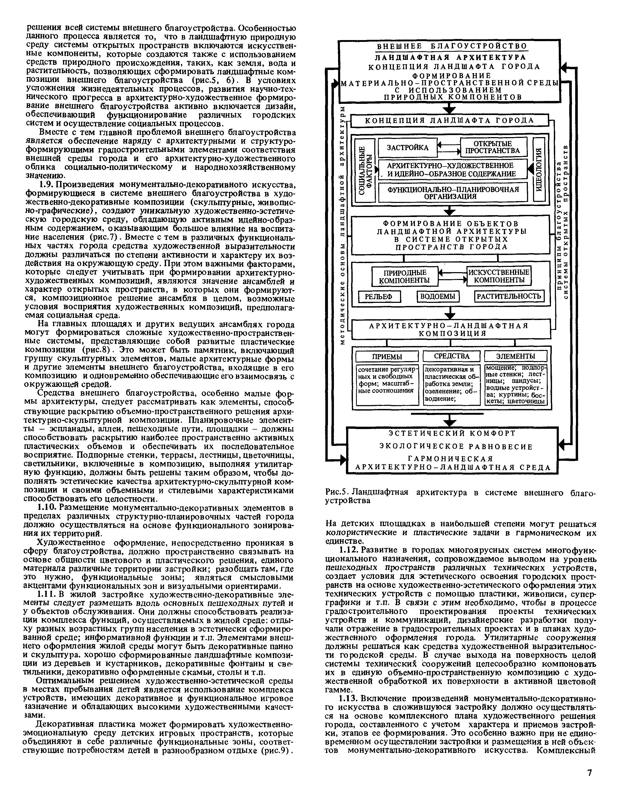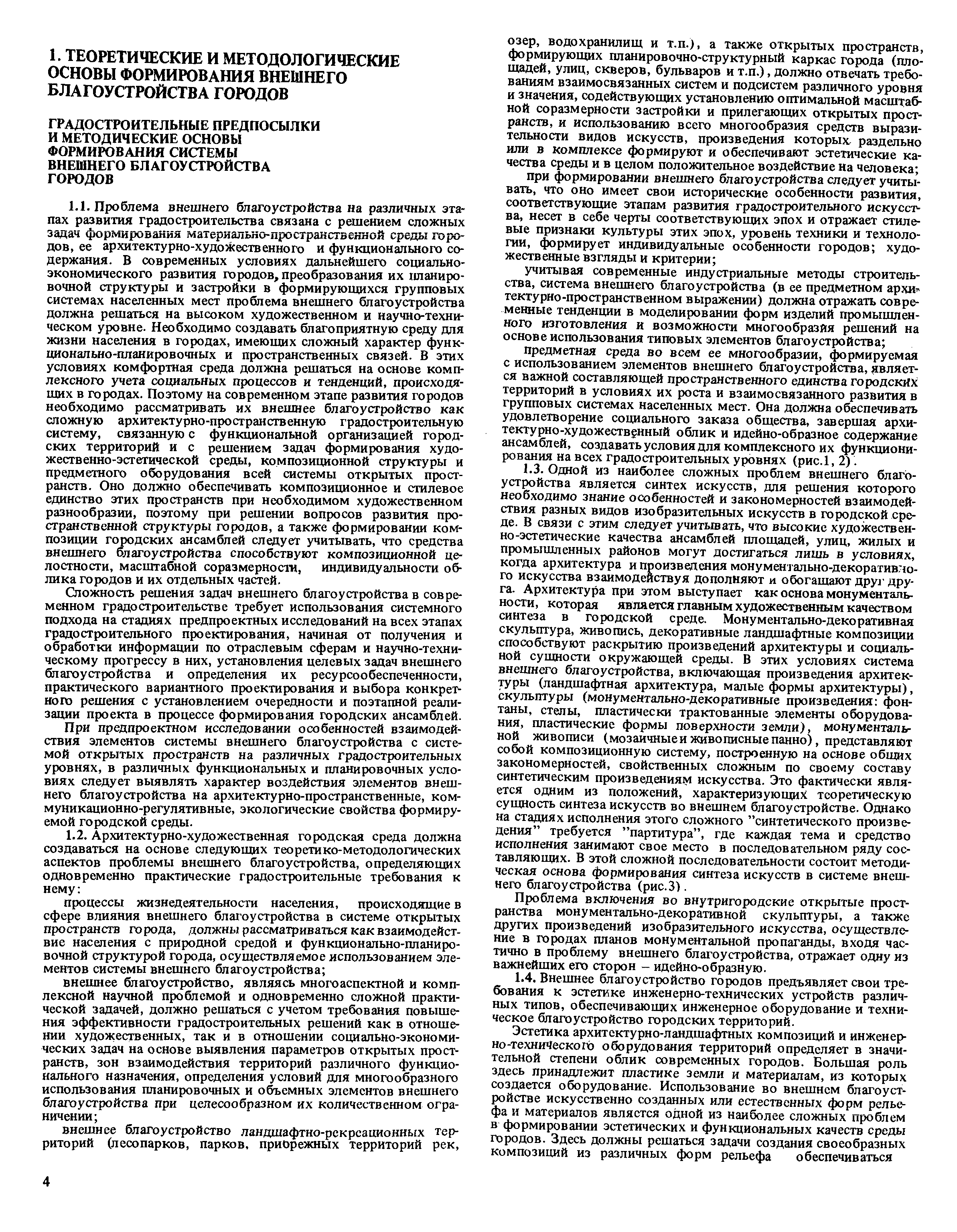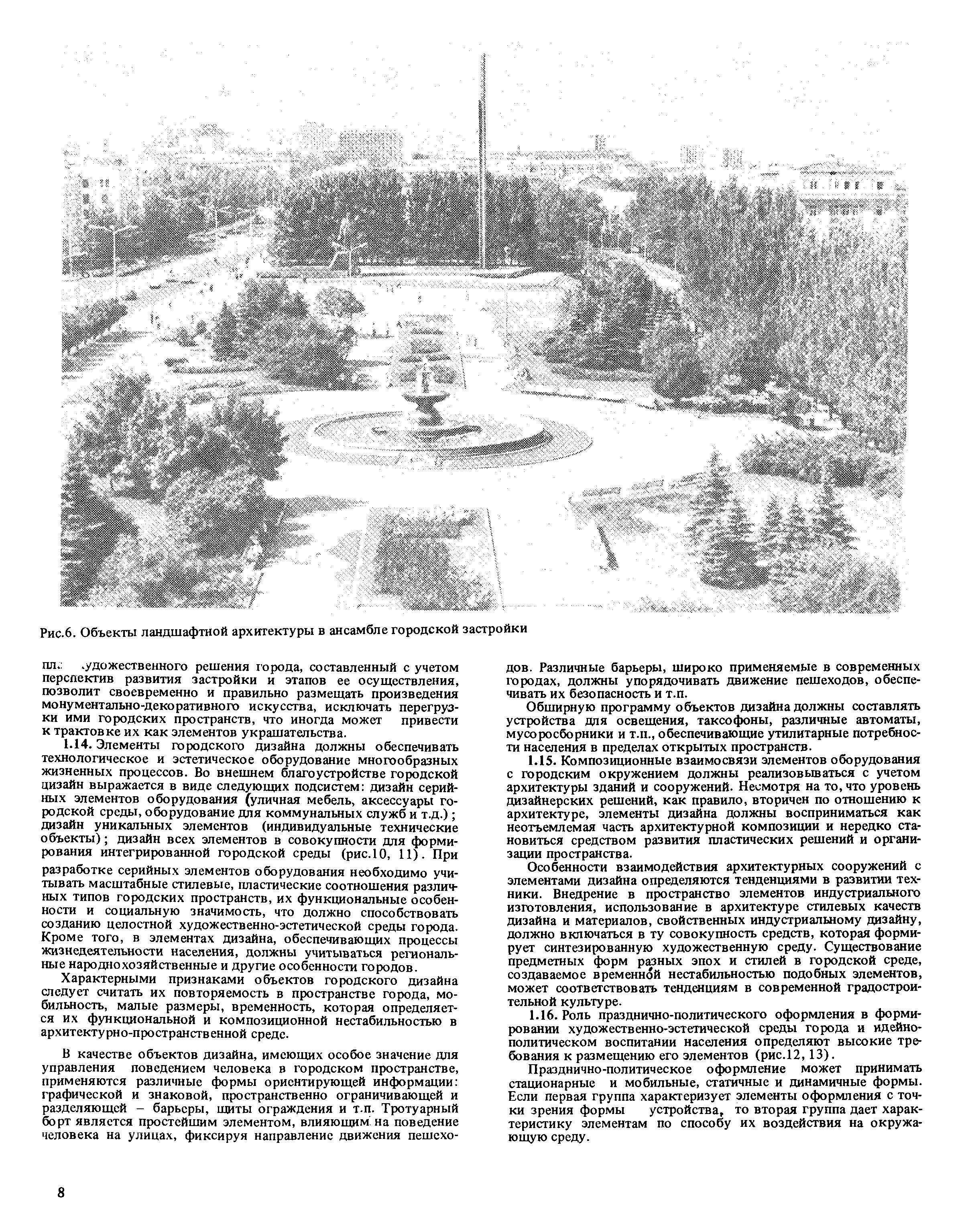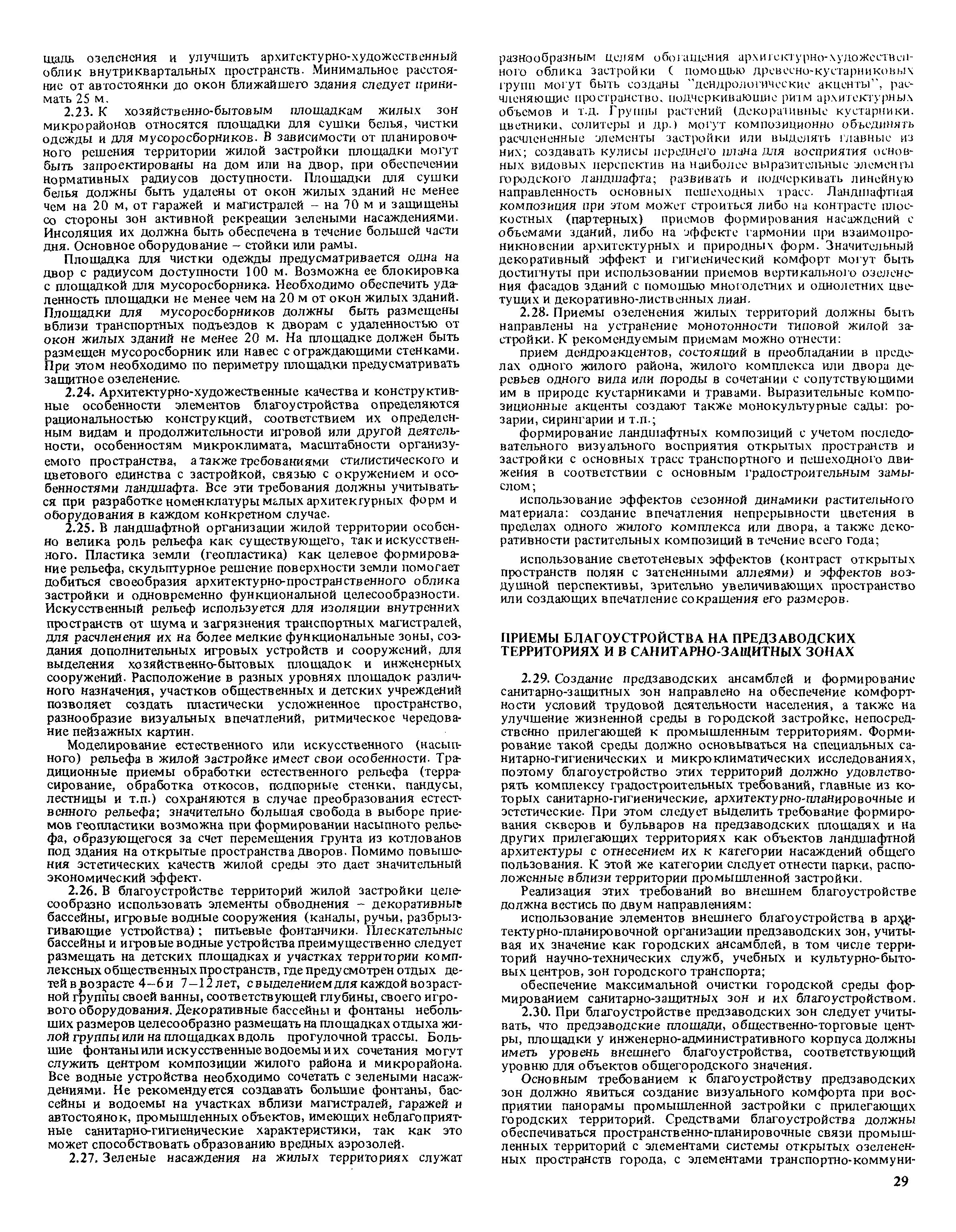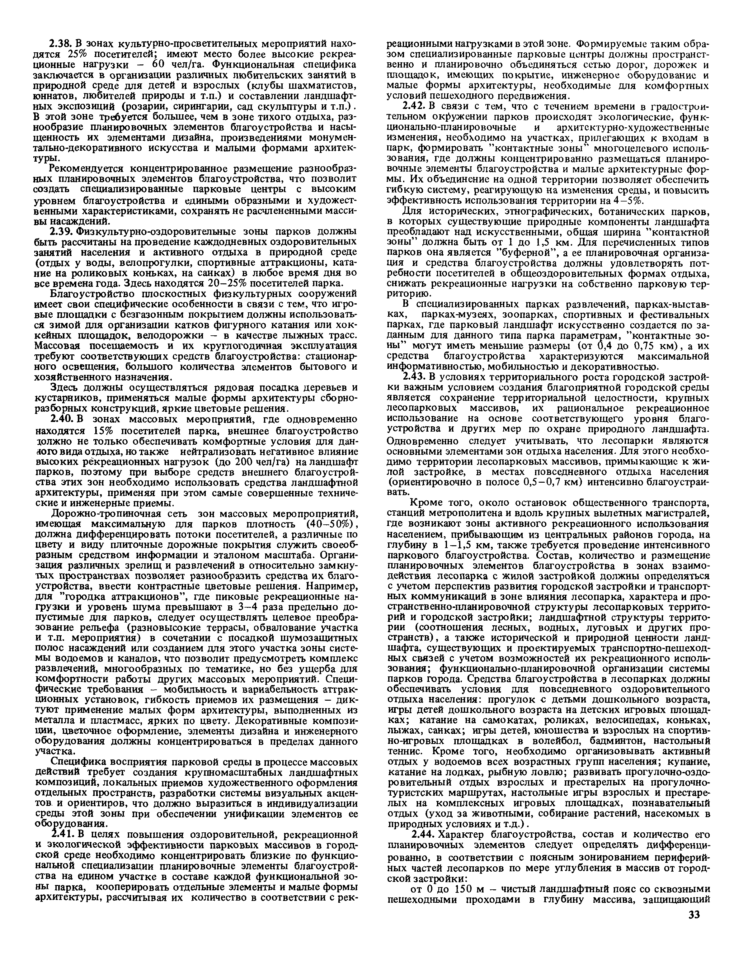 Рекомендации по внешнему благоустройству и озеленению городов, включая малые формы архитектуры| Статус: | действует | | Название рус.: | Рекомендации по внешнему благоустройству и озеленению городов, включая малые формы архитектуры | | Дата добавления в базу: | 01.09.2013 | | Дата актуализации: | 01.01.2021 | | Область применения: | Документ предназначен для специалистов проектных организаций и научно-исследовательских институтов градостроительного профиля, архитекторов, художников. | | Оглавление: | Введение 1. Теоретические и методические основы формирования внешнего благоустройства городов Градостроительные предпосылки и методические основы формирования системы внешнего благоустройства городов Произведения монументально-декоративного искусства, праздничное оформление и дизайн во внешнем благоустройстве города Ландшафтно-экологические условия, санитарно-гигиеническое значение внешнего благоустройства городов Особенности внешнего благоустройства городов различного народнохозяйственного профиля 2. Внешнее благоустройство территории различных функциональных и структурно-планировочных частей городов Внешнее благоустройство в архитектурно-пространственной среде общегородского центра Планировочные элементы благоустройства и оборудование территорий жилой застройки Приемы благоустройства на предзаводских территориях и в санитарно-защитных зонах Внешнее благоустройство ландшафтно-рекреационных территорий городов 3. Совершенствование проектирования объектов внешнего благоустройства Общие положения и нормативные показатели проектирования объектов внешнего благоустройства Методика составления номенклатуры малых форм архитектуры и планировочных элементов благоустройства Повышение эффективности внешнего благоустройства Приложение. Некоторые показатели внешнего благоустройства городов | | Разработан: | ЛенНИИПградостроительства КиевНИИП градостроительства КиевЗНИИЭП ЦНИИП градостроительства ВНИИТЭ ЛенЗНИИЭП ГлавАПУ Мосгорисполкома