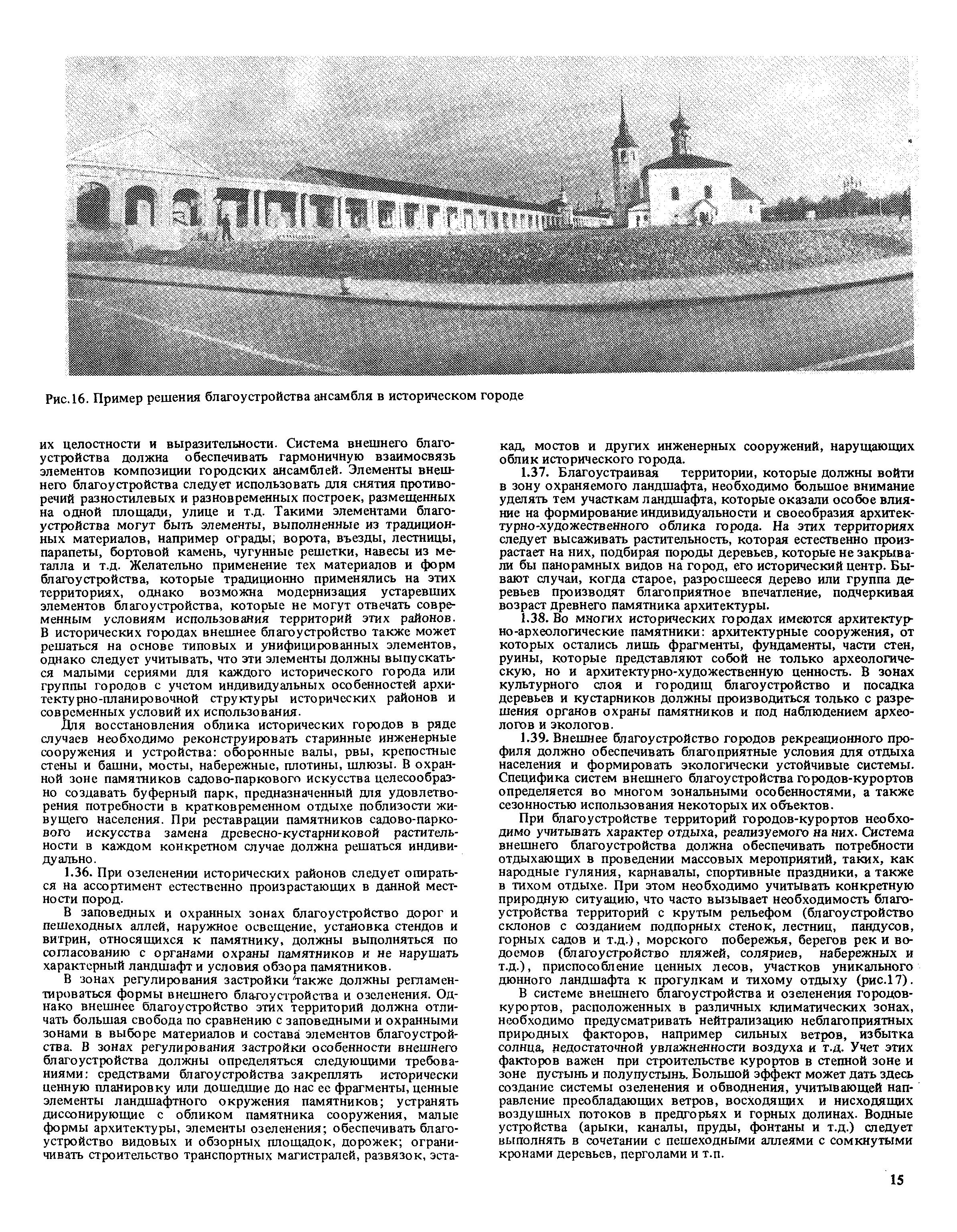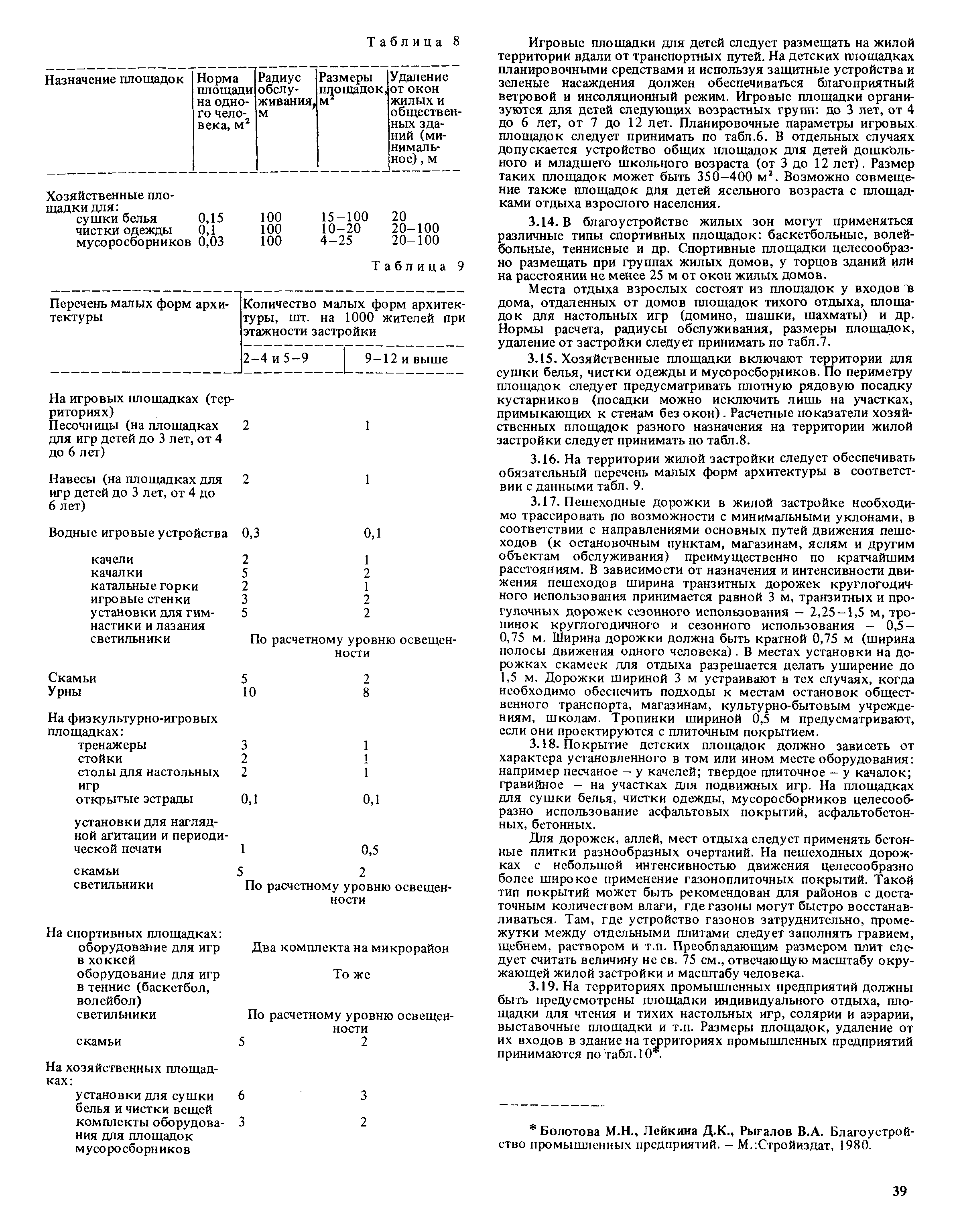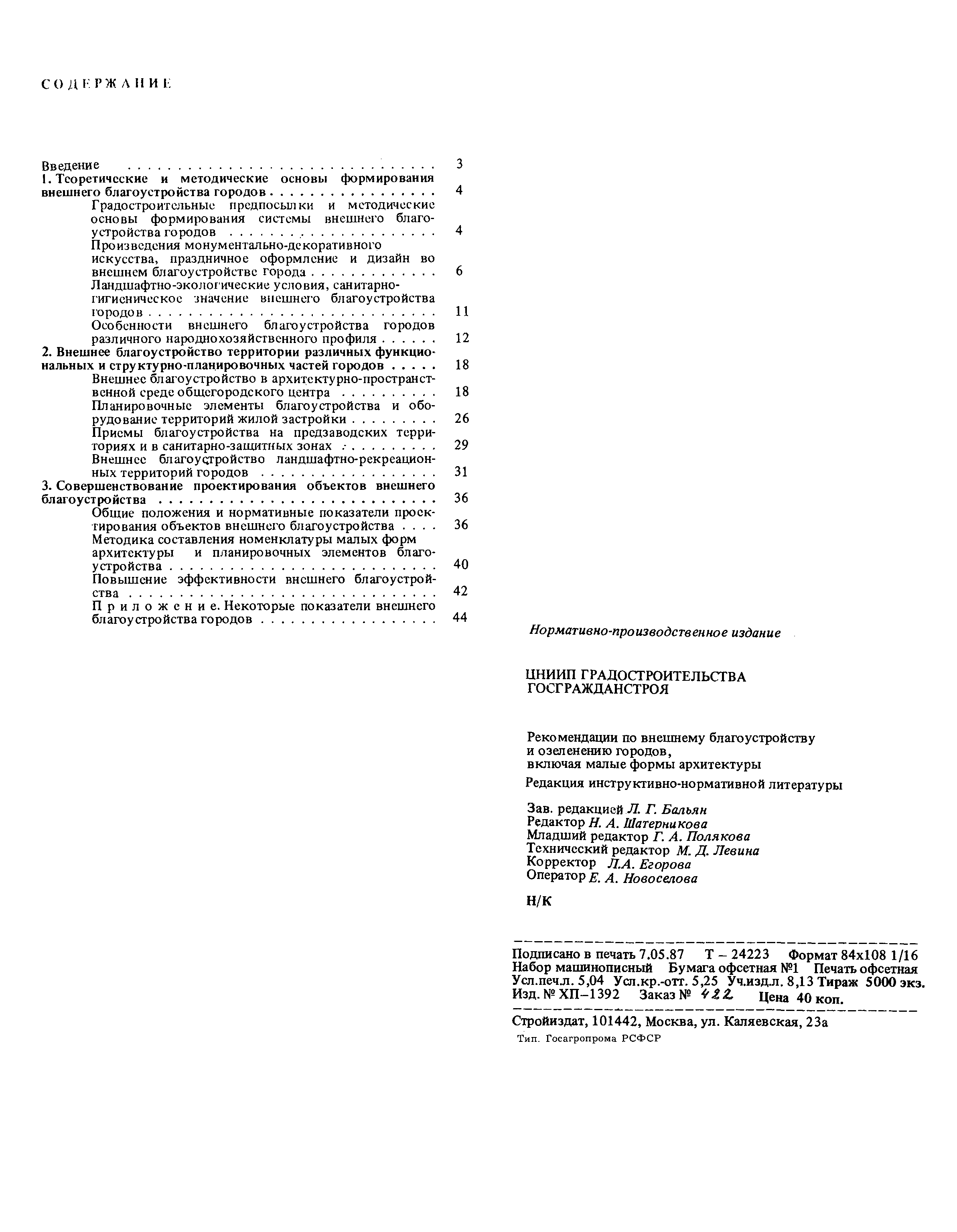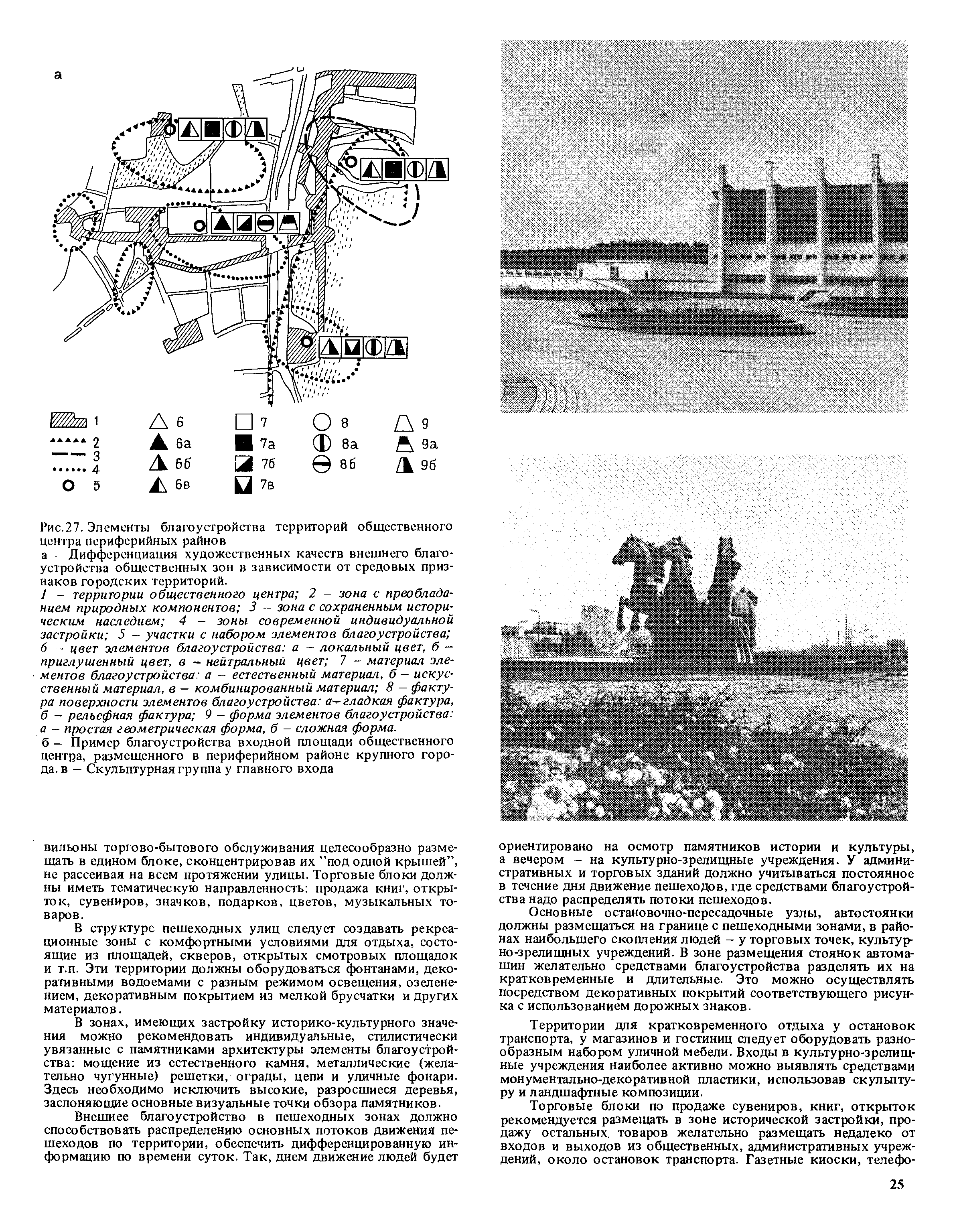 Рекомендации по внешнему благоустройству и озеленению городов, включая малые формы архитектуры| Статус: | действует | | Название рус.: | Рекомендации по внешнему благоустройству и озеленению городов, включая малые формы архитектуры | | Дата добавления в базу: | 01.09.2013 | | Дата актуализации: | 01.01.2021 | | Область применения: | Документ предназначен для специалистов проектных организаций и научно-исследовательских институтов градостроительного профиля, архитекторов, художников. | | Оглавление: | Введение 1. Теоретические и методические основы формирования внешнего благоустройства городов Градостроительные предпосылки и методические основы формирования системы внешнего благоустройства городов Произведения монументально-декоративного искусства, праздничное оформление и дизайн во внешнем благоустройстве города Ландшафтно-экологические условия, санитарно-гигиеническое значение внешнего благоустройства городов Особенности внешнего благоустройства городов различного народнохозяйственного профиля 2. Внешнее благоустройство территории различных функциональных и структурно-планировочных частей городов Внешнее благоустройство в архитектурно-пространственной среде общегородского центра Планировочные элементы благоустройства и оборудование территорий жилой застройки Приемы благоустройства на предзаводских территориях и в санитарно-защитных зонах Внешнее благоустройство ландшафтно-рекреационных территорий городов 3. Совершенствование проектирования объектов внешнего благоустройства Общие положения и нормативные показатели проектирования объектов внешнего благоустройства Методика составления номенклатуры малых форм архитектуры и планировочных элементов благоустройства Повышение эффективности внешнего благоустройства Приложение. Некоторые показатели внешнего благоустройства городов | | Разработан: | ЛенНИИПградостроительства КиевНИИП градостроительства КиевЗНИИЭП ЦНИИП градостроительства ВНИИТЭ ЛенЗНИИЭП ГлавАПУ Мосгорисполкома