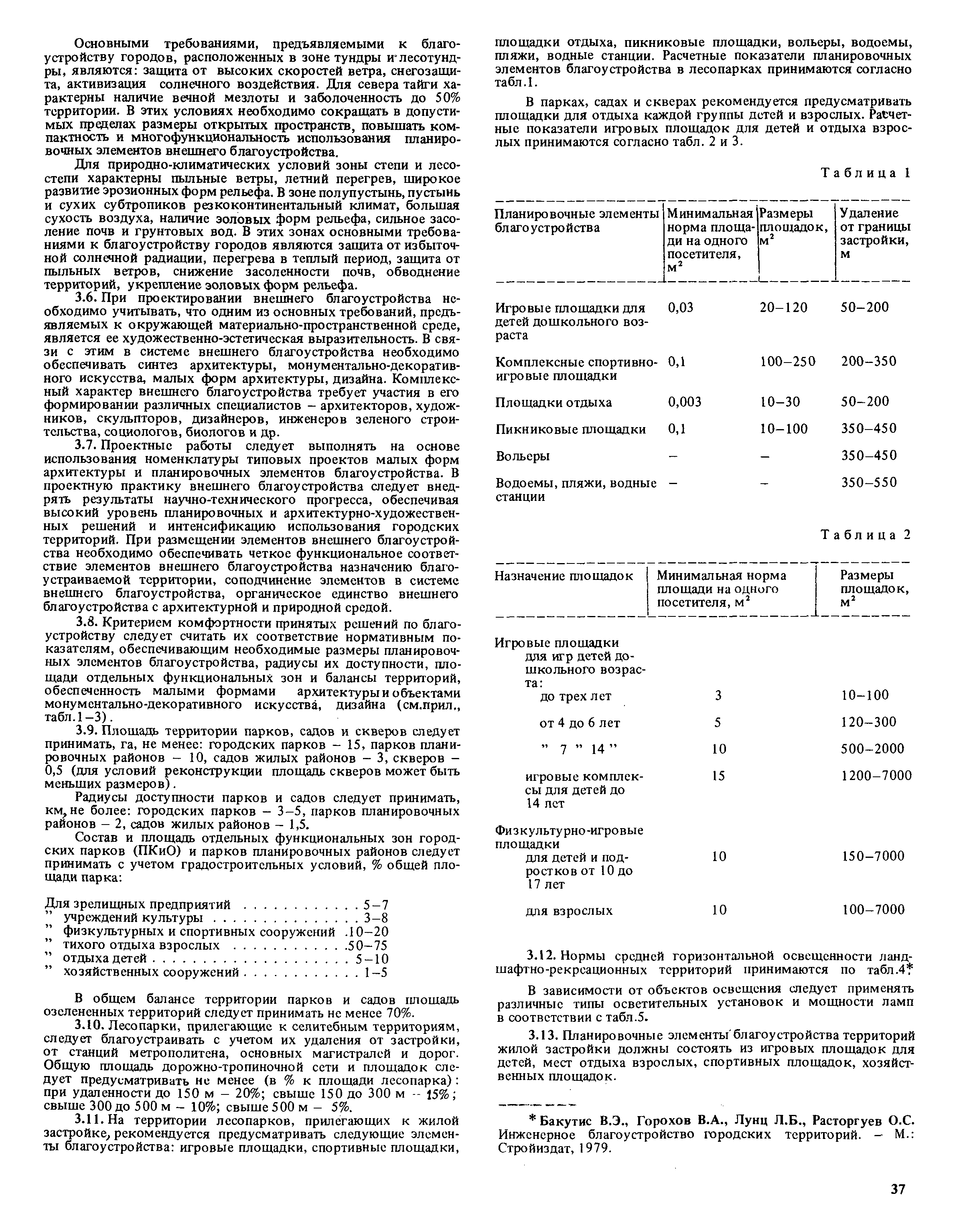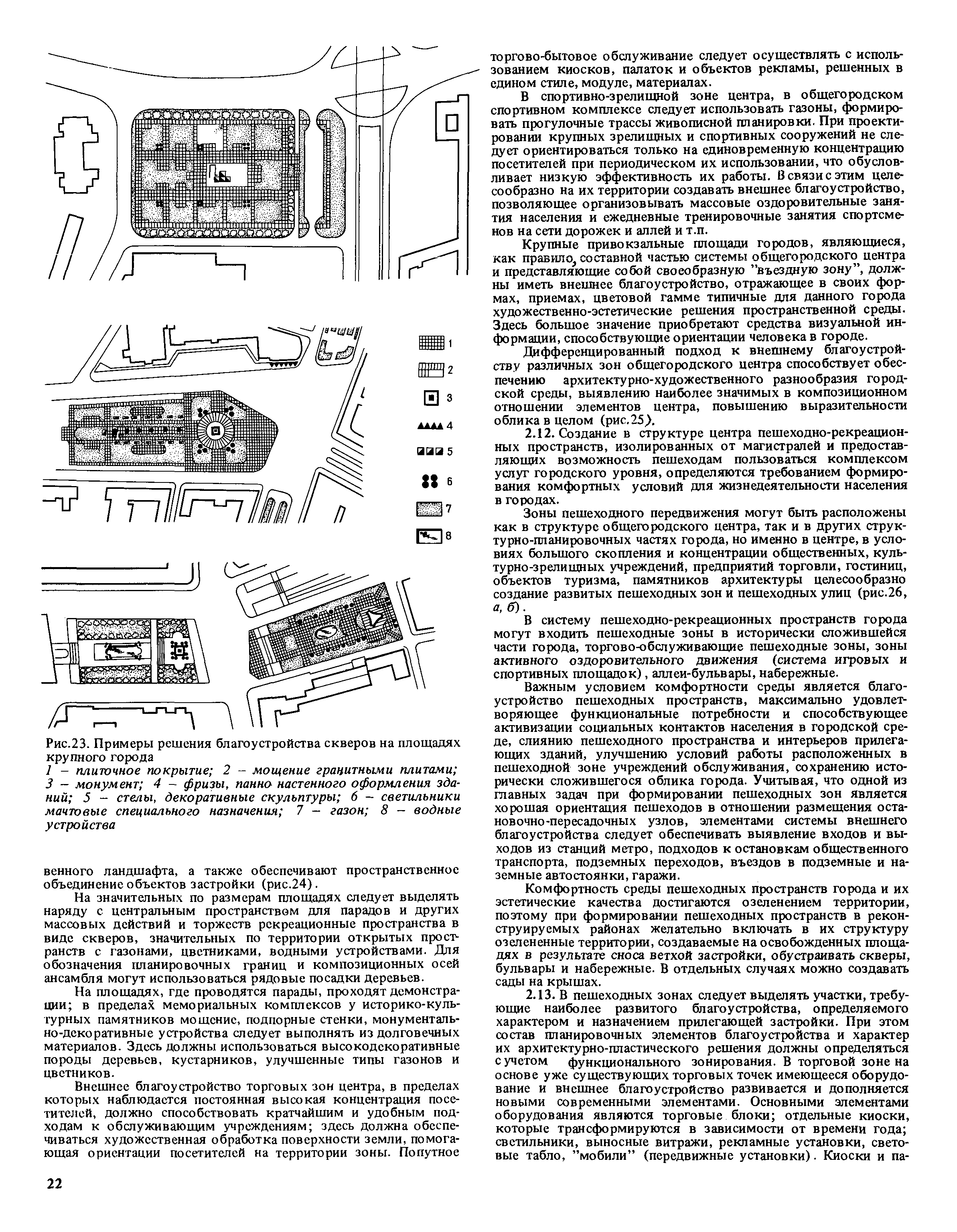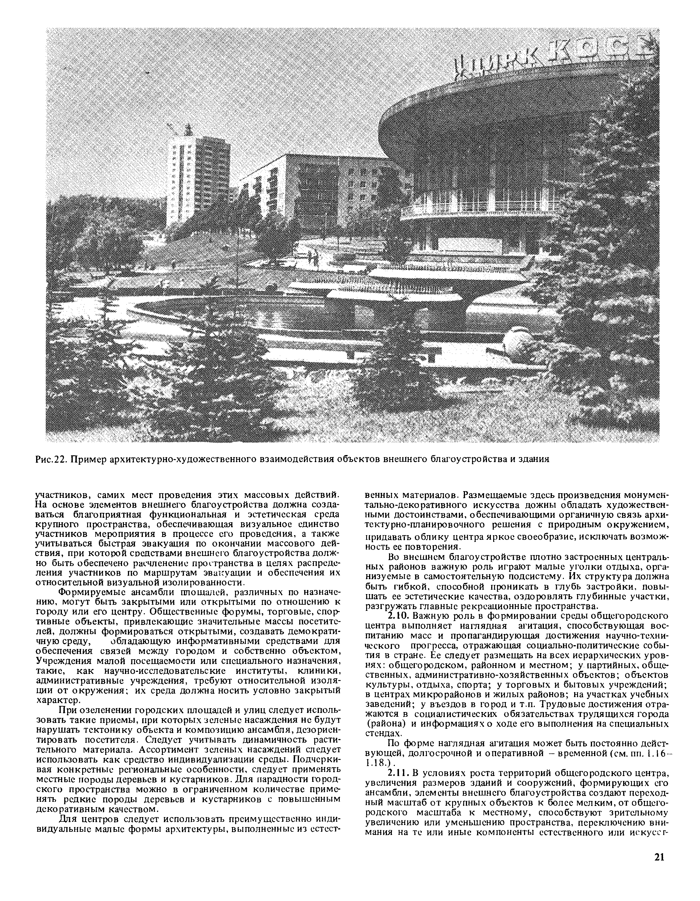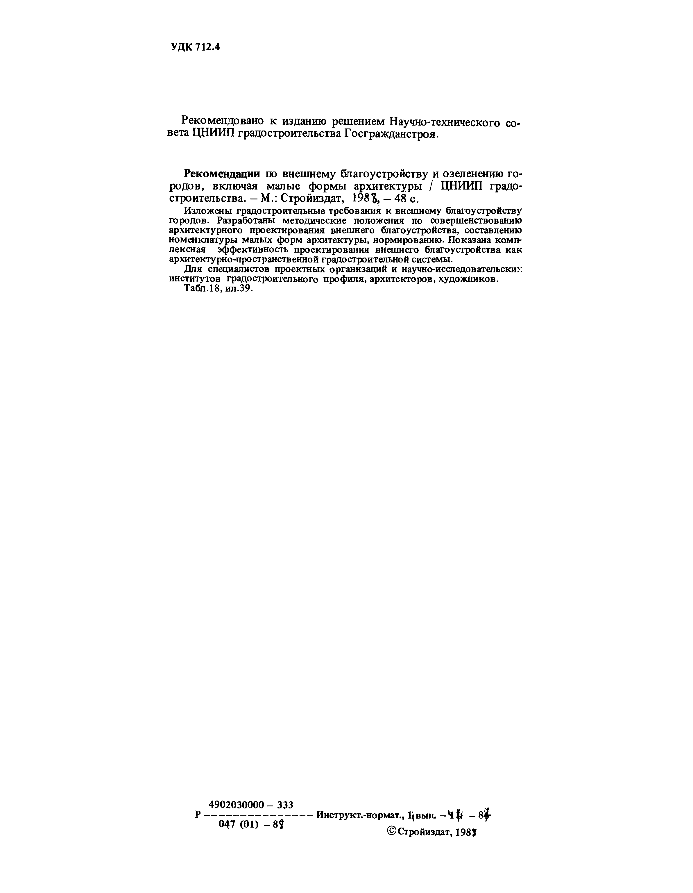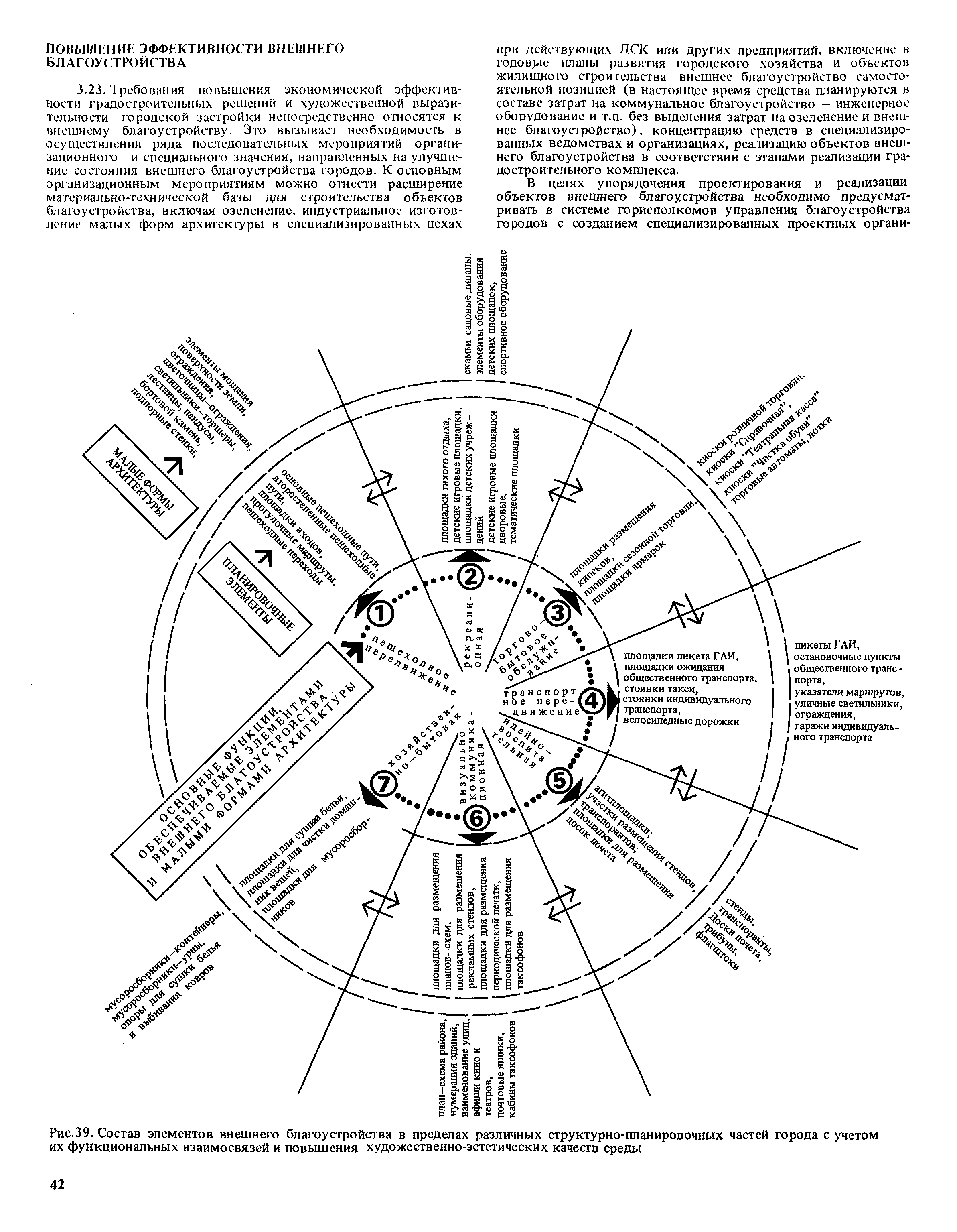 Рекомендации по внешнему благоустройству и озеленению городов, включая малые формы архитектуры| Статус: | действует | | Название рус.: | Рекомендации по внешнему благоустройству и озеленению городов, включая малые формы архитектуры | | Дата добавления в базу: | 01.09.2013 | | Дата актуализации: | 01.01.2021 | | Область применения: | Документ предназначен для специалистов проектных организаций и научно-исследовательских институтов градостроительного профиля, архитекторов, художников. | | Оглавление: | Введение 1. Теоретические и методические основы формирования внешнего благоустройства городов Градостроительные предпосылки и методические основы формирования системы внешнего благоустройства городов Произведения монументально-декоративного искусства, праздничное оформление и дизайн во внешнем благоустройстве города Ландшафтно-экологические условия, санитарно-гигиеническое значение внешнего благоустройства городов Особенности внешнего благоустройства городов различного народнохозяйственного профиля 2. Внешнее благоустройство территории различных функциональных и структурно-планировочных частей городов Внешнее благоустройство в архитектурно-пространственной среде общегородского центра Планировочные элементы благоустройства и оборудование территорий жилой застройки Приемы благоустройства на предзаводских территориях и в санитарно-защитных зонах Внешнее благоустройство ландшафтно-рекреационных территорий городов 3. Совершенствование проектирования объектов внешнего благоустройства Общие положения и нормативные показатели проектирования объектов внешнего благоустройства Методика составления номенклатуры малых форм архитектуры и планировочных элементов благоустройства Повышение эффективности внешнего благоустройства Приложение. Некоторые показатели внешнего благоустройства городов | | Разработан: | ЛенНИИПградостроительства КиевНИИП градостроительства КиевЗНИИЭП ЦНИИП градостроительства ВНИИТЭ ЛенЗНИИЭП ГлавАПУ Мосгорисполкома