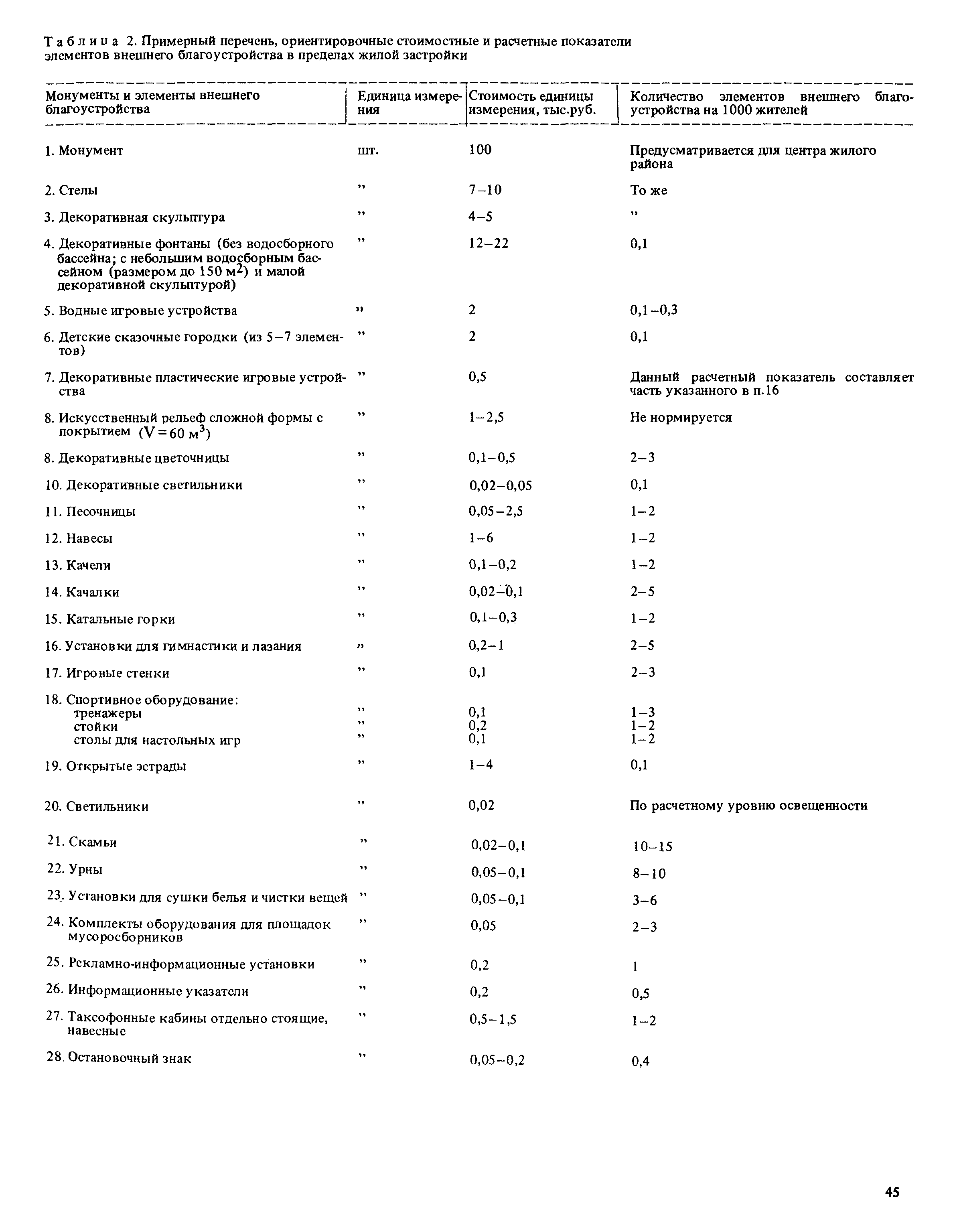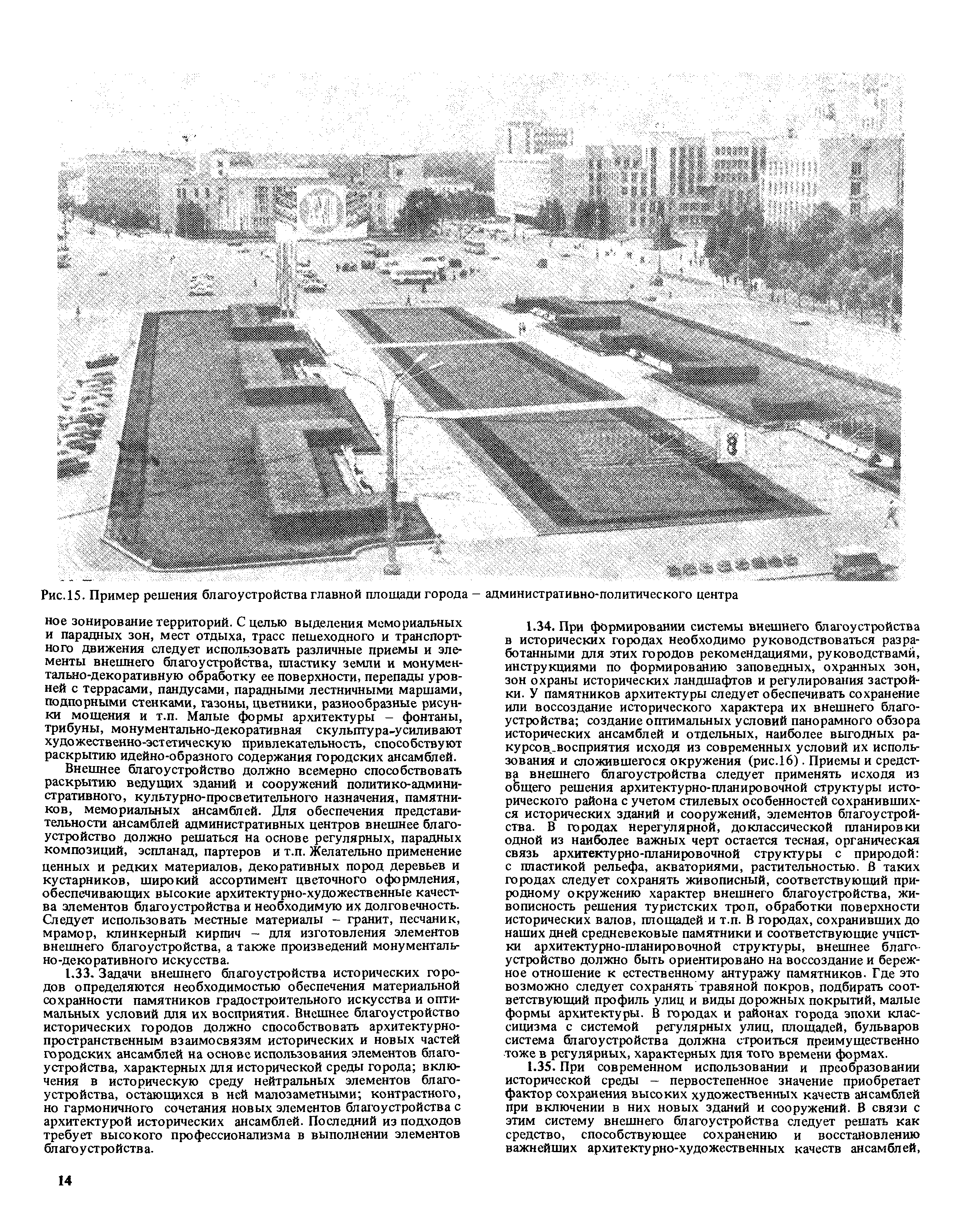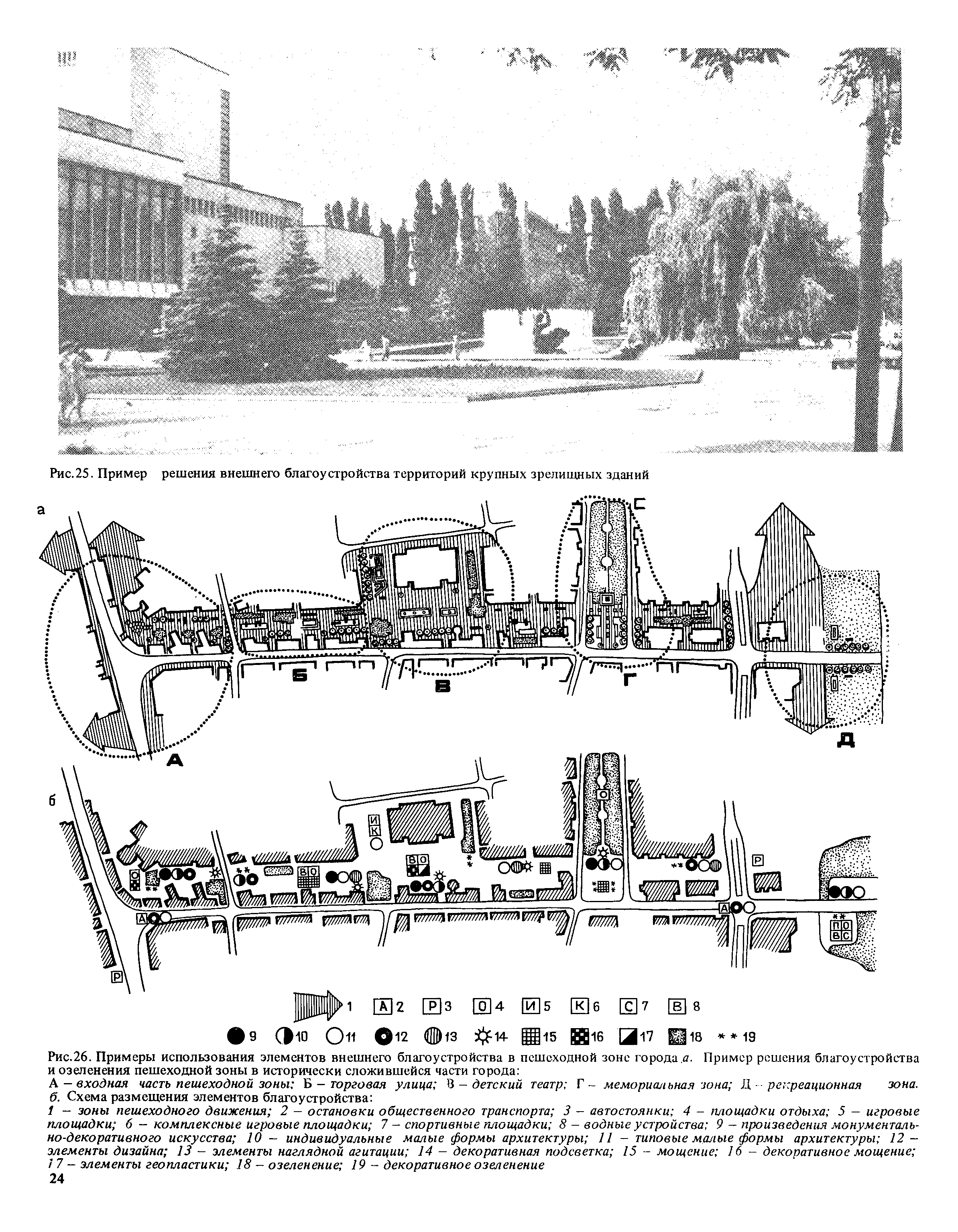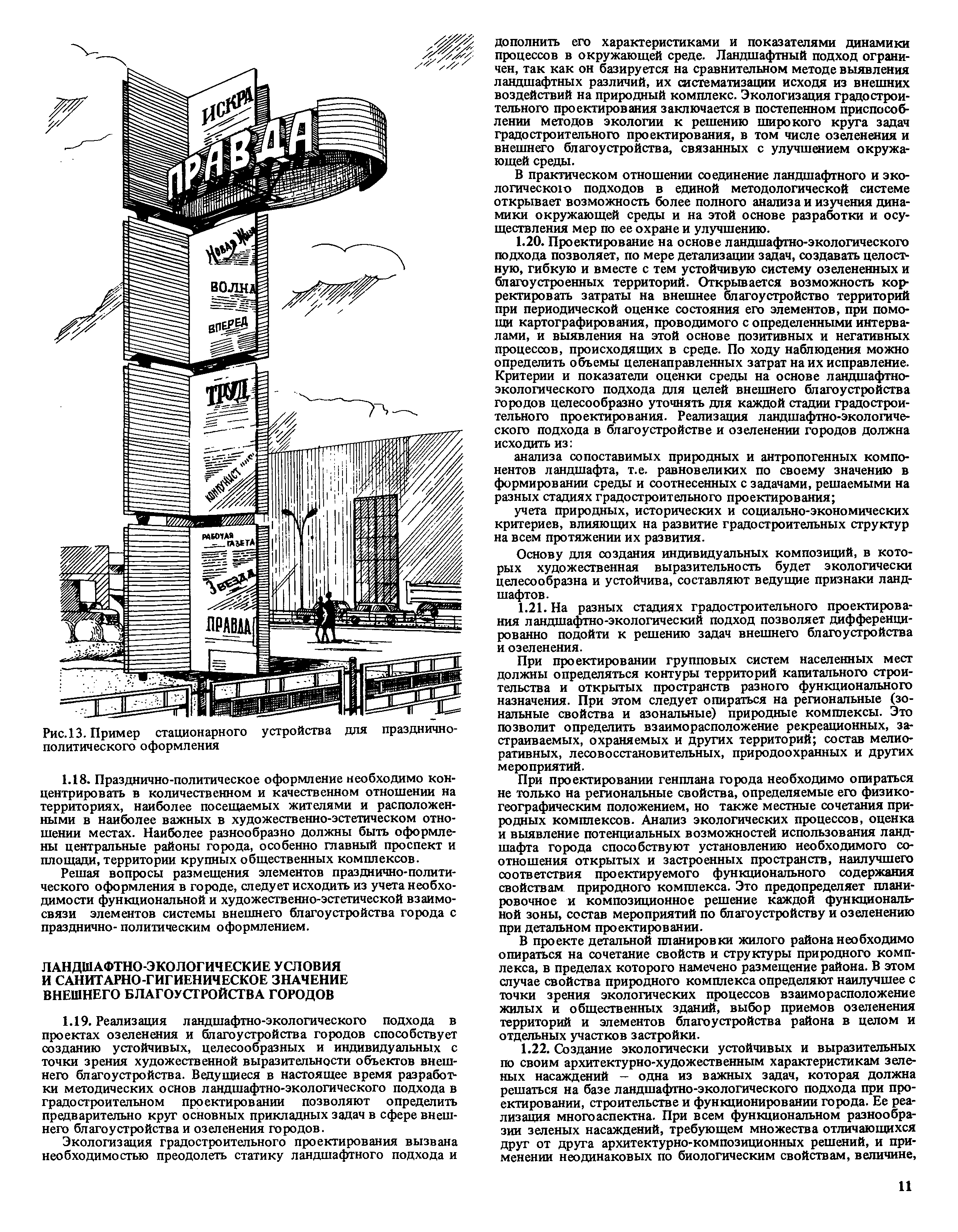 Рекомендации по внешнему благоустройству и озеленению городов, включая малые формы архитектуры| Статус: | действует | | Название рус.: | Рекомендации по внешнему благоустройству и озеленению городов, включая малые формы архитектуры | | Дата добавления в базу: | 01.09.2013 | | Дата актуализации: | 01.01.2021 | | Область применения: | Документ предназначен для специалистов проектных организаций и научно-исследовательских институтов градостроительного профиля, архитекторов, художников. | | Оглавление: | Введение 1. Теоретические и методические основы формирования внешнего благоустройства городов Градостроительные предпосылки и методические основы формирования системы внешнего благоустройства городов Произведения монументально-декоративного искусства, праздничное оформление и дизайн во внешнем благоустройстве города Ландшафтно-экологические условия, санитарно-гигиеническое значение внешнего благоустройства городов Особенности внешнего благоустройства городов различного народнохозяйственного профиля 2. Внешнее благоустройство территории различных функциональных и структурно-планировочных частей городов Внешнее благоустройство в архитектурно-пространственной среде общегородского центра Планировочные элементы благоустройства и оборудование территорий жилой застройки Приемы благоустройства на предзаводских территориях и в санитарно-защитных зонах Внешнее благоустройство ландшафтно-рекреационных территорий городов 3. Совершенствование проектирования объектов внешнего благоустройства Общие положения и нормативные показатели проектирования объектов внешнего благоустройства Методика составления номенклатуры малых форм архитектуры и планировочных элементов благоустройства Повышение эффективности внешнего благоустройства Приложение. Некоторые показатели внешнего благоустройства городов | | Разработан: | ЛенНИИПградостроительства КиевНИИП градостроительства КиевЗНИИЭП ЦНИИП градостроительства ВНИИТЭ ЛенЗНИИЭП ГлавАПУ Мосгорисполкома