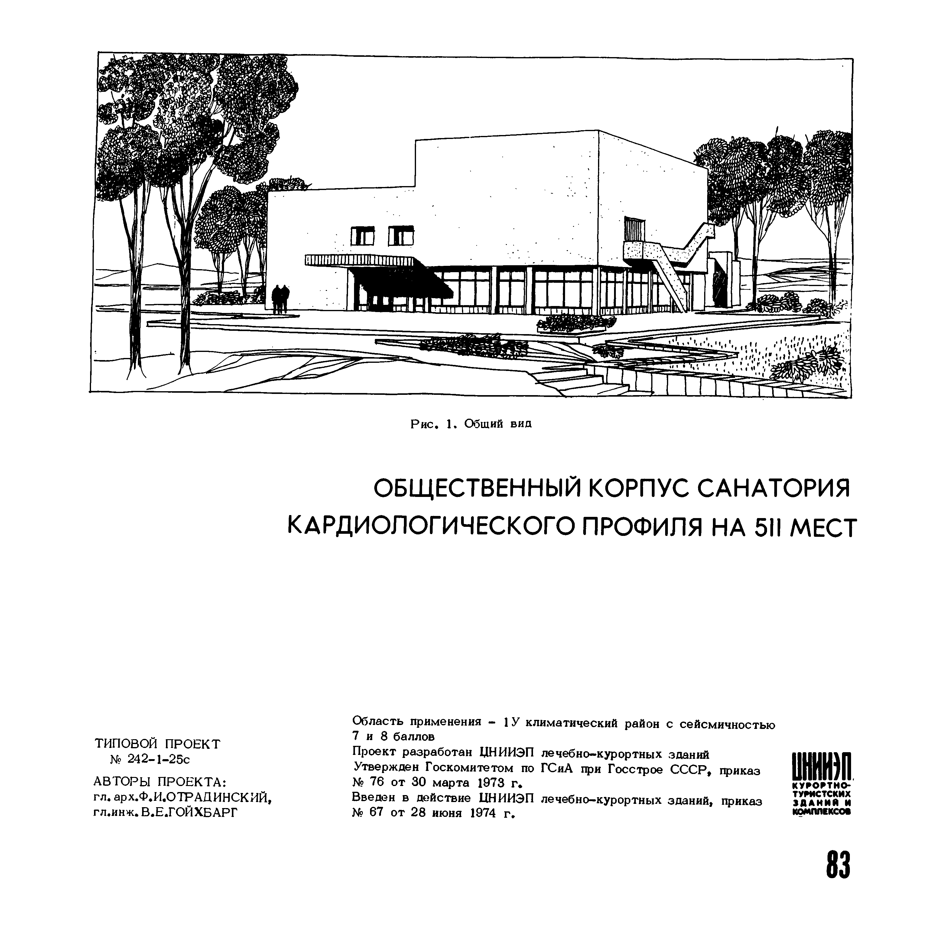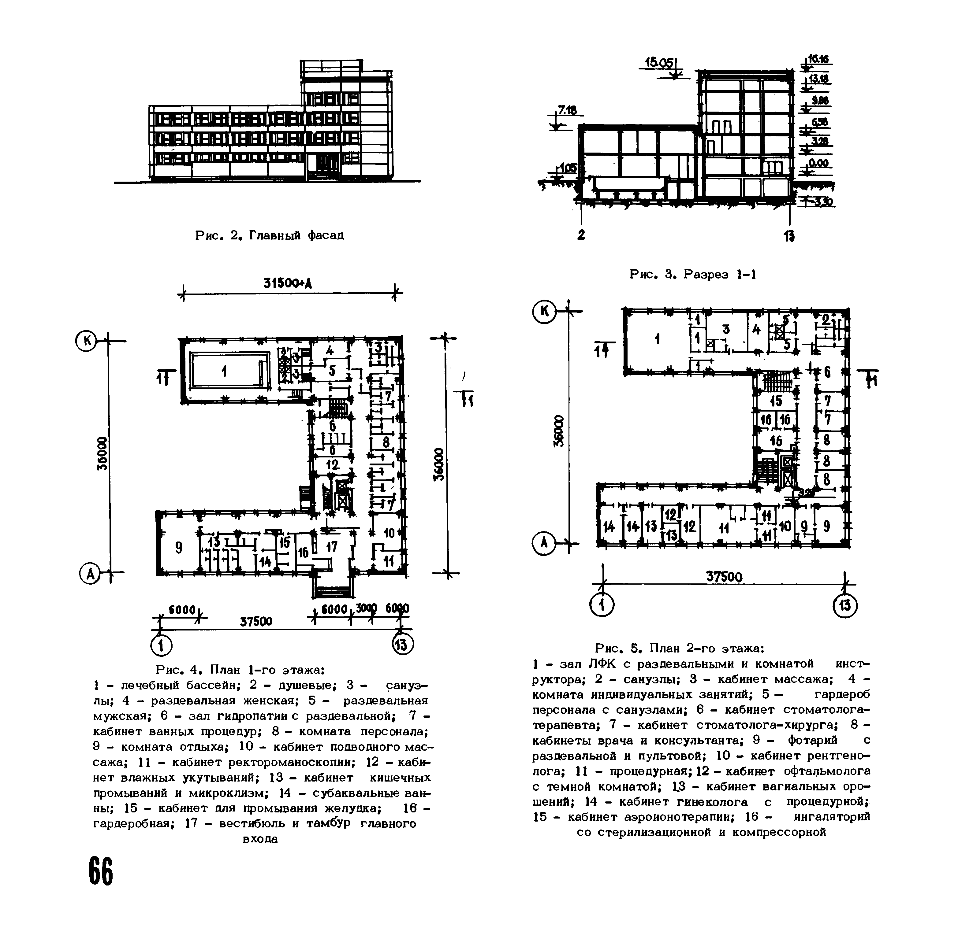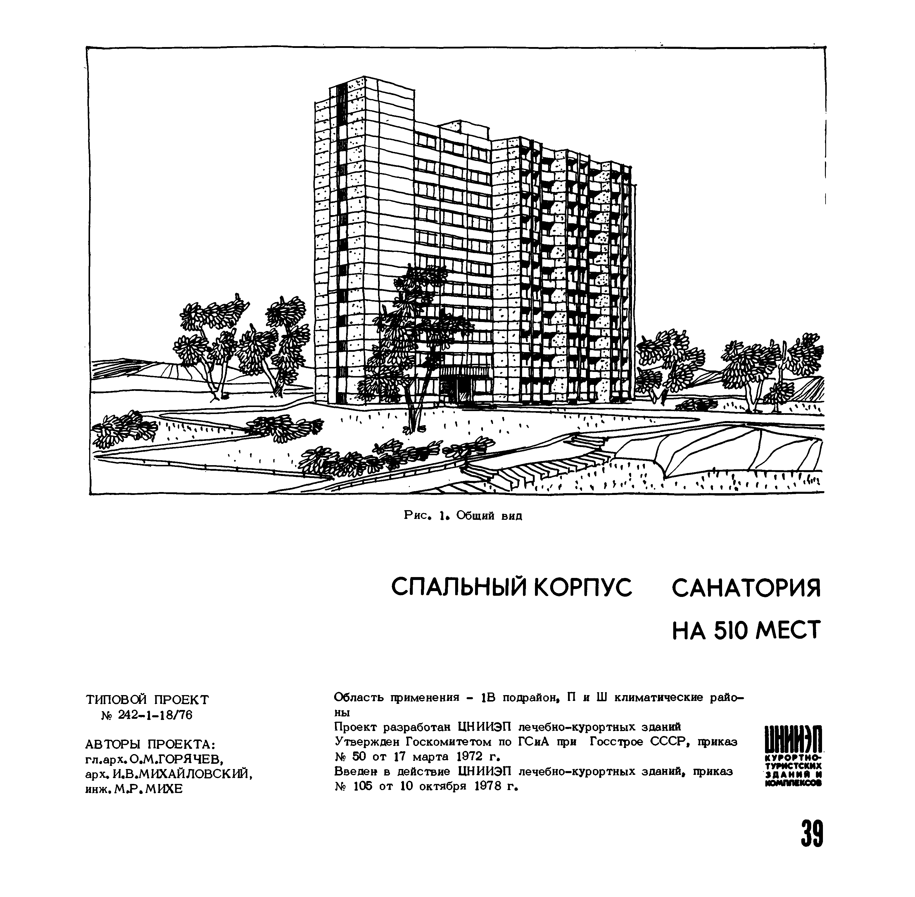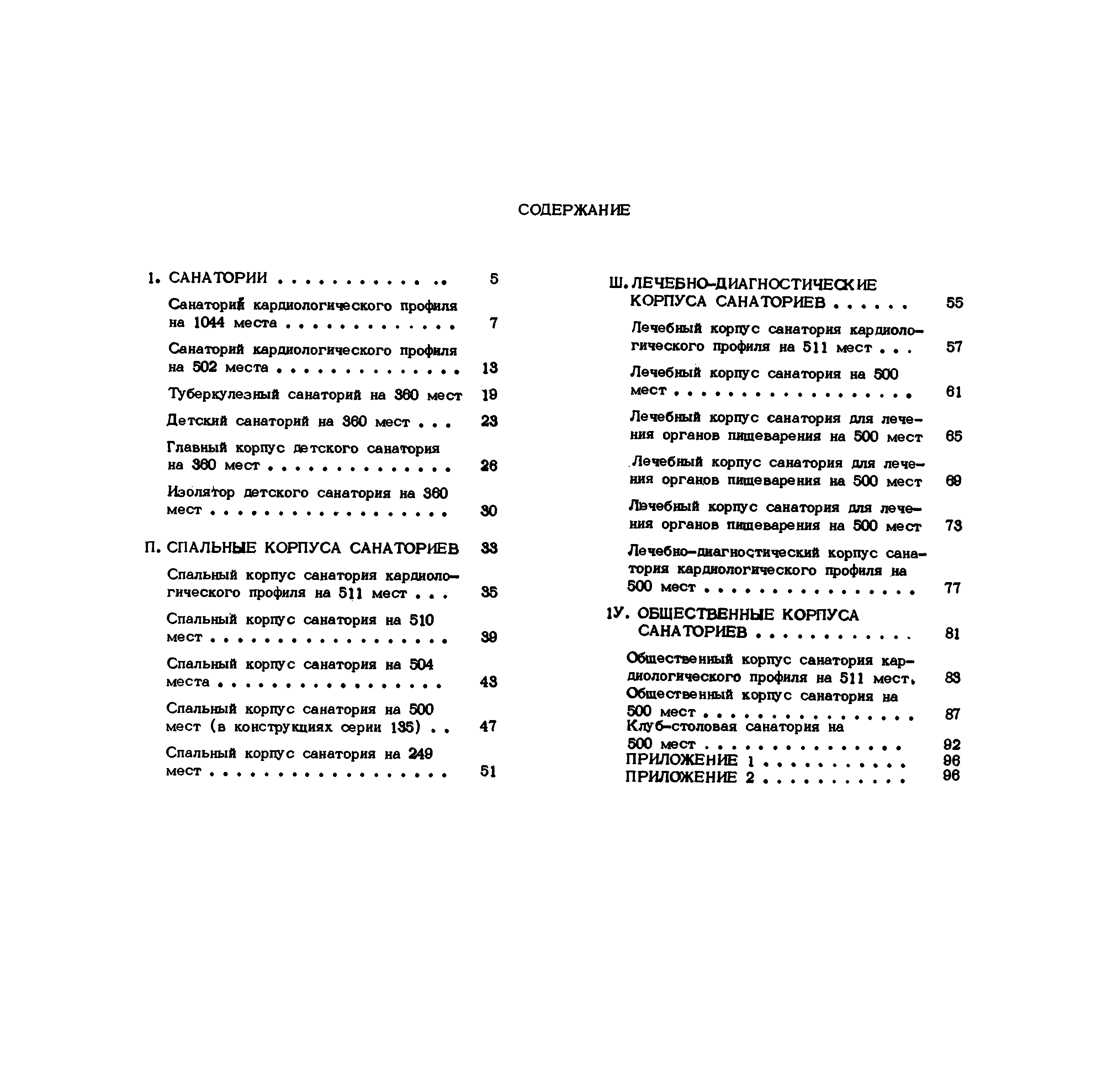 | Оглавление: | 1. Санатории Санаторий кардиологического профиля на 104 места Санаторий кардиологического профиля на 502 места Туберкулезный санаторий на 360 мест Детский санаторий на 360 мест Главный корпус детского санатория на 360 мест Изолятор детского санатория на 360 мест 2. Спальные корпуса санаториев Спальный корпус санатория кардиологического профиля на 511 мест Спальный корпус санатория на 510 мест Спальный корпус санатория на 504 места Спальный корпус санатория на 500 мест (в конструкциях серии 135) Спальный корпус санатория на 249 мест 3. Лечебно-диагностические корпуса санаториев Лечебный корпус санатория кардиологического профиля на 511 мест Лечебный корпус санатория на 500 мест Лечебный корпус санатория для лечения органов пищеварения на 500 мест Лечебно-диагностический корпус санатория кардиологического профиля на 500 мест 4. Общественные корпуса санаториев Общественный корпус санатория кардиологического профиля на 511 мест Общественный корпус санатория на 500 мест Клуб-столовая санатория на 500 мест Приложение 1 Приложение 2 |