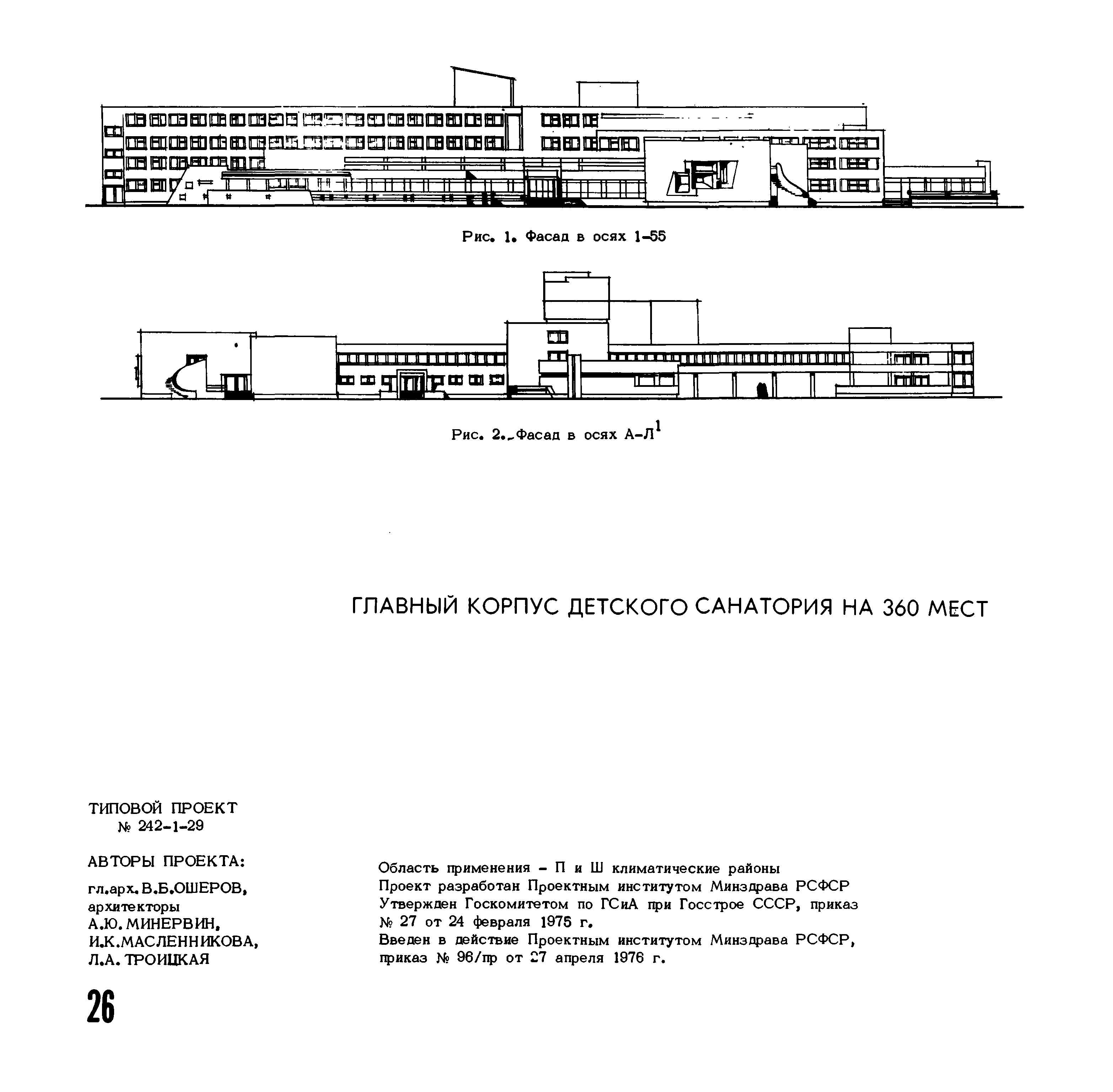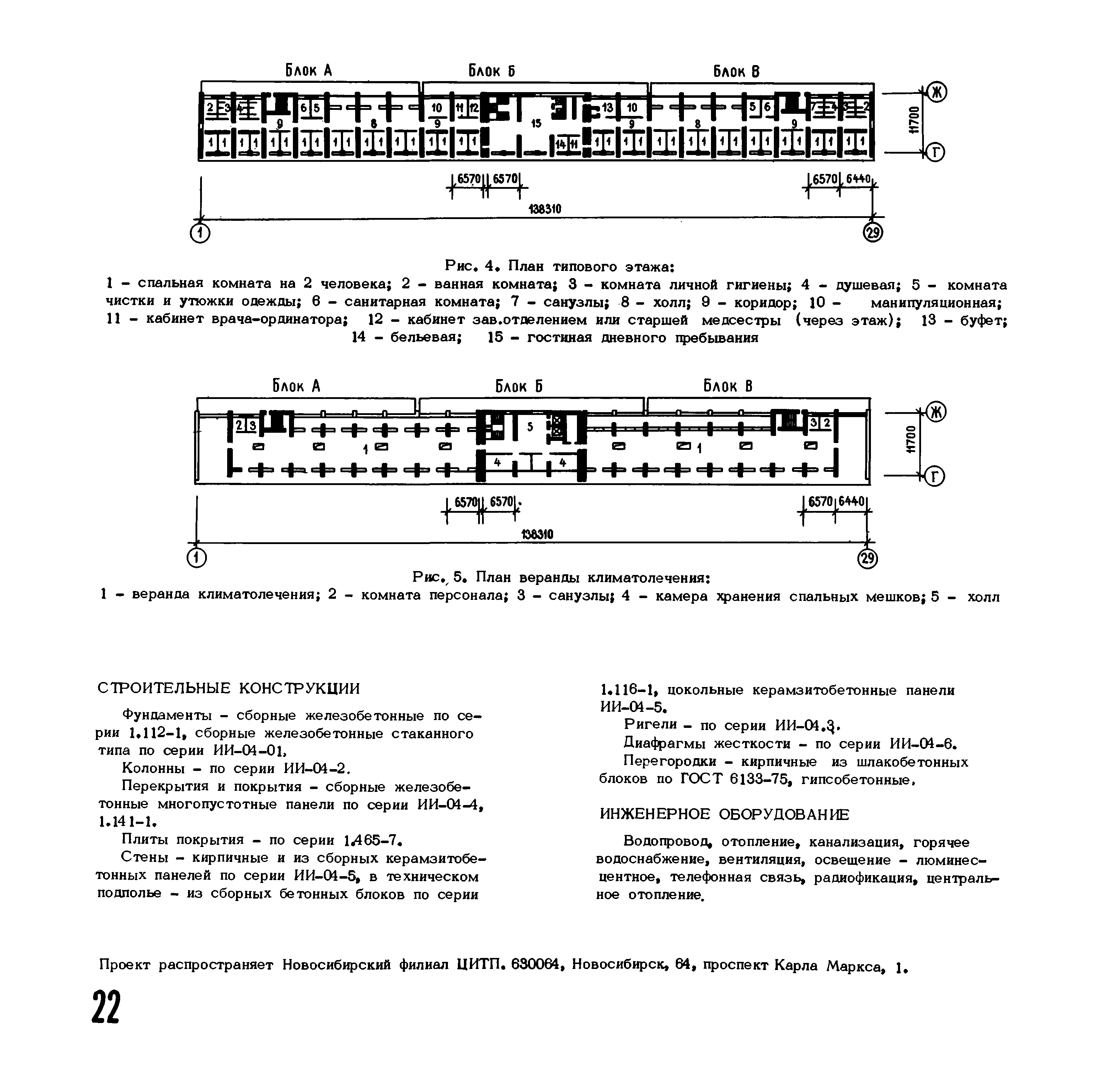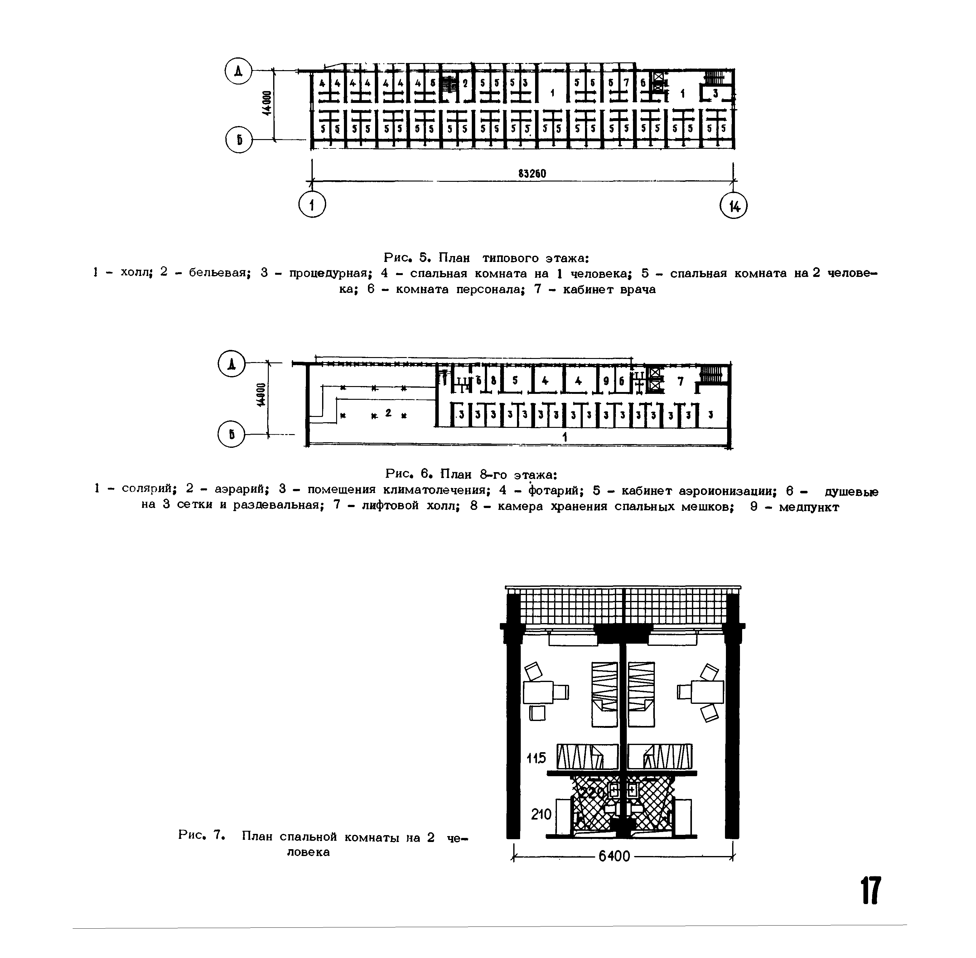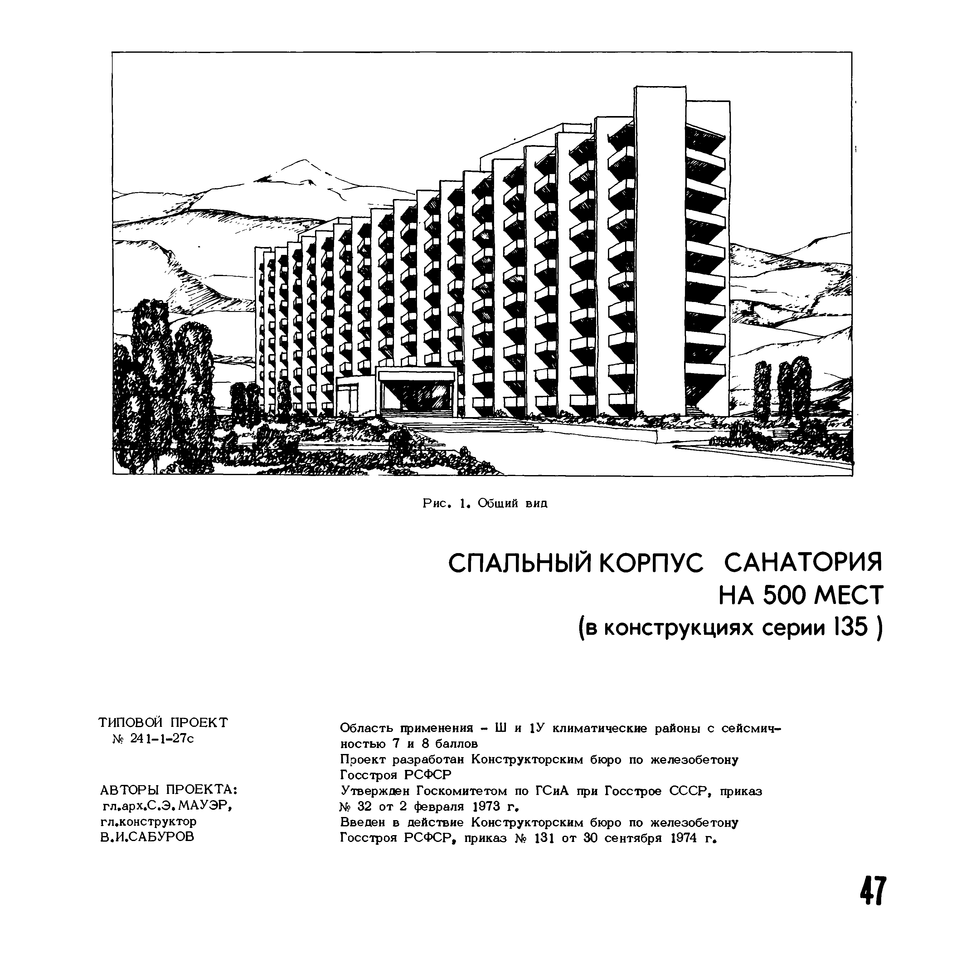 | Оглавление: | 1. Санатории Санаторий кардиологического профиля на 104 места Санаторий кардиологического профиля на 502 места Туберкулезный санаторий на 360 мест Детский санаторий на 360 мест Главный корпус детского санатория на 360 мест Изолятор детского санатория на 360 мест 2. Спальные корпуса санаториев Спальный корпус санатория кардиологического профиля на 511 мест Спальный корпус санатория на 510 мест Спальный корпус санатория на 504 места Спальный корпус санатория на 500 мест (в конструкциях серии 135) Спальный корпус санатория на 249 мест 3. Лечебно-диагностические корпуса санаториев Лечебный корпус санатория кардиологического профиля на 511 мест Лечебный корпус санатория на 500 мест Лечебный корпус санатория для лечения органов пищеварения на 500 мест Лечебно-диагностический корпус санатория кардиологического профиля на 500 мест 4. Общественные корпуса санаториев Общественный корпус санатория кардиологического профиля на 511 мест Общественный корпус санатория на 500 мест Клуб-столовая санатория на 500 мест Приложение 1 Приложение 2 |