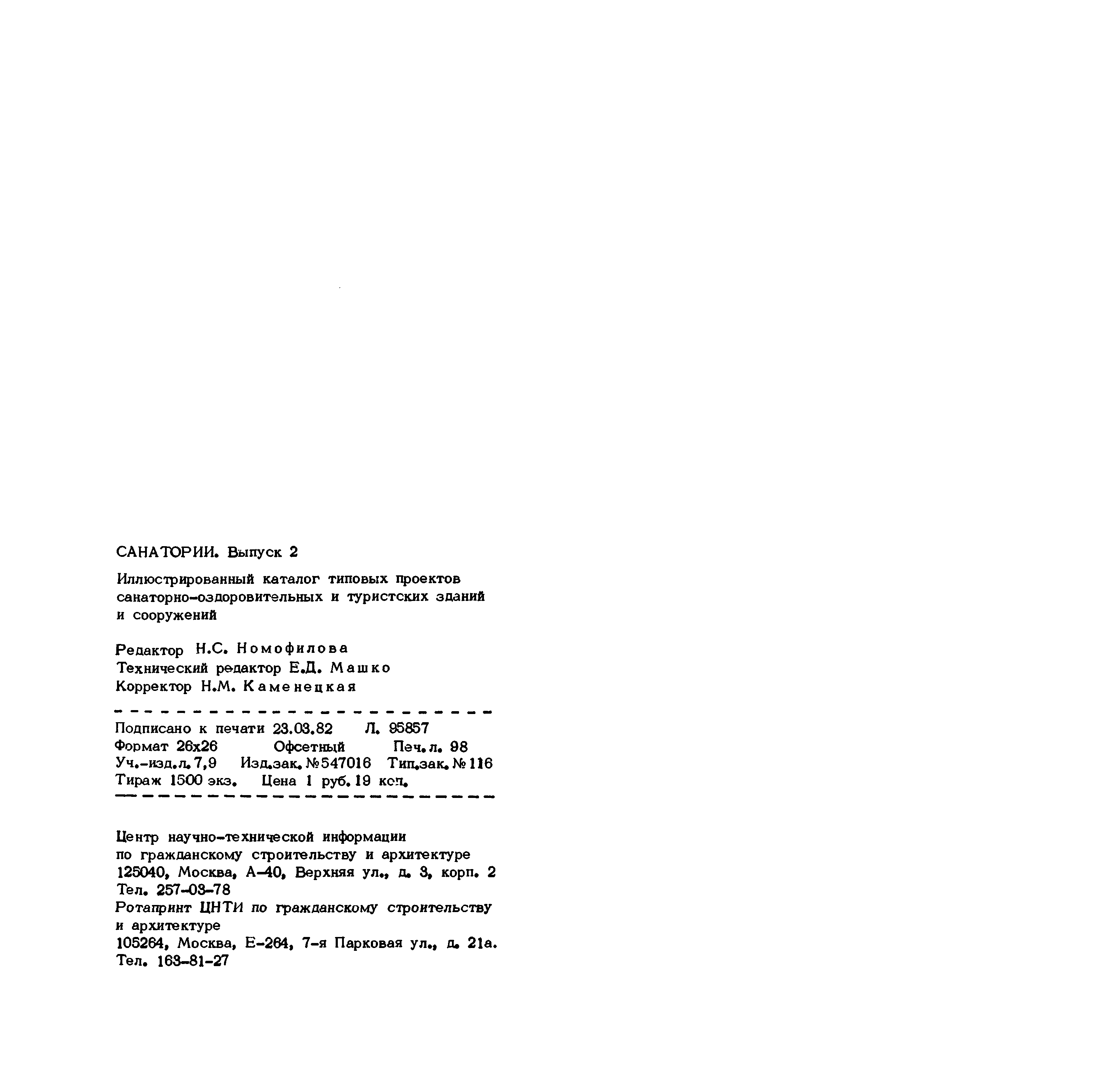 | Название рус.: | Санатории. Иллюстрированный каталог типовых проектов санаторно-оздоровительных и туристских зданий и сооружений |