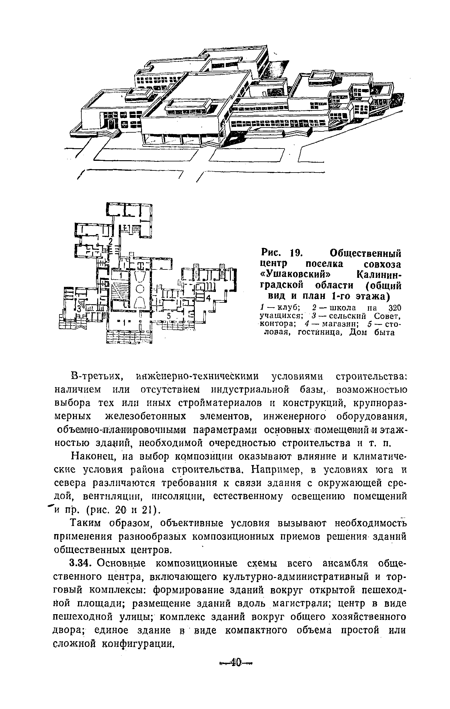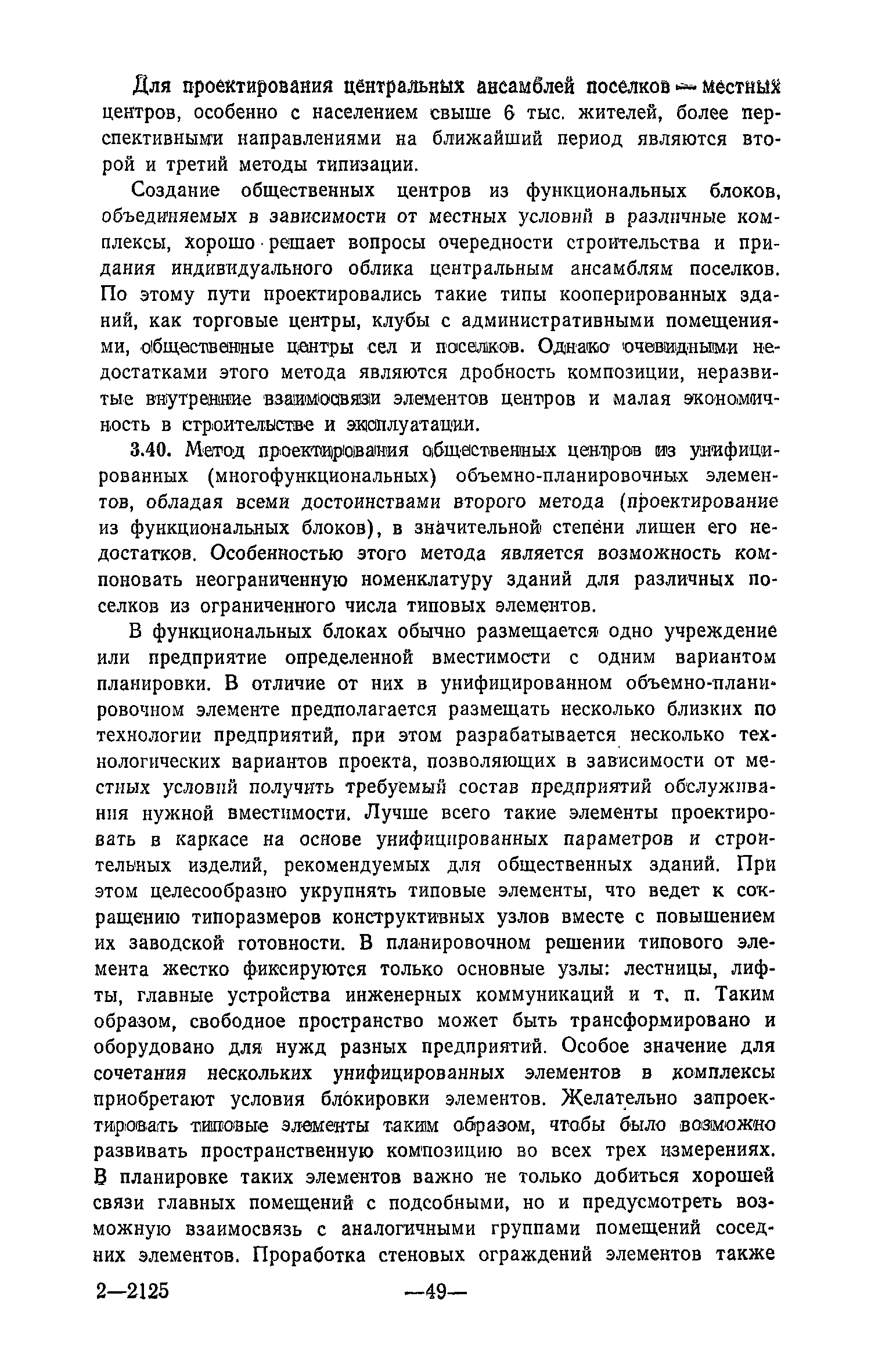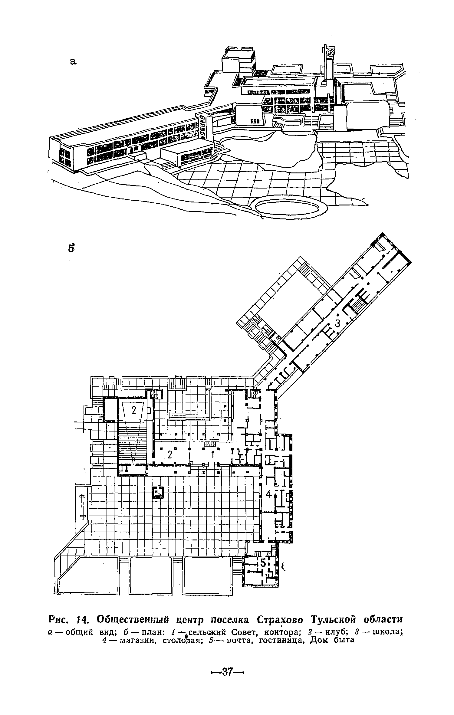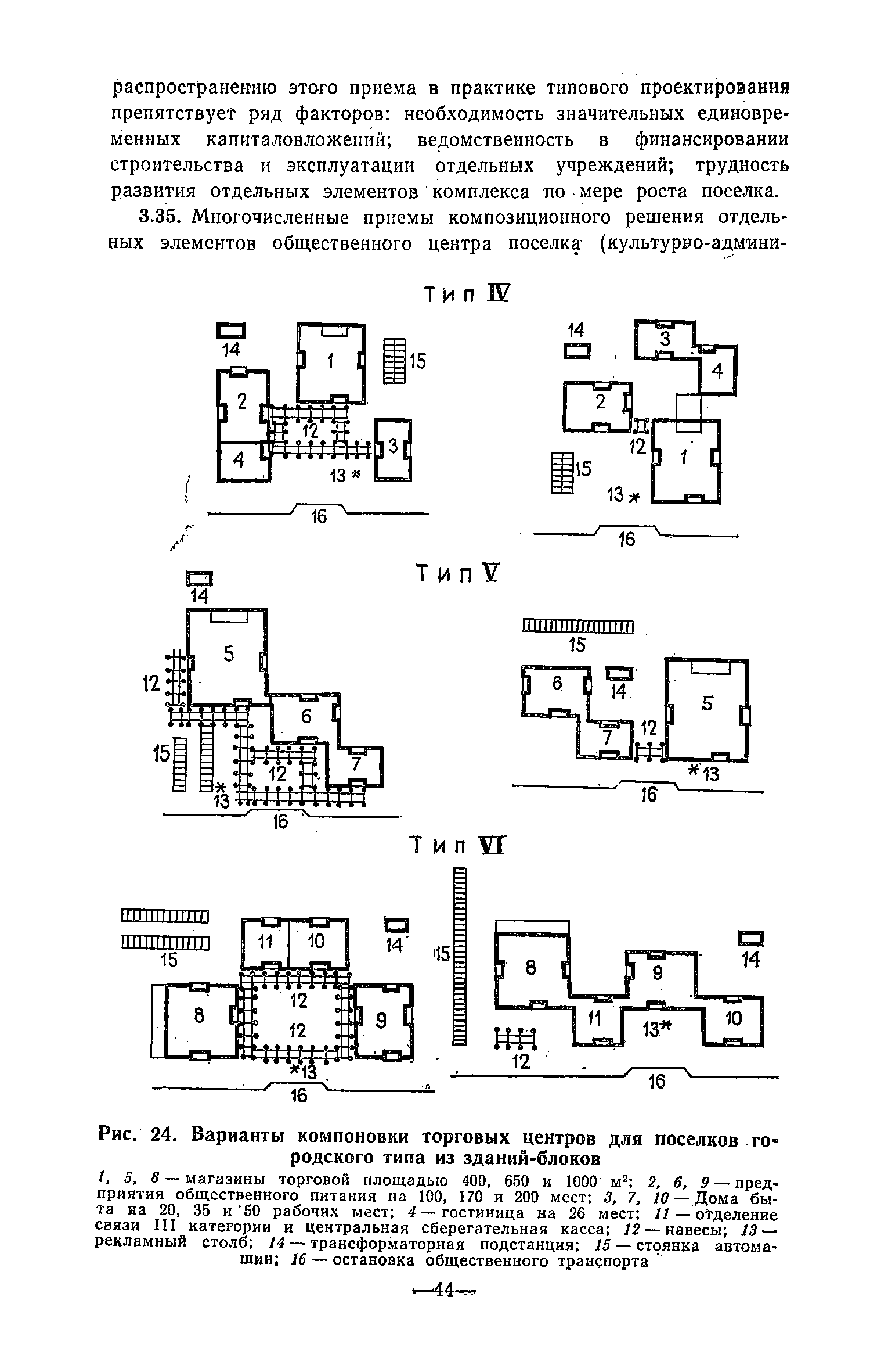 | Оглавление: | Введение 1. Общие положения 2. Градостроительные основы формирования общественных центров поселков Общественный центр поселка как элемент единой системы культурно-бытового обслуживания Состав учреждений и предприятий общественных центров Размещение общественного центра в структуре поселка 3. Типы зданий общественных центров поселков Объединение учреждений в здания общественных центров Функциональная структура зданий общественных центров Композиционные приемы решения комплексов зданий центров Перспективные направления типового проектирования зданий общественных центров 4. Технико-экономическая оценка общественных центров поселков городского типа Методика технико-экономической оценки Выбор наиболее экономичных проектов Приложение 1. Основные характеристики и параметры поселков - центров обслуживания в системах группового расселения Приложение 2. Дифференциация норм расчета сети учреждений, предприятий и сооружений обслуживания в поселках городского типа Приложение 3. Рекомендуемый состав учреждений комплексов общественных центров поселков городского типа Приложение 4. Номенклатура типов зданий, формирующих общественные центры поселков городского типа Приложение 5. Примерный состав и площади помещений комплексов зданий общественных центров поселков городского типа Приложение 6. Технико-экономическая оценка экспериментального проекта комплекса кооперированных зданий общественного центра поселка на 9 тыс. жителей |