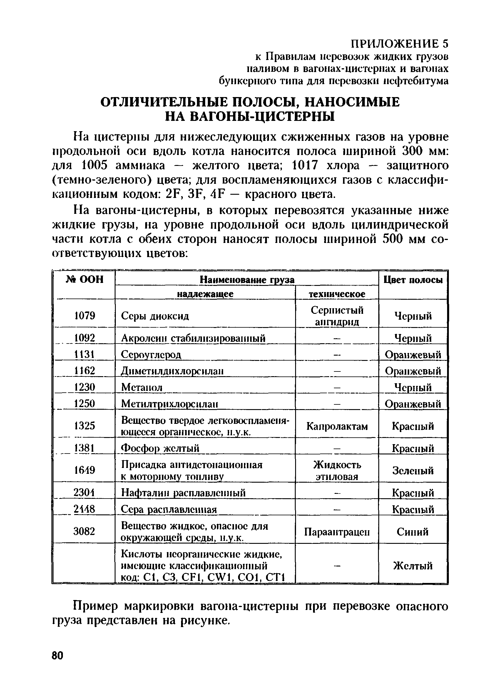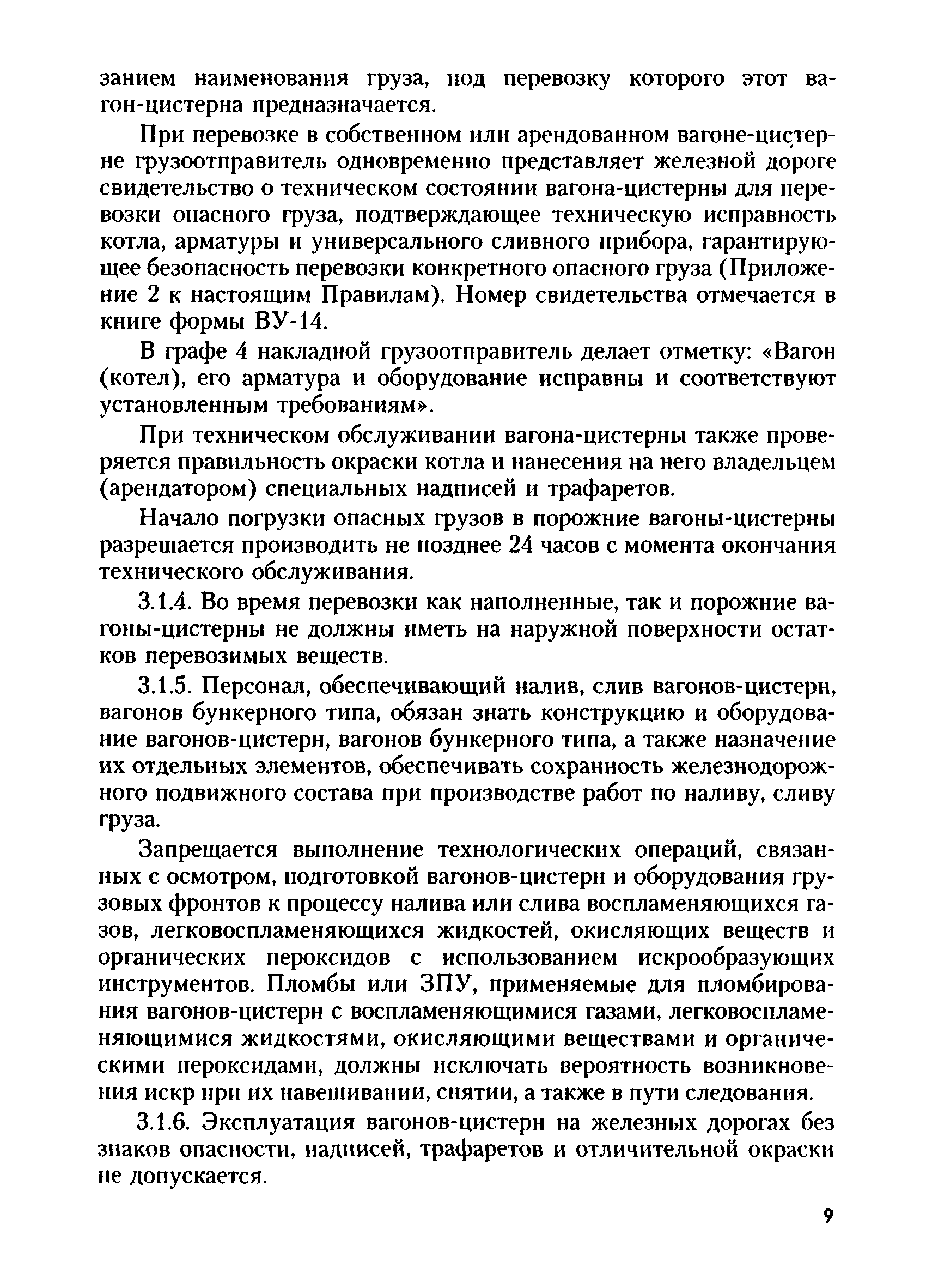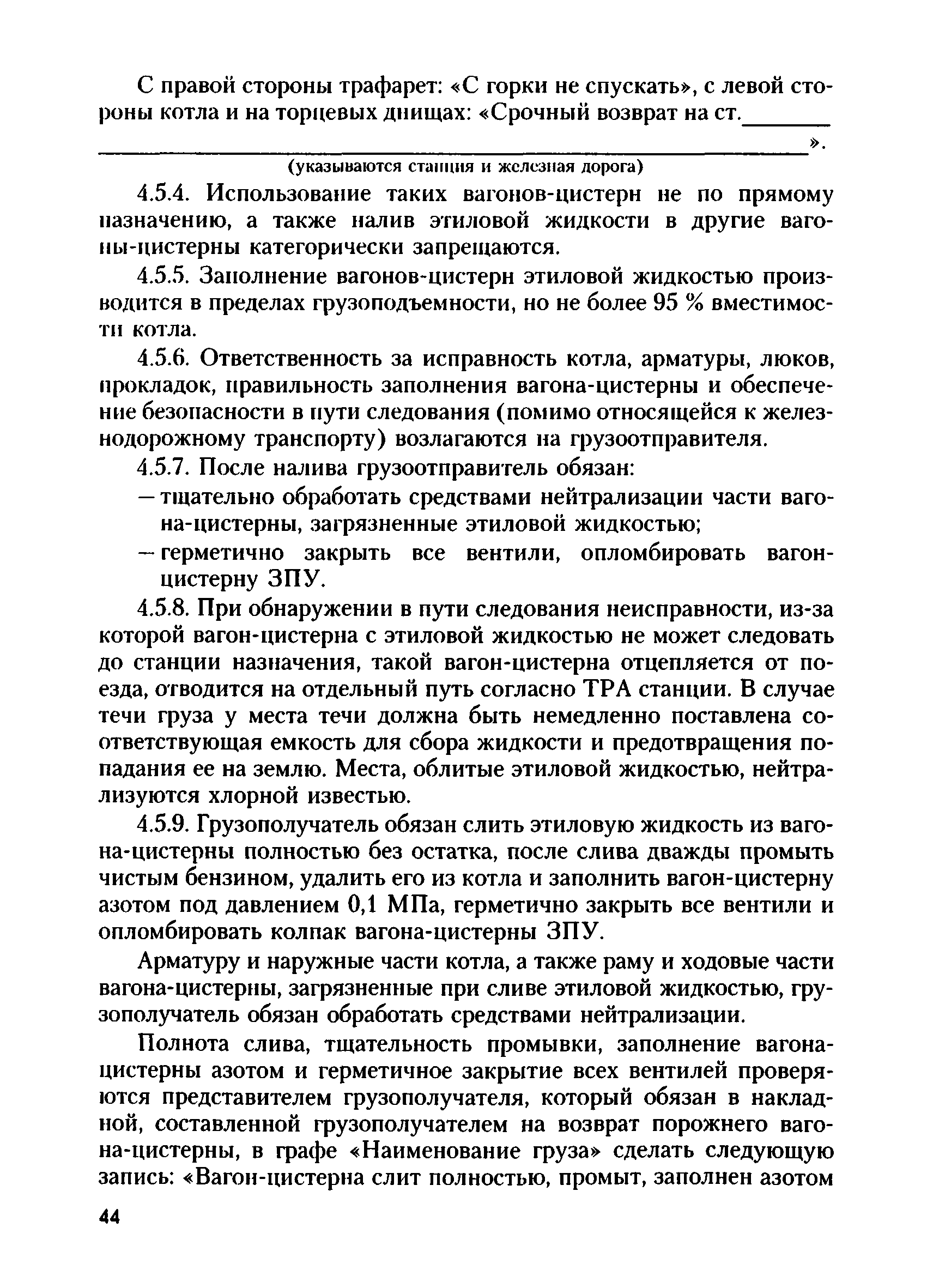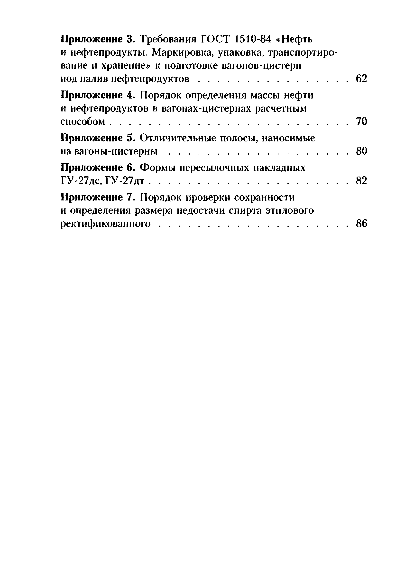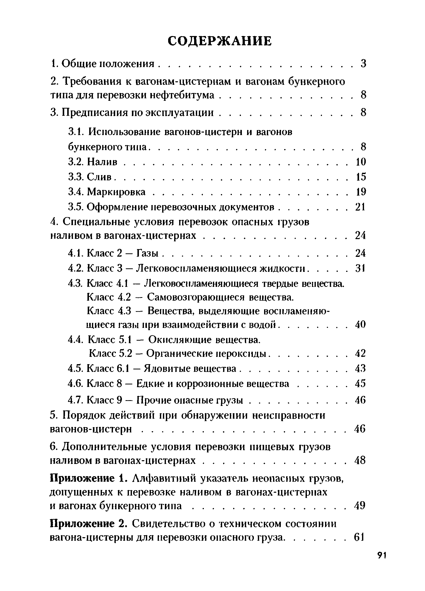 | Оглавление: | 1. Общие положения 2. Требования к вагонам-цистернам и вагонам бункерного типа для перевозки нефтебитума 3. Предписания по эксплуатации 3.1. Использование вагонов-цистерн и вагонов бункерного типа 3.2. Налив 3.3. Слив 3.4. Маркировка 3.5. Оформление перевозочных документов 4. Специальные условия перевозок опасных грузов наливом в вагонах-цистернах 4.1. Класс 2 - Газы 4.2. Класс 3 - Легковоспламеняющиеся жидкости 4.3. Класс 4.1 - Легковоспламеняющиеся твердые вещества 4.3. Класс 4.2 - Самовозгорающиеся вещества 4.3. Класс 4.3 - Вещества, выделяющие воспламеняющиеся газы при взаимодействии с водой 4.4. Класс 5.1 - Окисляющие вещества 4.4. Класс 5.2 - Органические пероксиды 4.5. Класс 6.1 - Ядовитые вещества 4.6. Класс 8 - Едкие и коррозионные вещества 4.7. Класс 9 - Прочие и опасные грузы 5. Порядок действий при обнаружении неисправности вагонов-цистерн 6. Дополнительные условия перевозки пищевых грузов наливом в вагонах-цистернах Приложение 1. Алфавитный указатель неопасных грузов, допущенных к перевозке наливом в вагонах-цистернах и вагонах бункерного типа Приложение 2. Свидетельство о техническом состоянии вагона-цистерны для перевозки опасного груза Приложение 3. Требования ГОСТ 1510-84 «Нефть и нефтепродукты. Маркировка, упаковка, транспортирование и хранение» к подготовке вагонов-цистерн под налив нефтепродуктов Приложение 4. Порядок определения массы нефти и нефтепродуктов в вагонах-цистернах расчетным способом Приложение 5. Отличительные полосы, наносимые на вагоны-цистерны Приложение 6. Формы пересылочных накладных ГУ-27дс, ГУ-27дт Приложение 7. Порядок проверки сохранности и определения размера недостачи спирта этилового ректификованного |